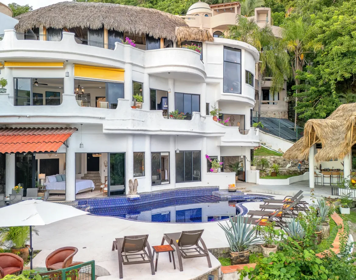 Perched in the hills of upper Conchas Chinas, Villa Viaje offers an extraordinary blend of privacy, comfort, and breathtaking beauty. Just under two miles from downtown Puerto Vallarta and nestled inside a secure gated enclave, this exclusive luxury villa rental is designed for discerning travelers seeking a private beachfront villa experience—though elevated above the coastline for sweeping views of the Pacific Ocean and Sierra Madre Mountains.