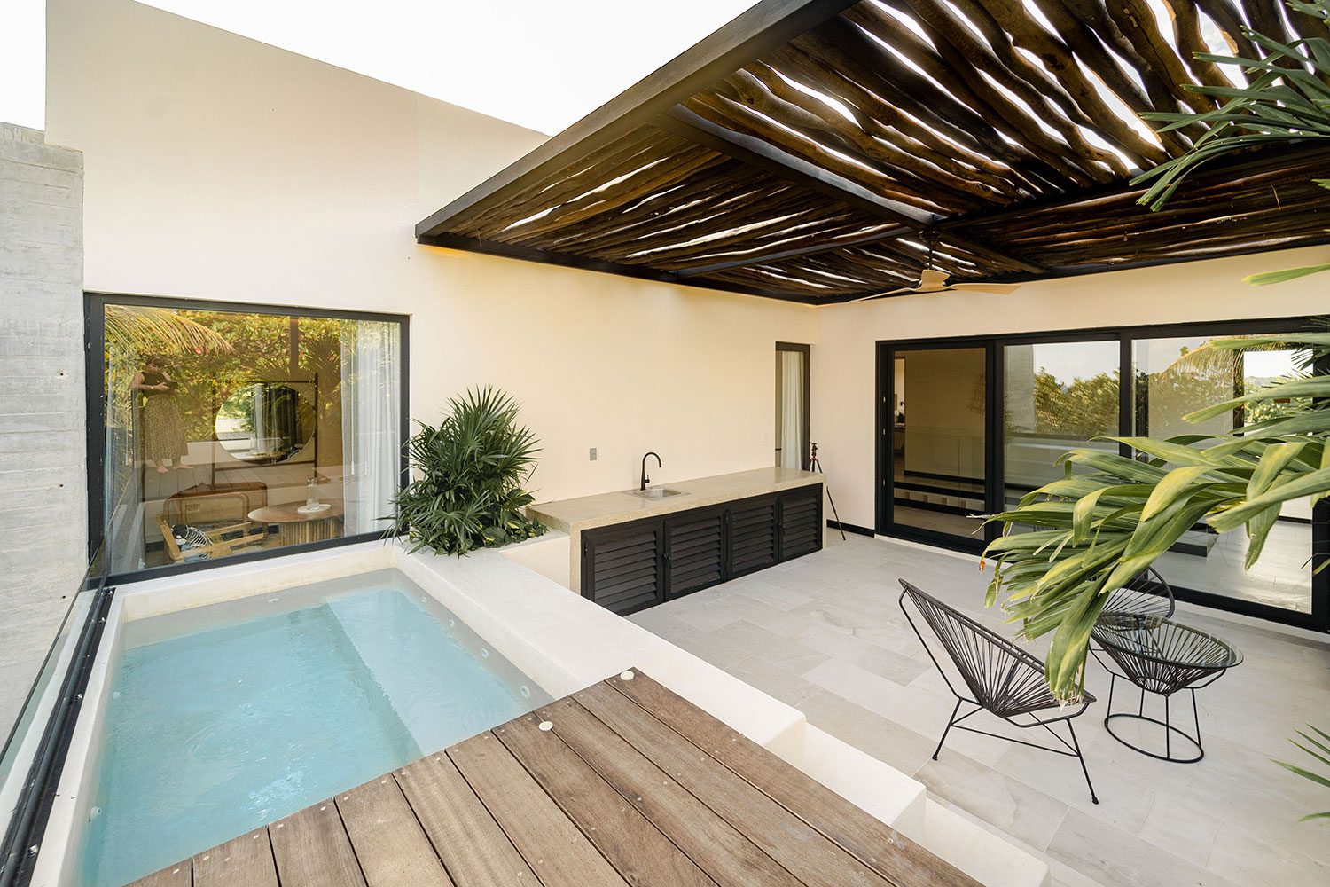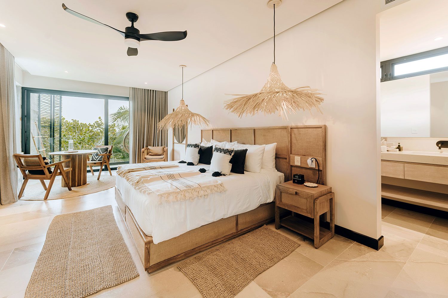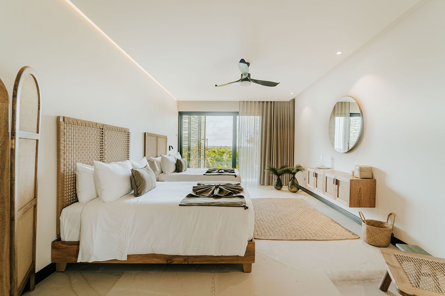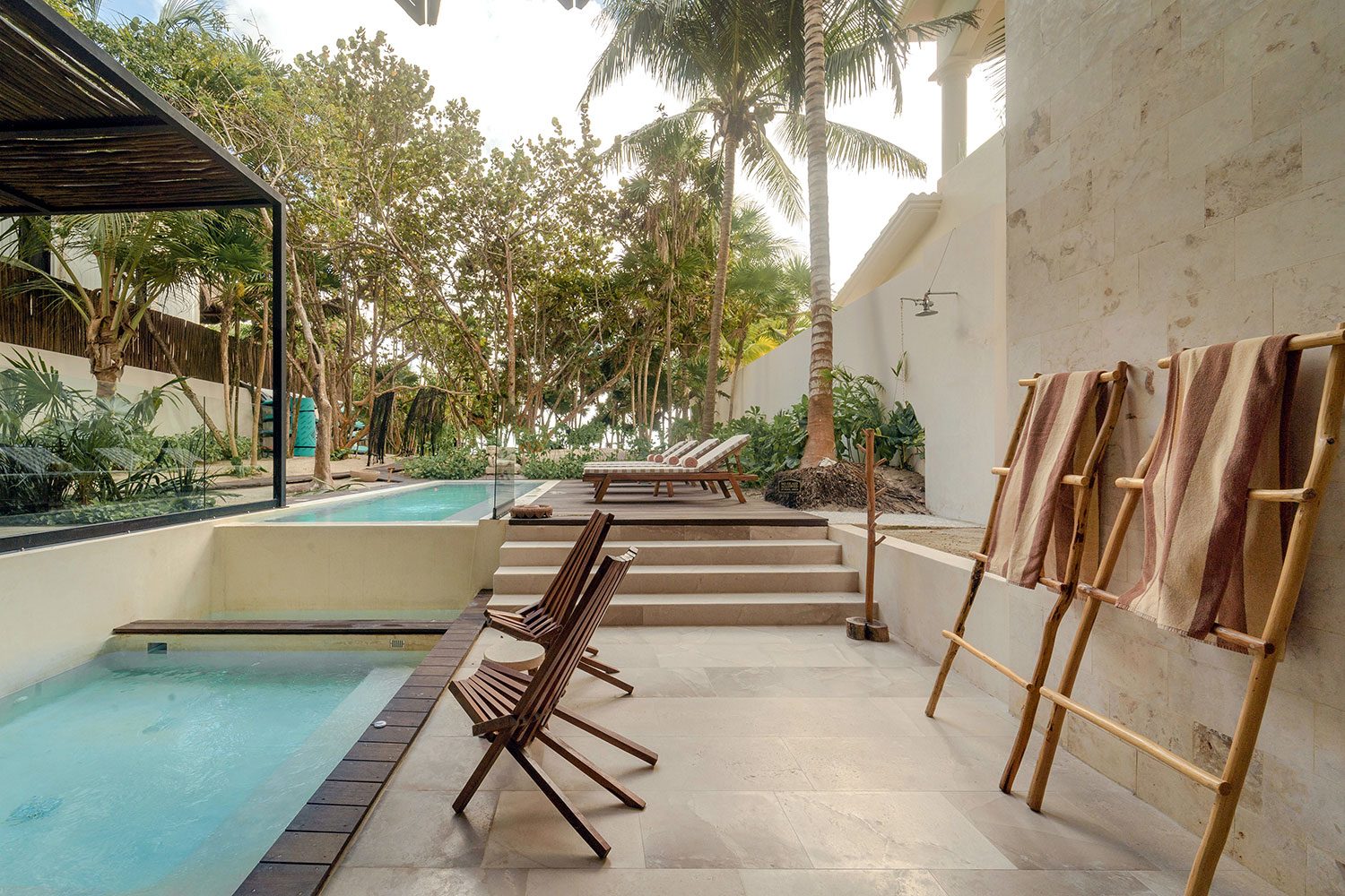 Three ocean-view suites face the Caribbean from the east side of the property; three jungle and sunset-view suites occupy the west. Terraces shaded by beautiful wooden coverings, hammocks swaying above the sand, and a private pool cascading into a jacuzzi beside the open-plan living room create a rhythm built entirely around the water. Two full-time private chefs handle breakfast and dinner — groceries are billed separately. Starlink delivers reliable high-speed connectivity throughout. Kayaks and paddleboards are on standby for bay exploration. The gated bay community provides 24/7 security.