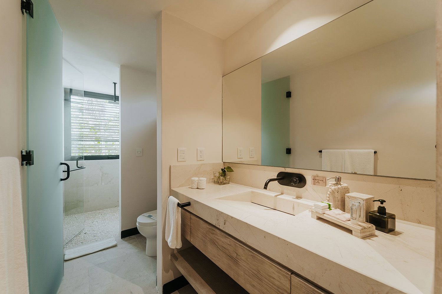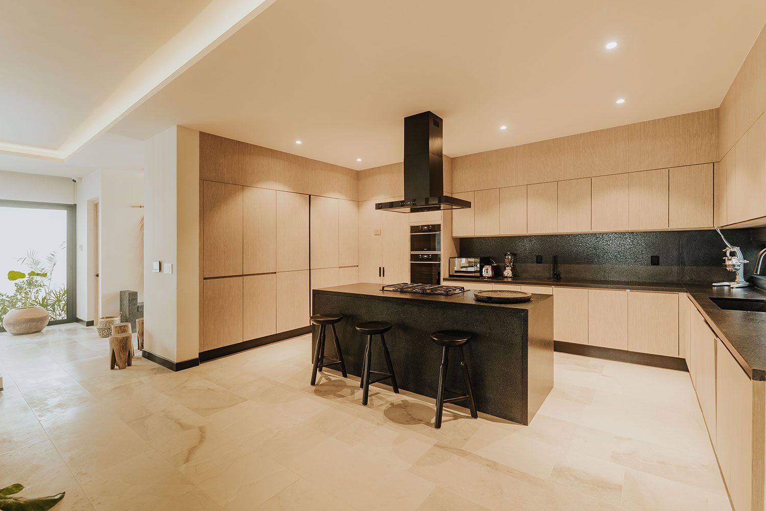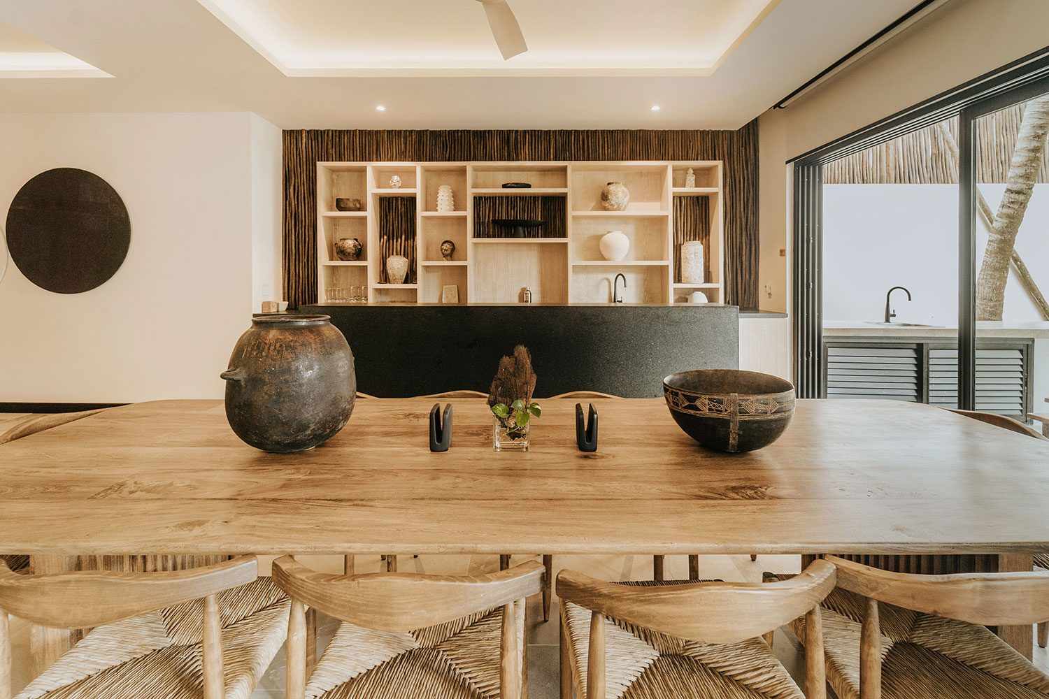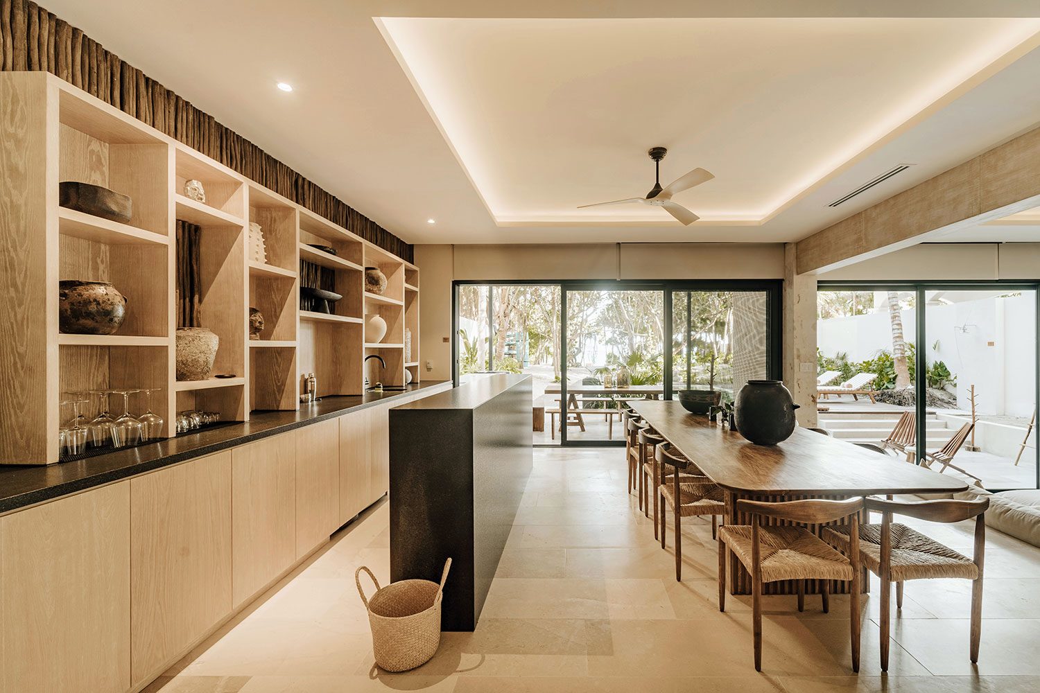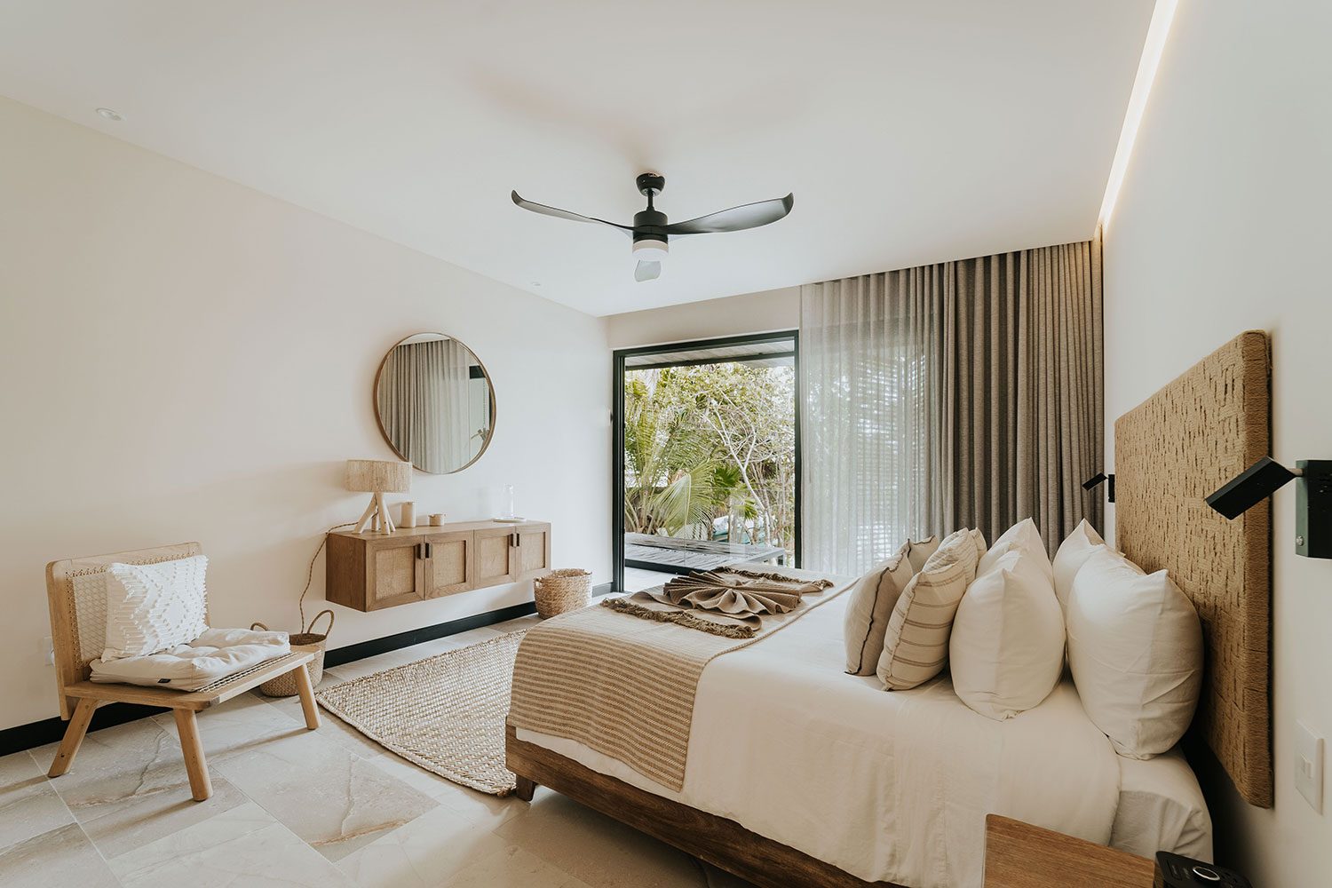Three ocean-view suites face the Caribbean from the east side of the property; three jungle and sunset-view suites occupy the west. Terraces shaded by beautiful wooden coverings, hammocks swaying above the sand, and a private pool cascading into a jacuzzi beside the open-plan living room create a rhythm built entirely around the water. Two full-time private chefs handle breakfast and dinner — groceries are billed separately. Starlink delivers reliable high-speed connectivity throughout. Kayaks and paddleboards are on standby for bay exploration. The gated bay community provides 24/7 security.