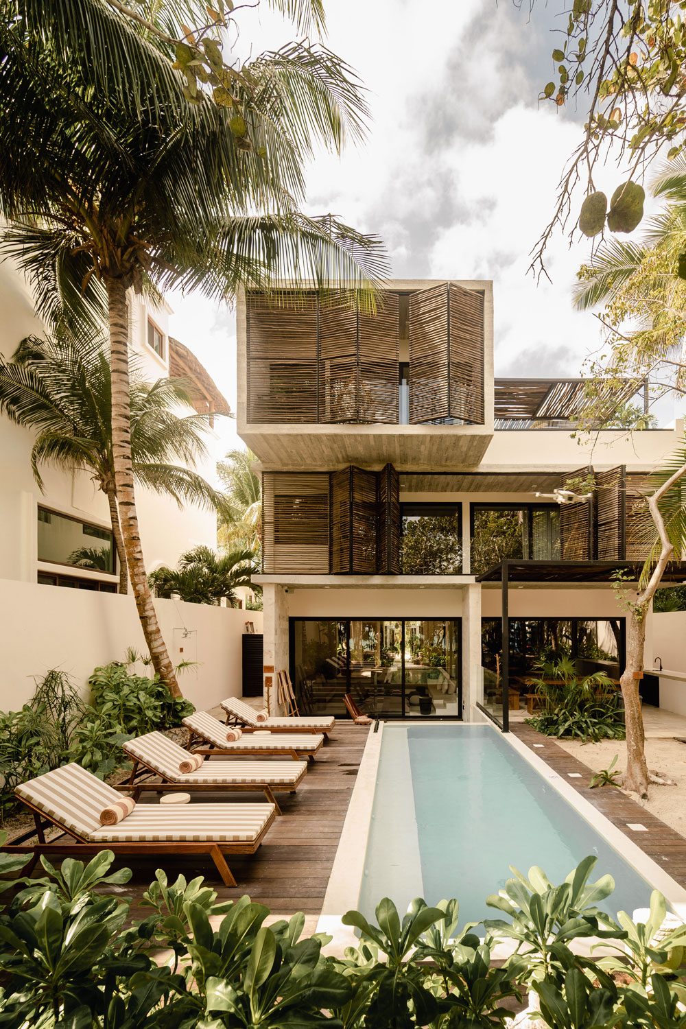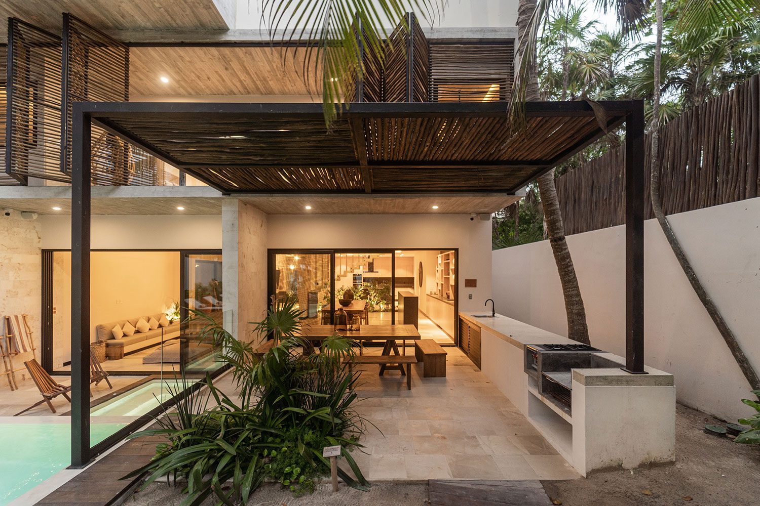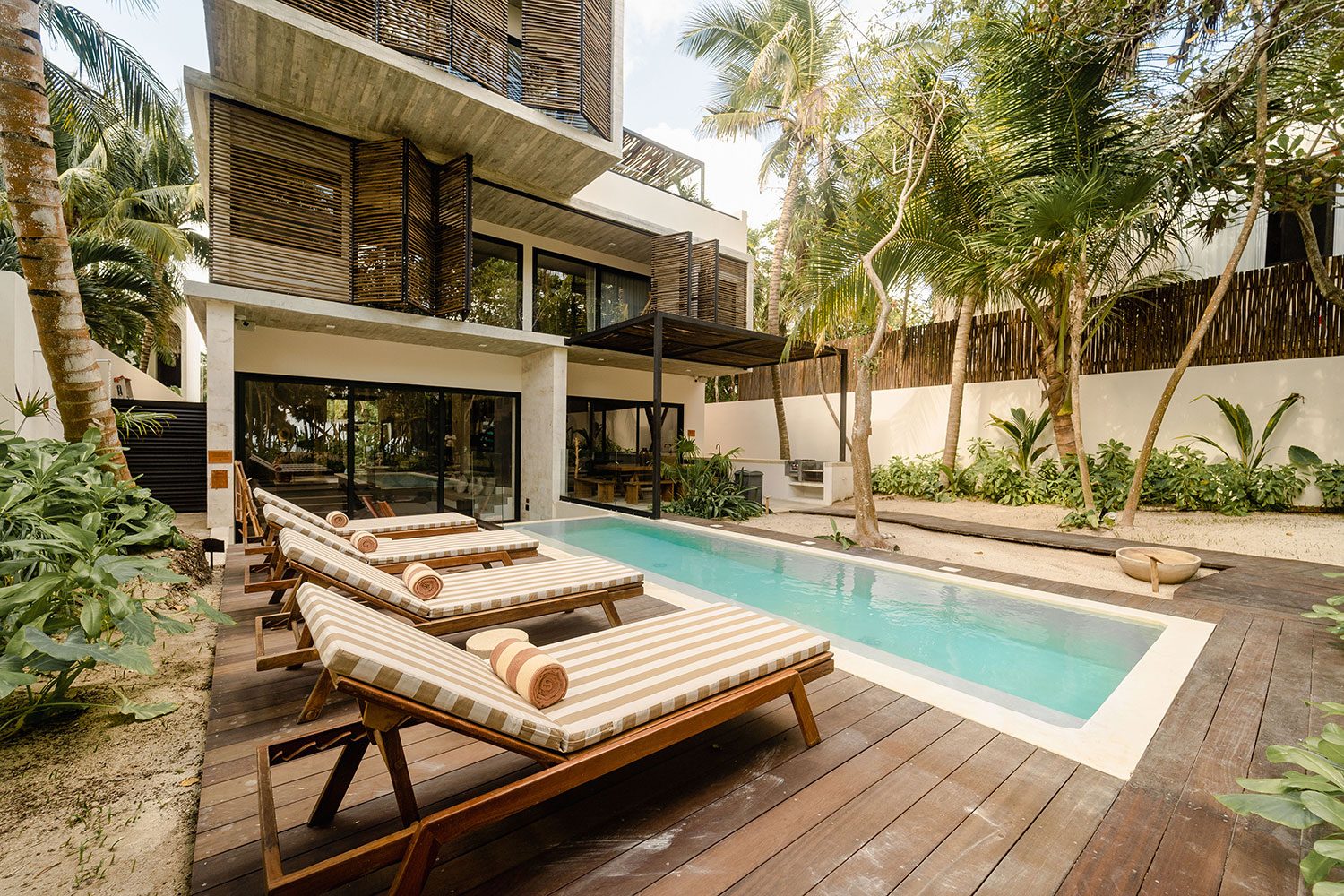 Azumaya Beach House is a six-bedroom, fully staffed beachfront estate on Soliman Bay, Tulum — one of the Riviera Maya’s most protected and intimate stretches of coastline — accommodating up to 12 guests across two private tiers of ocean-facing suites and jungle-view suites. At 7,535 sq ft (700 sq m), this architecturally distinct villa was designed around the idea that the ocean, the jungle, and the people inside should always be in conversation with one another.
