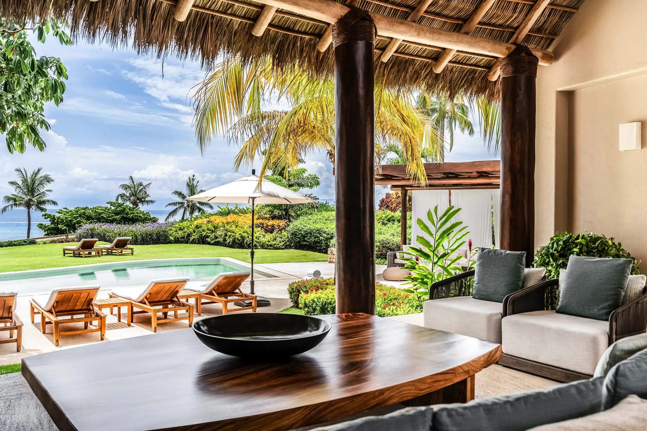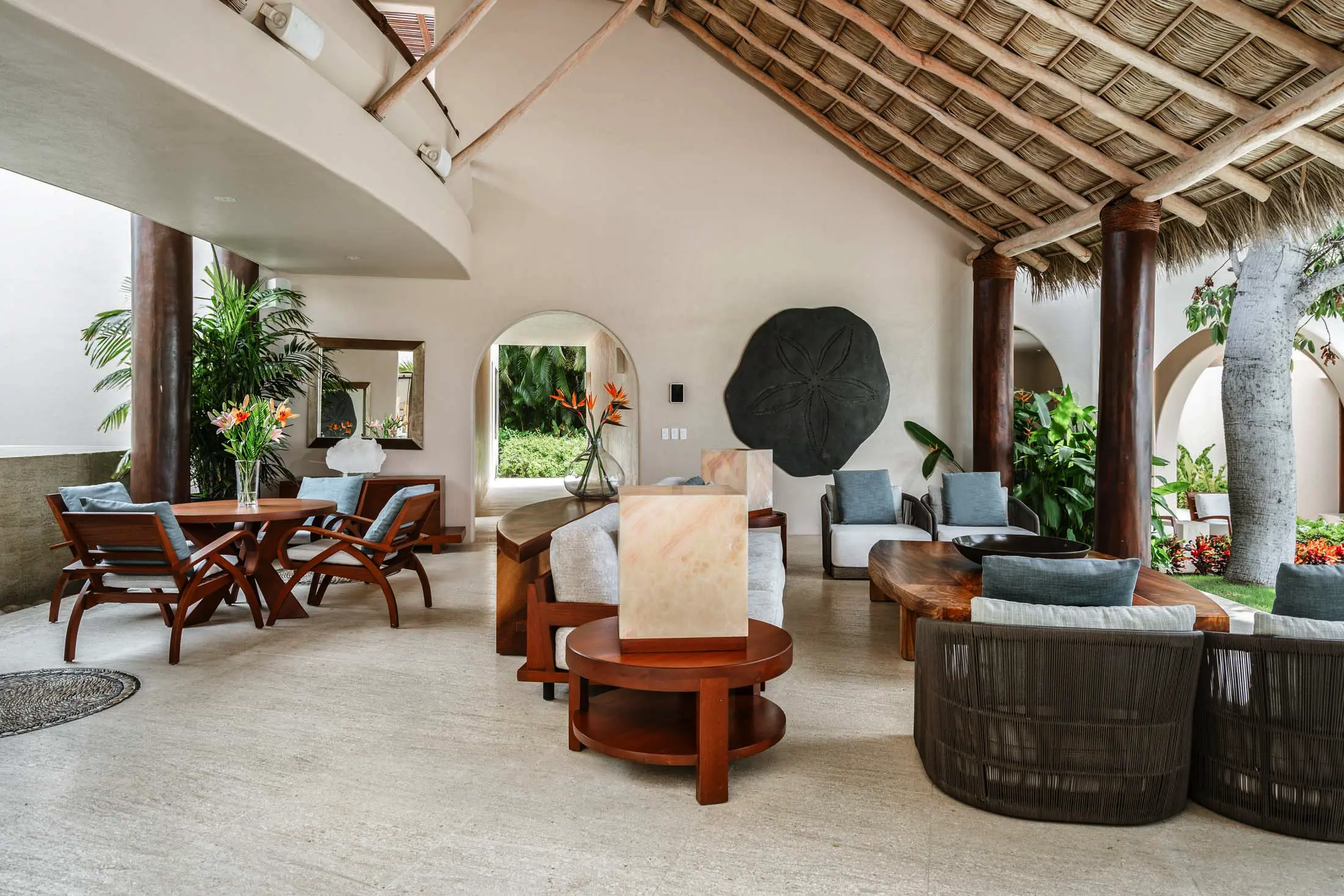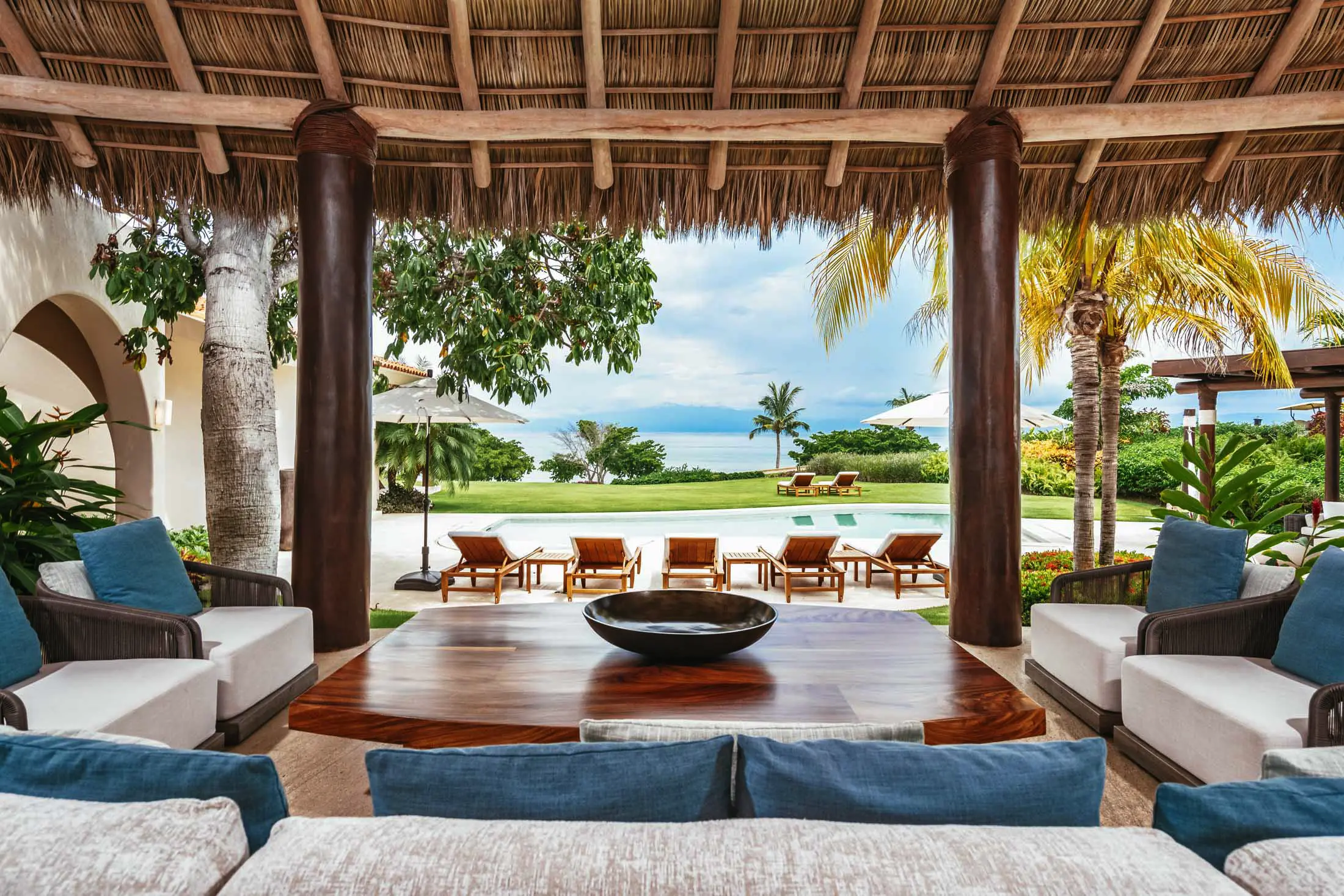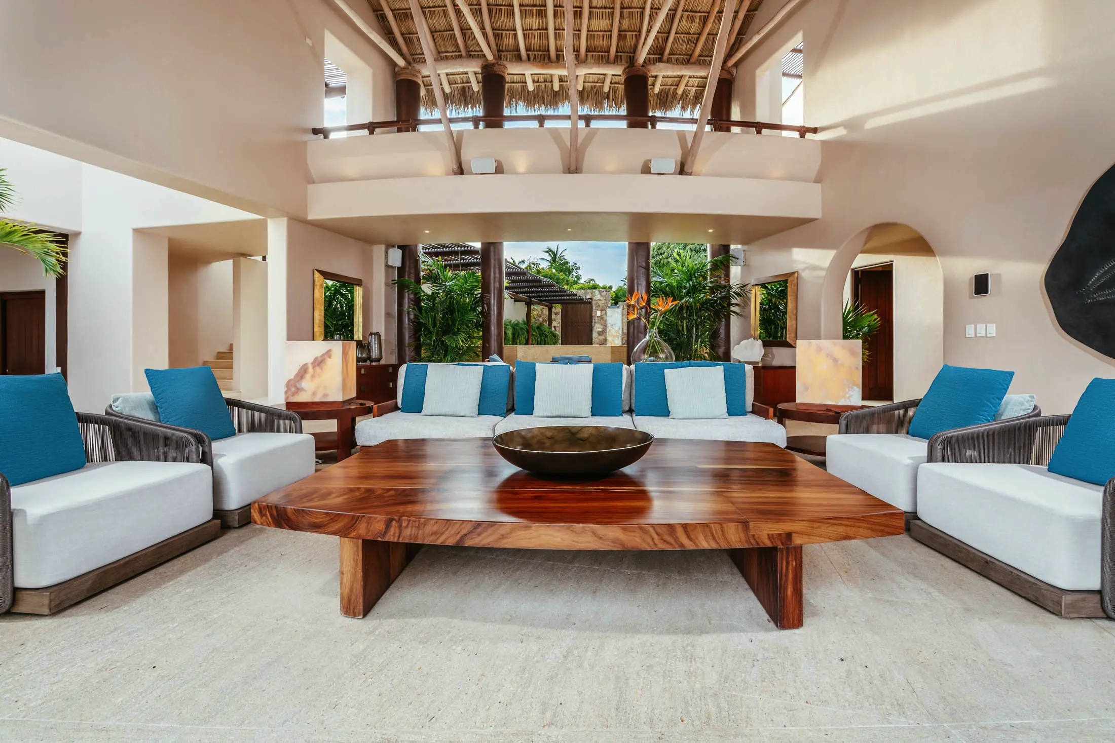 Open-air living room beneath a 30-foot palapa roof