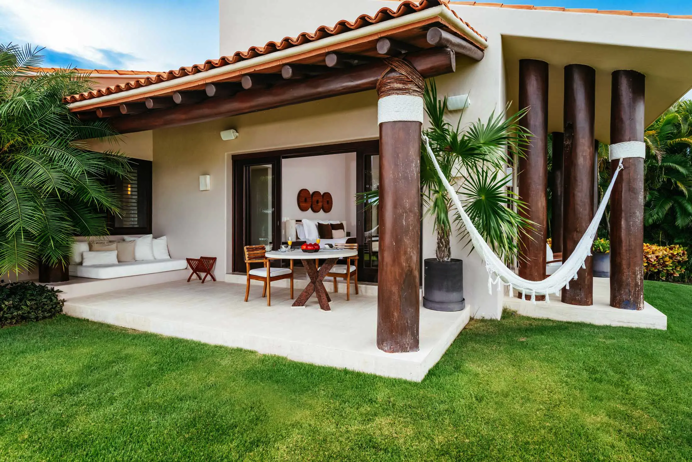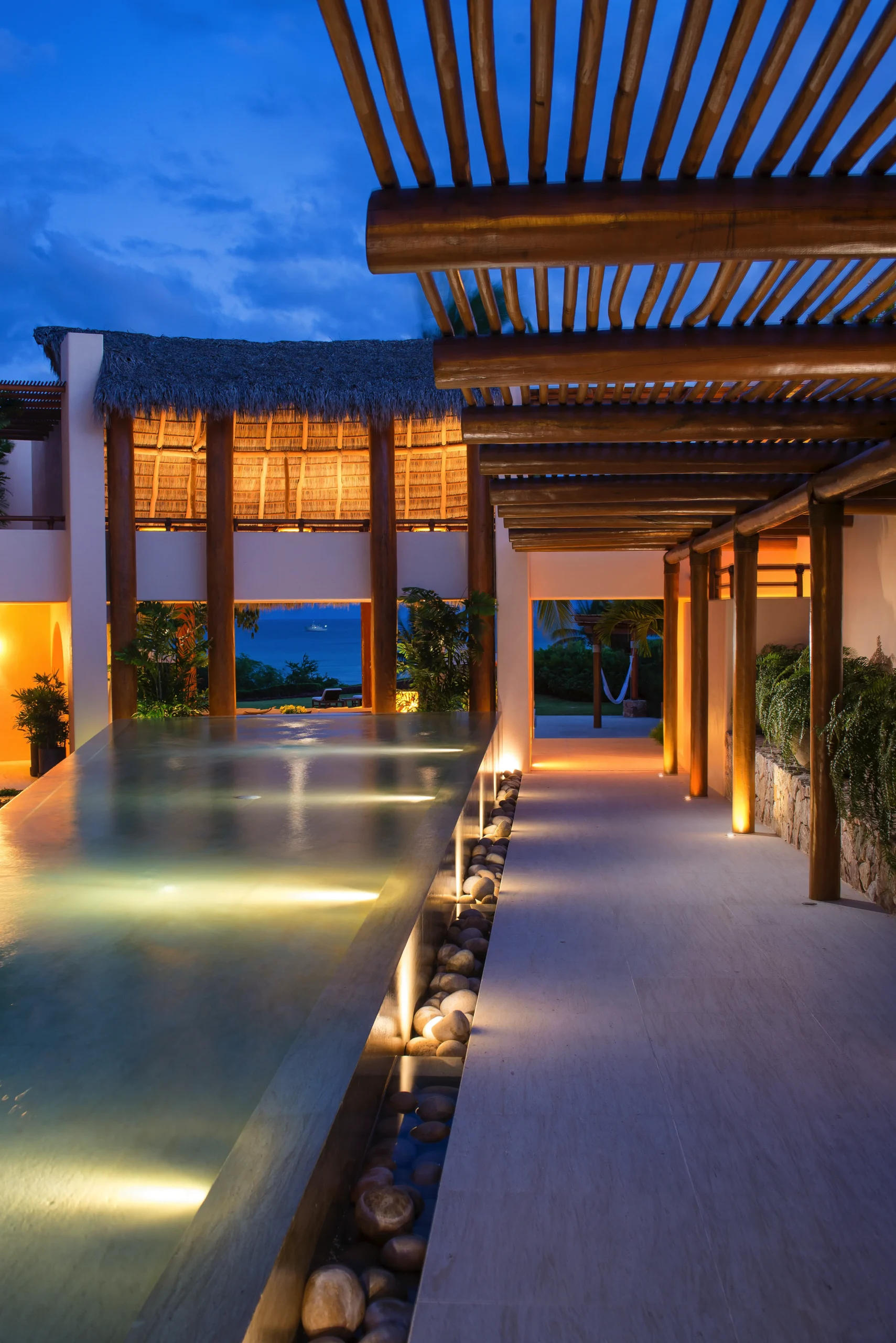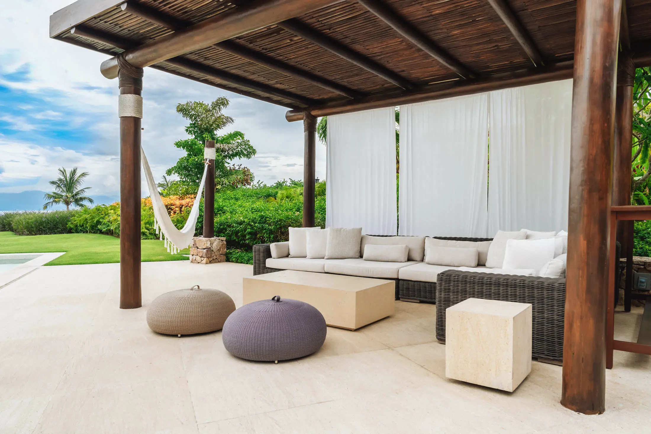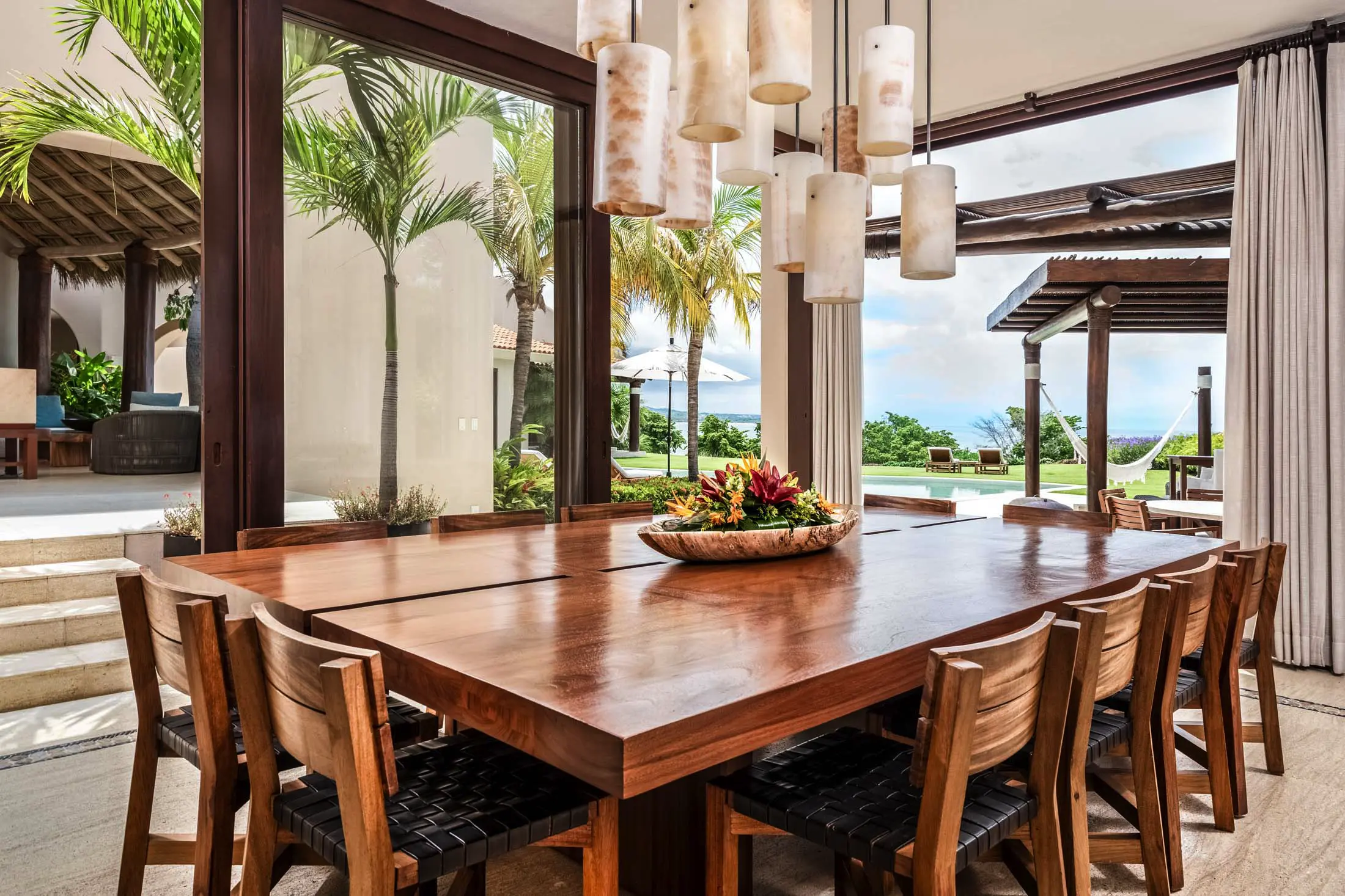 Open-air living room beneath a 30-foot palapa roof