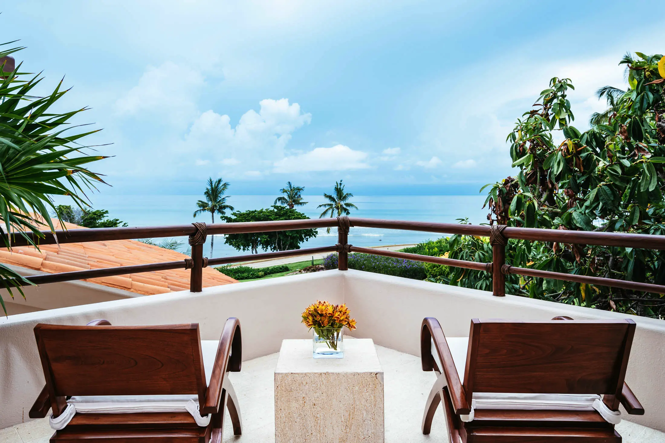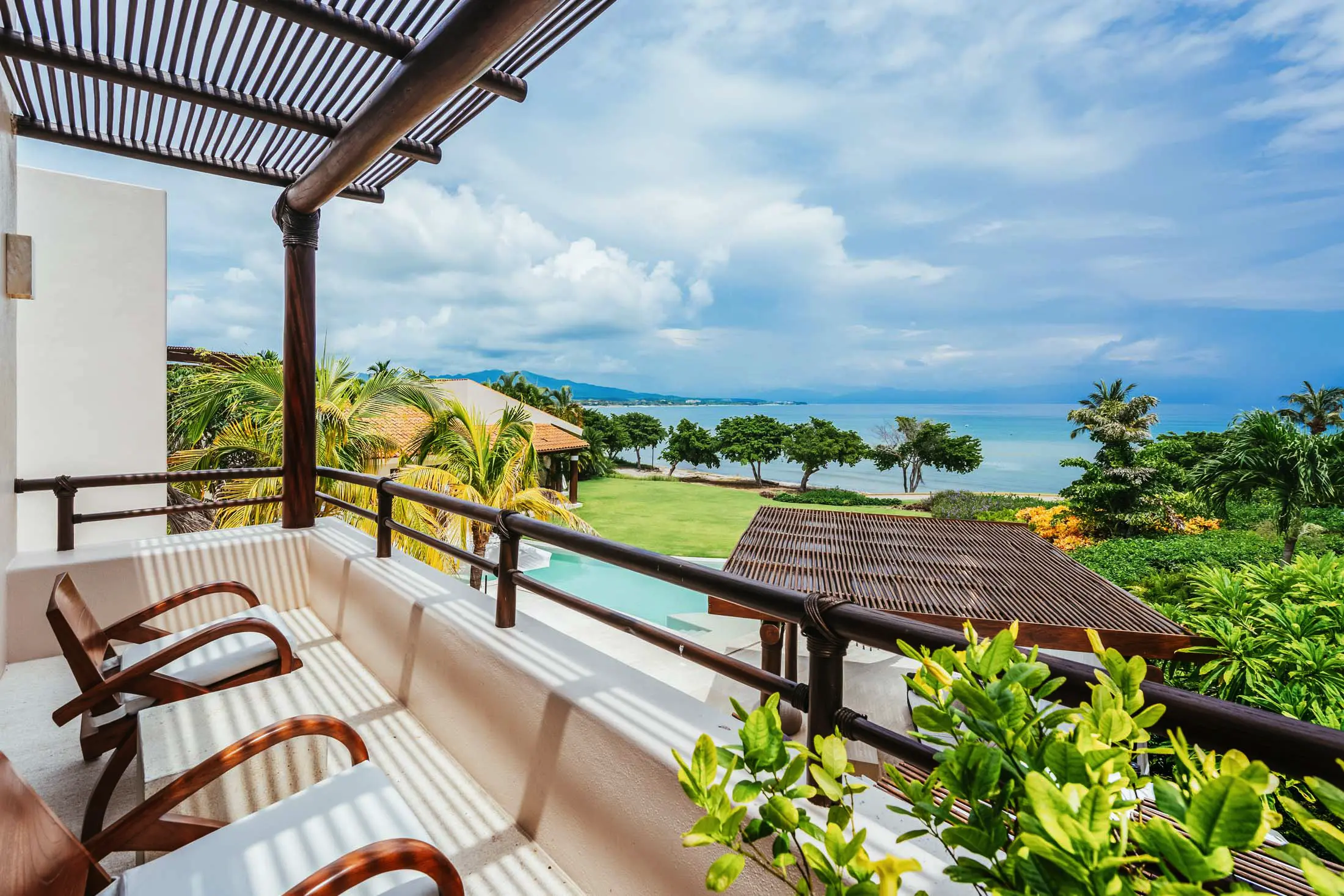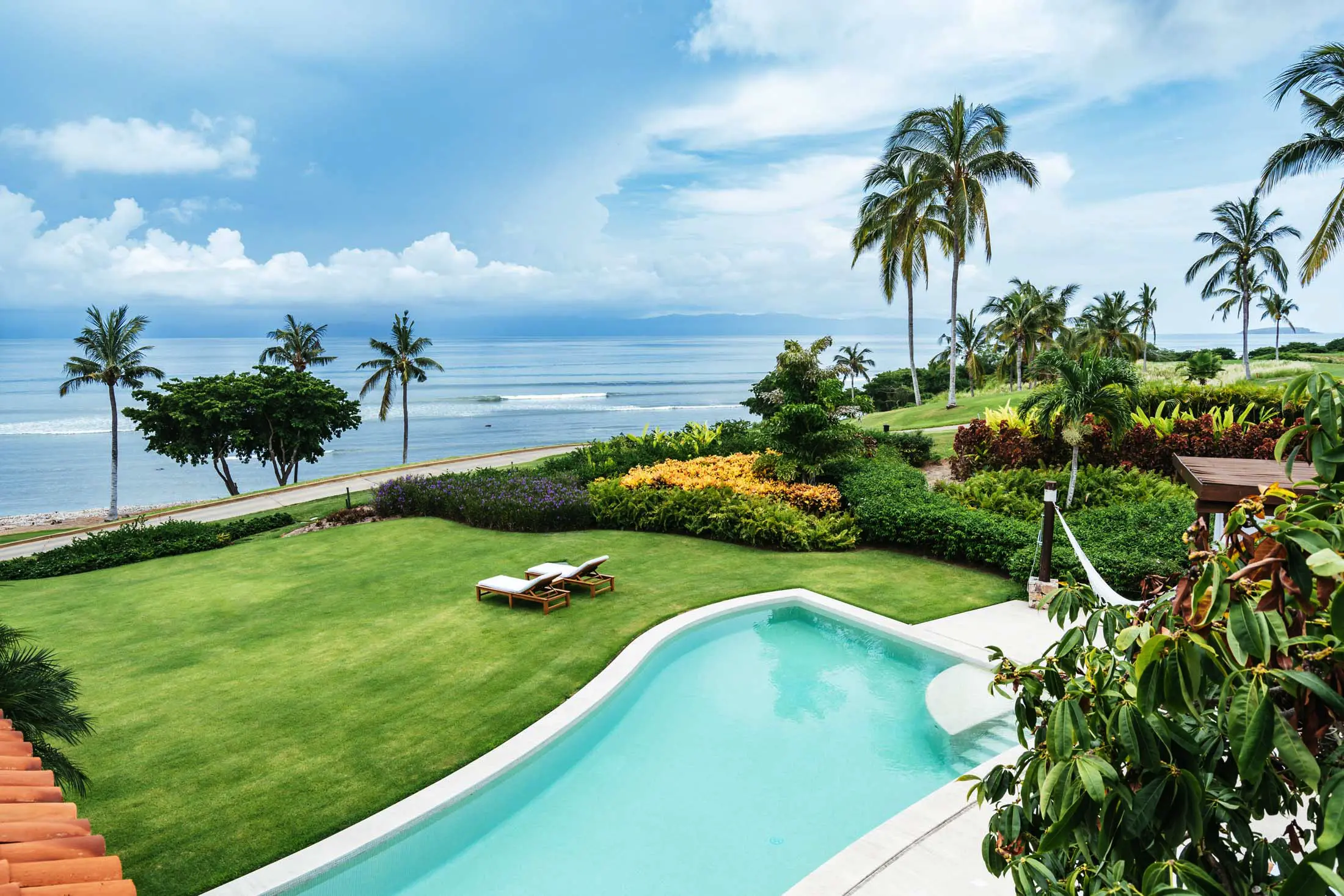 Lush tropical landscaping and panoramic coastal views