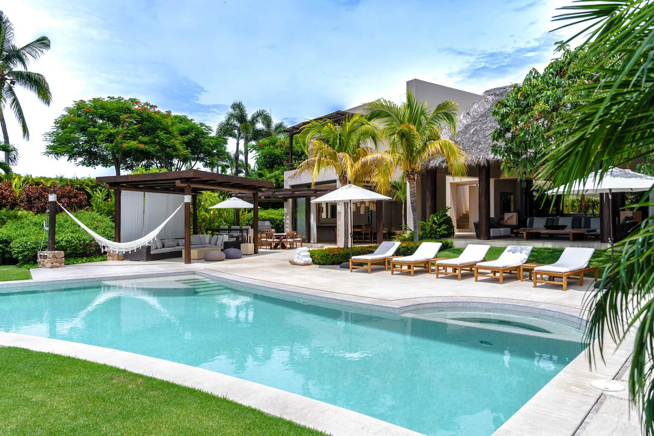 Shaded poolside pergola with designer loungers