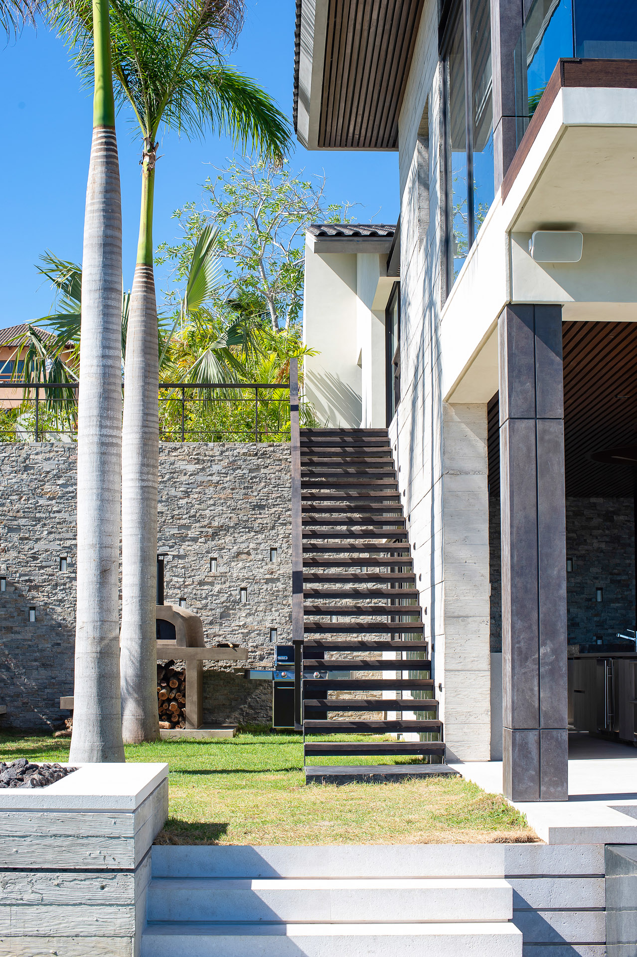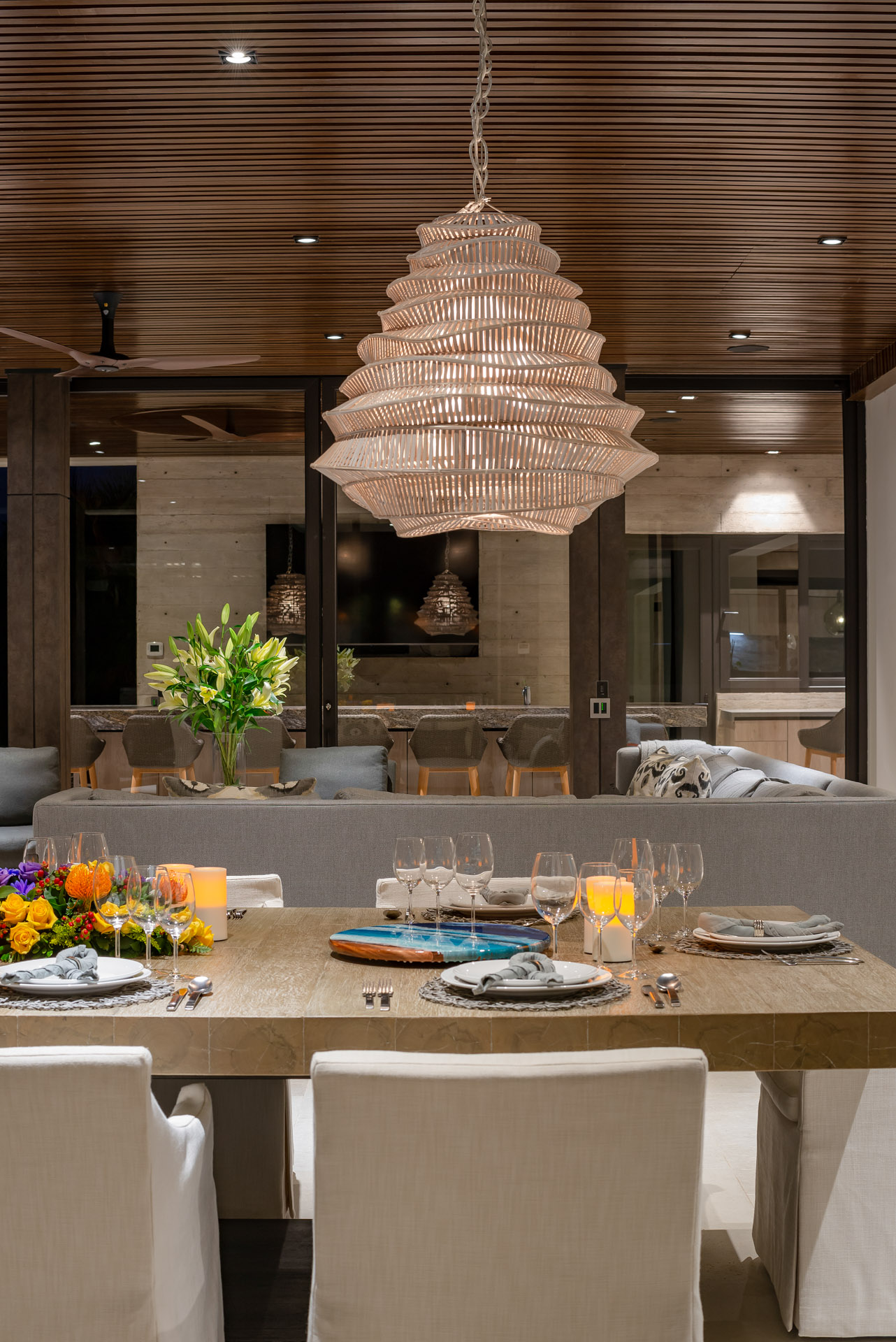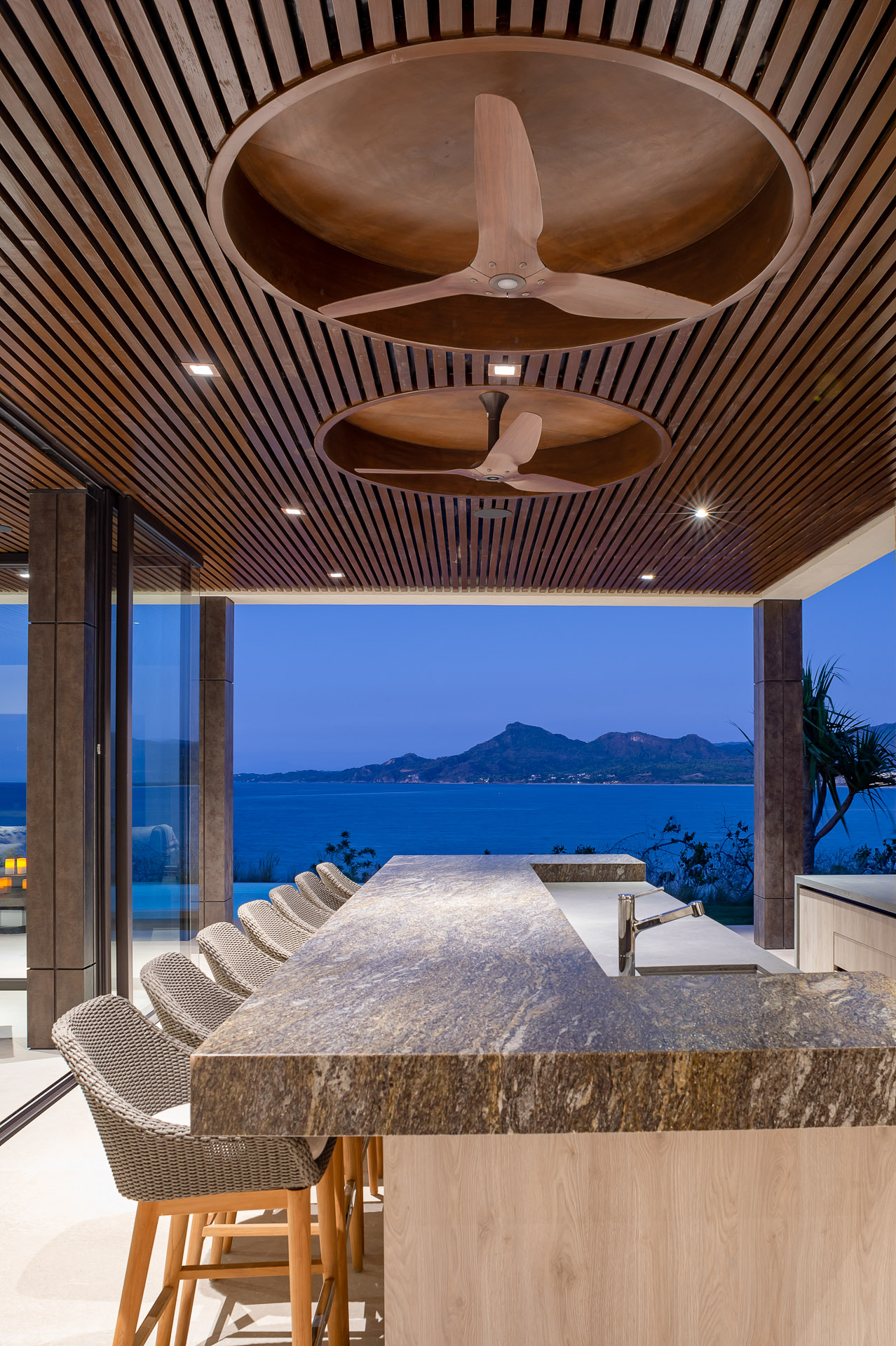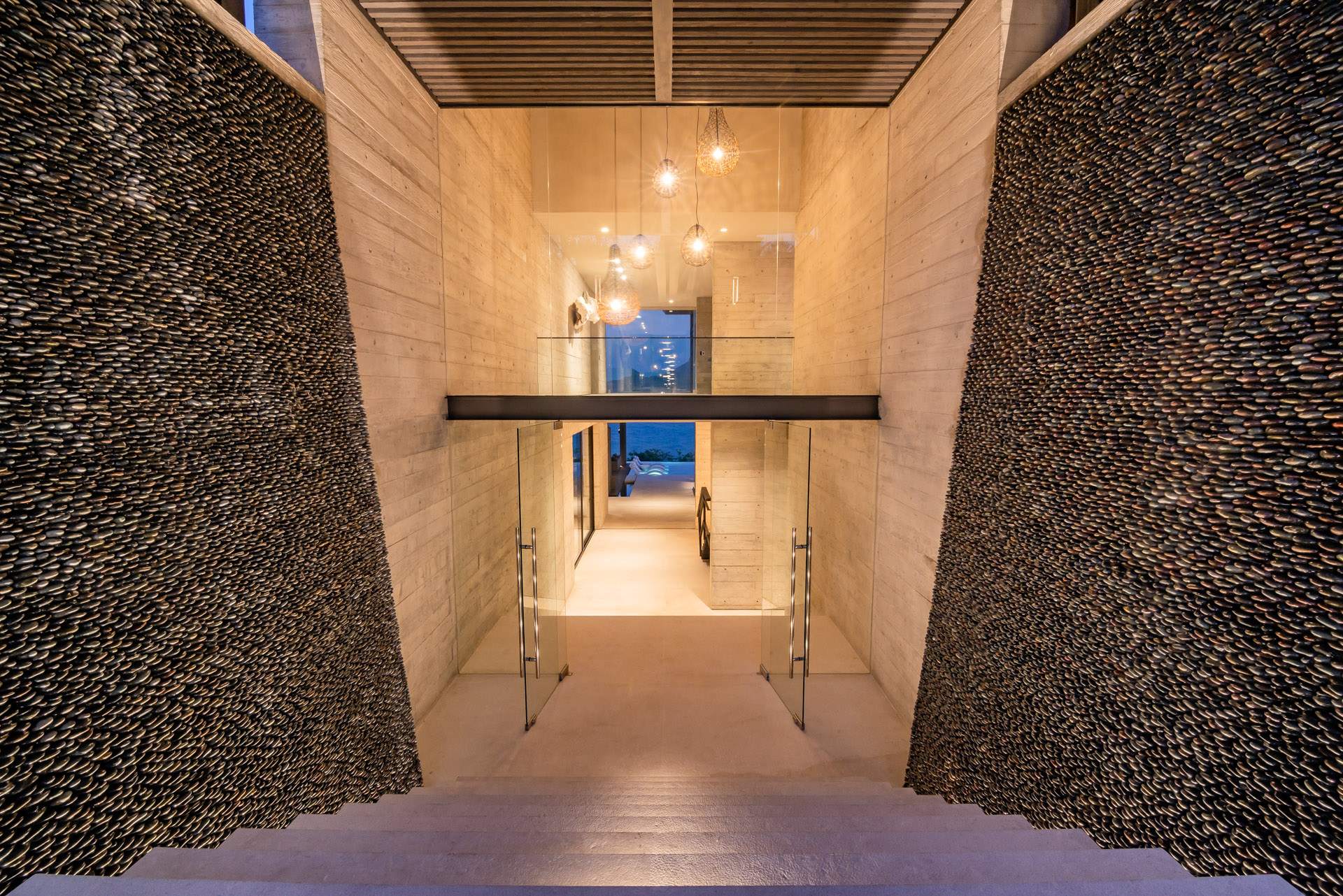 You enter Kupuri 32 by descending fifteen-foot-wide marble stairs bordered on both sides by a shimmering waterfall of thousands of small rounded black stones. With each step, the view in front of you slowly enlarges, revealing the reef, the ocean, and finally the mountain in the distance. The house was designed with three distinct goals: amazing views from every room, a laid-back five-star resort feel, and spaces that encourage family bonding and lifetime memories. The result is an architectural masterpiece that seamlessly merges indoor luxury with the raw beauty of the Pacific coastline.