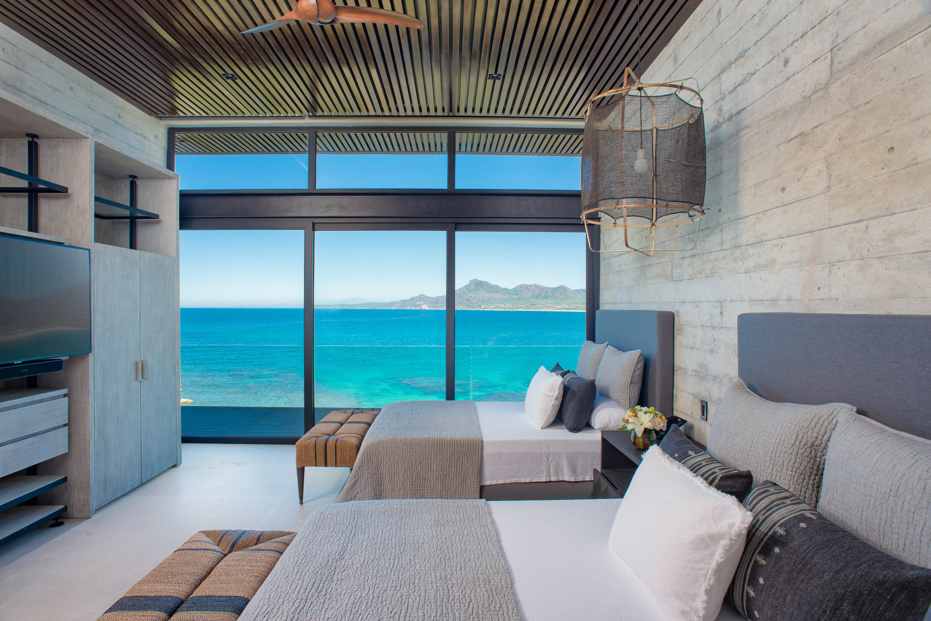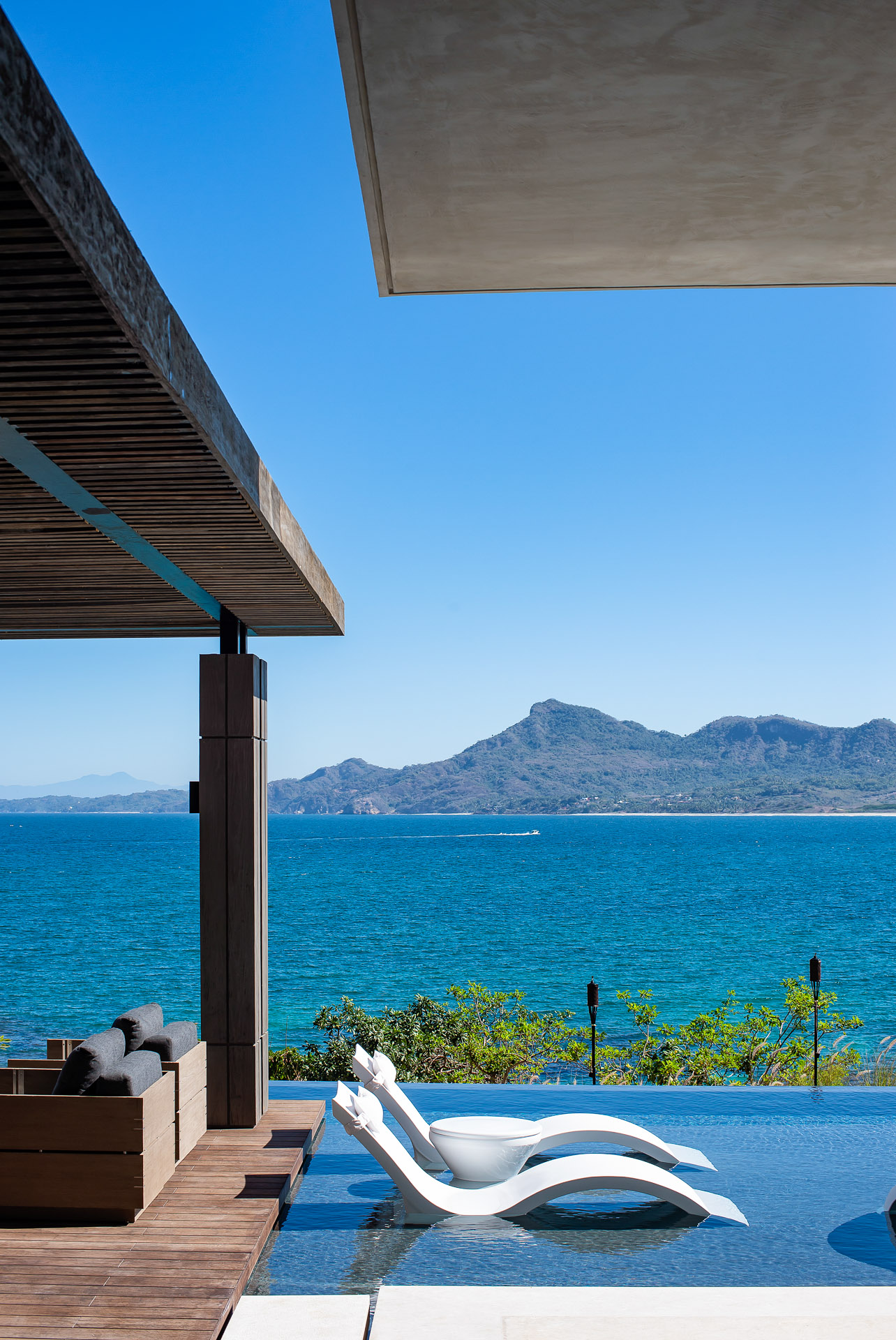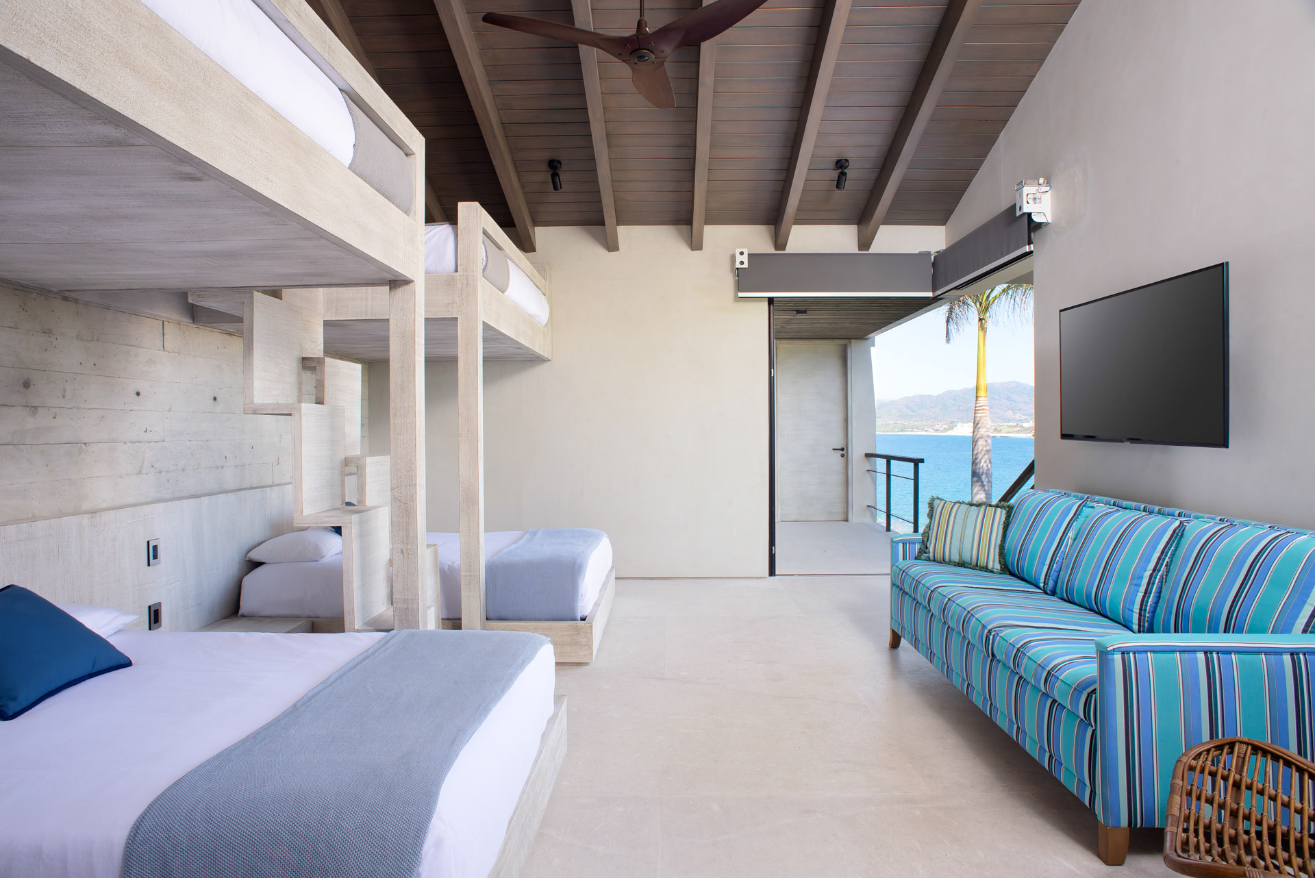 Six bedroom suites accommodate up to sixteen guests in extraordinary comfort. Three master suites feature king-size beds with floor-to-ceiling ocean views, while additional bedrooms offer queen beds, bunk configurations, and a dedicated teens’ room. Every bedroom includes air conditioning, ensuite bathroom, and stunning views of either the ocean, jungle, or mountain landscape.