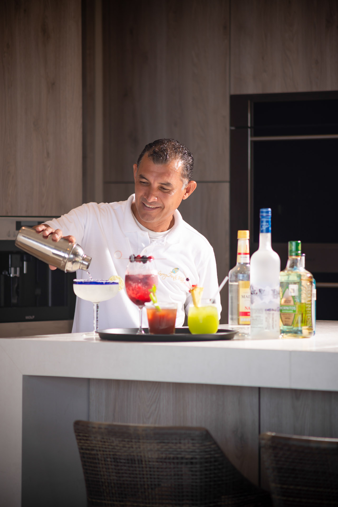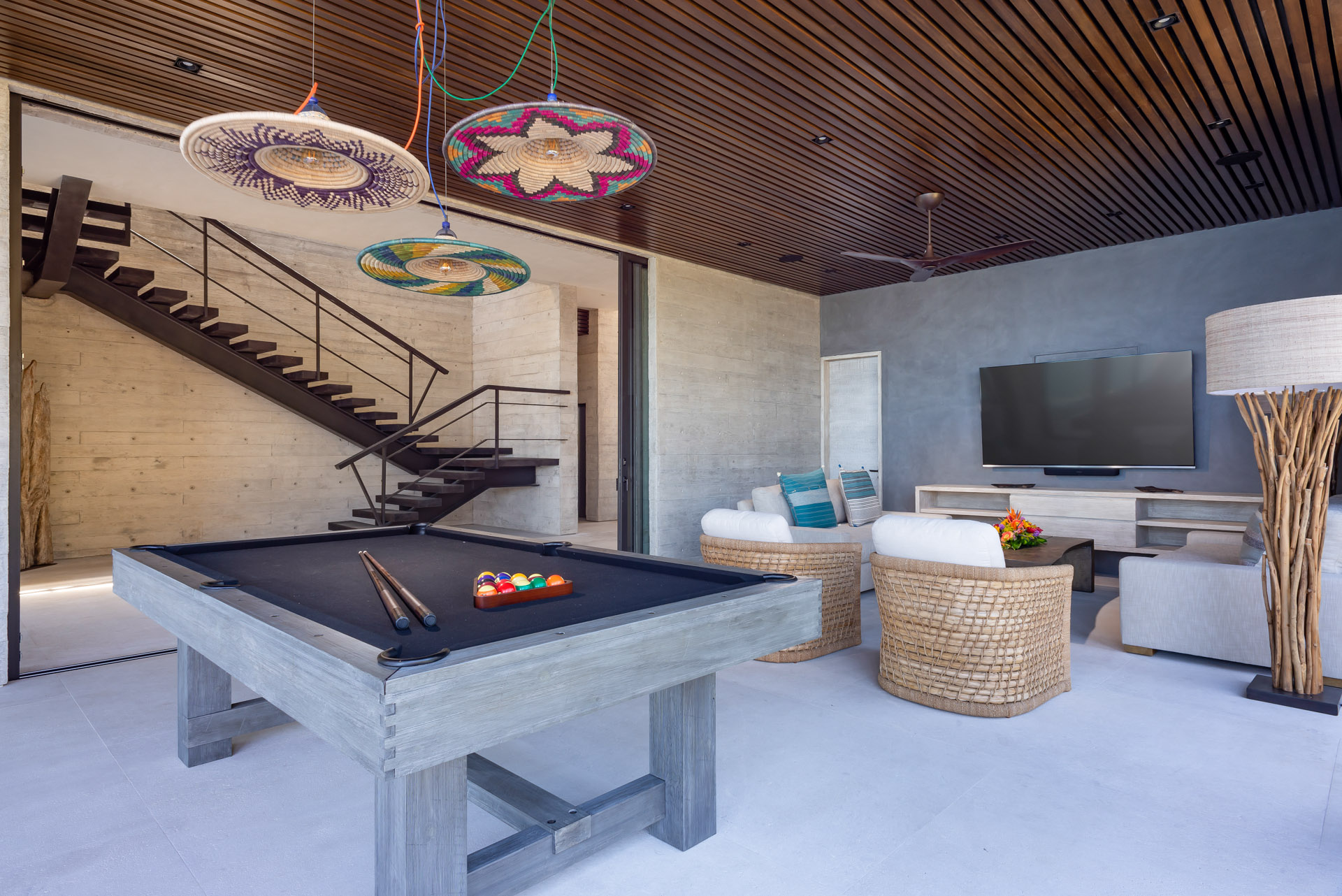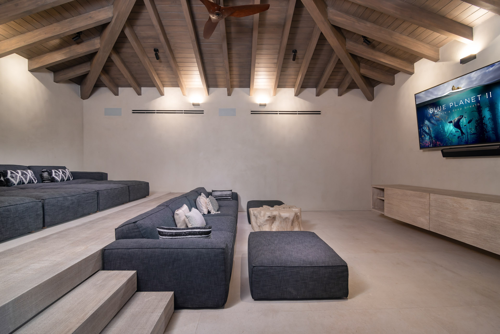 Inside, the open-plan living areas flow through a gourmet kitchen, formal dining for twelve, and multiple sitting areas out to the expansive ocean-facing terrace. A dedicated media room boasts an 82-inch Samsung Smart TV with PlayStation and seating for fifteen, while a large game room with a pool table, ping pong table, and video games ensures entertainment for guests of all ages. The villa also features a private bar, a sauna, a fitness center with exercise equipment, and an elevator for ease of access between levels.