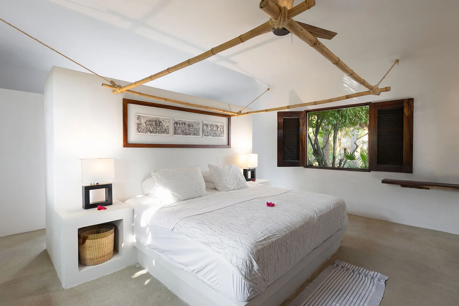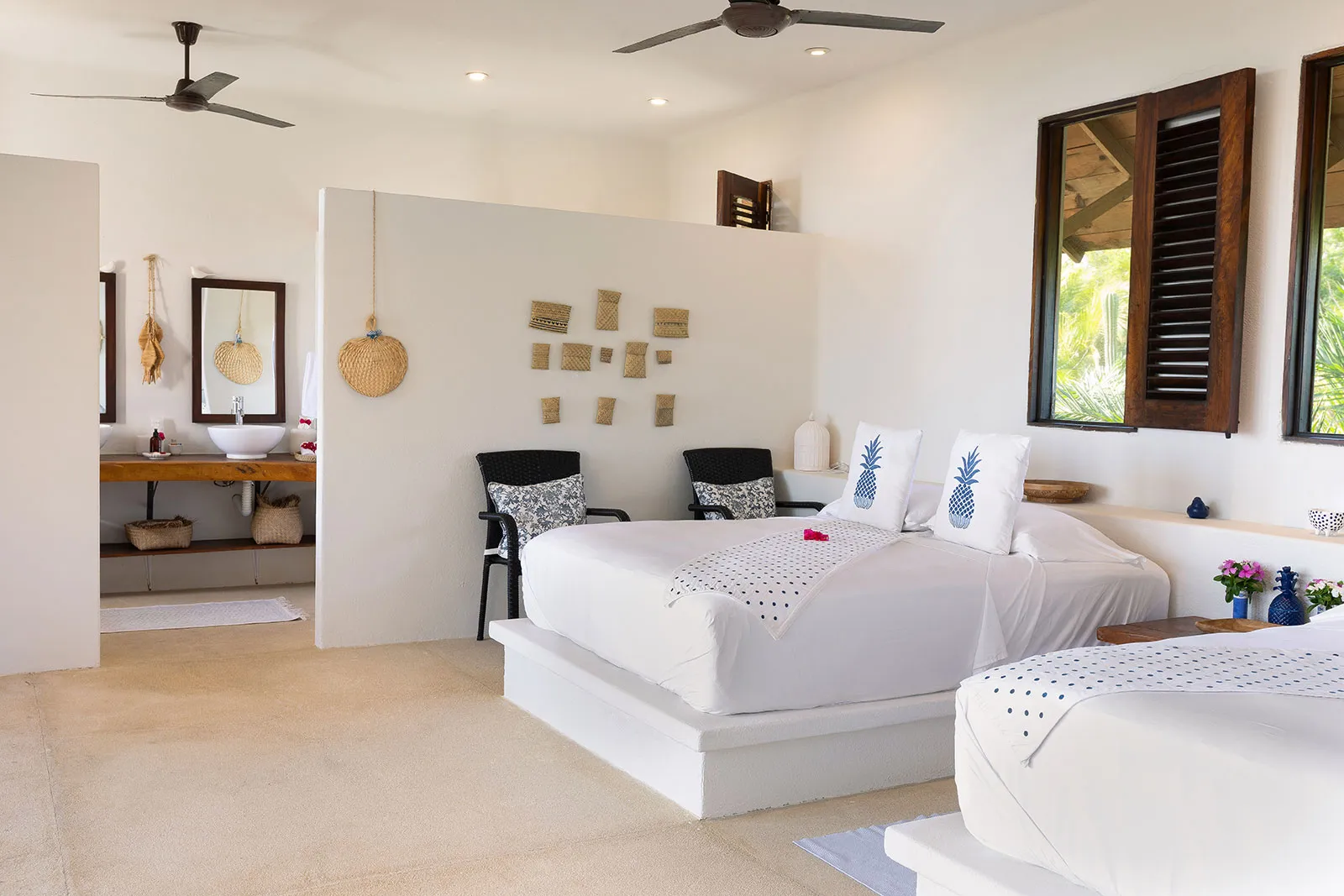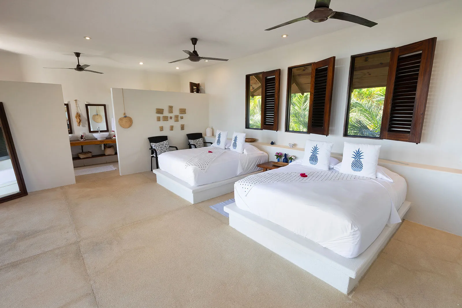 Casa Los Guajes offers five distinct bungalow suites. Each brims with luxury amenities typical of an upscale beach house. Whether renting a bungalow or the entire property, guests are treated to lavish beds, premium linens, and terraces showcasing breathtaking jungle and sea views.