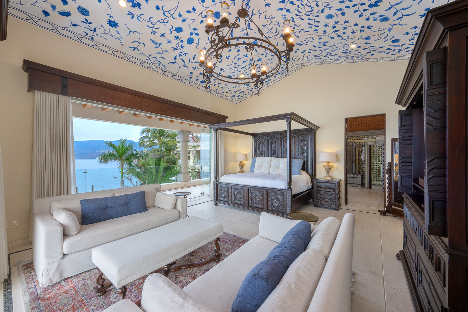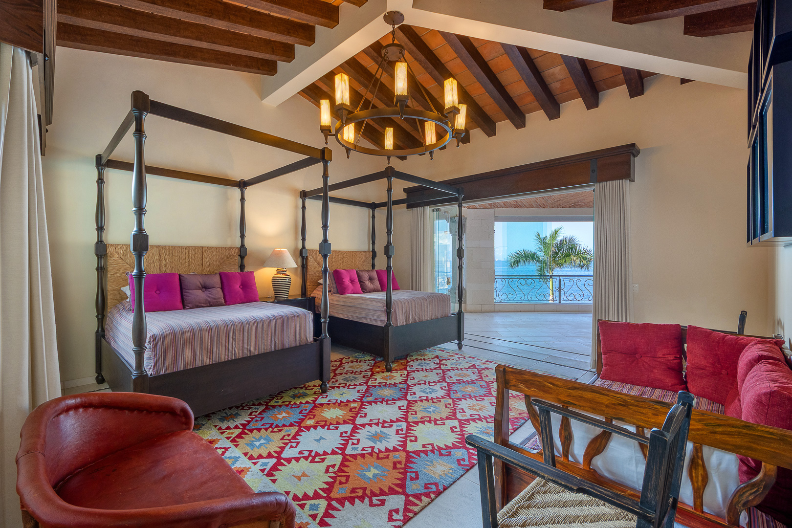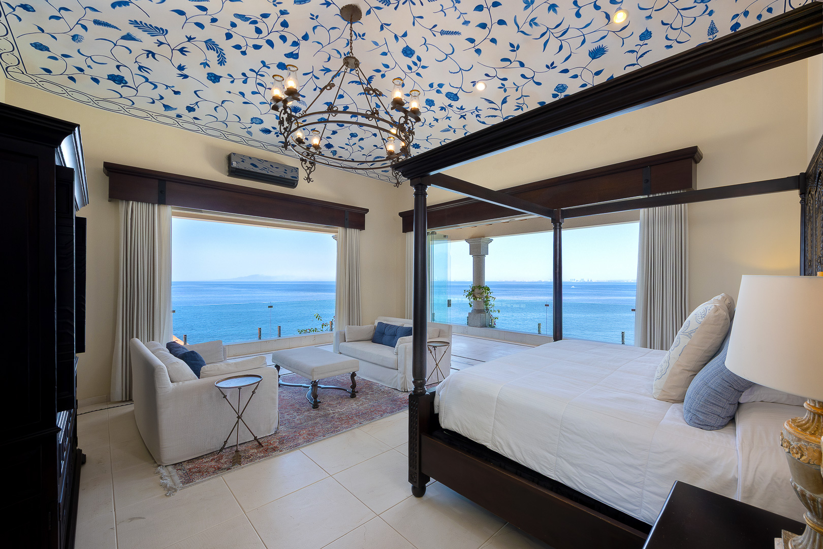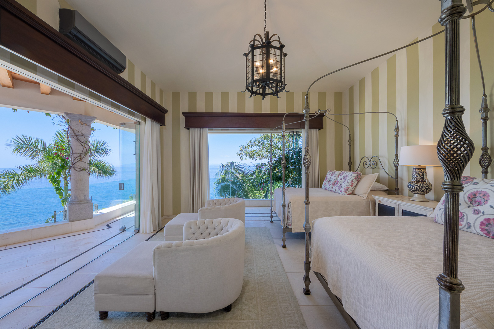Two queen canopy beds, oceanfront views, refined finishes, spacious ensuite bath, romantic daybed lounge, shared terrace, air conditioning