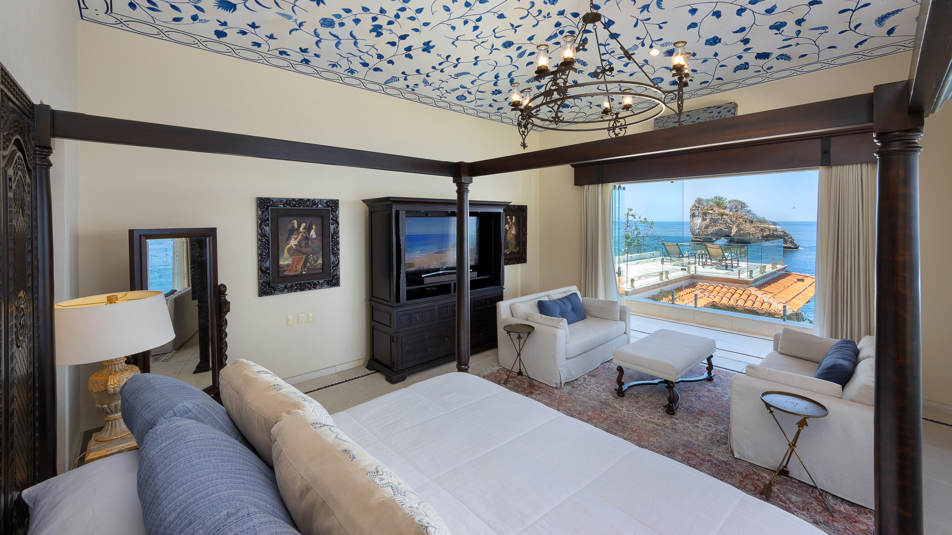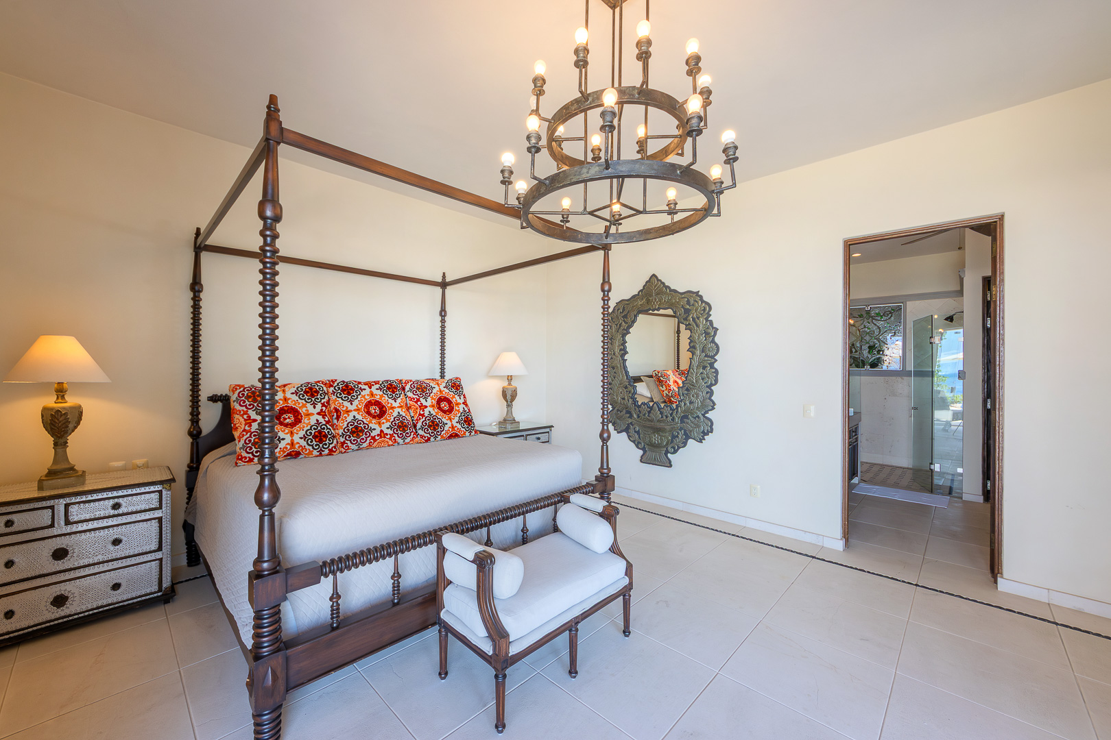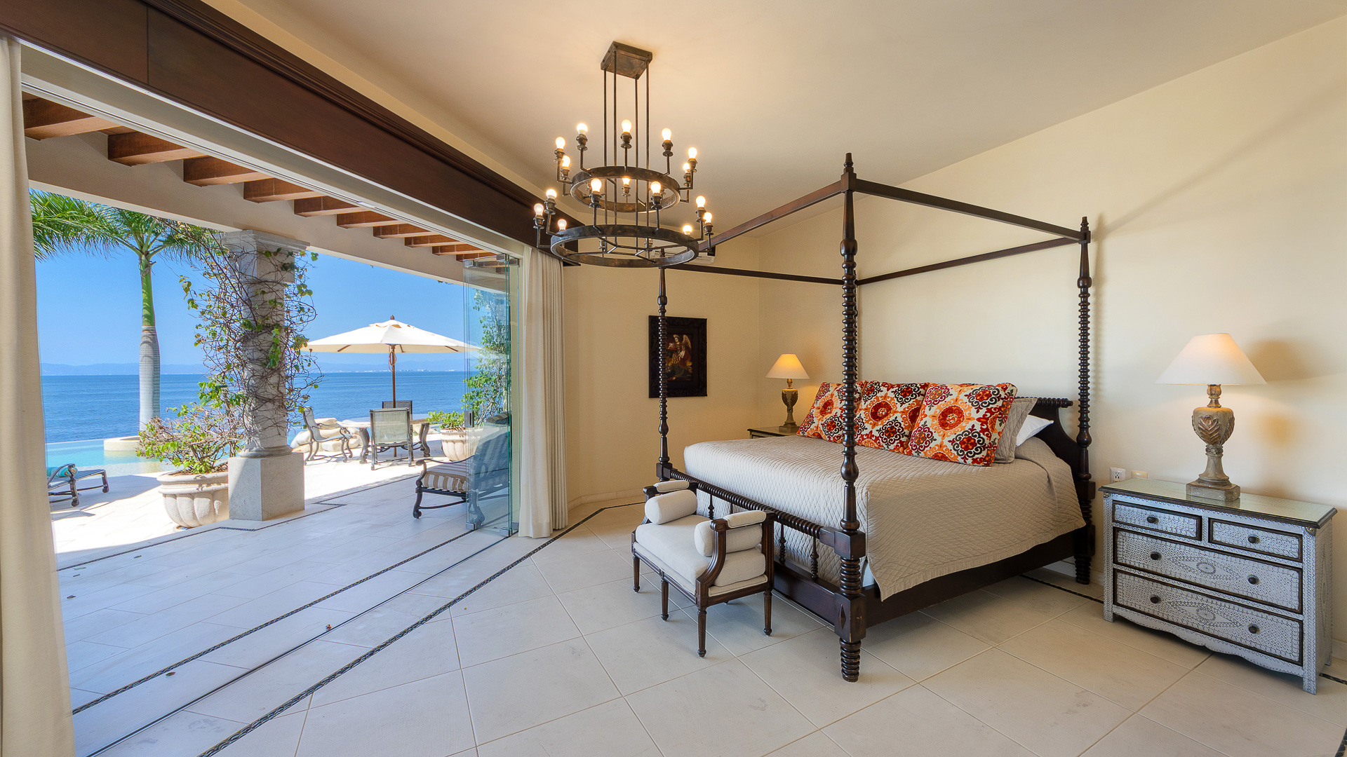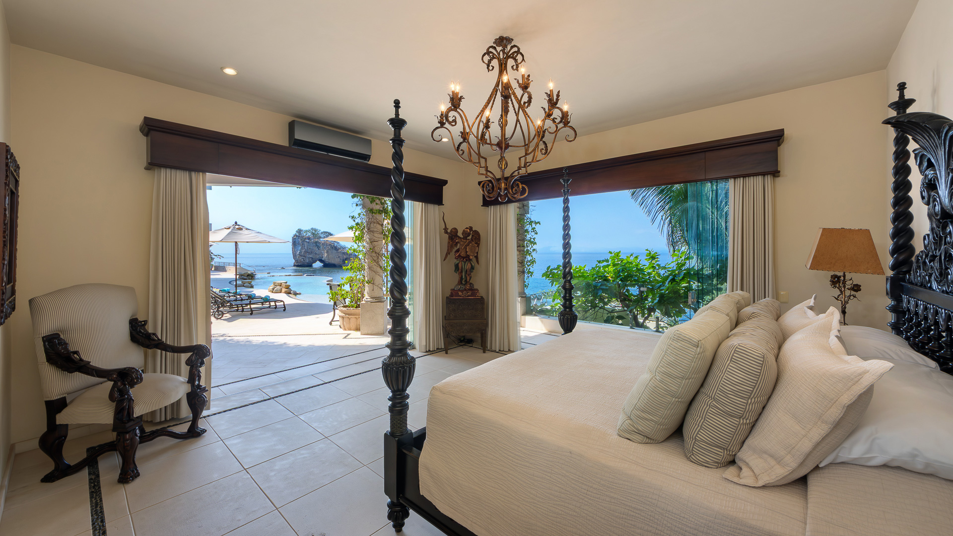 King canopy bed, private terrace with direct access to the pool deck, ensuite bath, designed for indoor-outdoor living, air conditioning