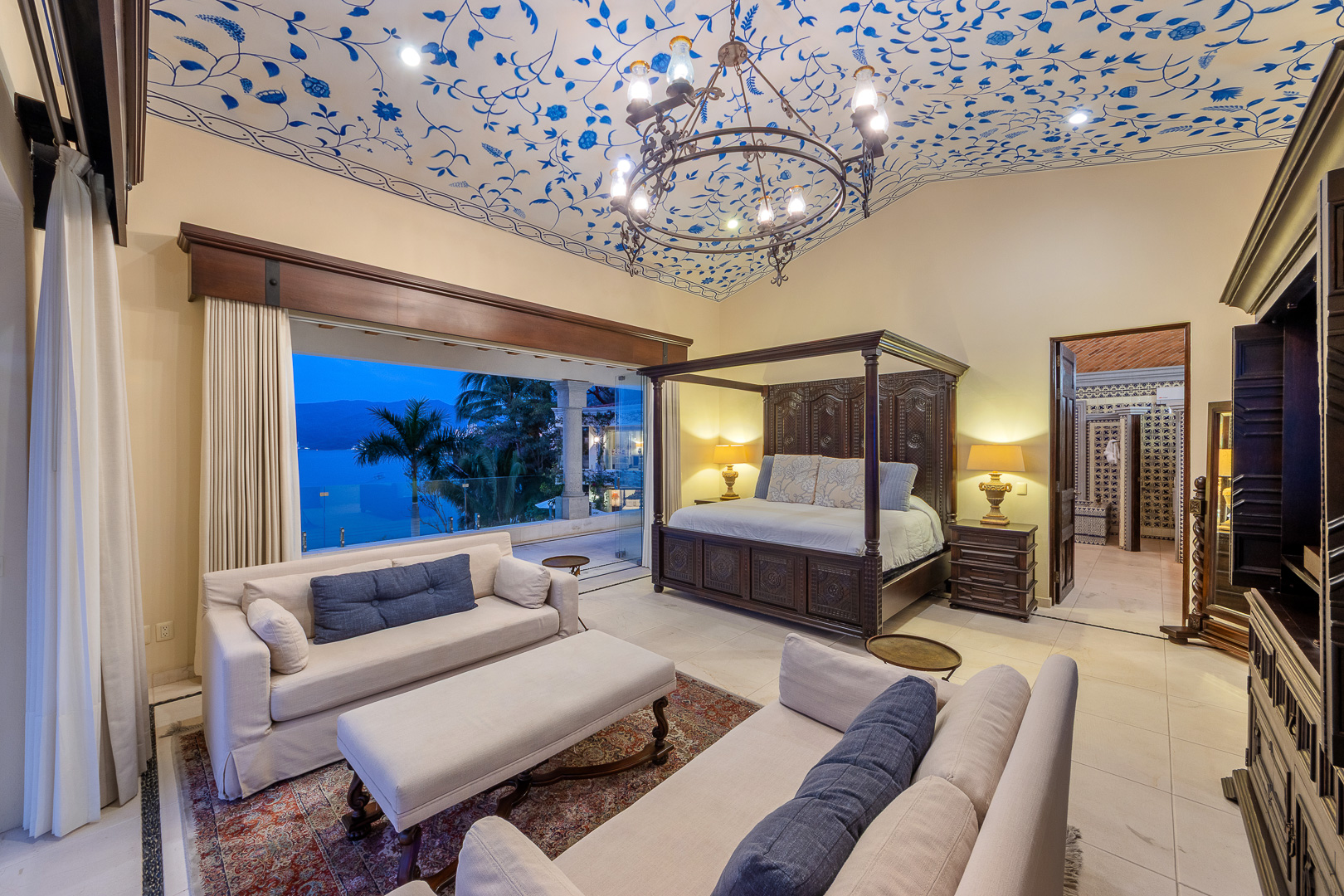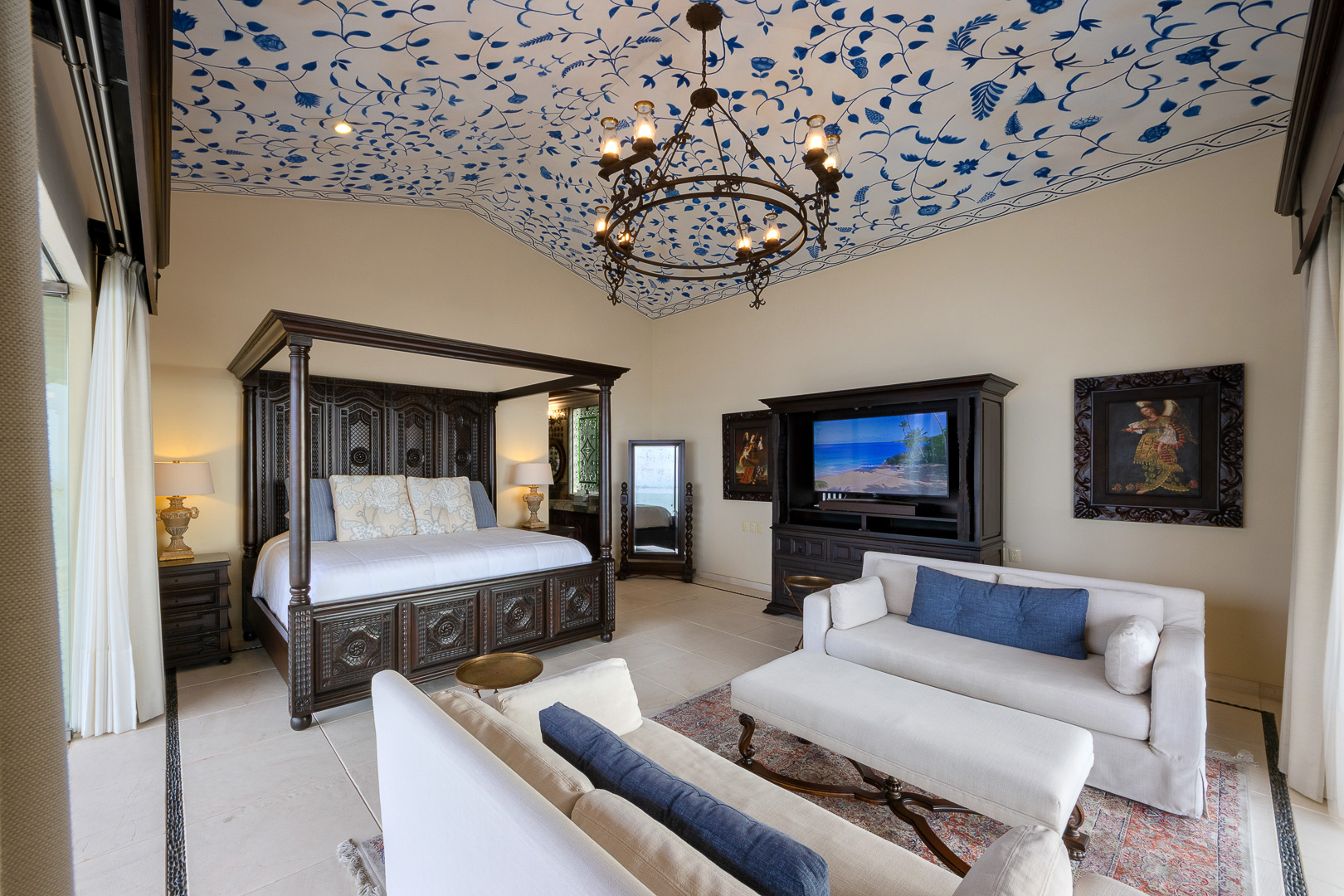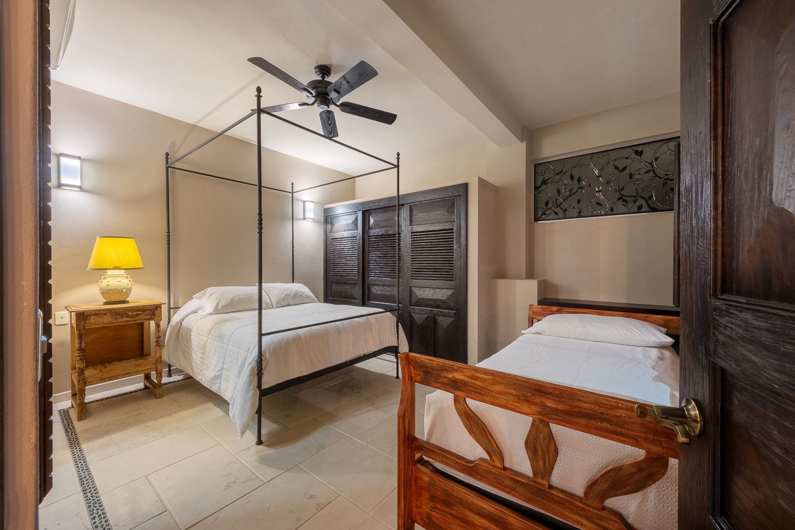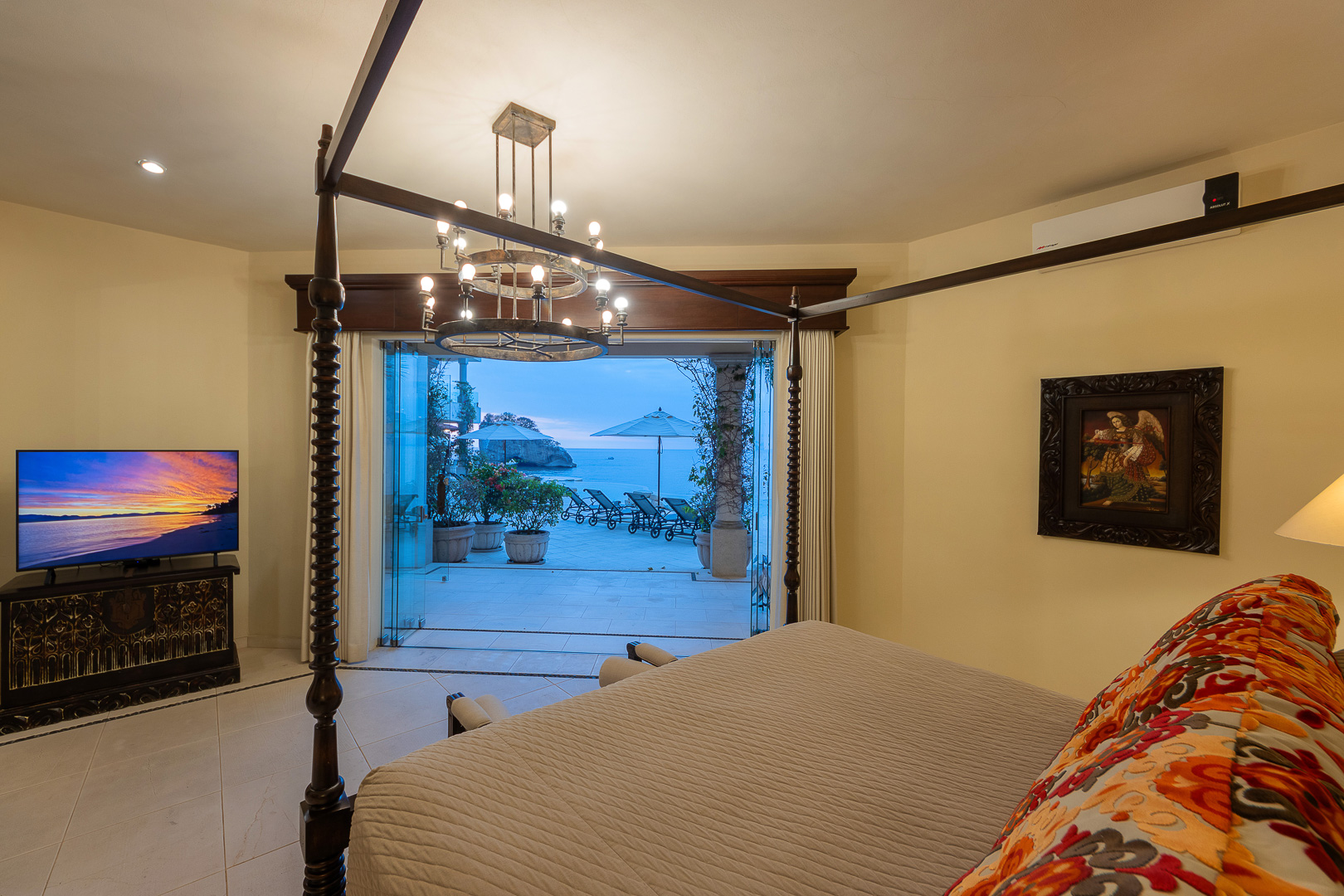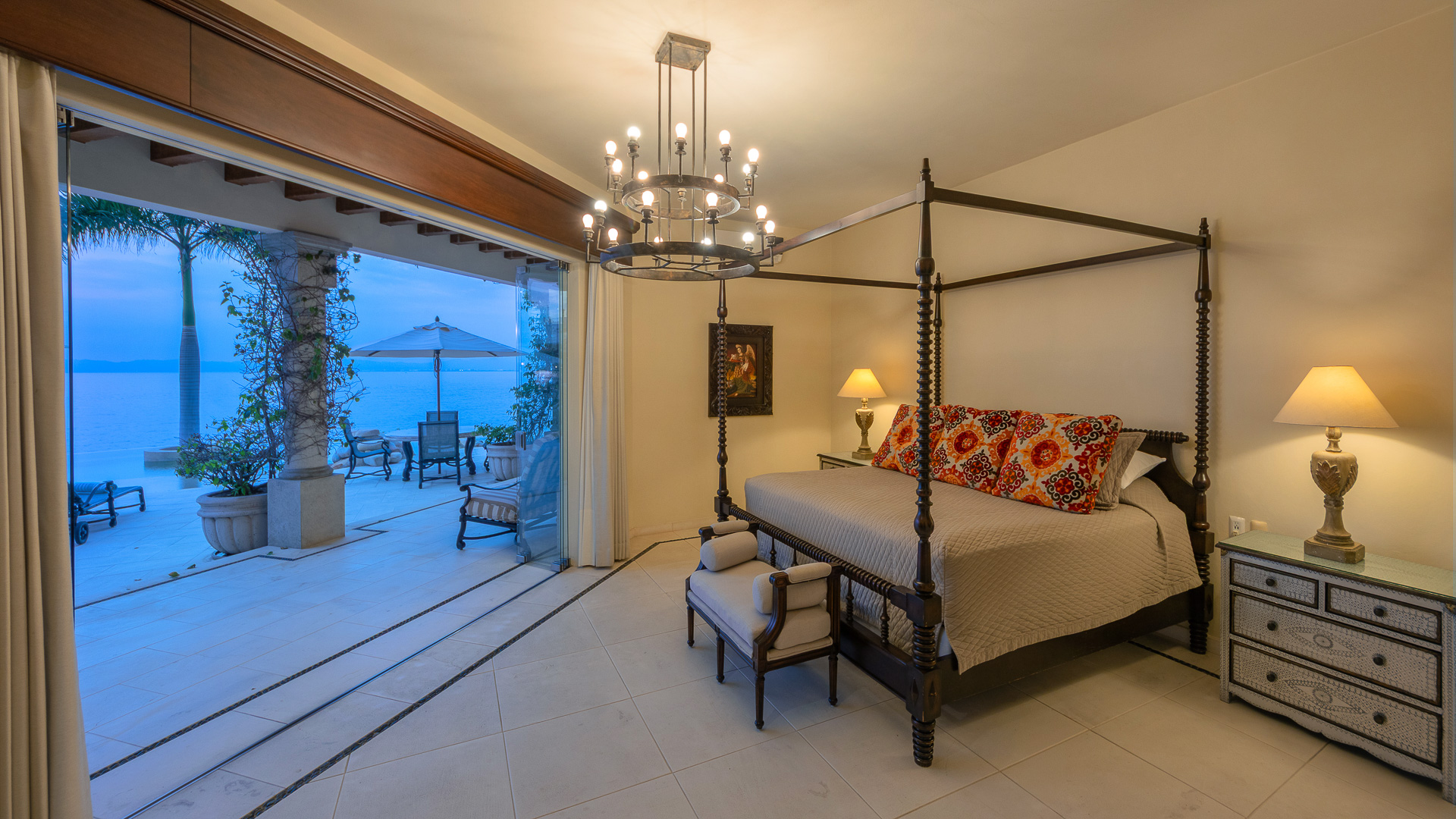 King canopy bed, private terrace with direct access to the pool deck, ensuite bath, designed for indoor-outdoor living, air conditioning