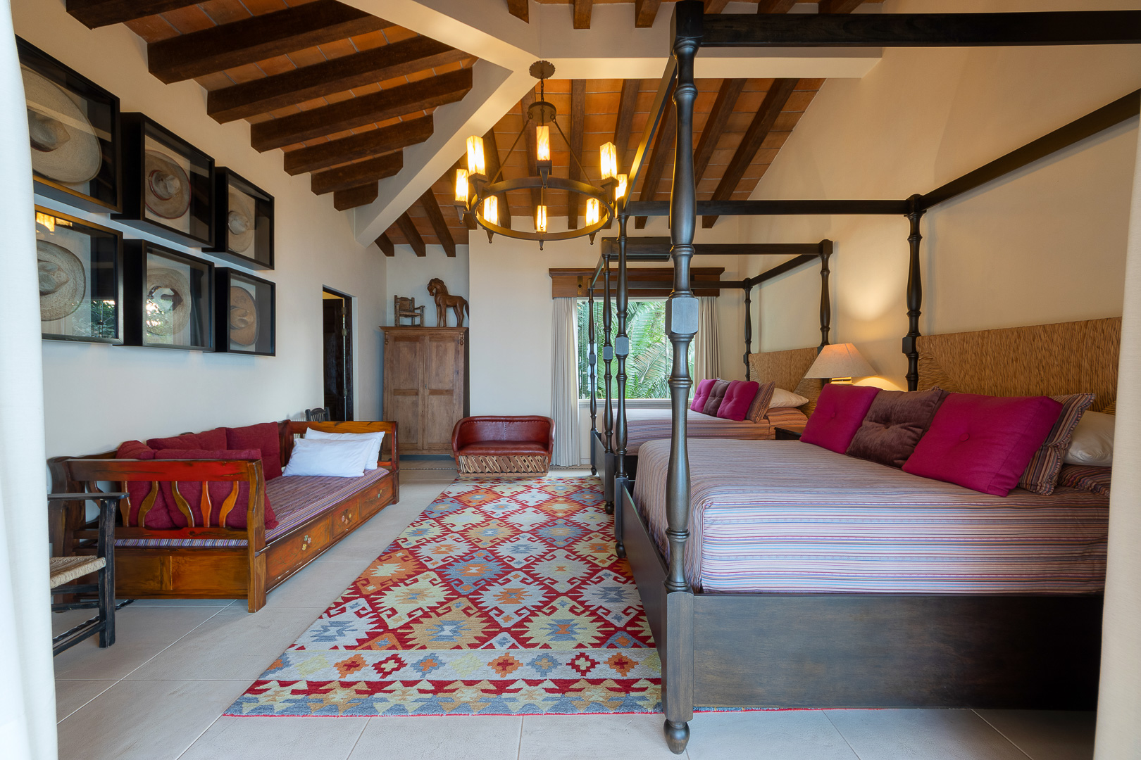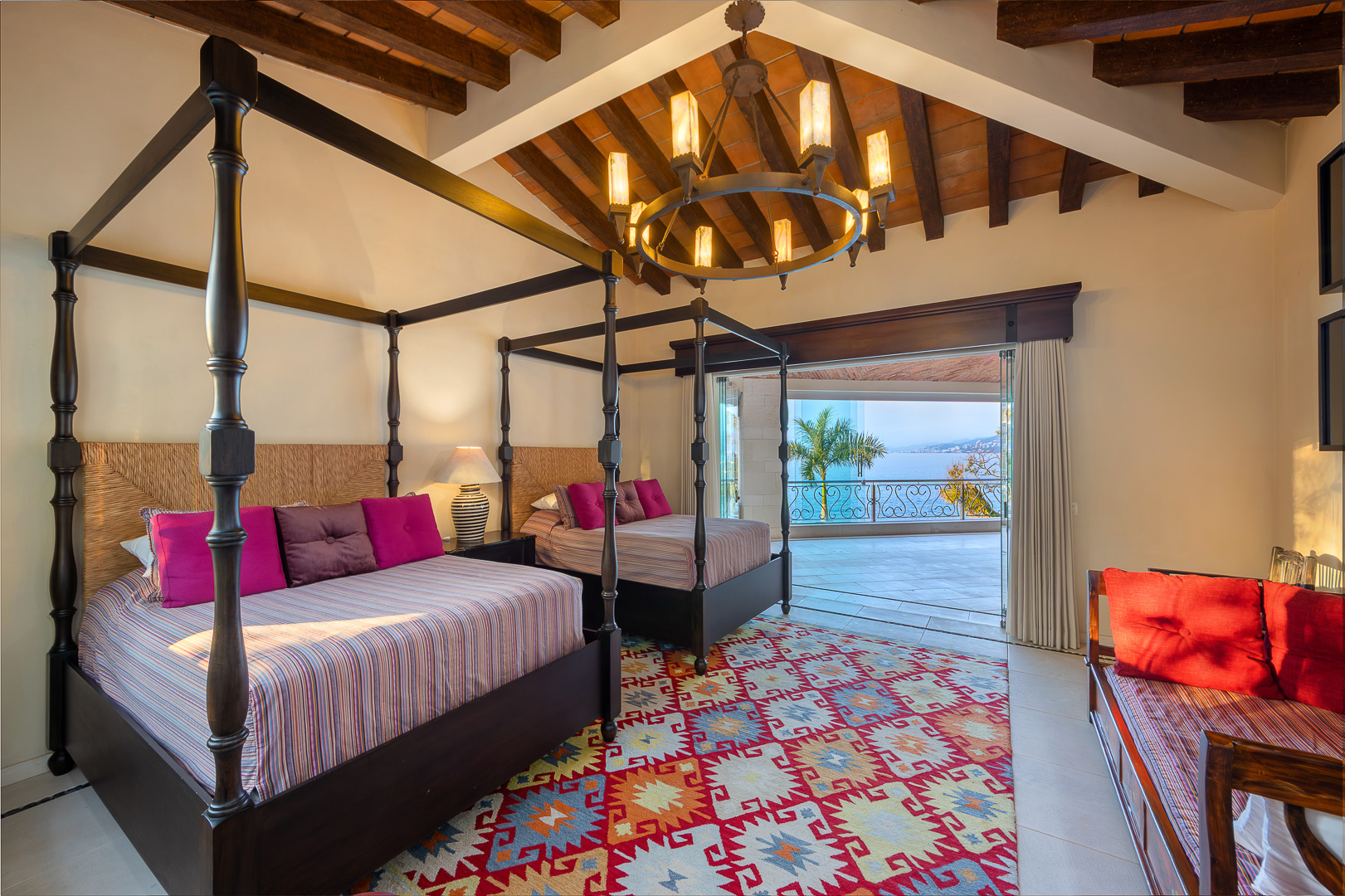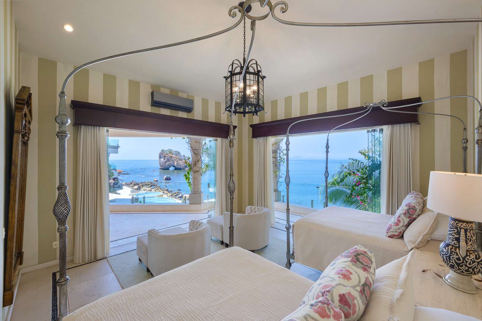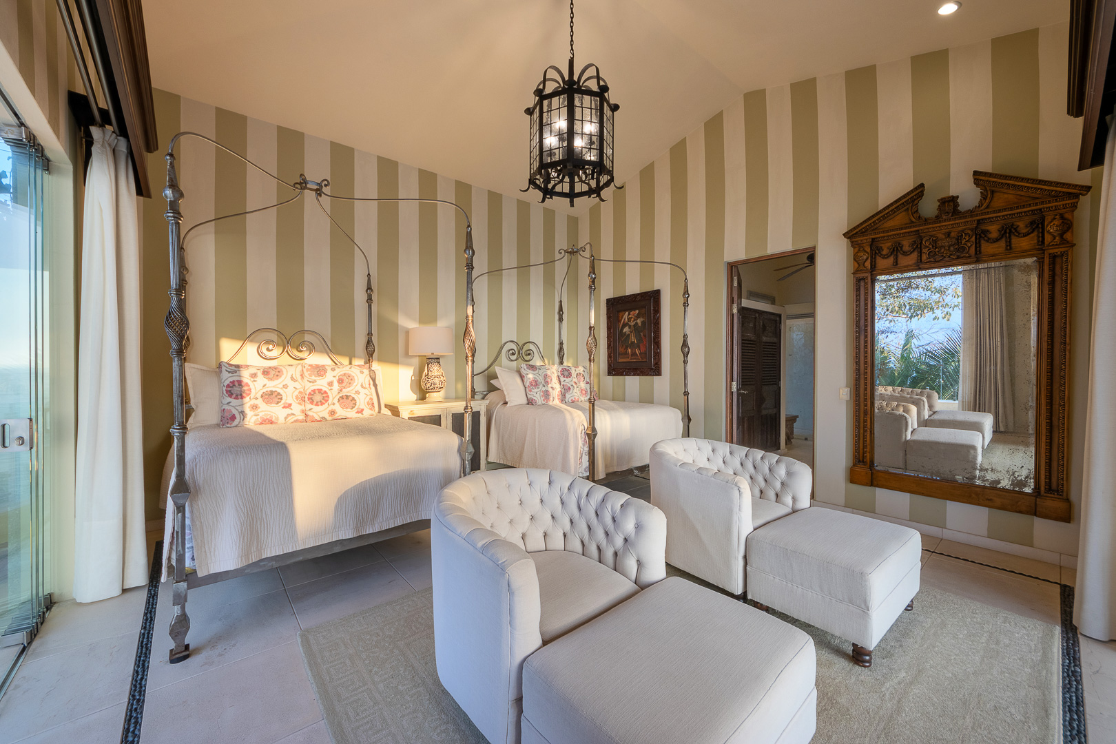 Twin canopy beds, plush seating area, tranquil views toward Los Arcos, ensuite bath, air conditioning