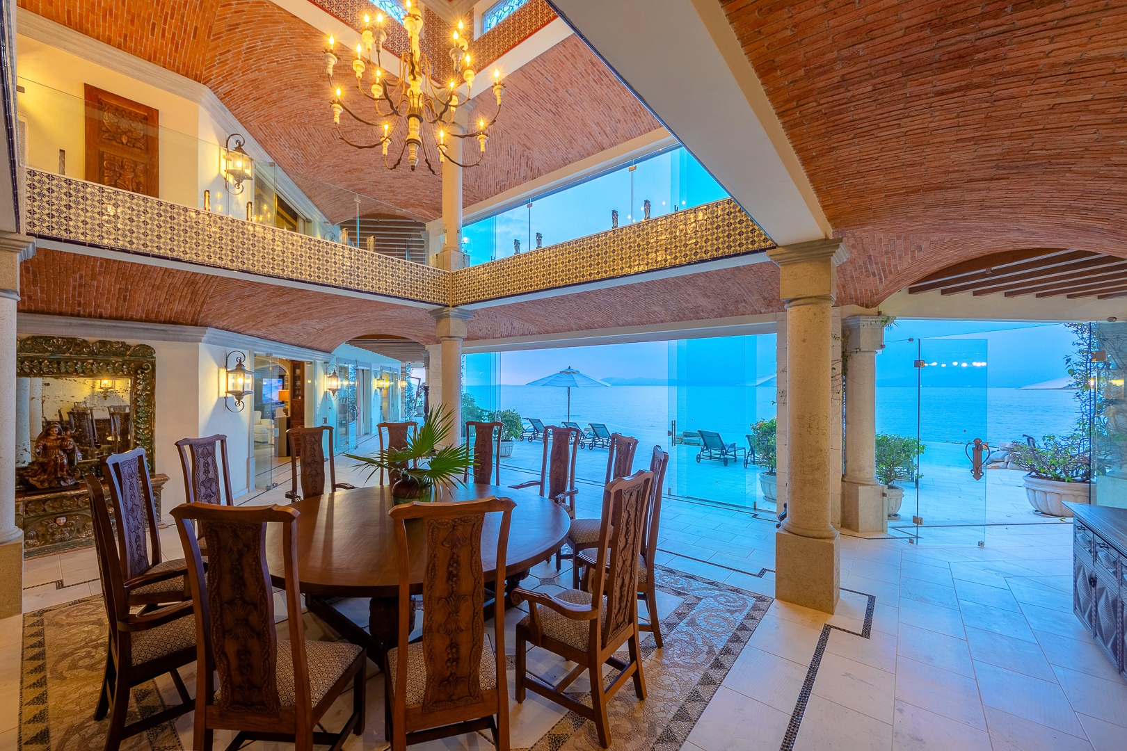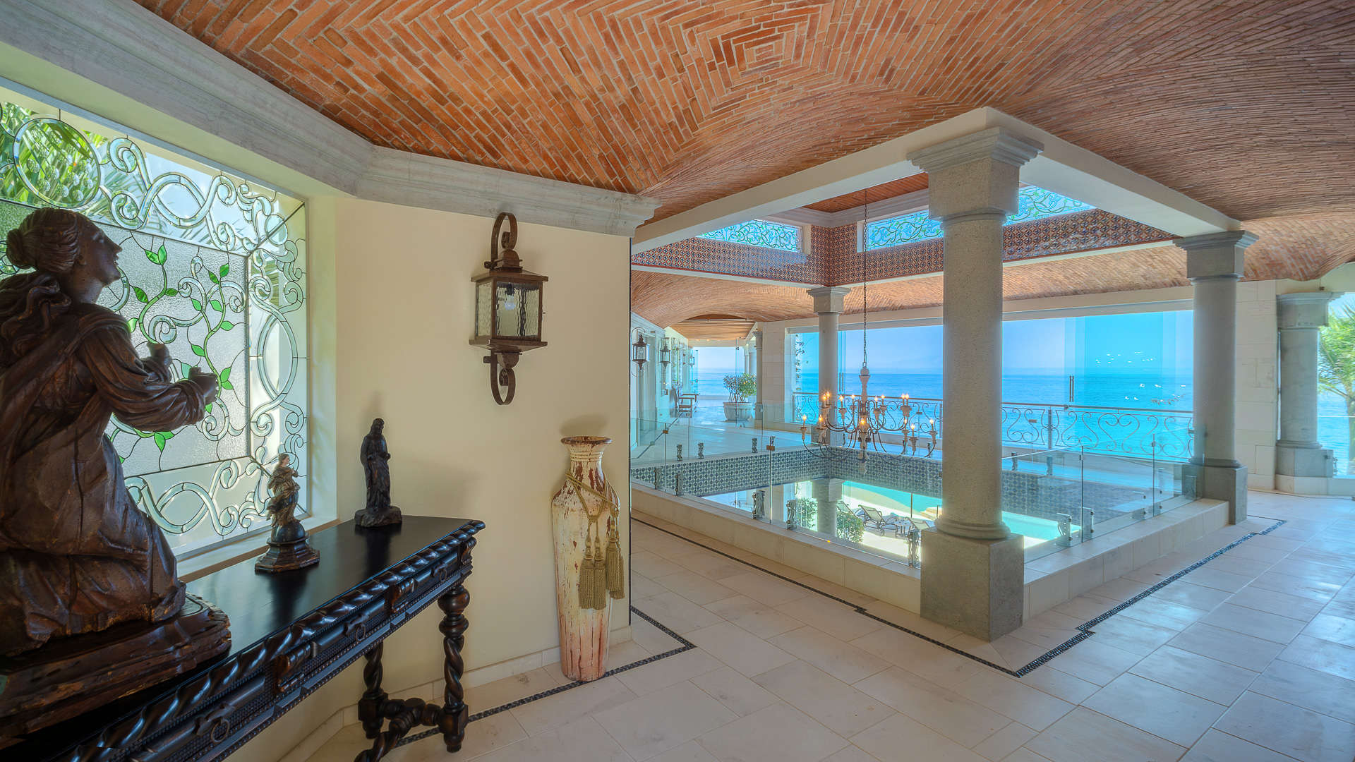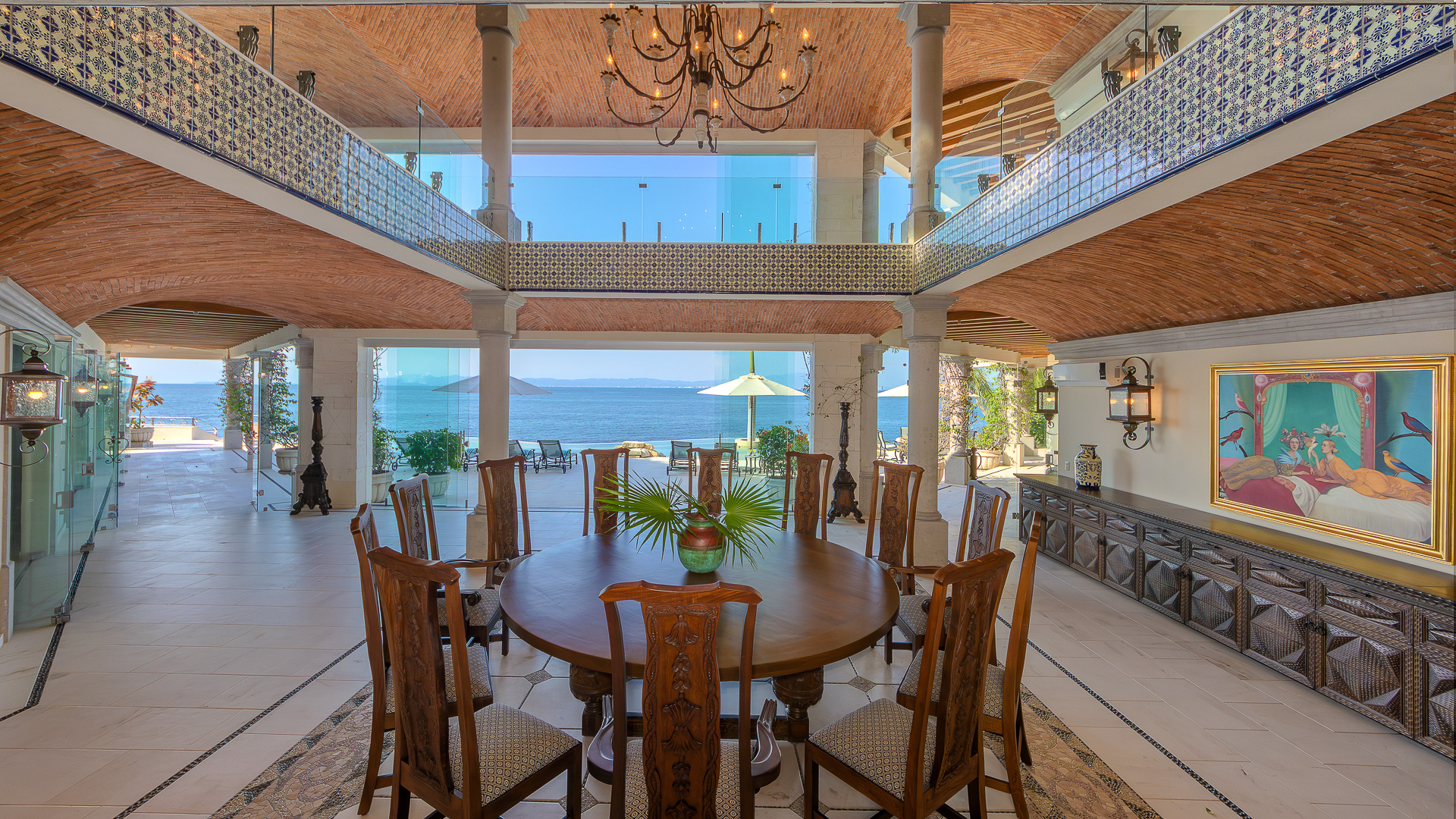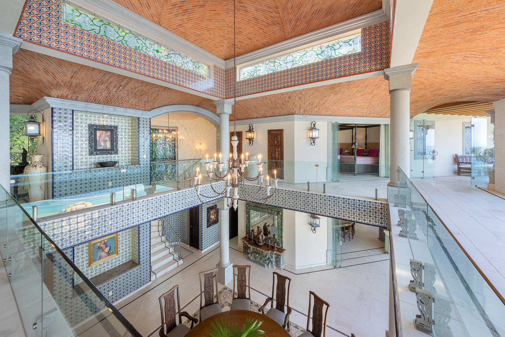The estate is a masterclass in architectural harmony, reinterpreting Mexican hacienda grandeur through a contemporary ultra-luxury lens. Soaring arched openings and retractable glass walls dissolve the boundary between indoors and out, allowing ocean breezes, natural light, and panoramic Pacific views to define the living experience. At the heart of the residence, a dramatic staircase descends beneath a stained-glass cupola into a grand dining salon, flanked by a gourmet chef’s kitchen and an expansive living salon that opens seamlessly to the pool terrace. Interiors are layered with refined furnishings, curated artwork, and thoughtful details that create a sense of effortless sophistication throughout.