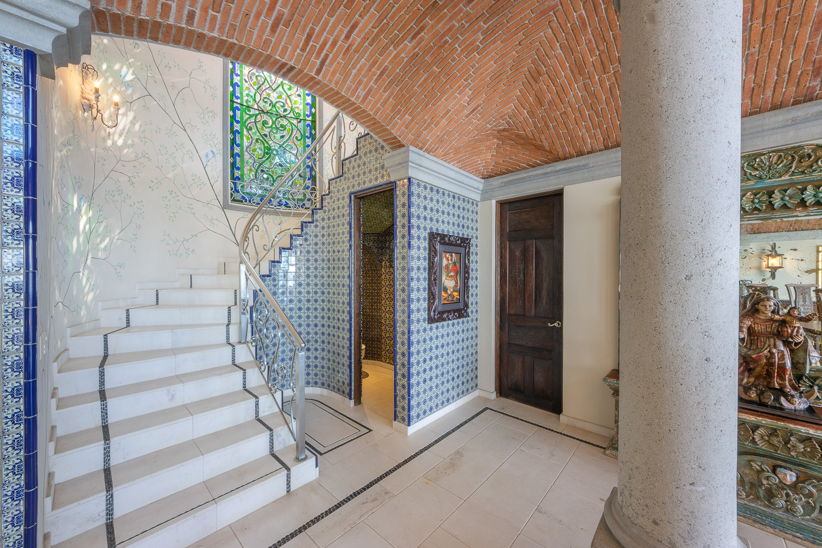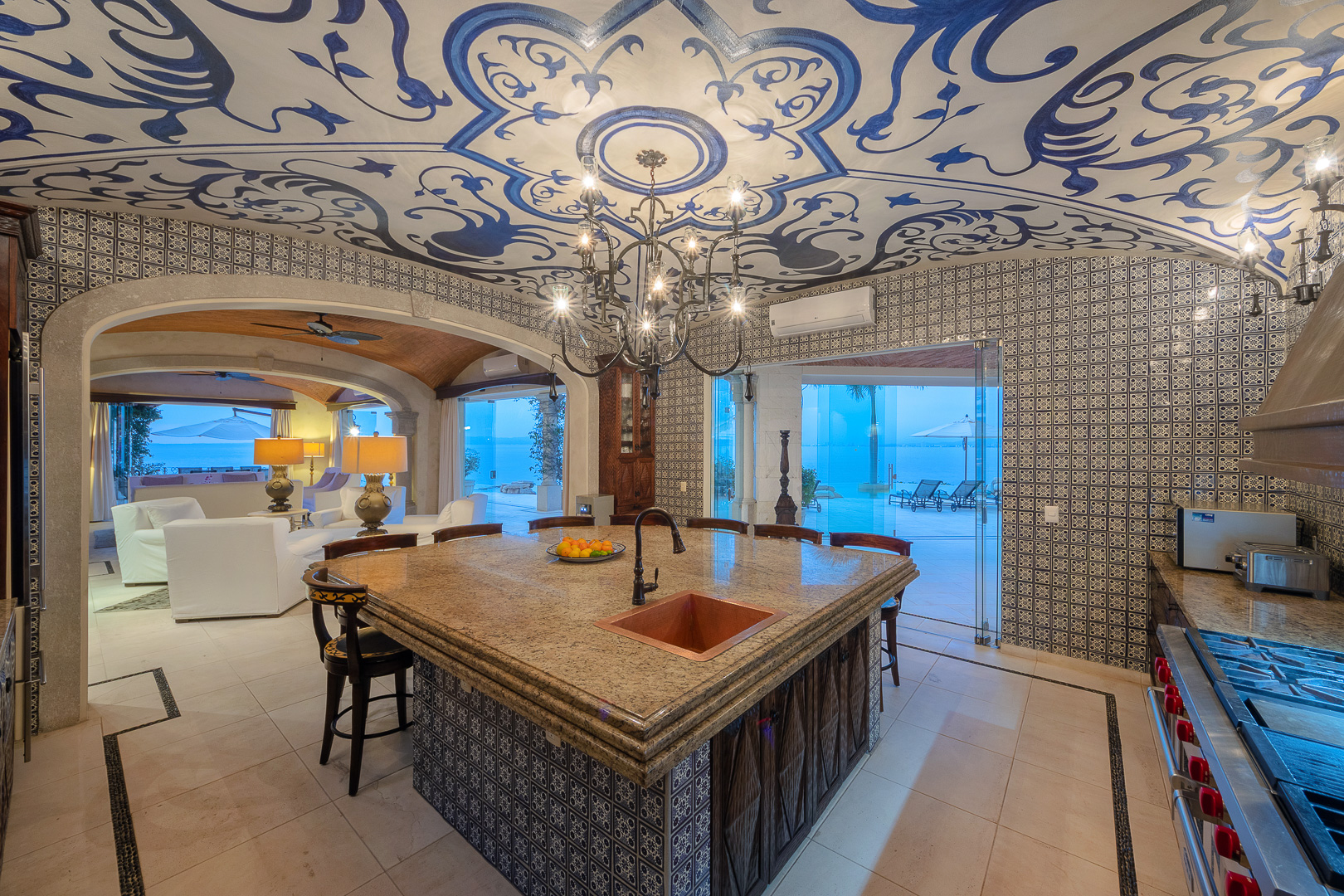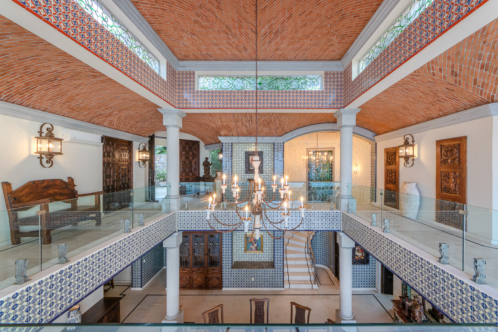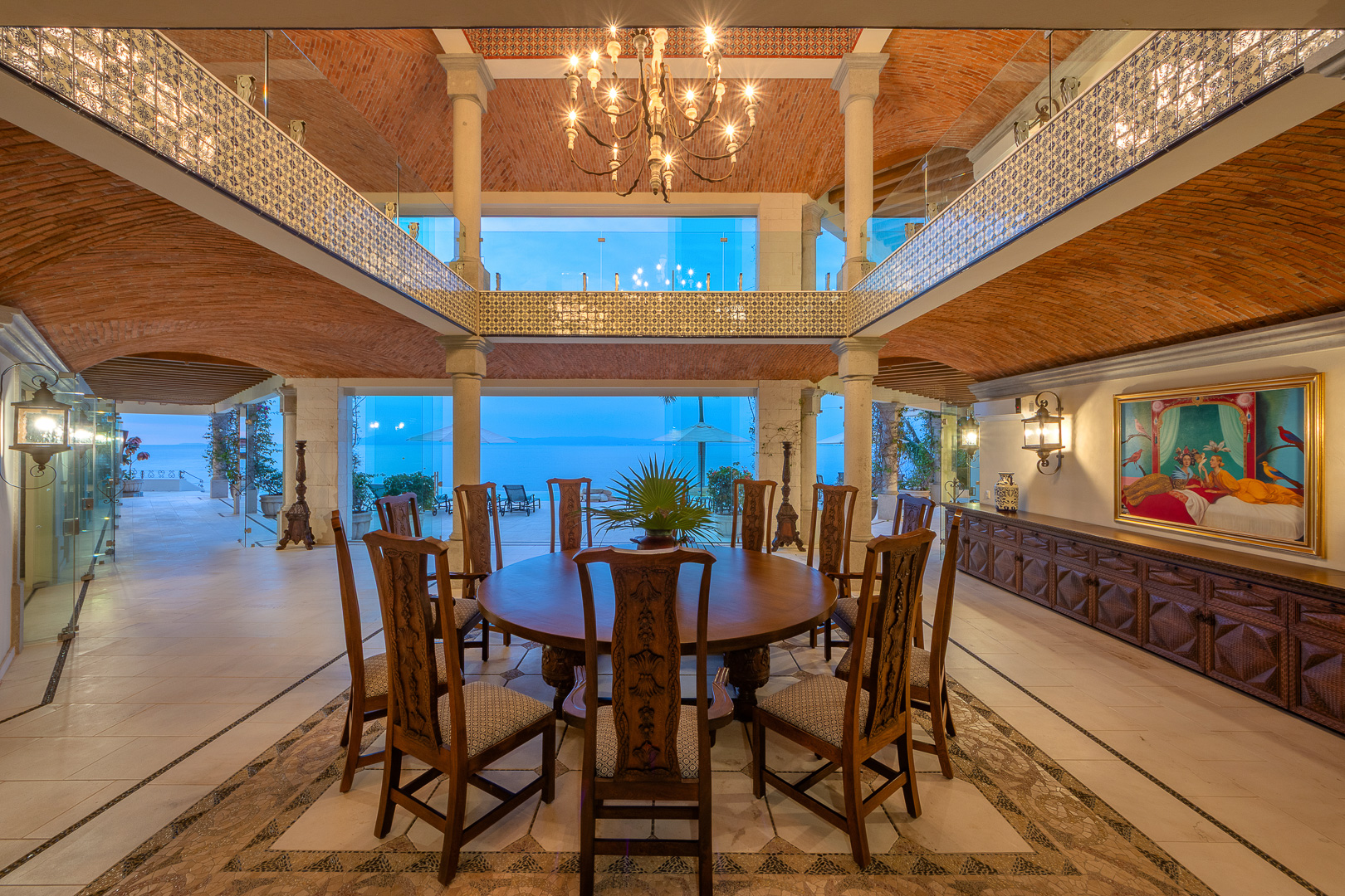 The estate is a masterclass in architectural harmony, reinterpreting Mexican hacienda grandeur through a contemporary ultra-luxury lens. Soaring arched openings and retractable glass walls dissolve the boundary between indoors and out, allowing ocean breezes, natural light, and panoramic Pacific views to define the living experience. At the heart of the residence, a dramatic staircase descends beneath a stained-glass cupola into a grand dining salon, flanked by a gourmet chef’s kitchen and an expansive living salon that opens seamlessly to the pool terrace. Interiors are layered with refined furnishings, curated artwork, and thoughtful details that create a sense of effortless sophistication throughout.