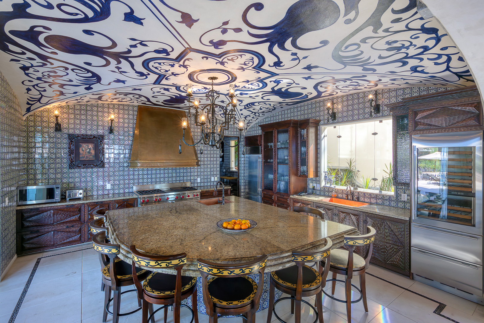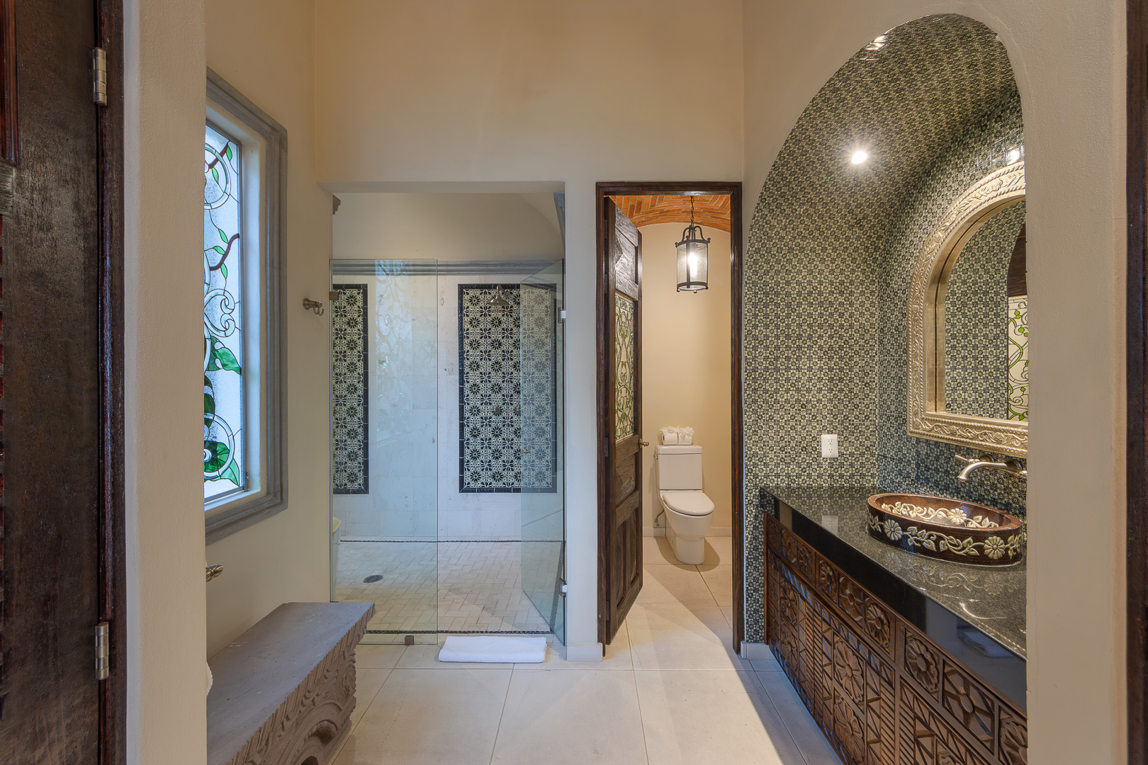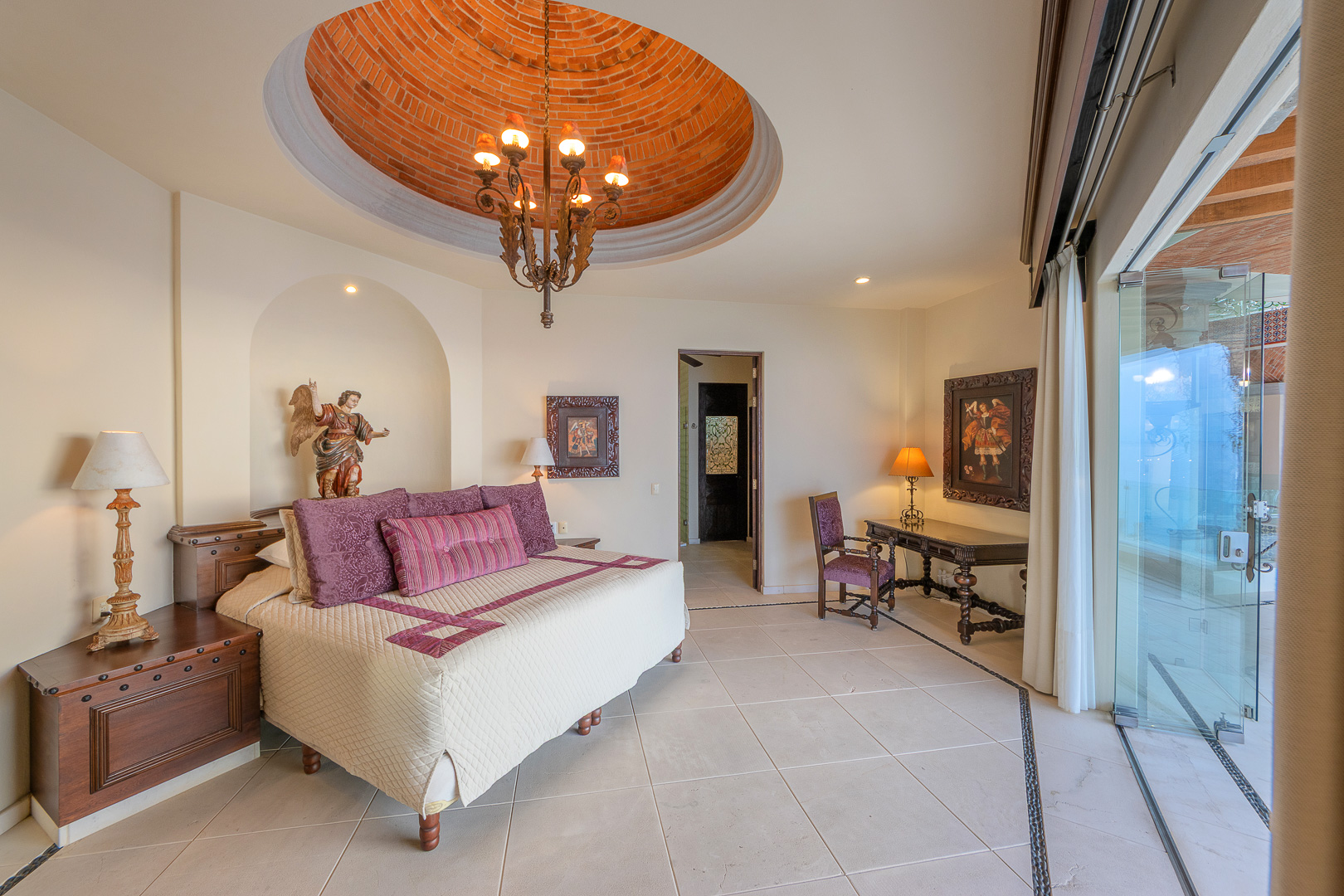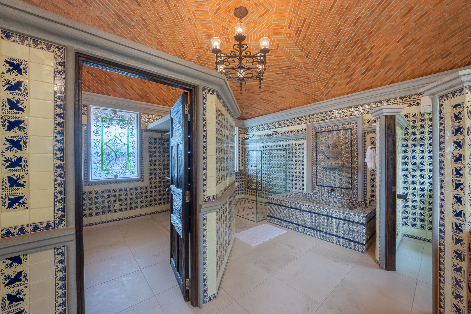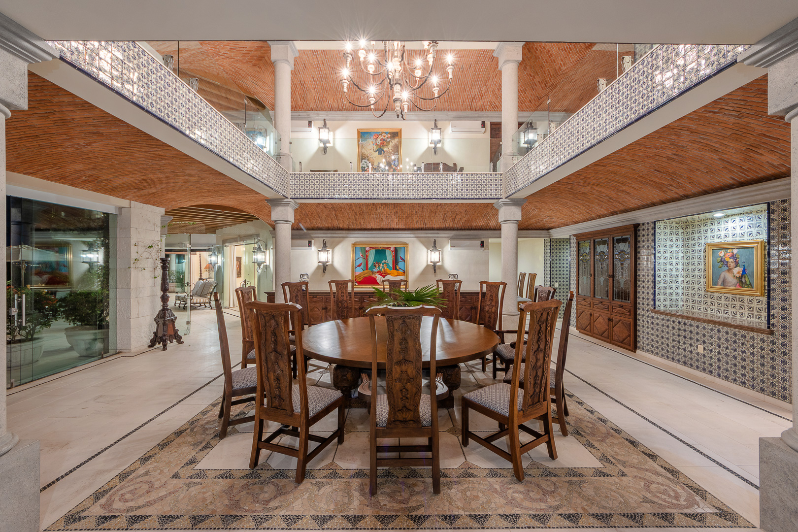 The estate is a masterclass in architectural harmony, reinterpreting Mexican hacienda grandeur through a contemporary ultra-luxury lens. Soaring arched openings and retractable glass walls dissolve the boundary between indoors and out, allowing ocean breezes, natural light, and panoramic Pacific views to define the living experience. At the heart of the residence, a dramatic staircase descends beneath a stained-glass cupola into a grand dining salon, flanked by a gourmet chef’s kitchen and an expansive living salon that opens seamlessly to the pool terrace. Interiors are layered with refined furnishings, curated artwork, and thoughtful details that create a sense of effortless sophistication throughout.