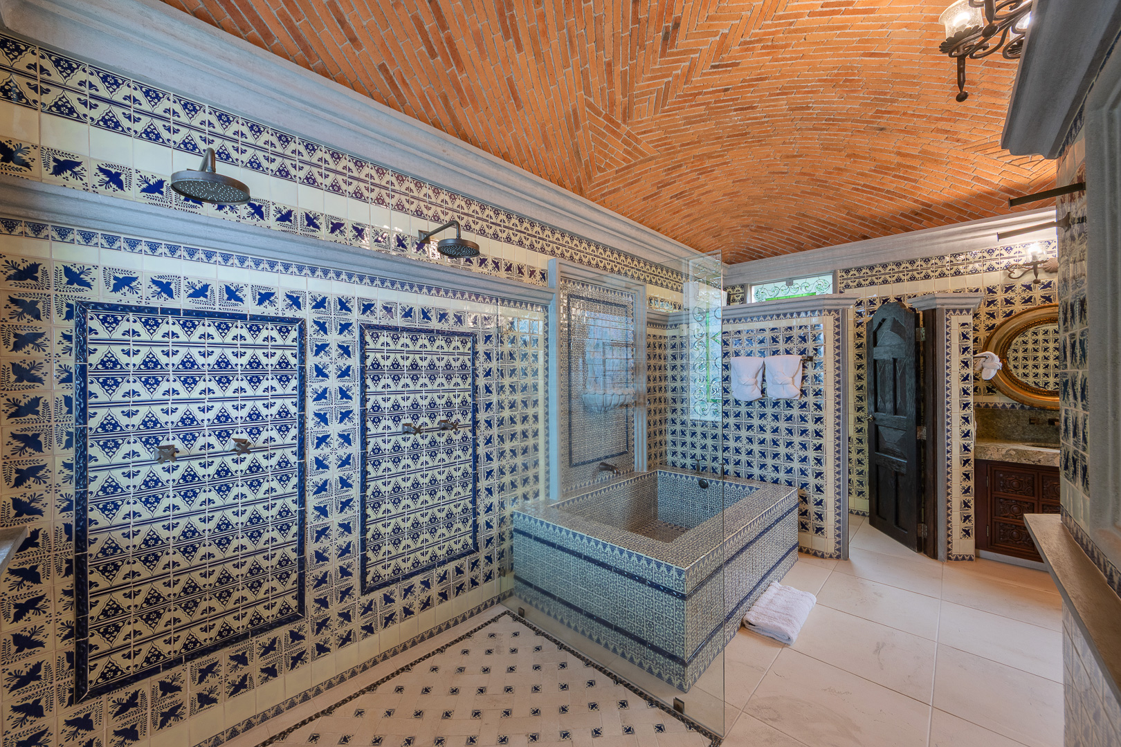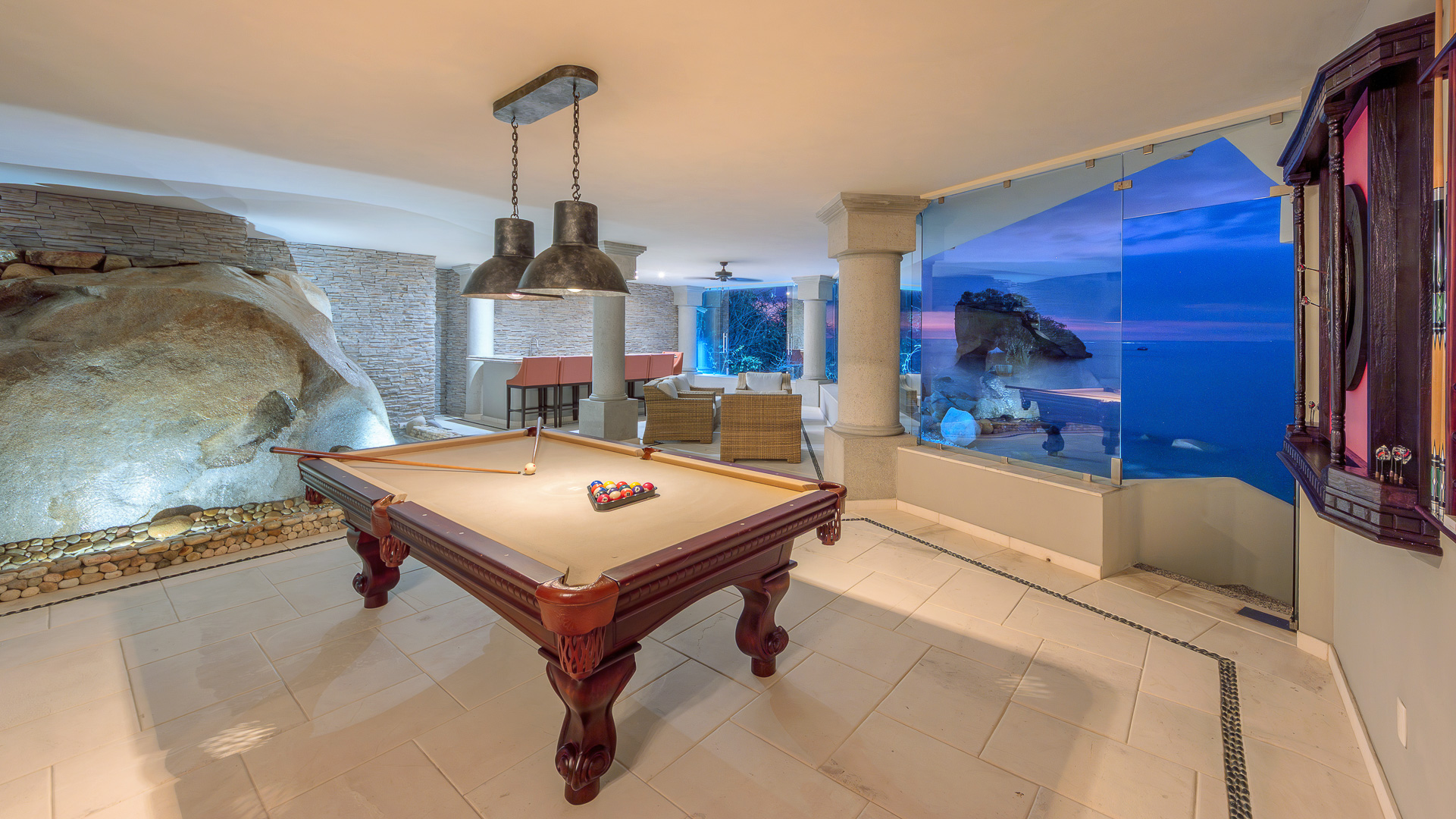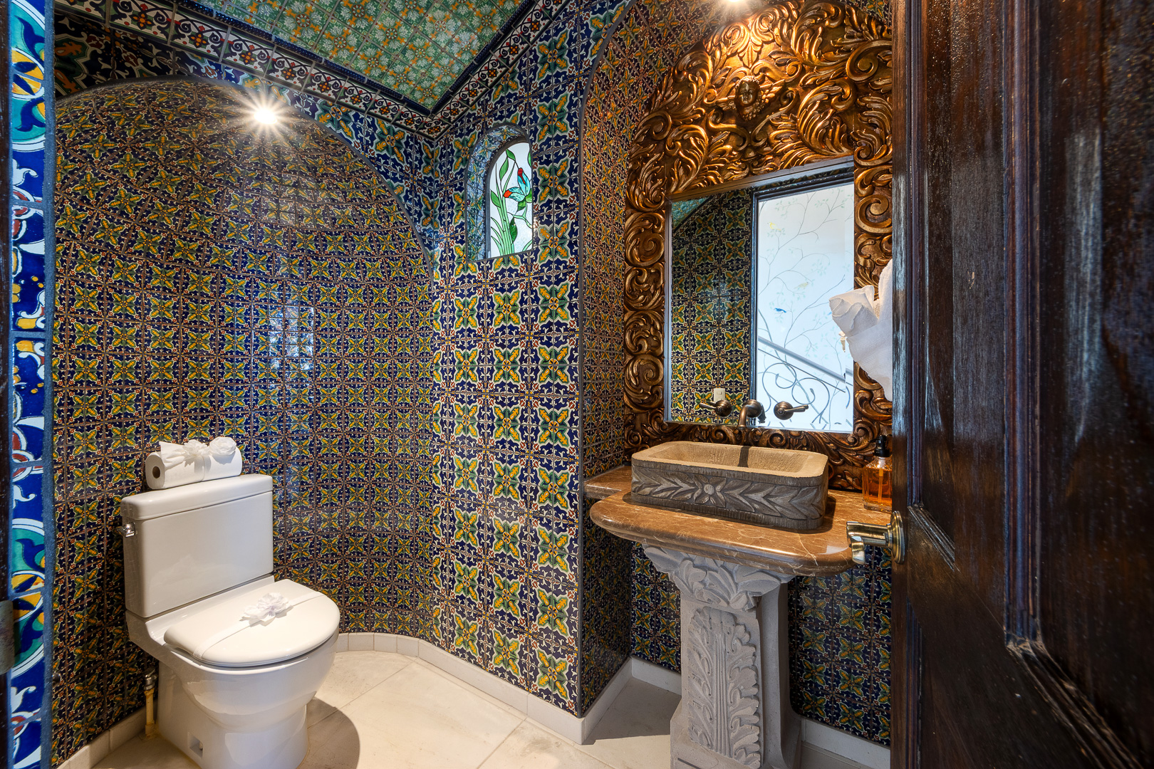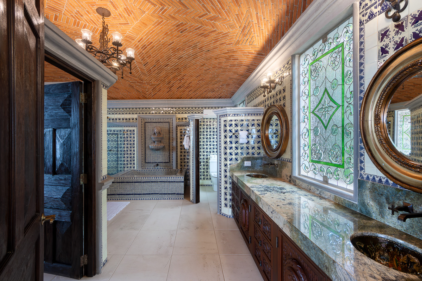 The estate is a masterclass in architectural harmony, reinterpreting Mexican hacienda grandeur through a contemporary ultra-luxury lens. Soaring arched openings and retractable glass walls dissolve the boundary between indoors and out, allowing ocean breezes, natural light, and panoramic Pacific views to define the living experience. At the heart of the residence, a dramatic staircase descends beneath a stained-glass cupola into a grand dining salon, flanked by a gourmet chef’s kitchen and an expansive living salon that opens seamlessly to the pool terrace. Interiors are layered with refined furnishings, curated artwork, and thoughtful details that create a sense of effortless sophistication throughout.