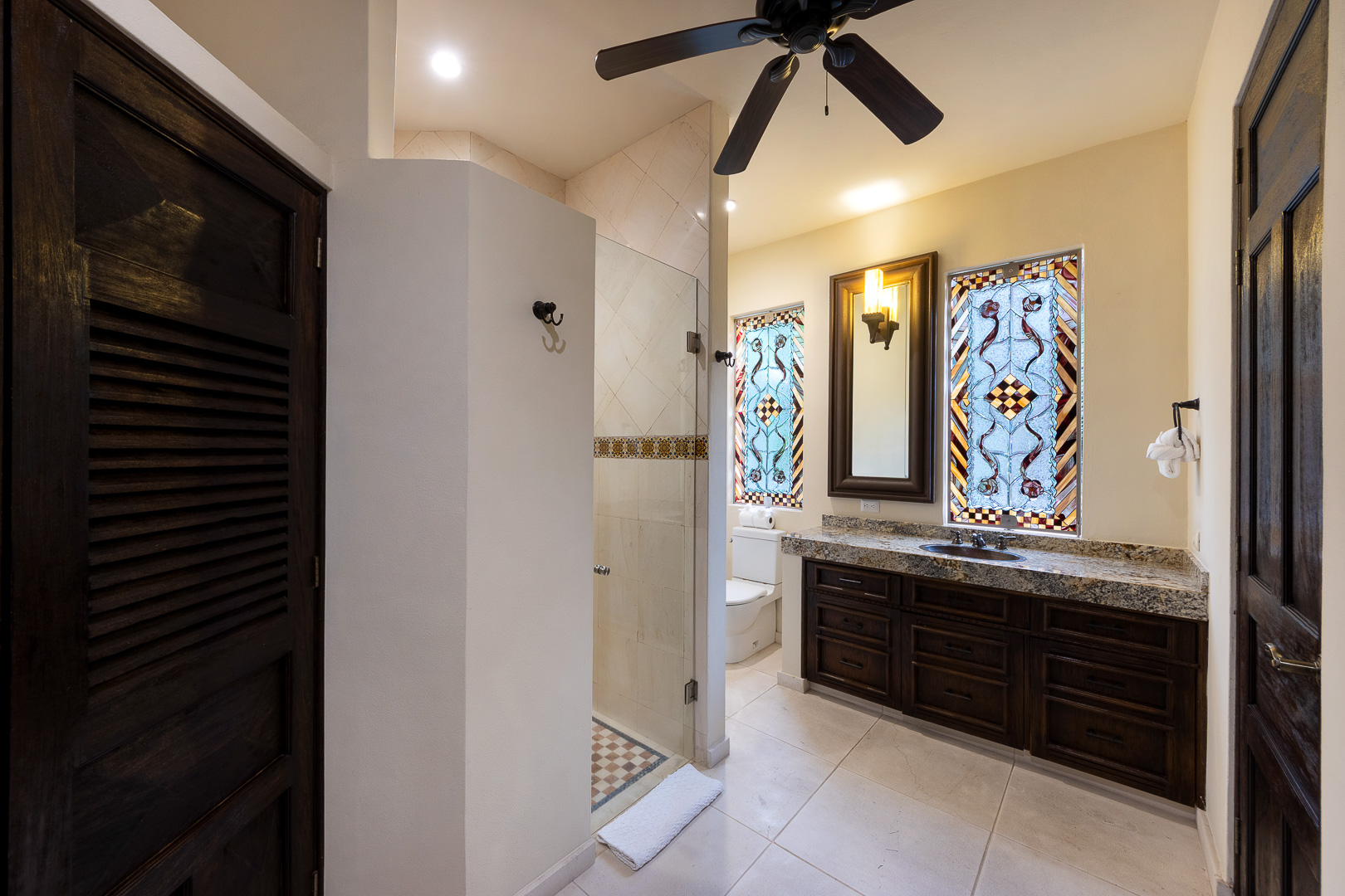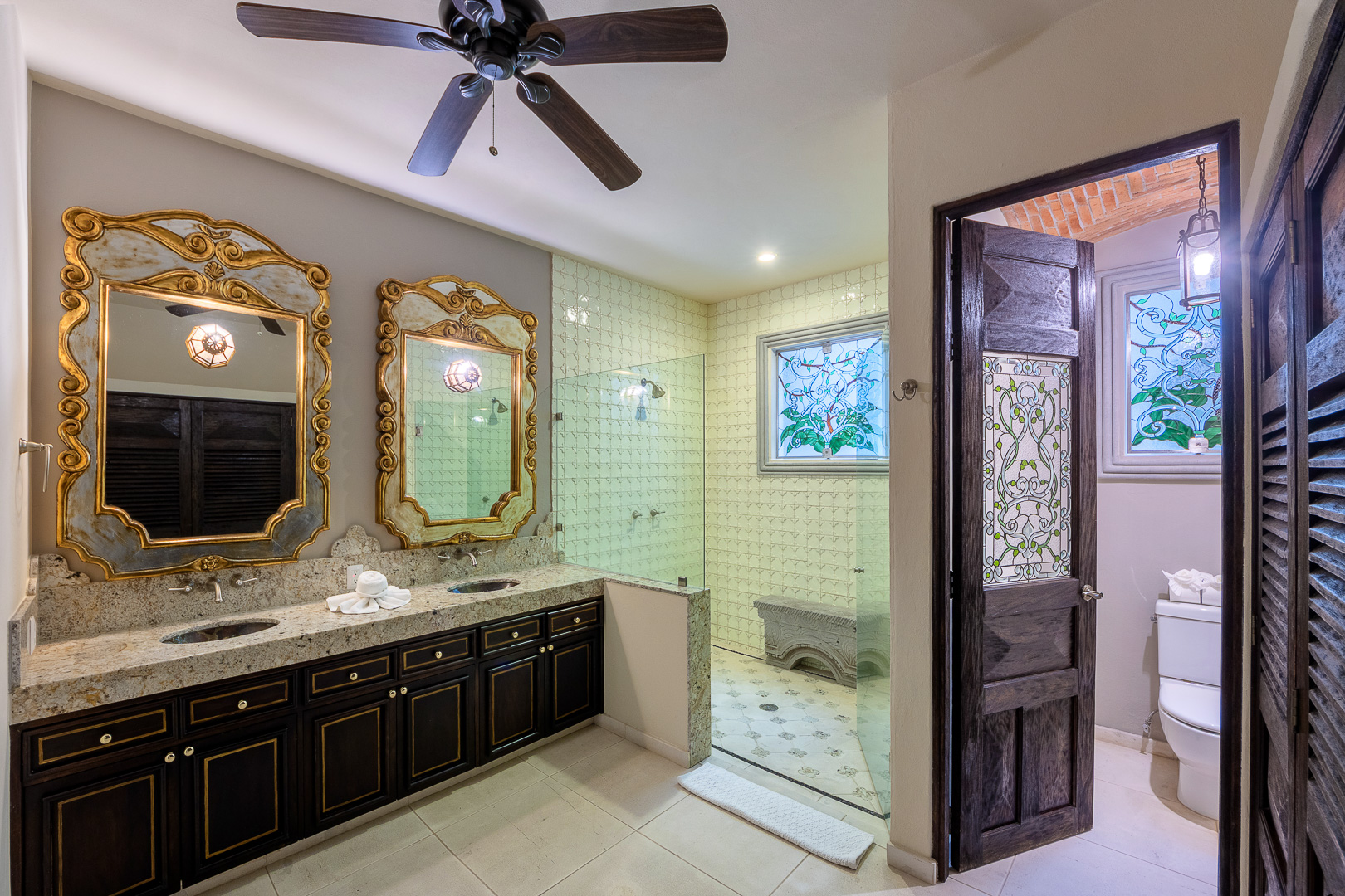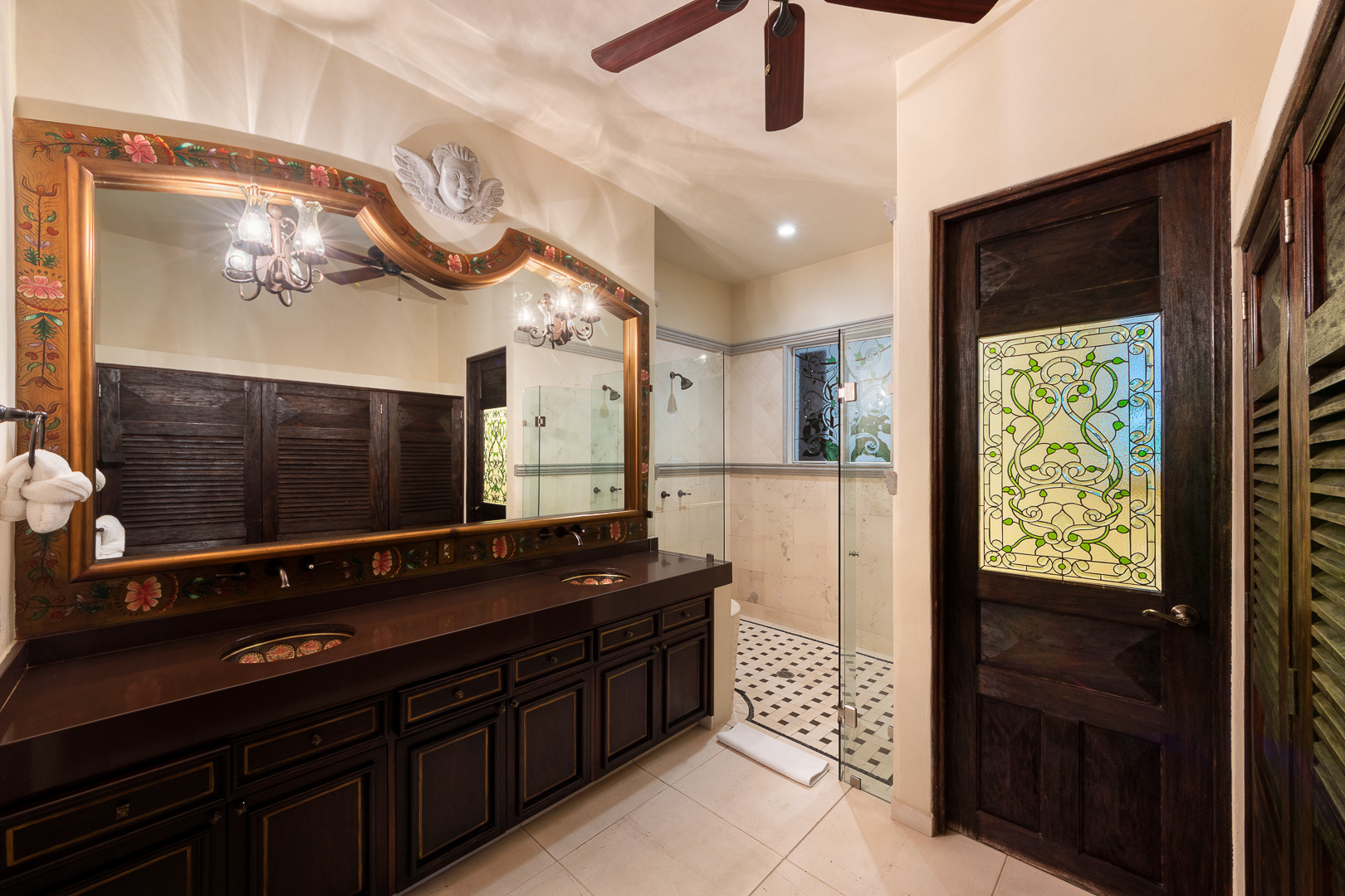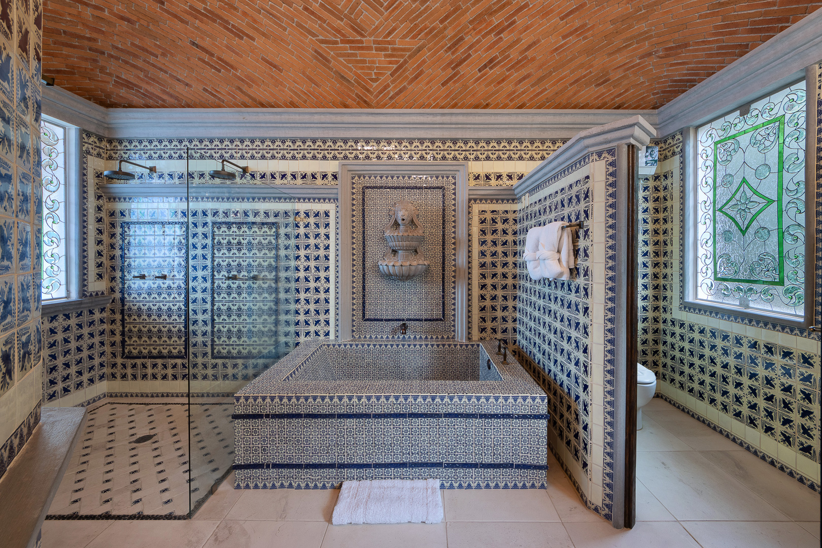 The estate is a masterclass in architectural harmony, reinterpreting Mexican hacienda grandeur through a contemporary ultra-luxury lens. Soaring arched openings and retractable glass walls dissolve the boundary between indoors and out, allowing ocean breezes, natural light, and panoramic Pacific views to define the living experience. At the heart of the residence, a dramatic staircase descends beneath a stained-glass cupola into a grand dining salon, flanked by a gourmet chef’s kitchen and an expansive living salon that opens seamlessly to the pool terrace. Interiors are layered with refined furnishings, curated artwork, and thoughtful details that create a sense of effortless sophistication throughout.