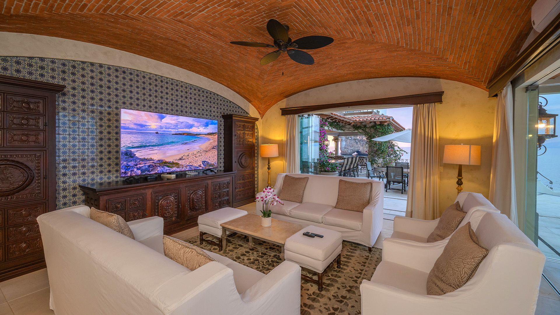 Outdoor living is the true heart of Casa Michael. A breathtaking oceanfront infinity pool stretches toward the horizon, framed by twin spa pools and centered around a living palm, becoming a tranquil sanctuary suspended above the Pacific. Expansive terraces offer multiple settings for entertaining — from alfresco dining and poolside lounging beside the wet bar to outdoor kitchen grilling and sunset gatherings where the sky ignites over Los Arcos. A discreet, highly trained team, including a dedicated private chef and attentive service staff, anticipates every detail with intuitive care, crafting bespoke menus inspired by coastal Mexican and international cuisine tailored entirely to guest preferences.