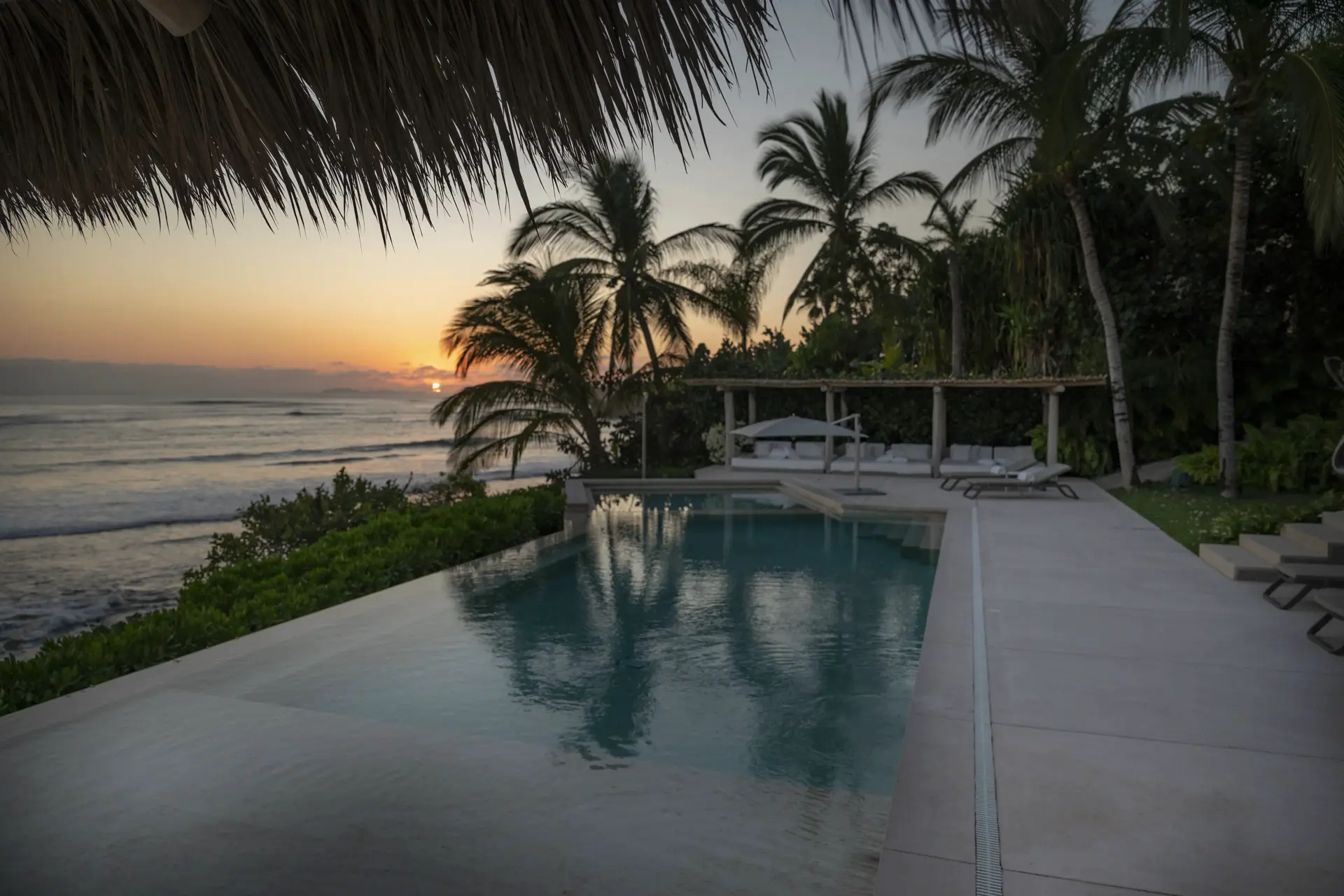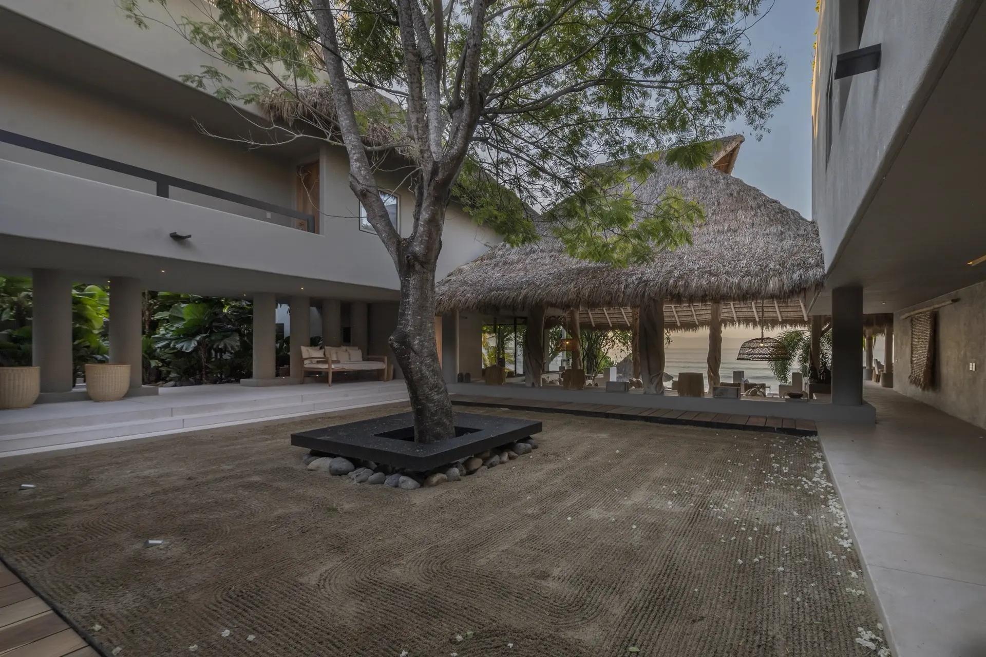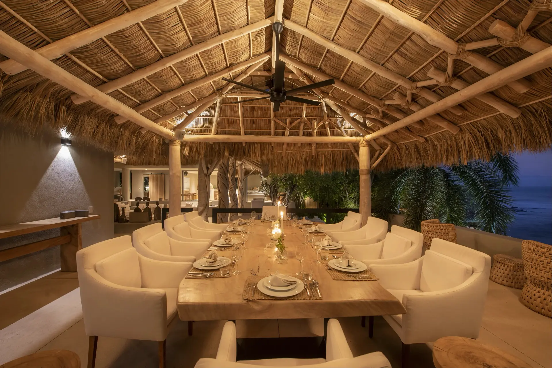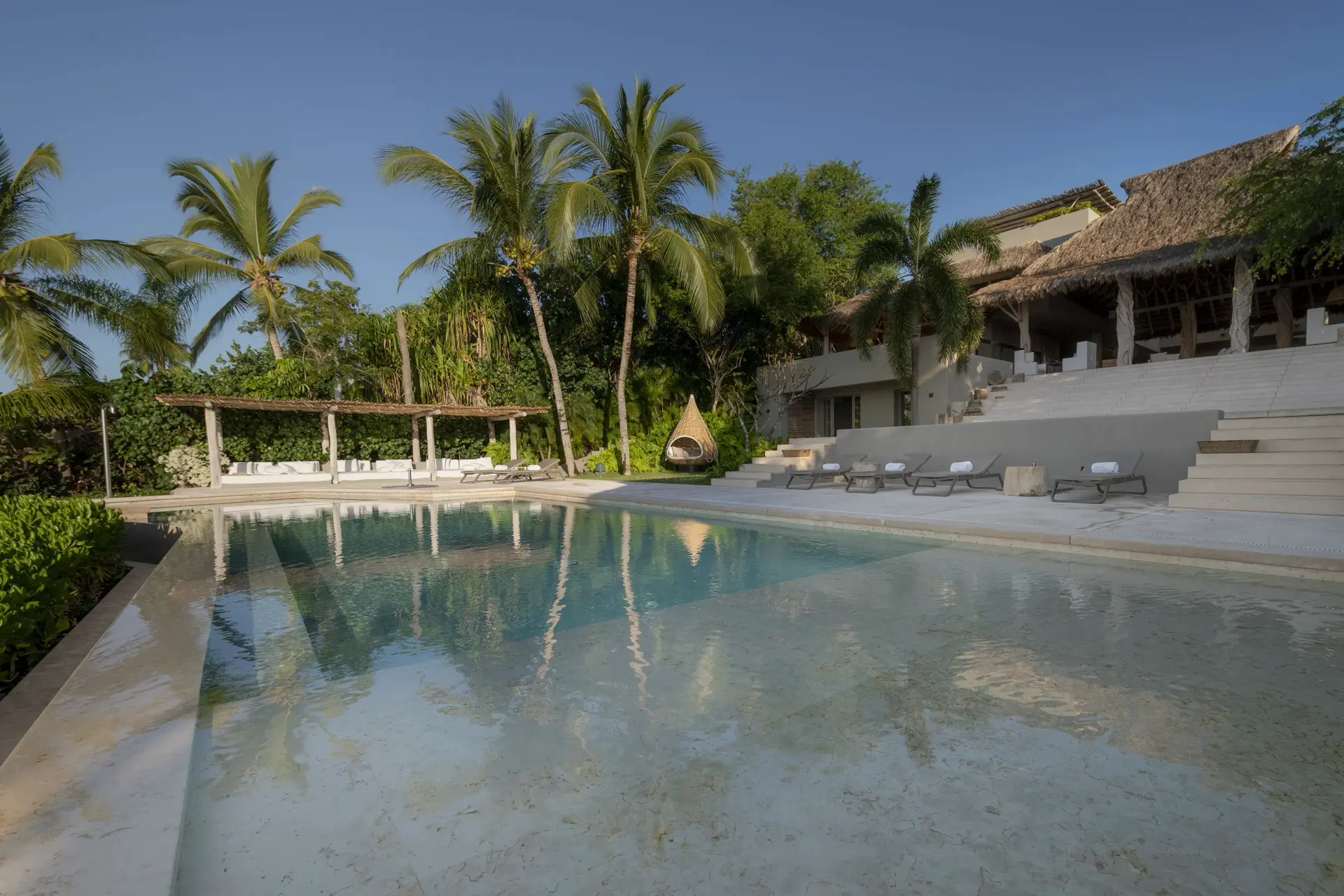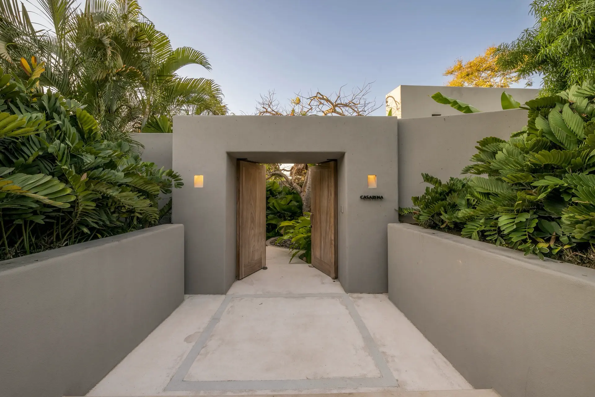 Arrival at Casarena feels like entering a private resort. Beyond elegant gates, swaying palms and polished sand paths lead the way to a world defined by quiet sophistication. The architecture draws inspiration from traditional palapa-style design, using organic materials that allow the villa to blend seamlessly into its tropical surroundings. Open-air spaces frame the ocean and sky, while the overall aesthetic is relaxed yet elevated—perfect for guests who appreciate design that feels both natural and intentional.