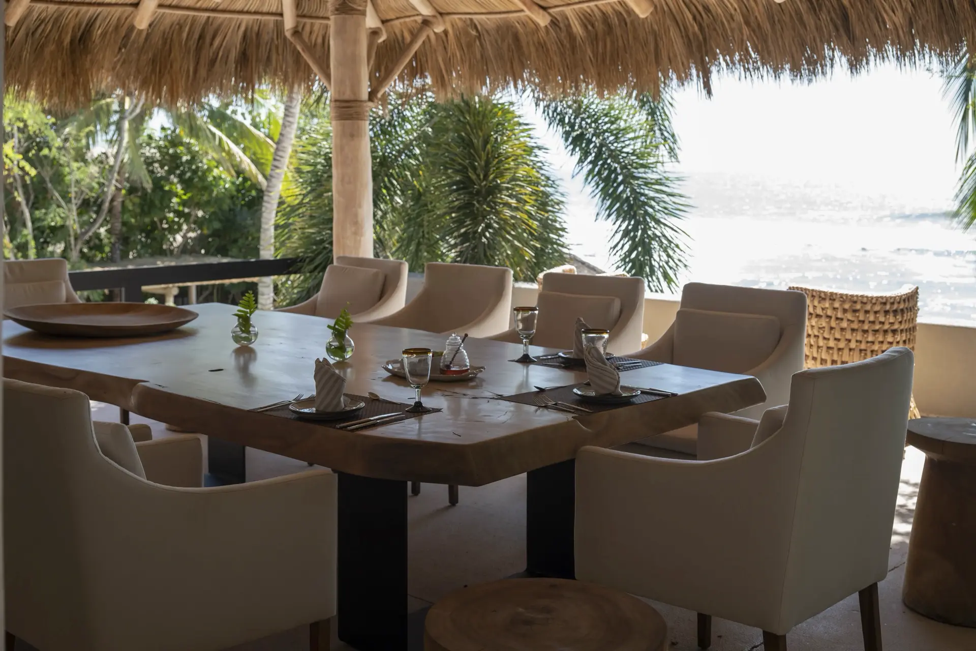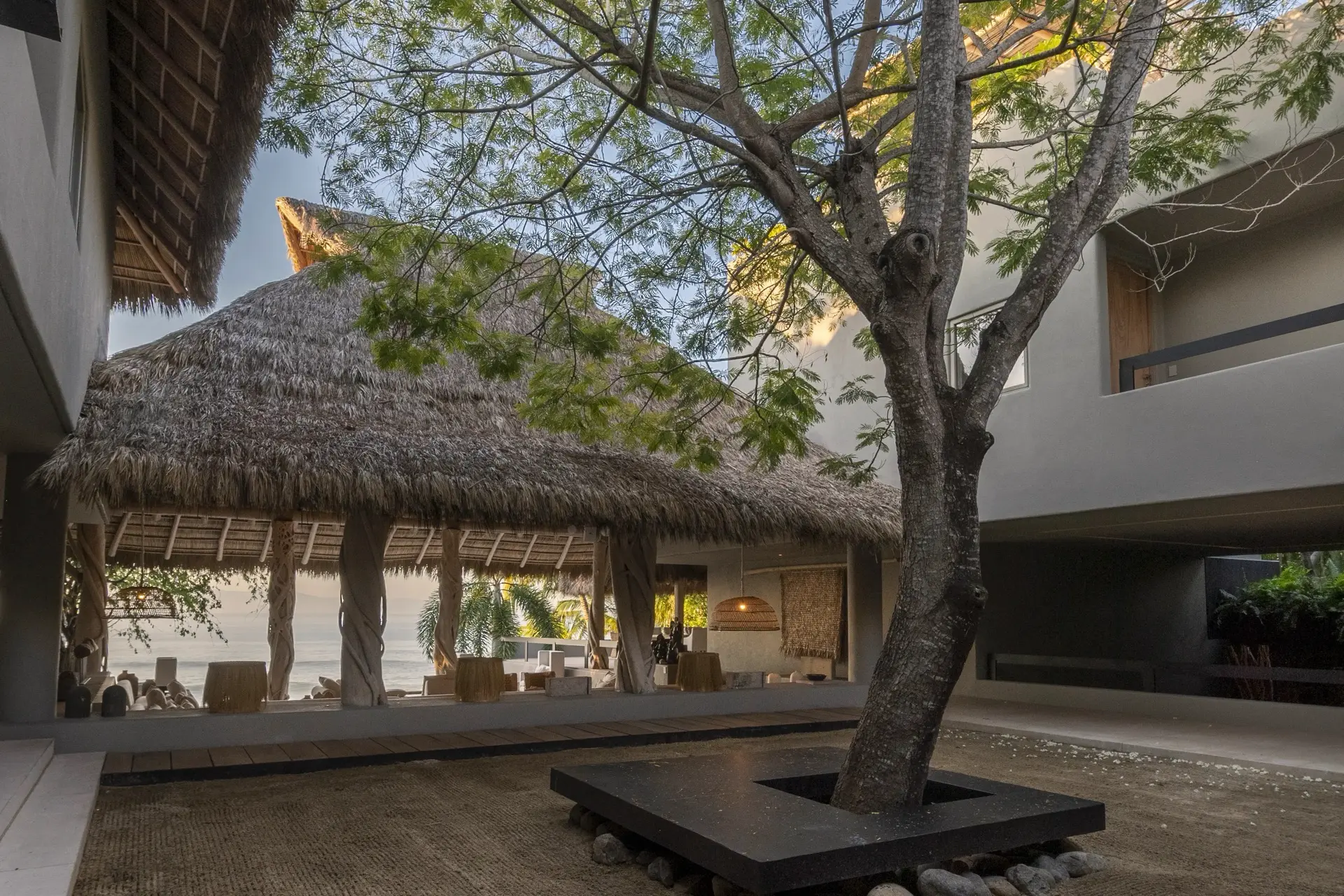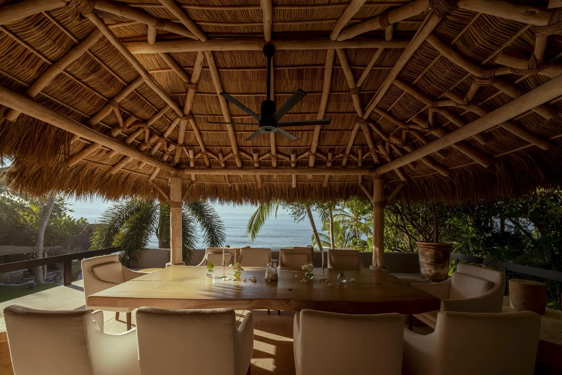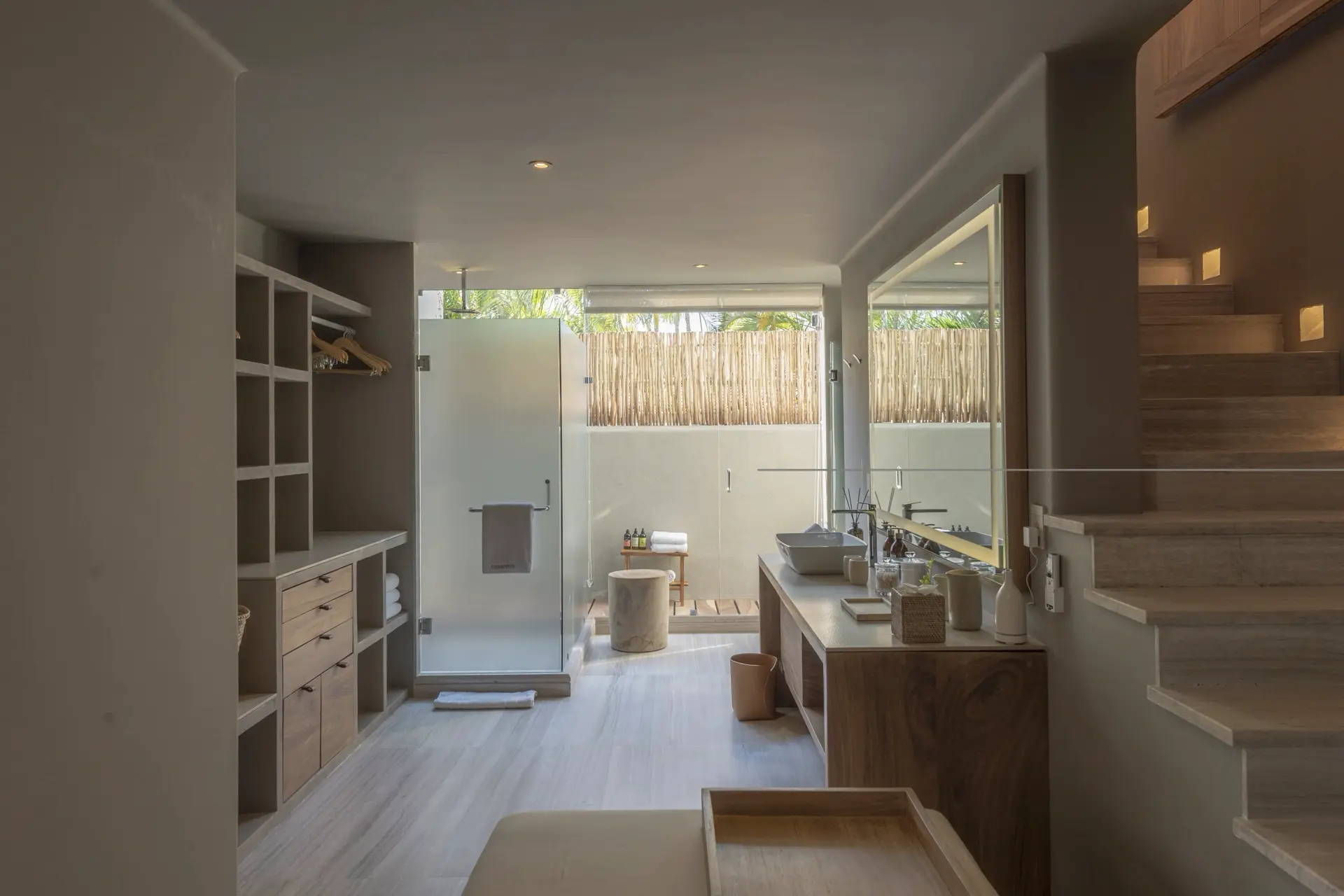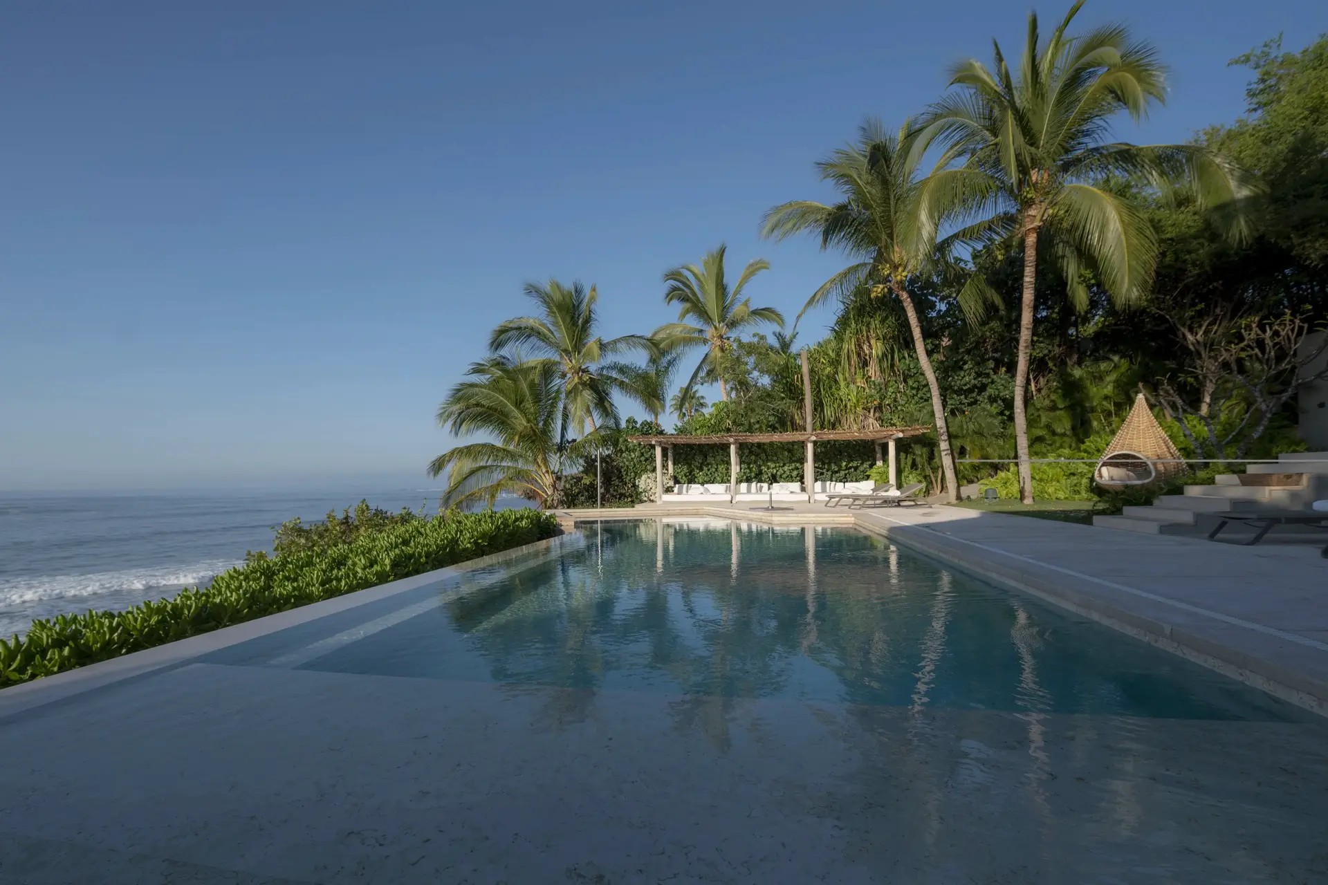 Arrival at Casarena feels like entering a private resort. Beyond elegant gates, swaying palms and polished sand paths lead the way to a world defined by quiet sophistication. The architecture draws inspiration from traditional palapa-style design, using organic materials that allow the villa to blend seamlessly into its tropical surroundings. Open-air spaces frame the ocean and sky, while the overall aesthetic is relaxed yet elevated—perfect for guests who appreciate design that feels both natural and intentional.