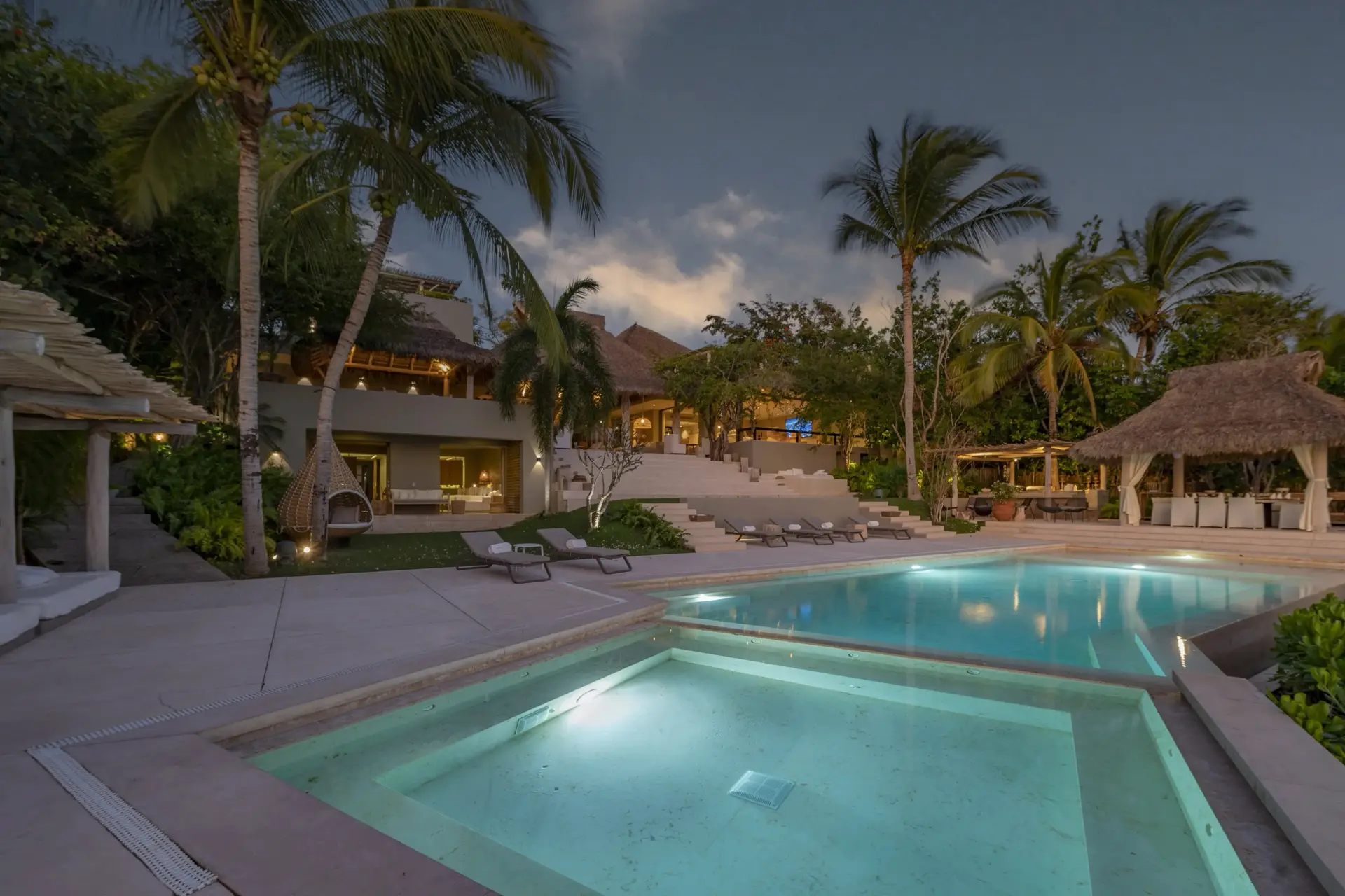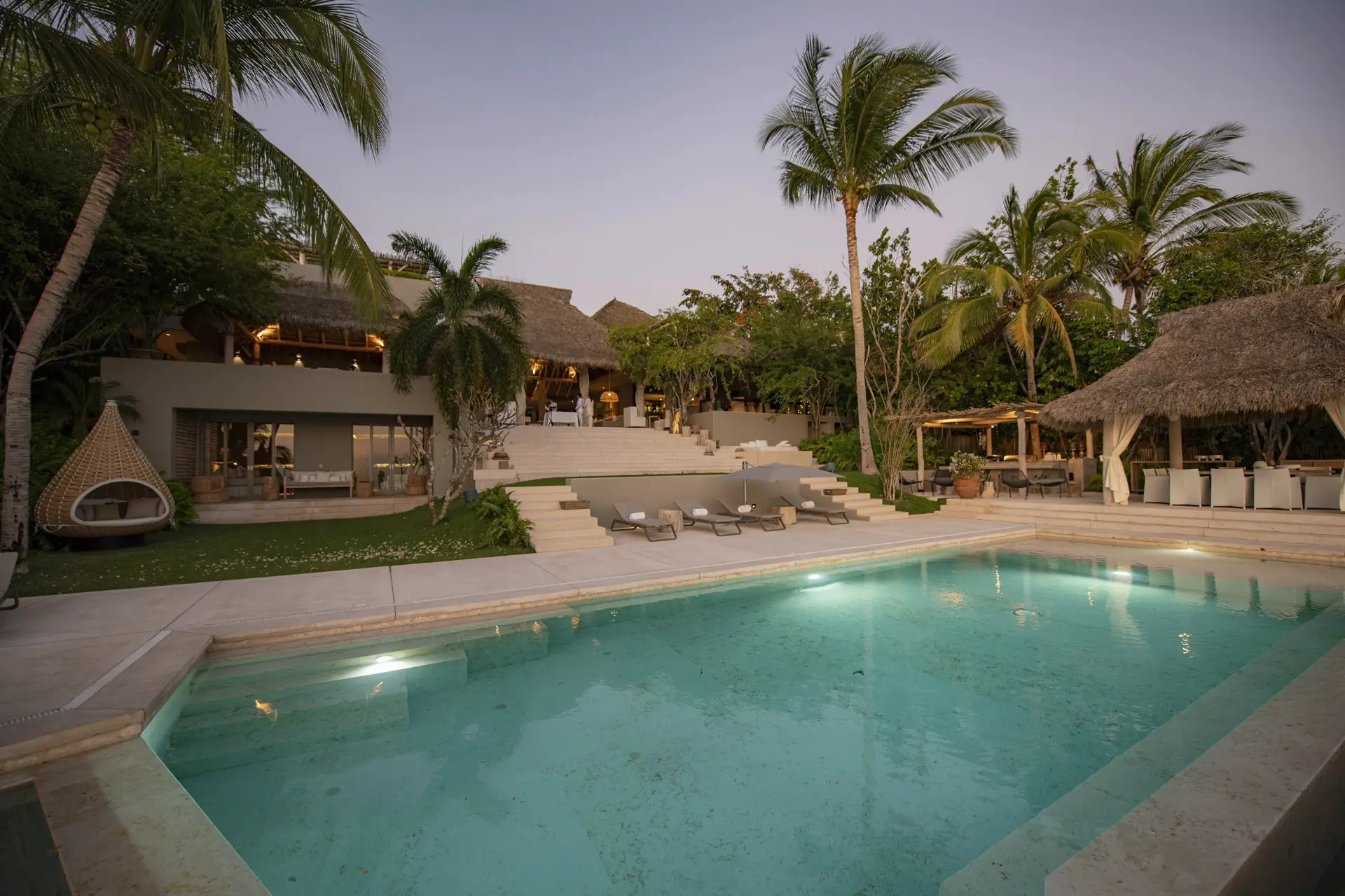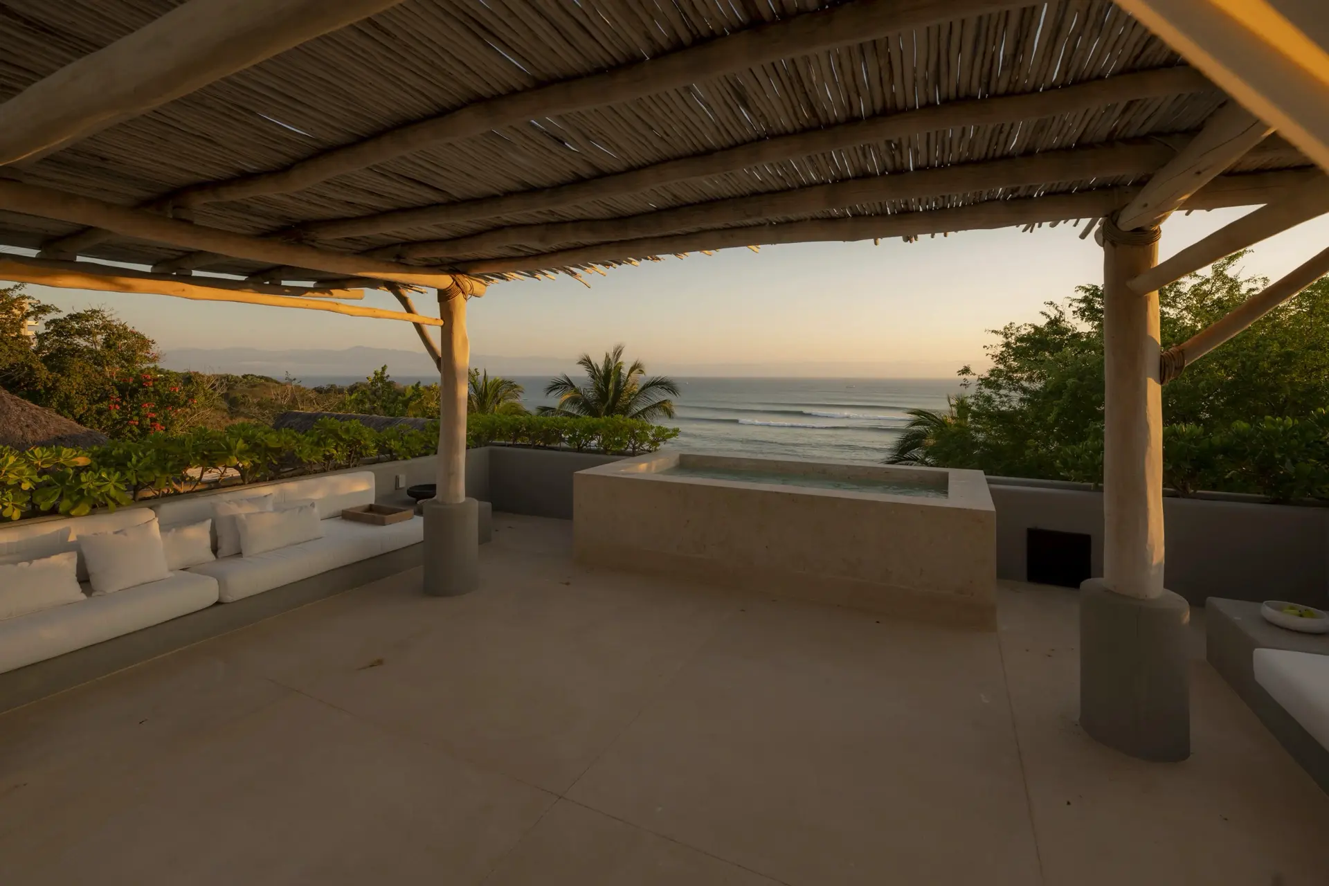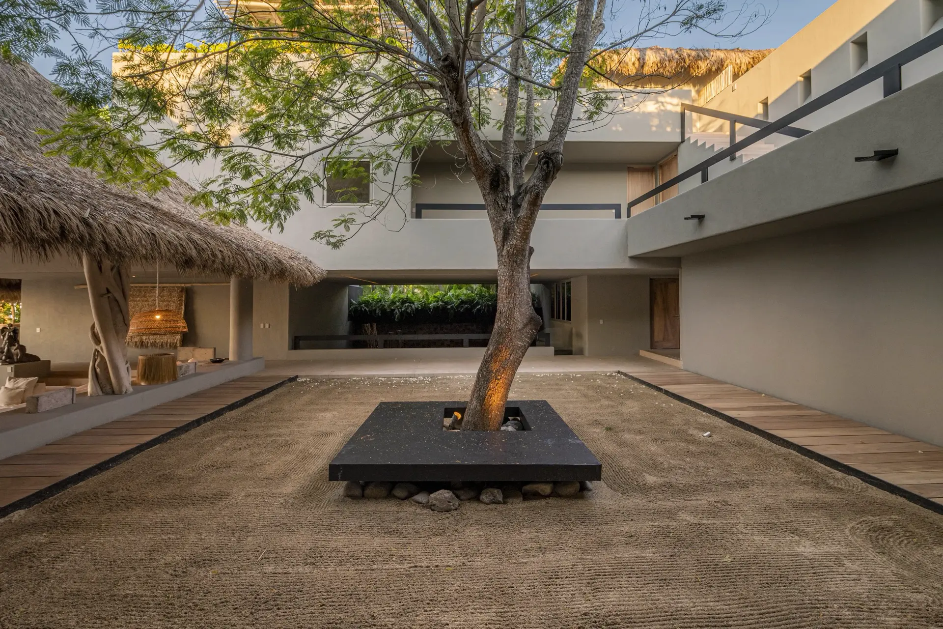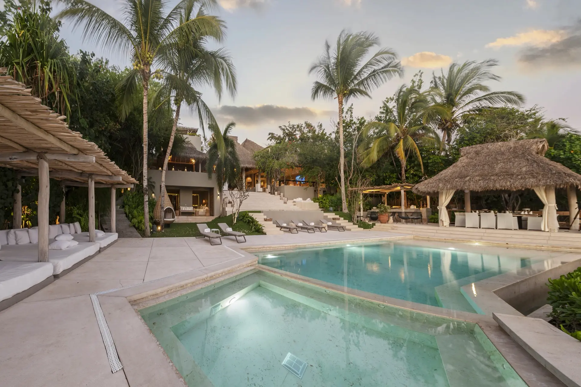 Arrival at Casarena feels like entering a private resort. Beyond elegant gates, swaying palms and polished sand paths lead the way to a world defined by quiet sophistication. The architecture draws inspiration from traditional palapa-style design, using organic materials that allow the villa to blend seamlessly into its tropical surroundings. Open-air spaces frame the ocean and sky, while the overall aesthetic is relaxed yet elevated—perfect for guests who appreciate design that feels both natural and intentional.