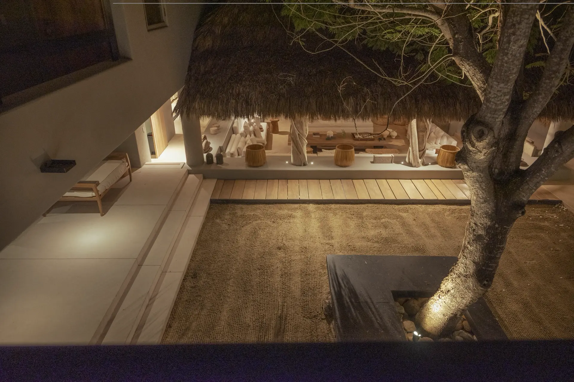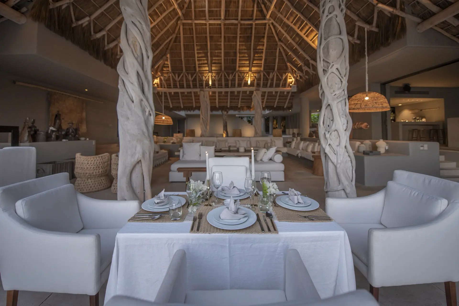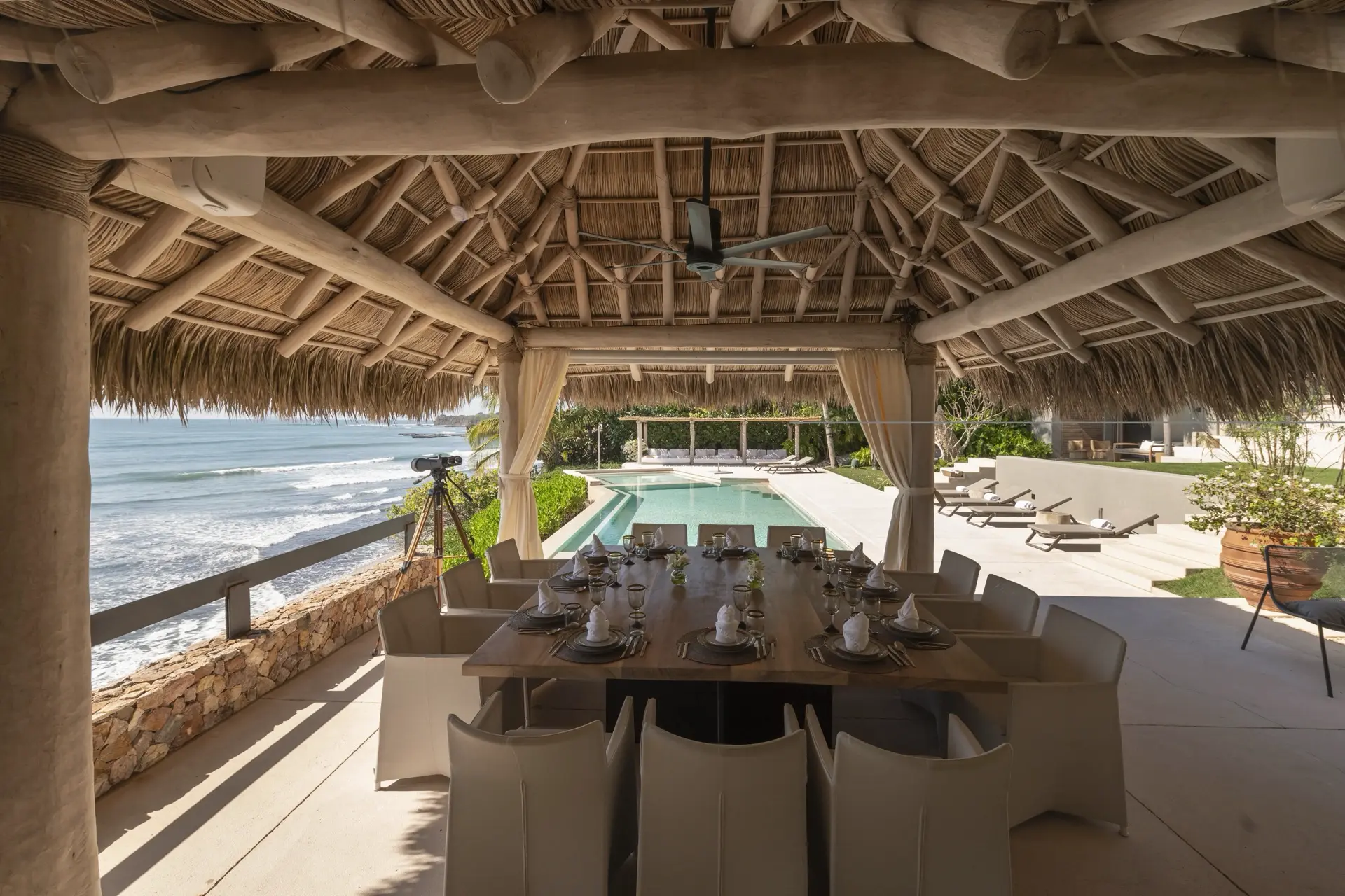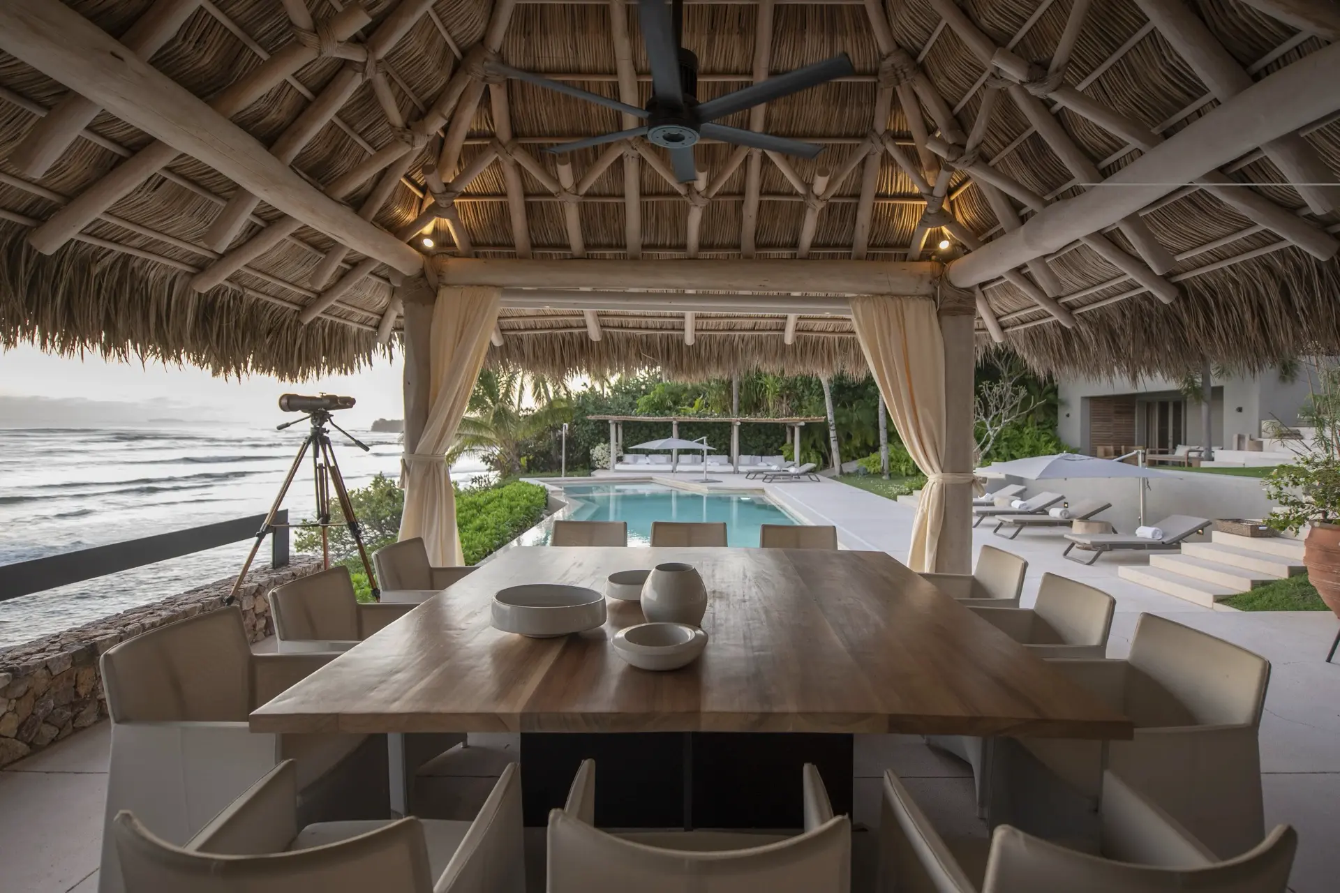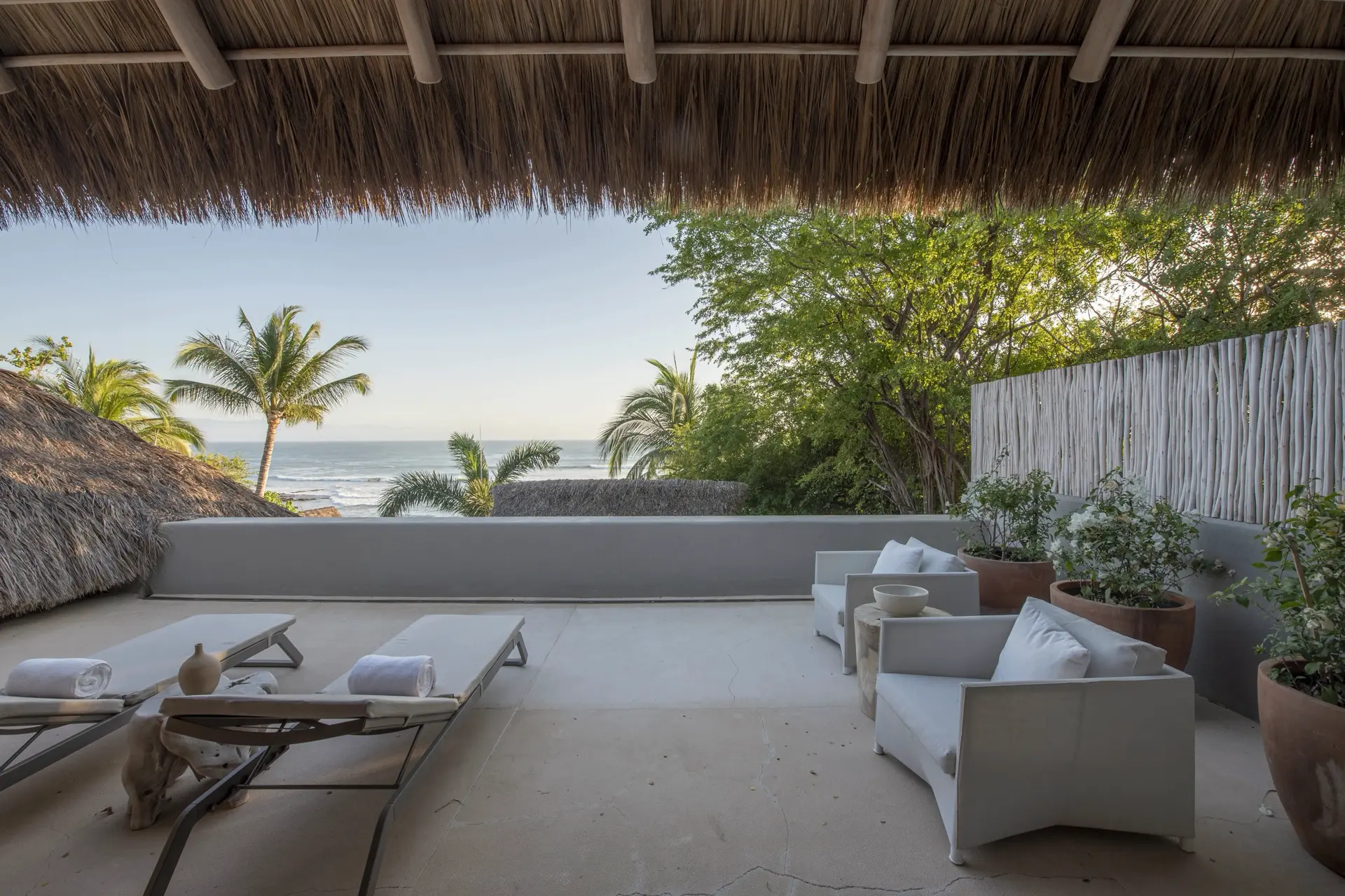 Arrival at Casarena feels like entering a private resort. Beyond elegant gates, swaying palms and polished sand paths lead the way to a world defined by quiet sophistication. The architecture draws inspiration from traditional palapa-style design, using organic materials that allow the villa to blend seamlessly into its tropical surroundings. Open-air spaces frame the ocean and sky, while the overall aesthetic is relaxed yet elevated—perfect for guests who appreciate design that feels both natural and intentional.