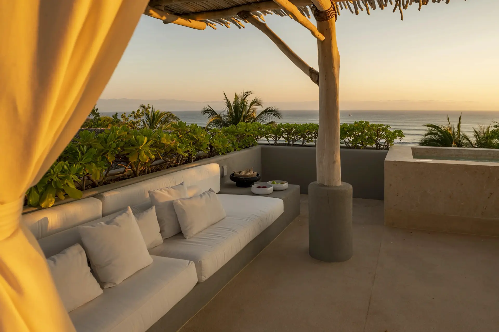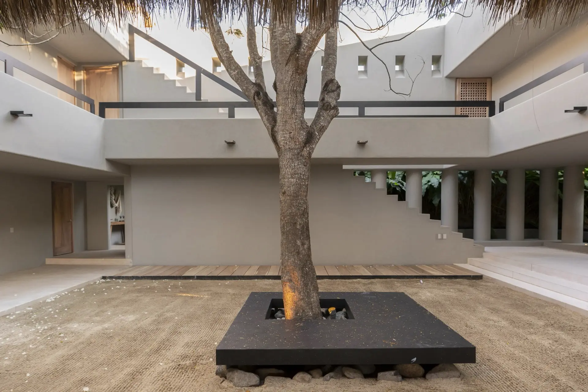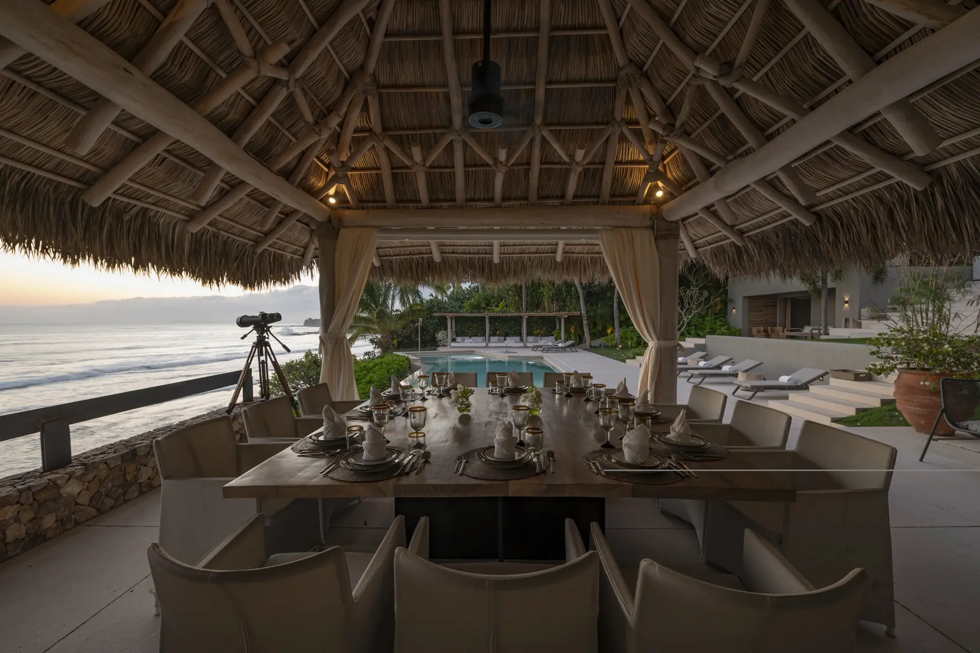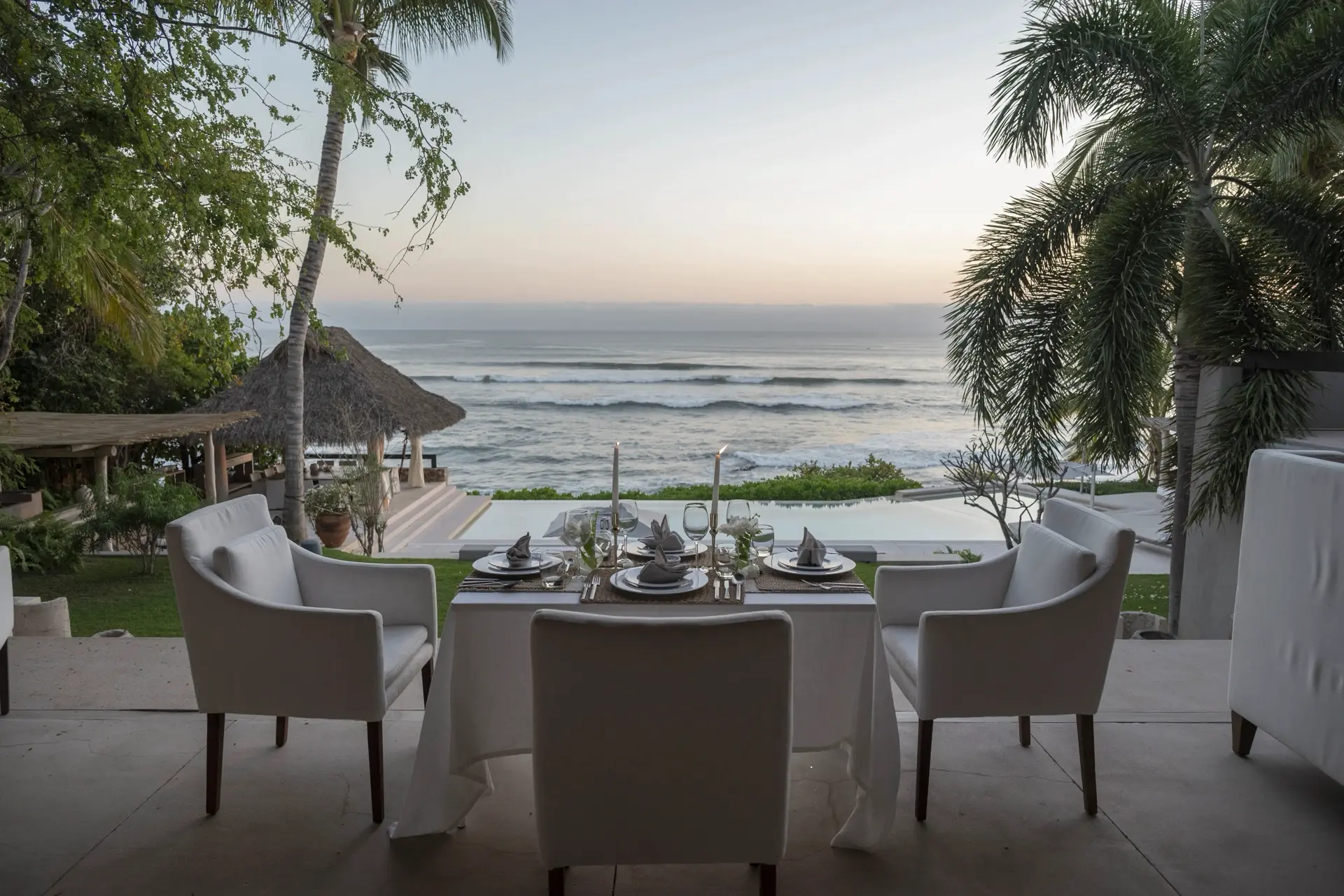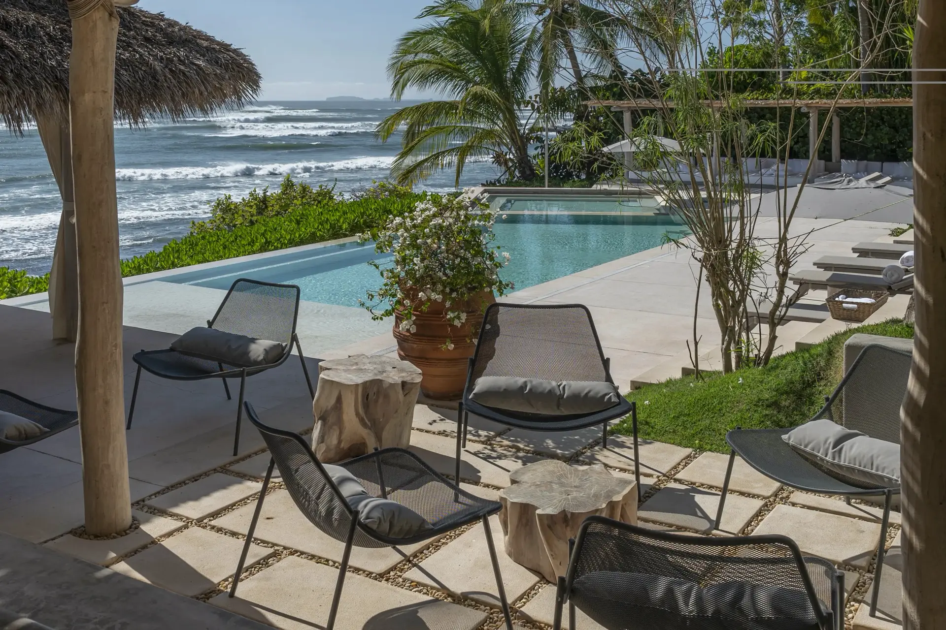 Arrival at Casarena feels like entering a private resort. Beyond elegant gates, swaying palms and polished sand paths lead the way to a world defined by quiet sophistication. The architecture draws inspiration from traditional palapa-style design, using organic materials that allow the villa to blend seamlessly into its tropical surroundings. Open-air spaces frame the ocean and sky, while the overall aesthetic is relaxed yet elevated—perfect for guests who appreciate design that feels both natural and intentional.