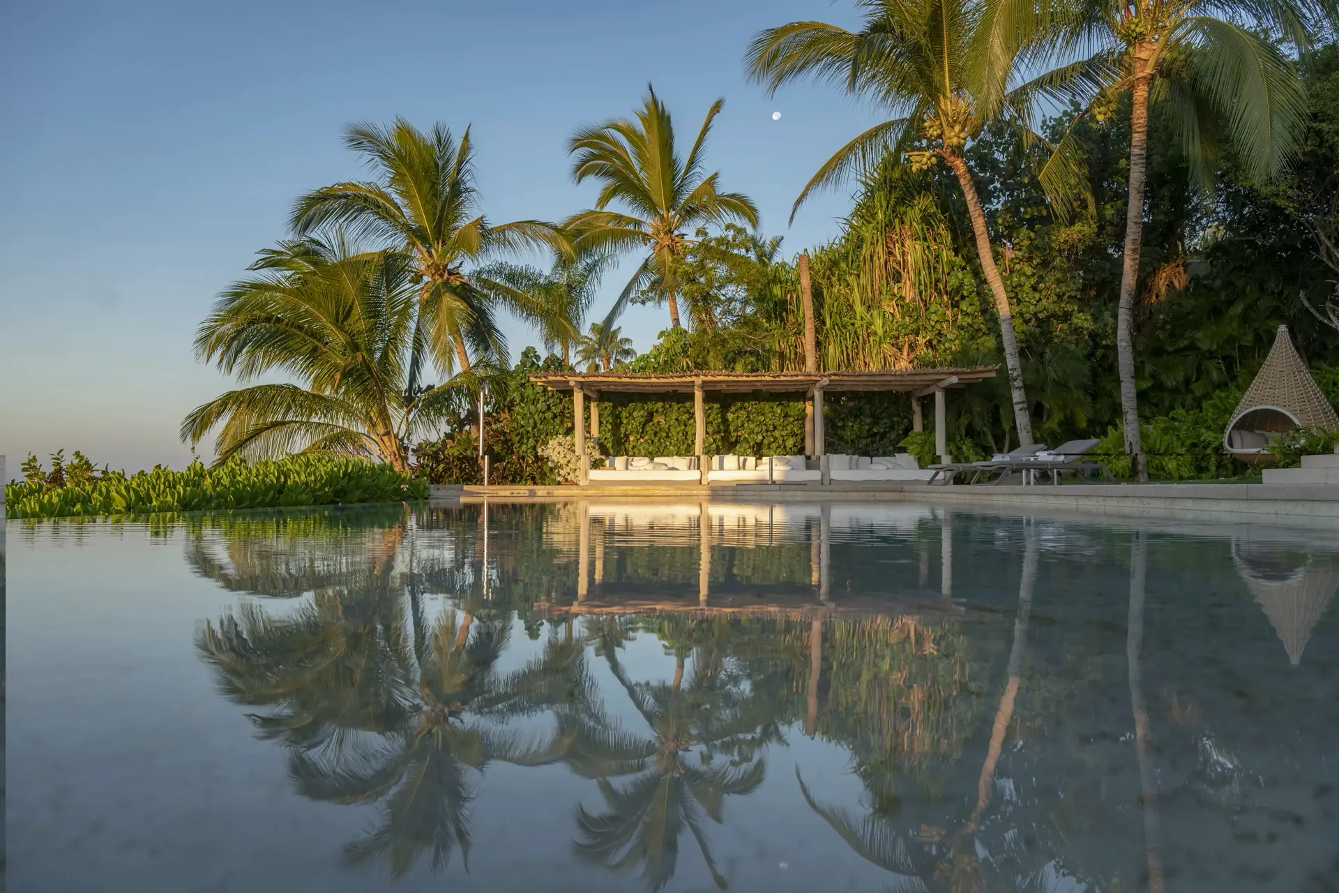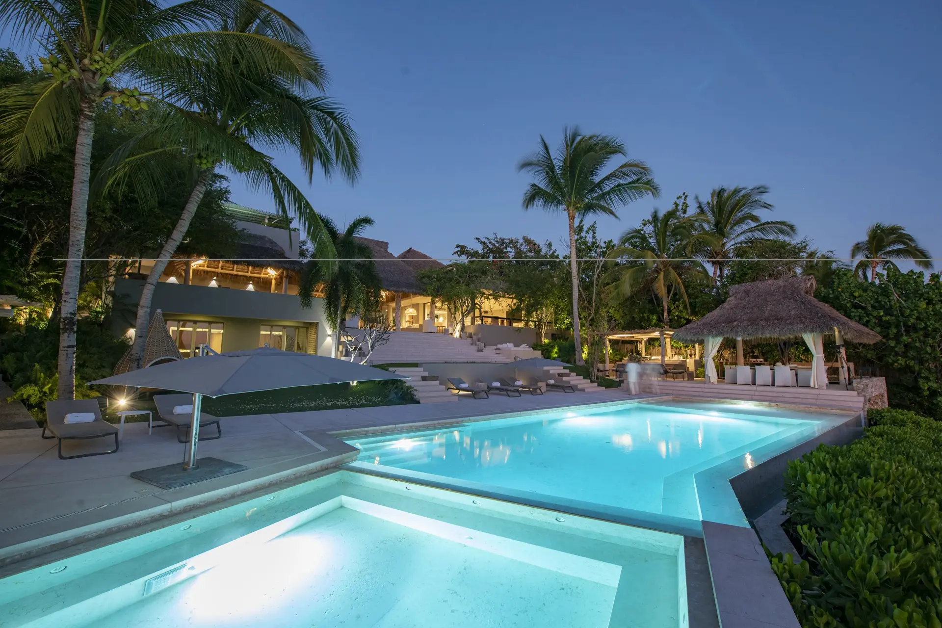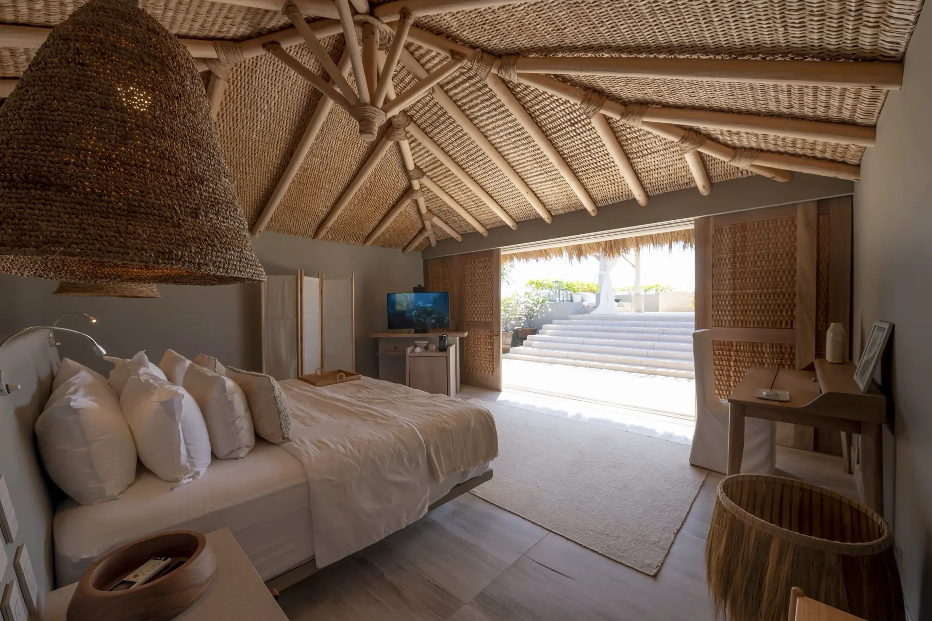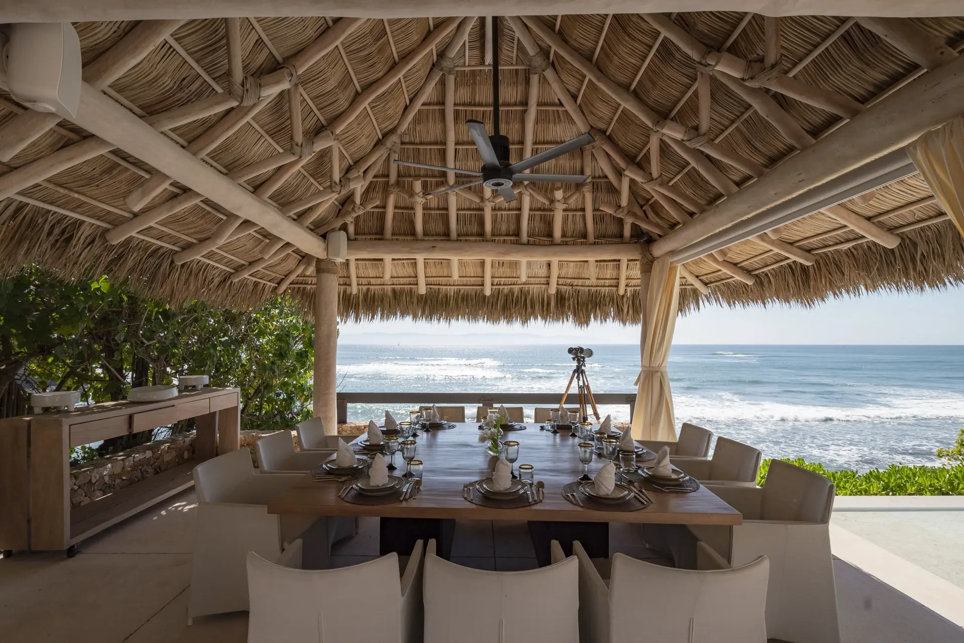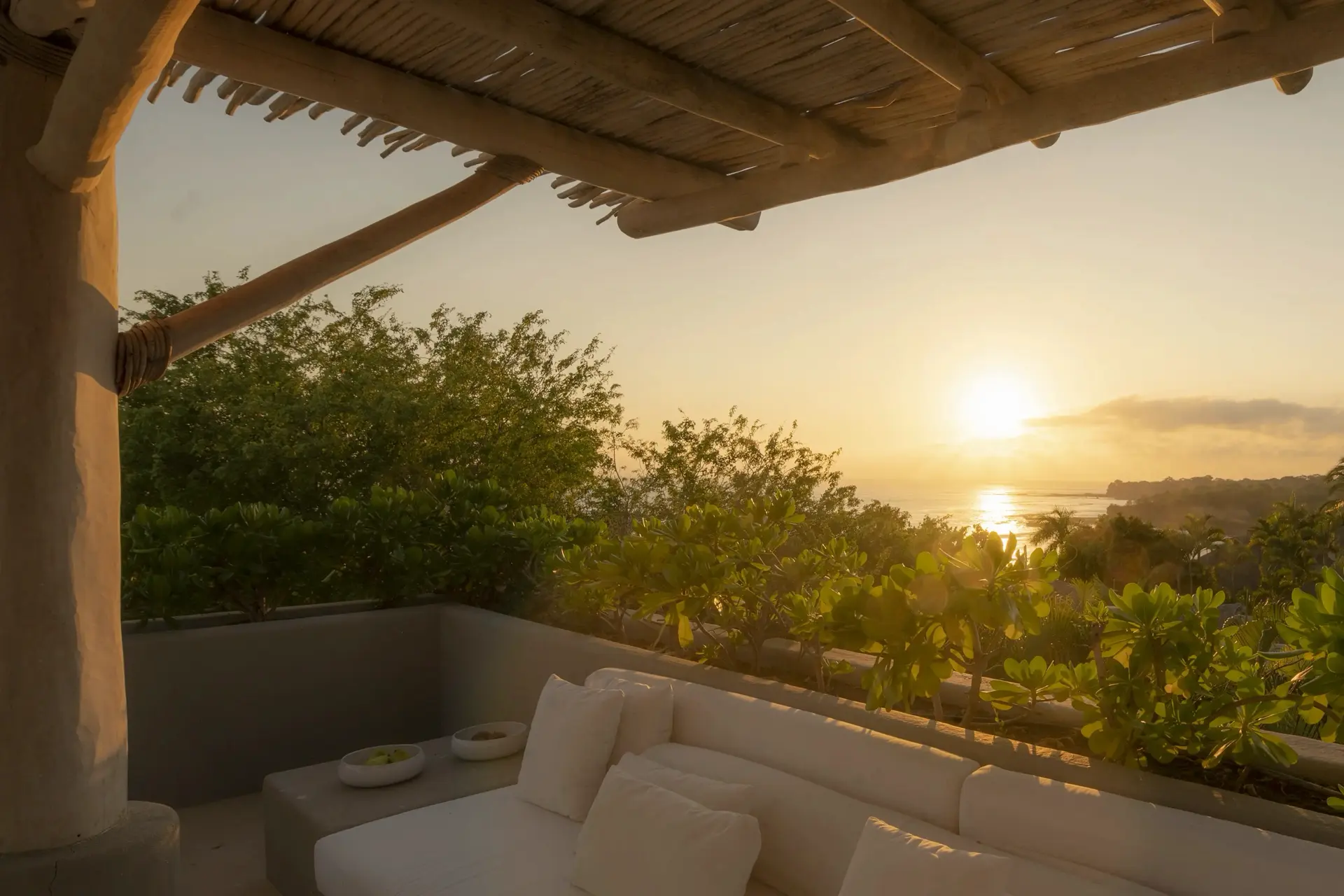 Arrival at Casarena feels like entering a private resort. Beyond elegant gates, swaying palms and polished sand paths lead the way to a world defined by quiet sophistication. The architecture draws inspiration from traditional palapa-style design, using organic materials that allow the villa to blend seamlessly into its tropical surroundings. Open-air spaces frame the ocean and sky, while the overall aesthetic is relaxed yet elevated—perfect for guests who appreciate design that feels both natural and intentional.