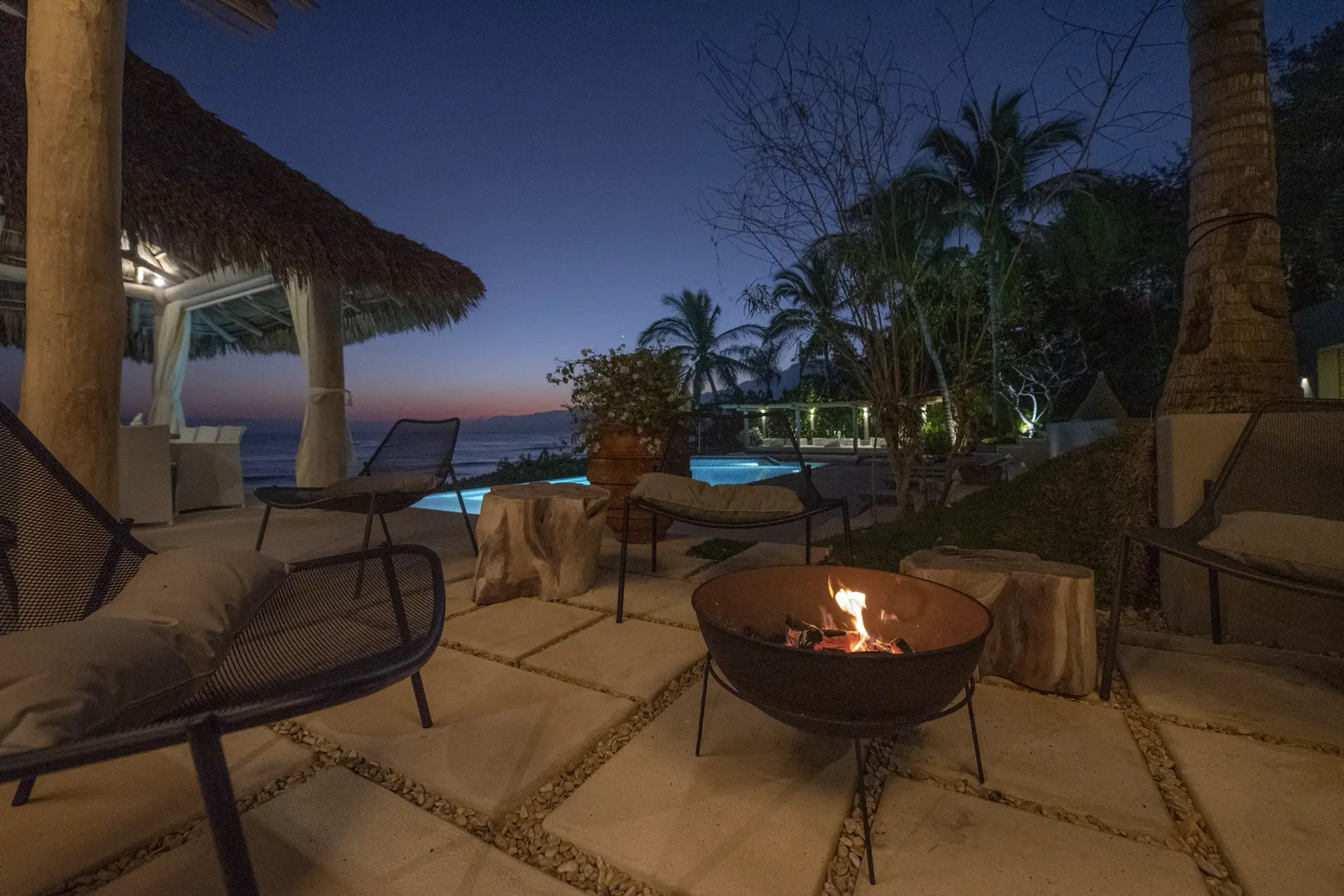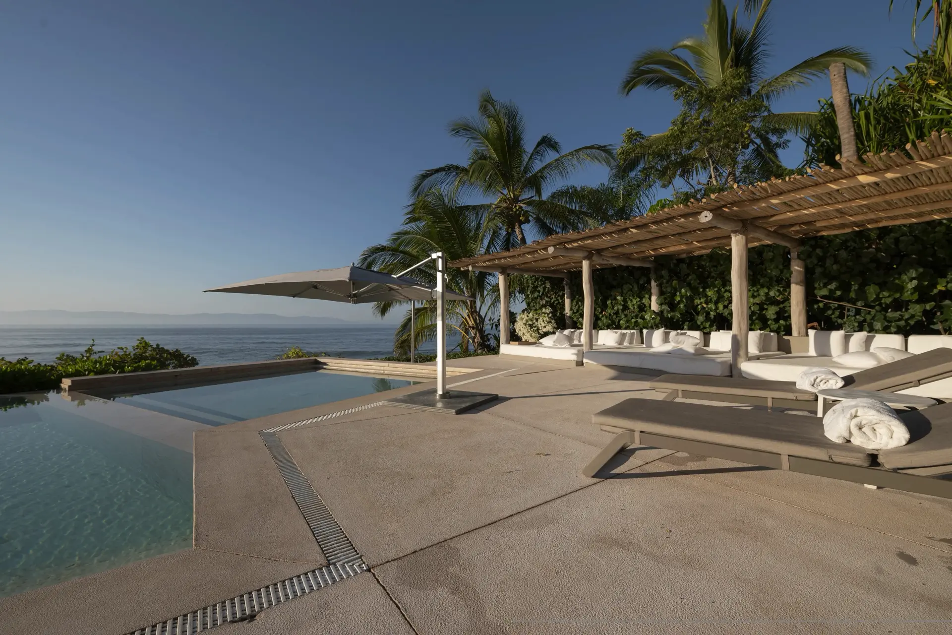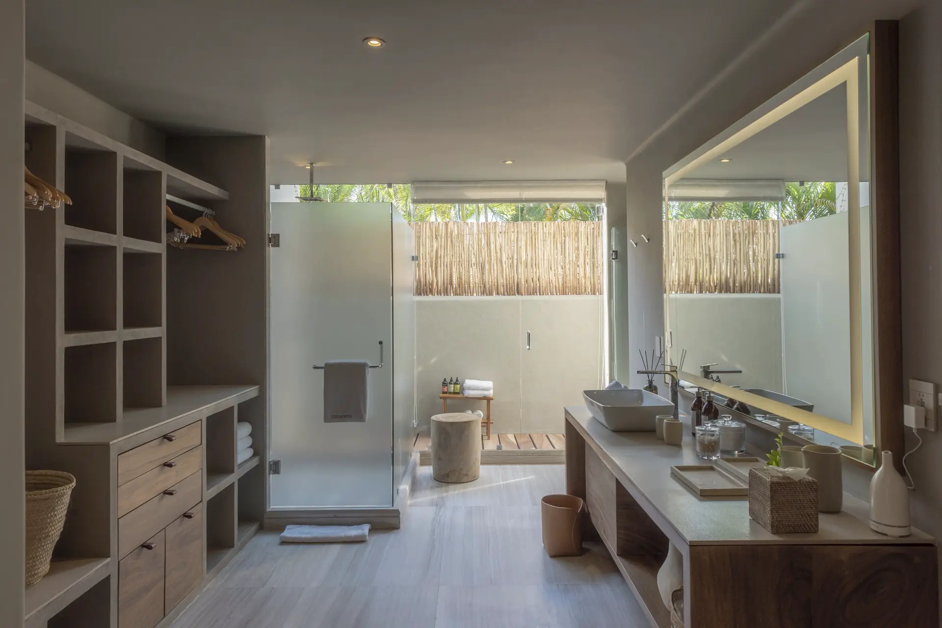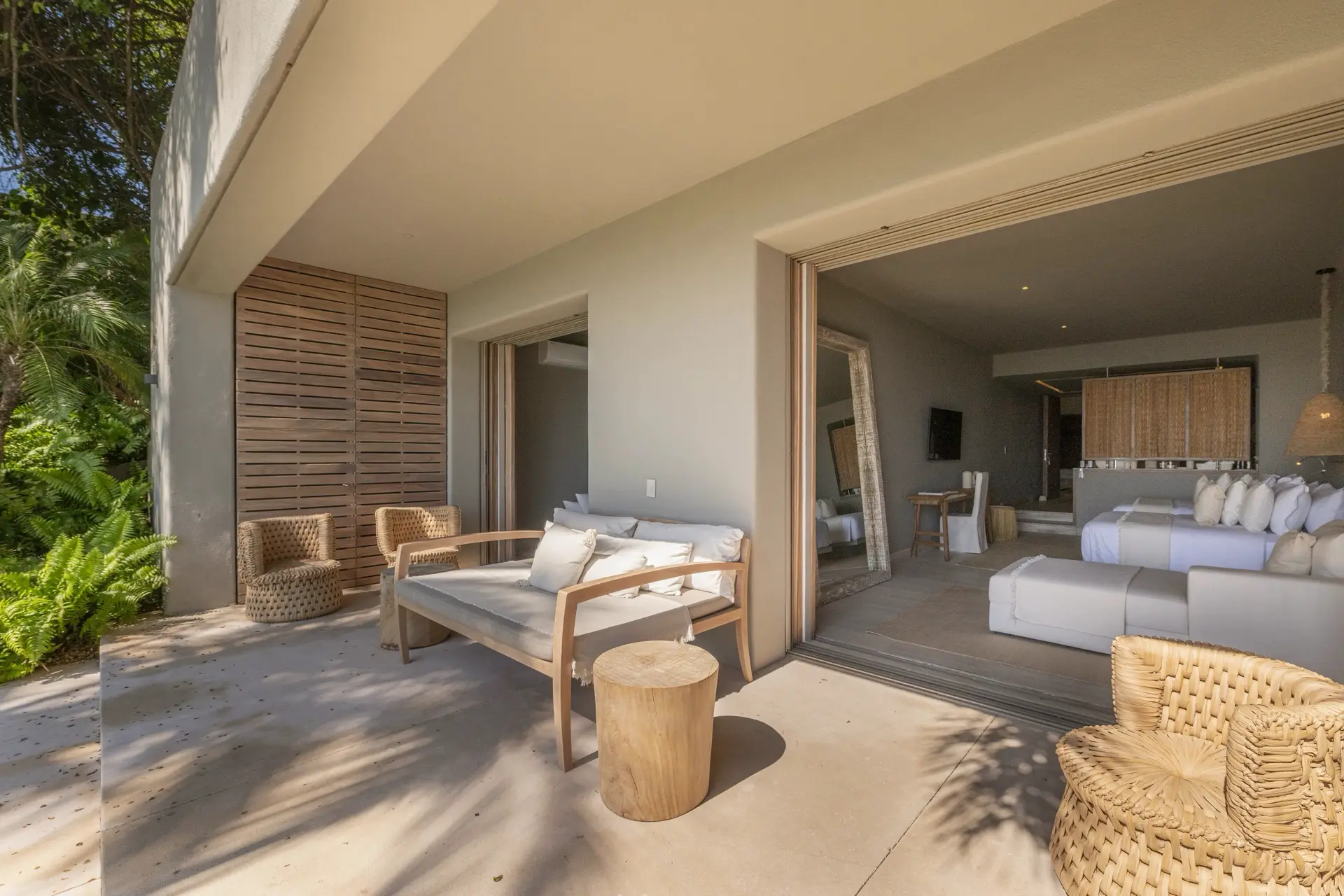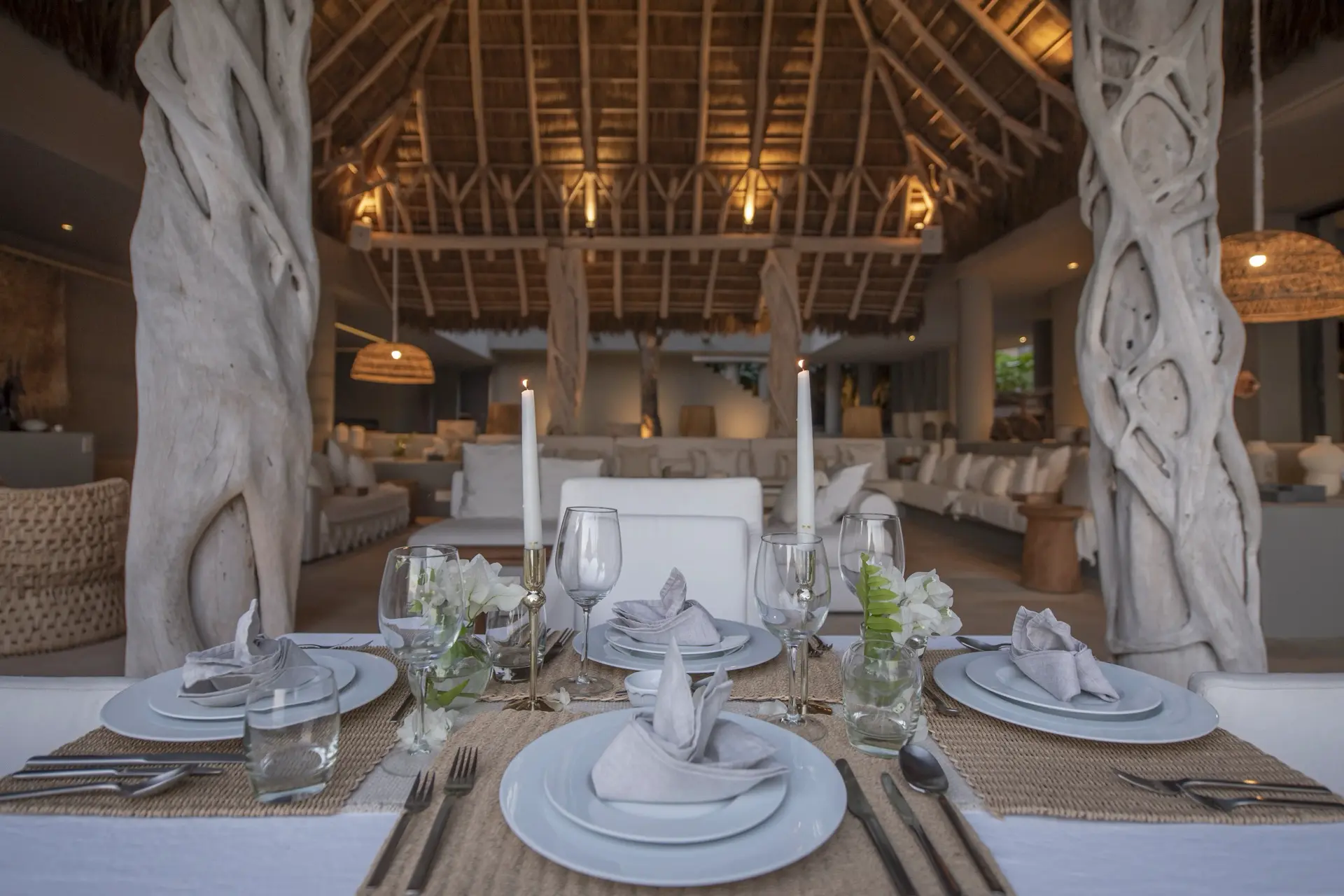 Arrival at Casarena feels like entering a private resort. Beyond elegant gates, swaying palms and polished sand paths lead the way to a world defined by quiet sophistication. The architecture draws inspiration from traditional palapa-style design, using organic materials that allow the villa to blend seamlessly into its tropical surroundings. Open-air spaces frame the ocean and sky, while the overall aesthetic is relaxed yet elevated—perfect for guests who appreciate design that feels both natural and intentional.