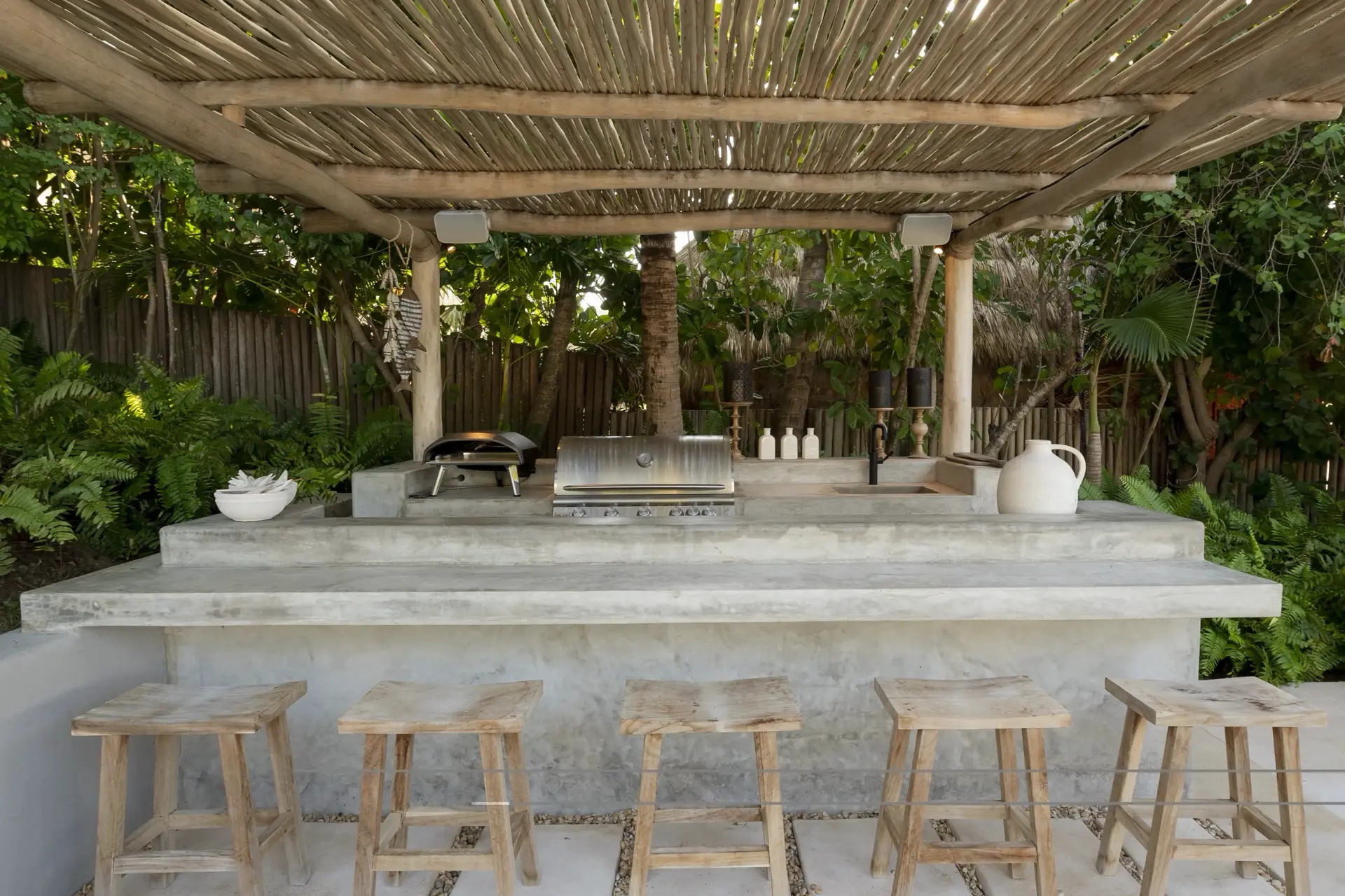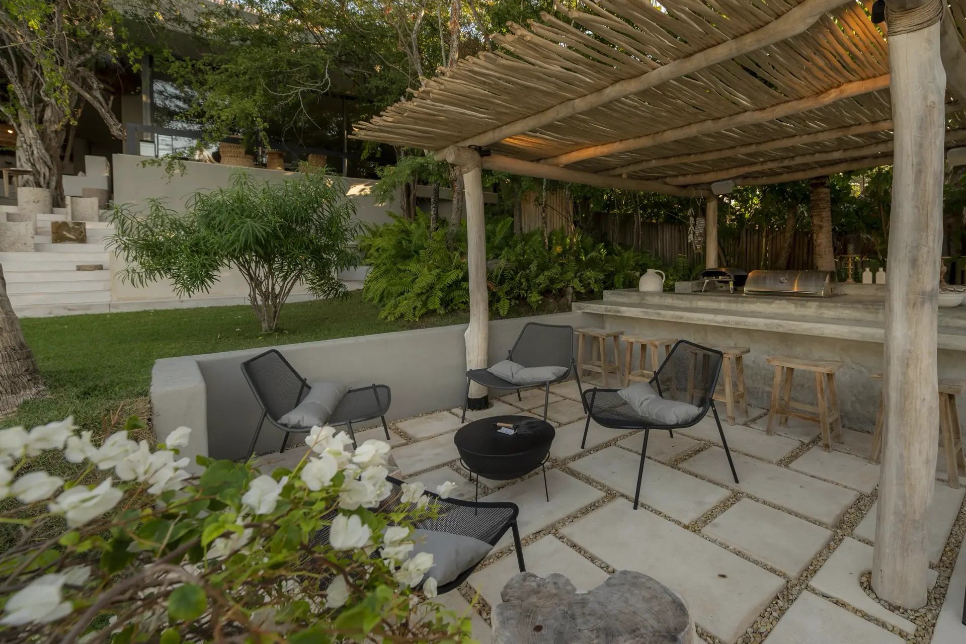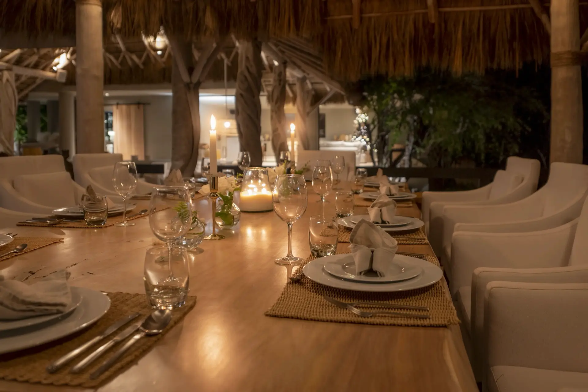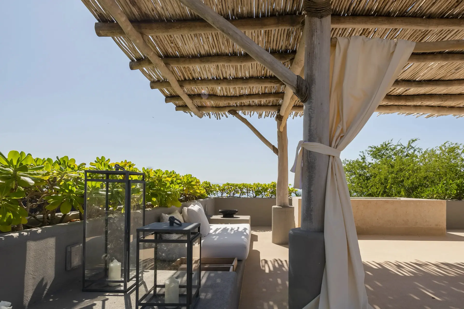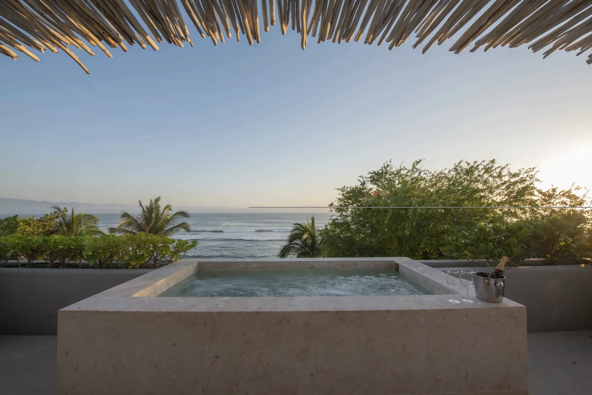 Arrival at Casarena feels like entering a private resort. Beyond elegant gates, swaying palms and polished sand paths lead the way to a world defined by quiet sophistication. The architecture draws inspiration from traditional palapa-style design, using organic materials that allow the villa to blend seamlessly into its tropical surroundings. Open-air spaces frame the ocean and sky, while the overall aesthetic is relaxed yet elevated—perfect for guests who appreciate design that feels both natural and intentional.