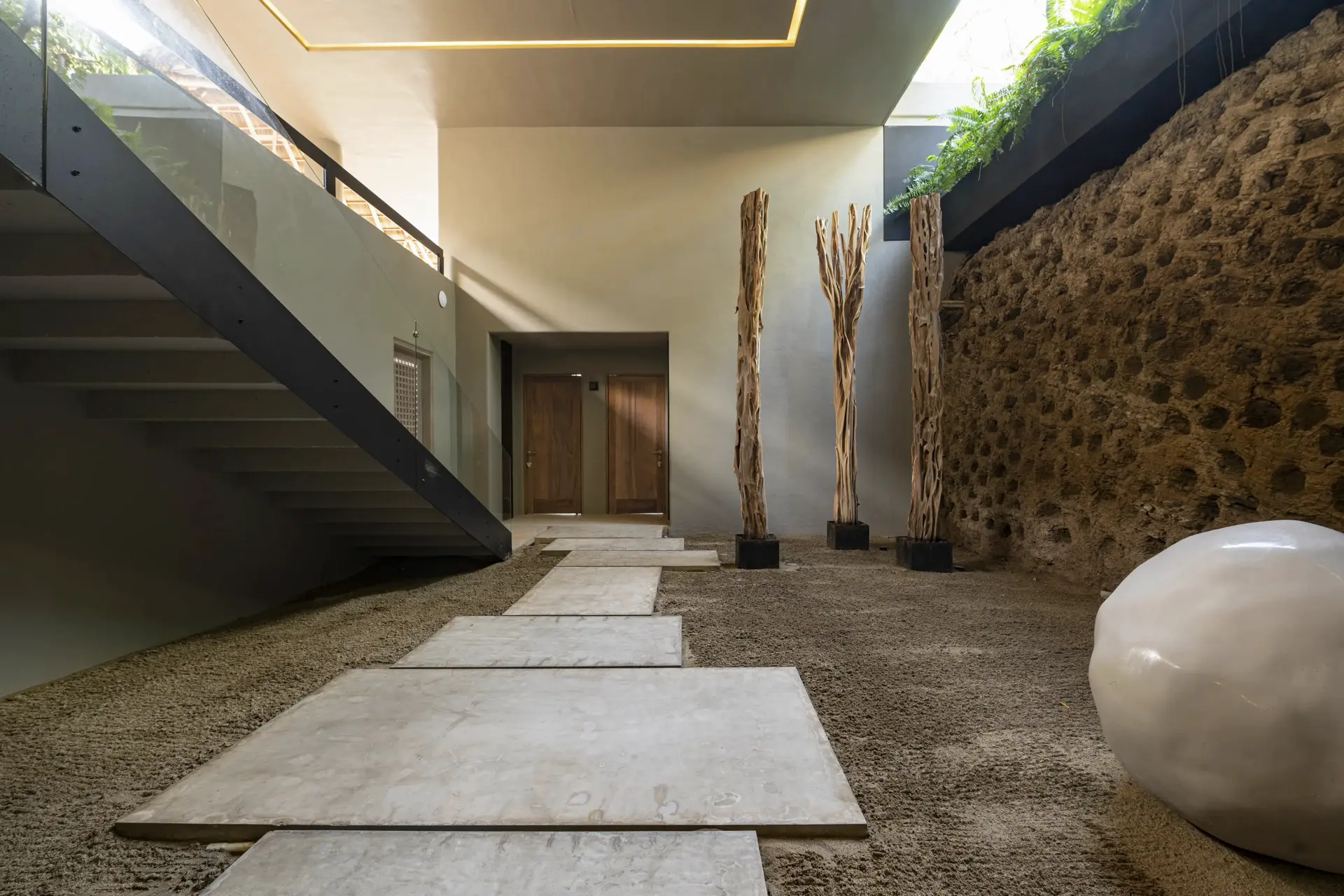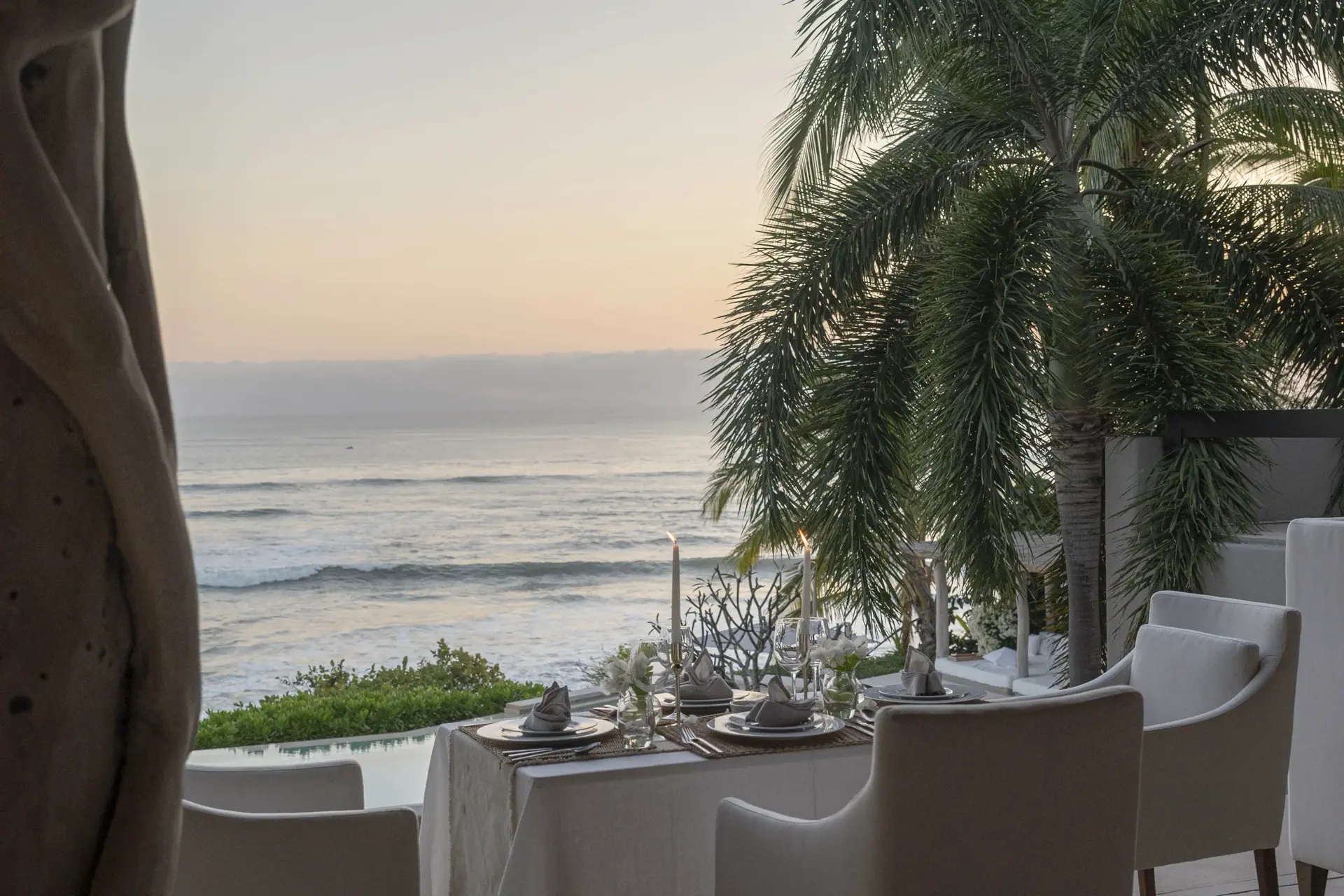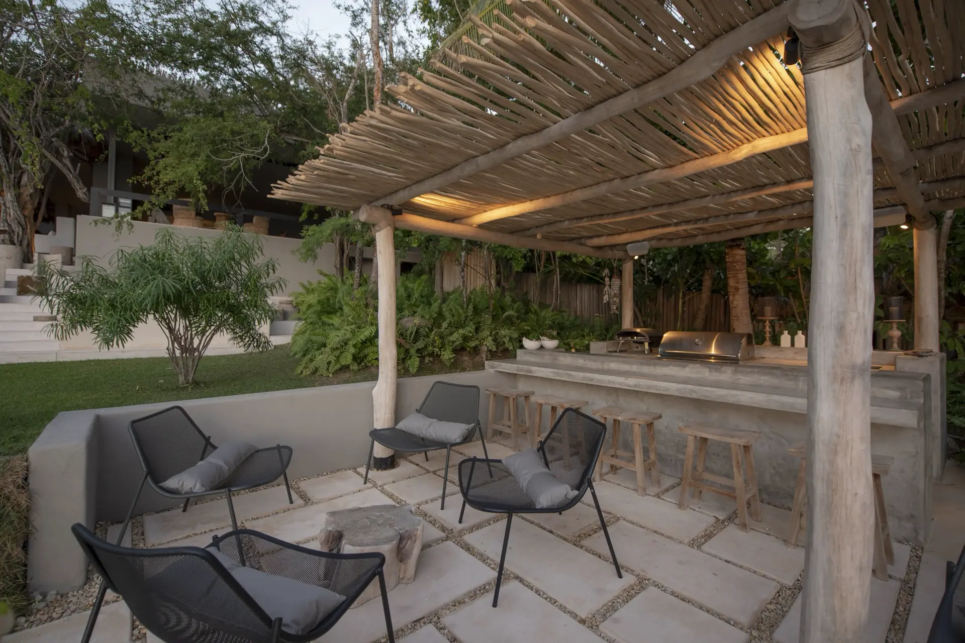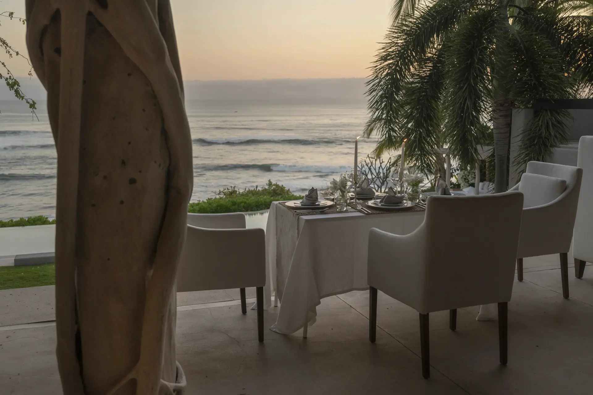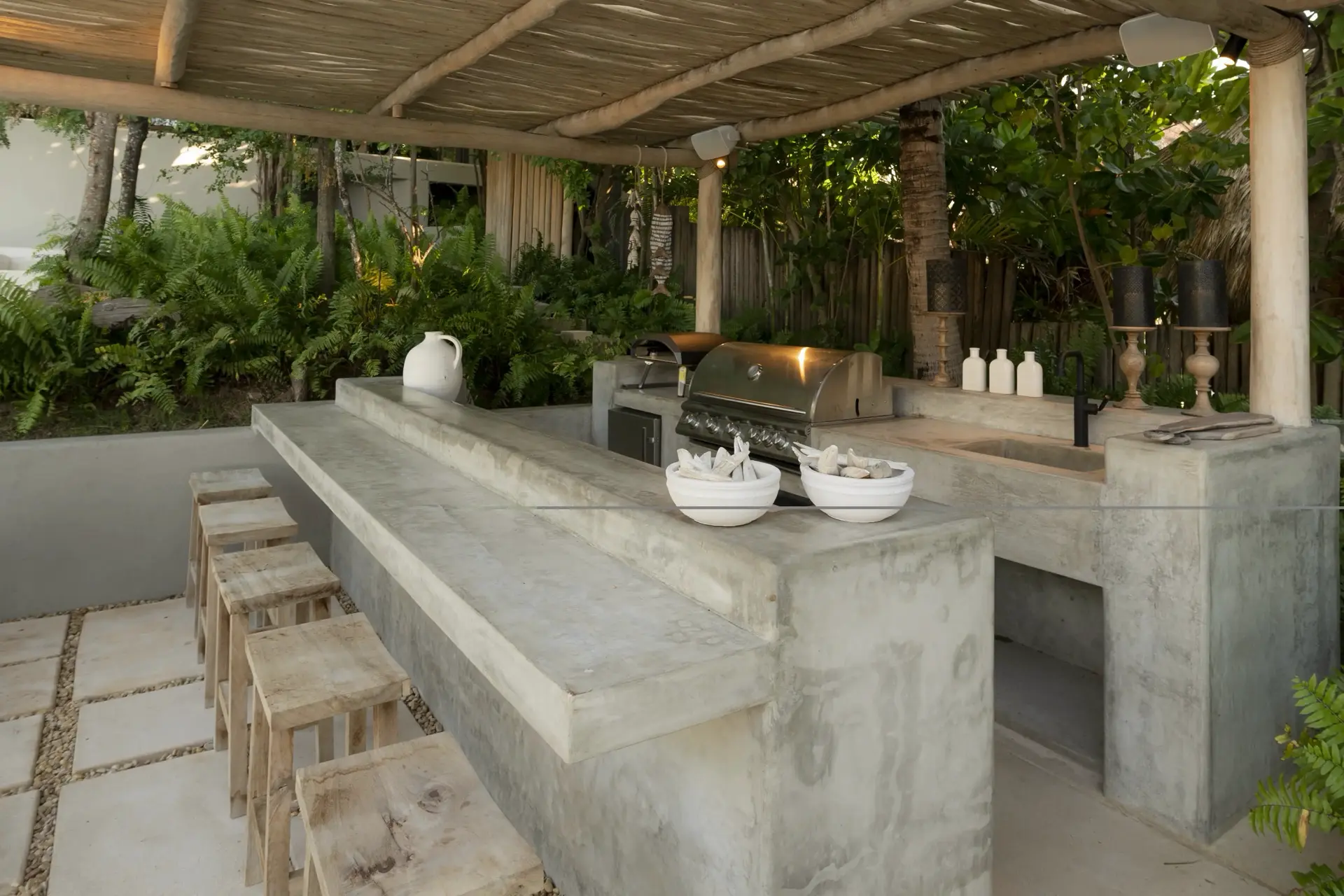 Arrival at Casarena feels like entering a private resort. Beyond elegant gates, swaying palms and polished sand paths lead the way to a world defined by quiet sophistication. The architecture draws inspiration from traditional palapa-style design, using organic materials that allow the villa to blend seamlessly into its tropical surroundings. Open-air spaces frame the ocean and sky, while the overall aesthetic is relaxed yet elevated—perfect for guests who appreciate design that feels both natural and intentional.