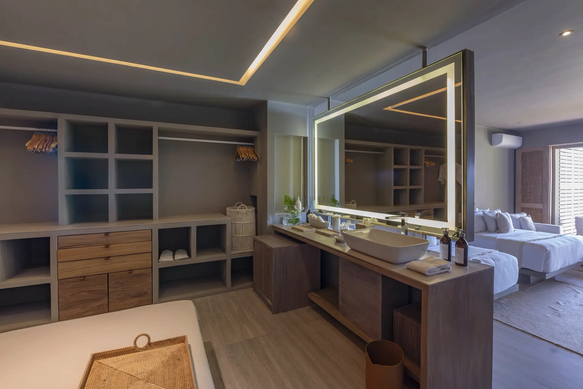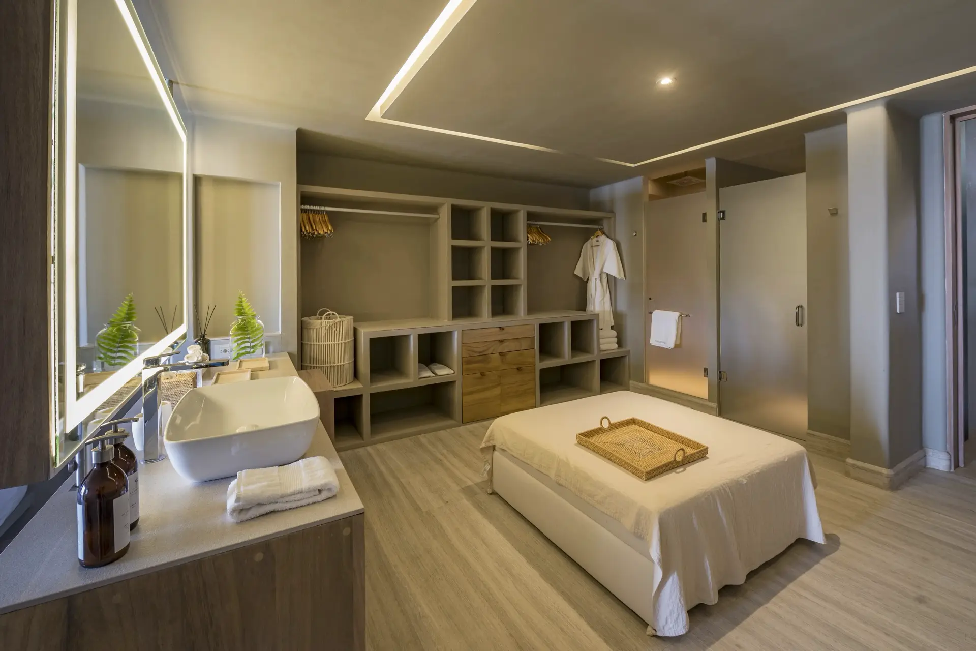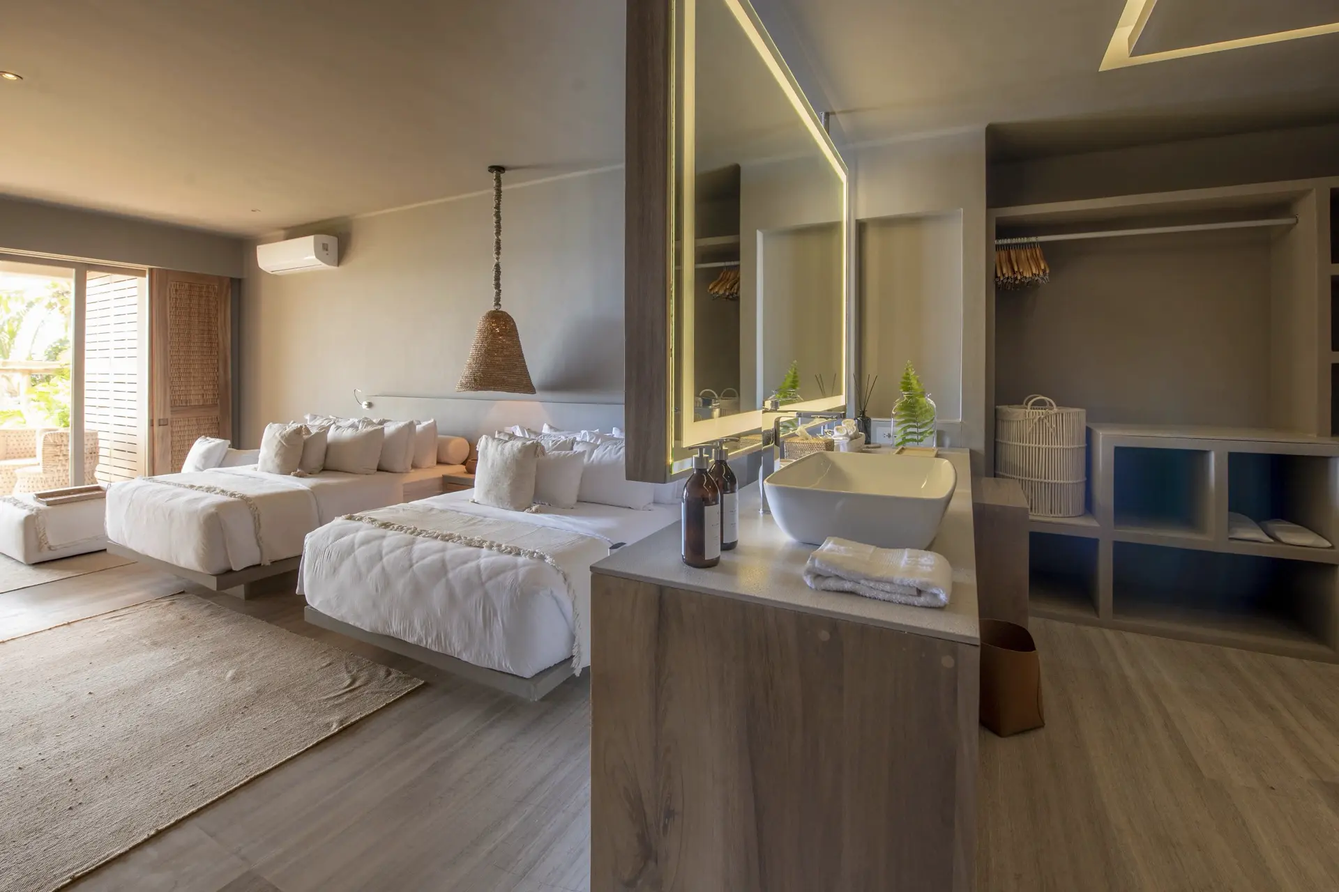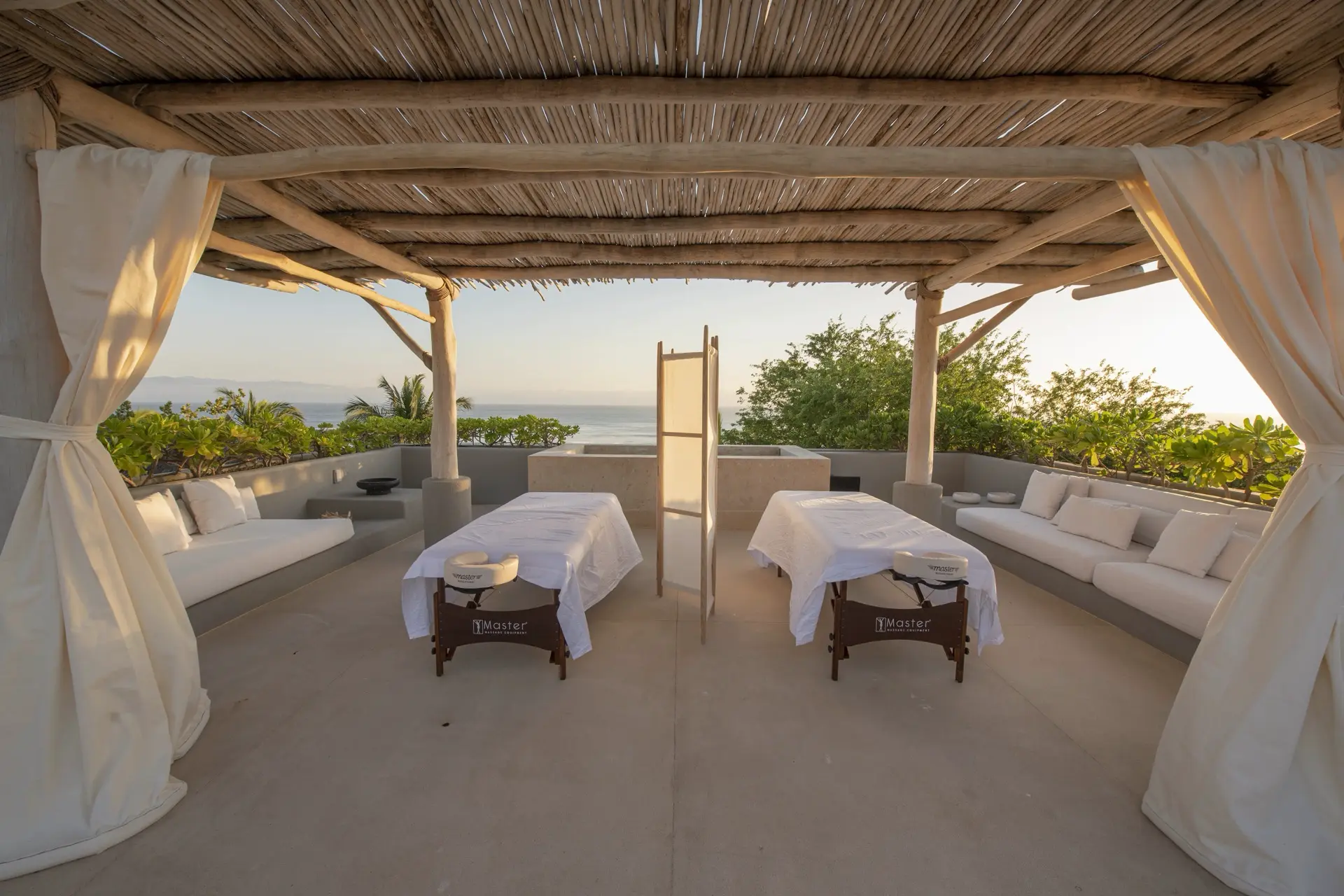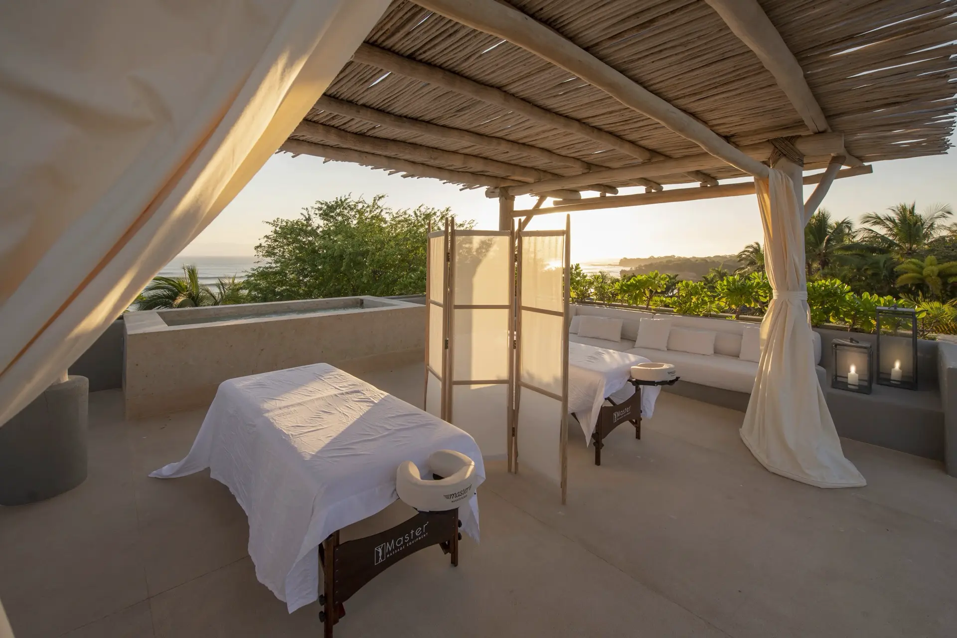 Arrival at Casarena feels like entering a private resort. Beyond elegant gates, swaying palms and polished sand paths lead the way to a world defined by quiet sophistication. The architecture draws inspiration from traditional palapa-style design, using organic materials that allow the villa to blend seamlessly into its tropical surroundings. Open-air spaces frame the ocean and sky, while the overall aesthetic is relaxed yet elevated—perfect for guests who appreciate design that feels both natural and intentional.