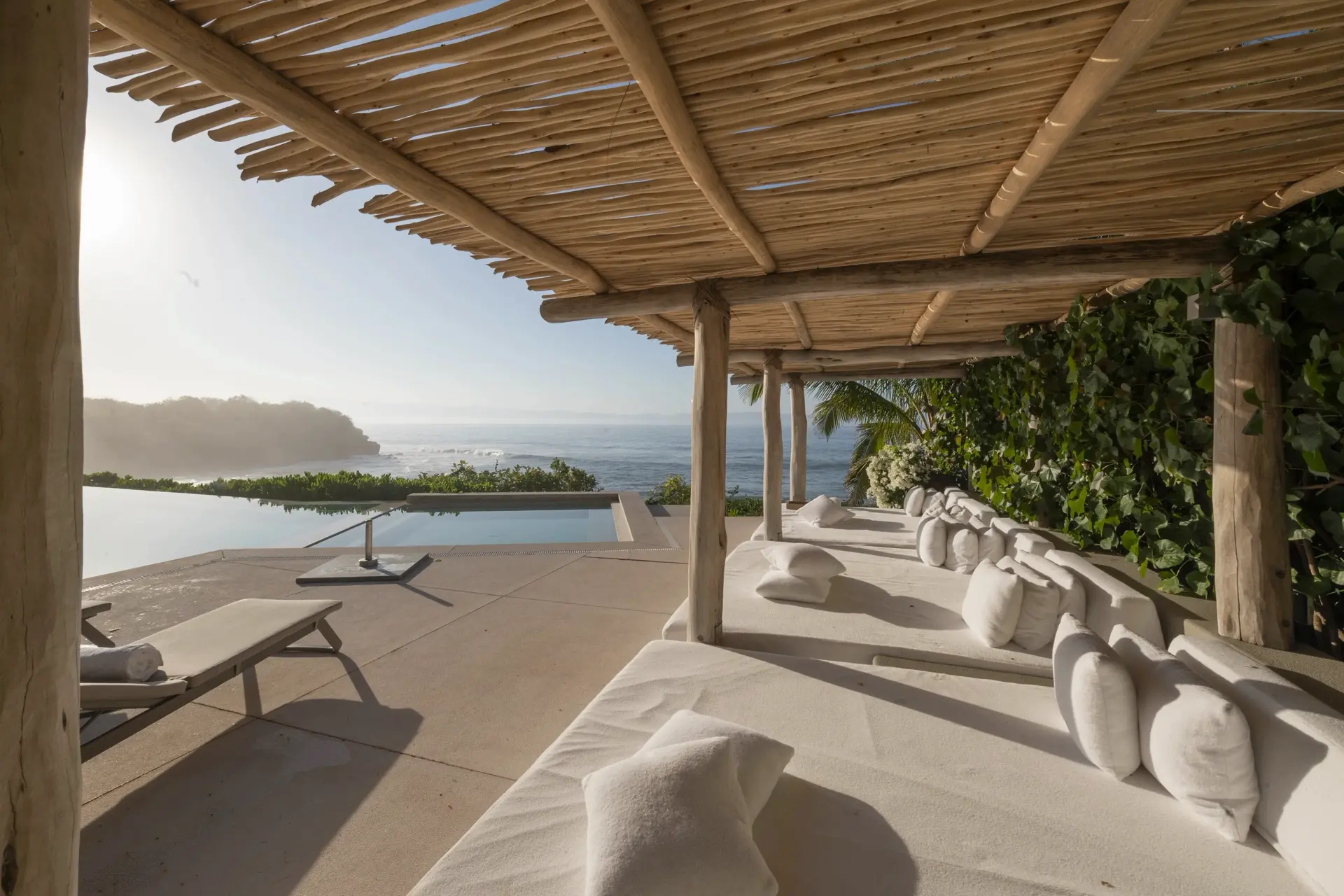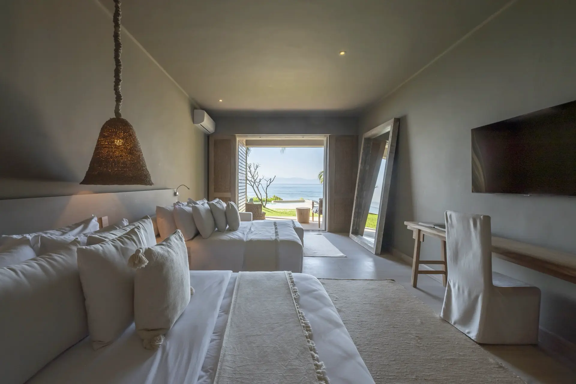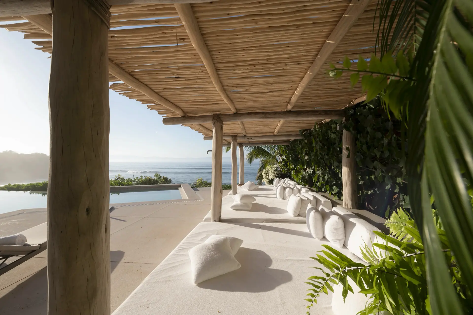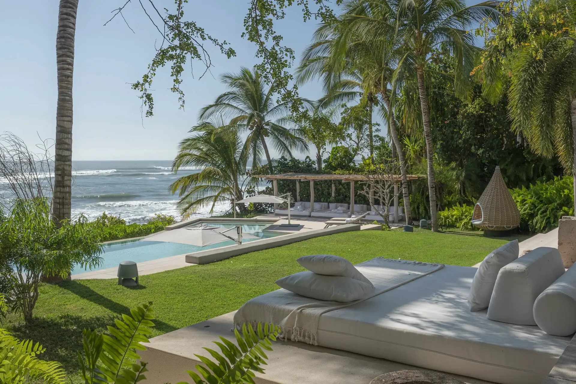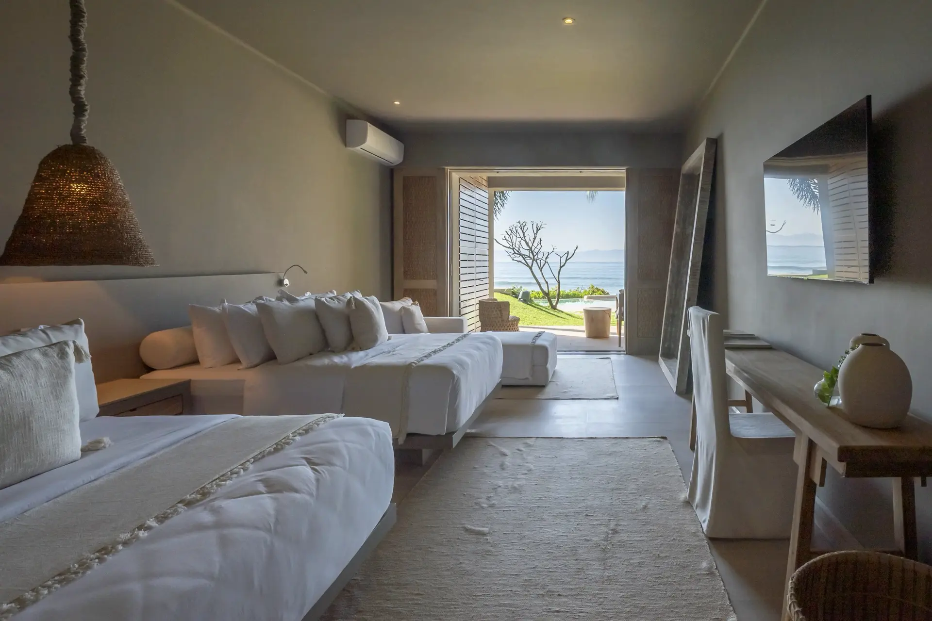 Inside, Casarena’s interiors are a study in contemporary coastal style. Expansive open-plan lounges are layered with oversized woven textures, whitewashed finishes, and deep, inviting sofas that invite lingering conversation or peaceful contemplation. The atmosphere is airy and uncluttered, with each space oriented toward the views and the gentle rhythm of the Pacific just beyond.