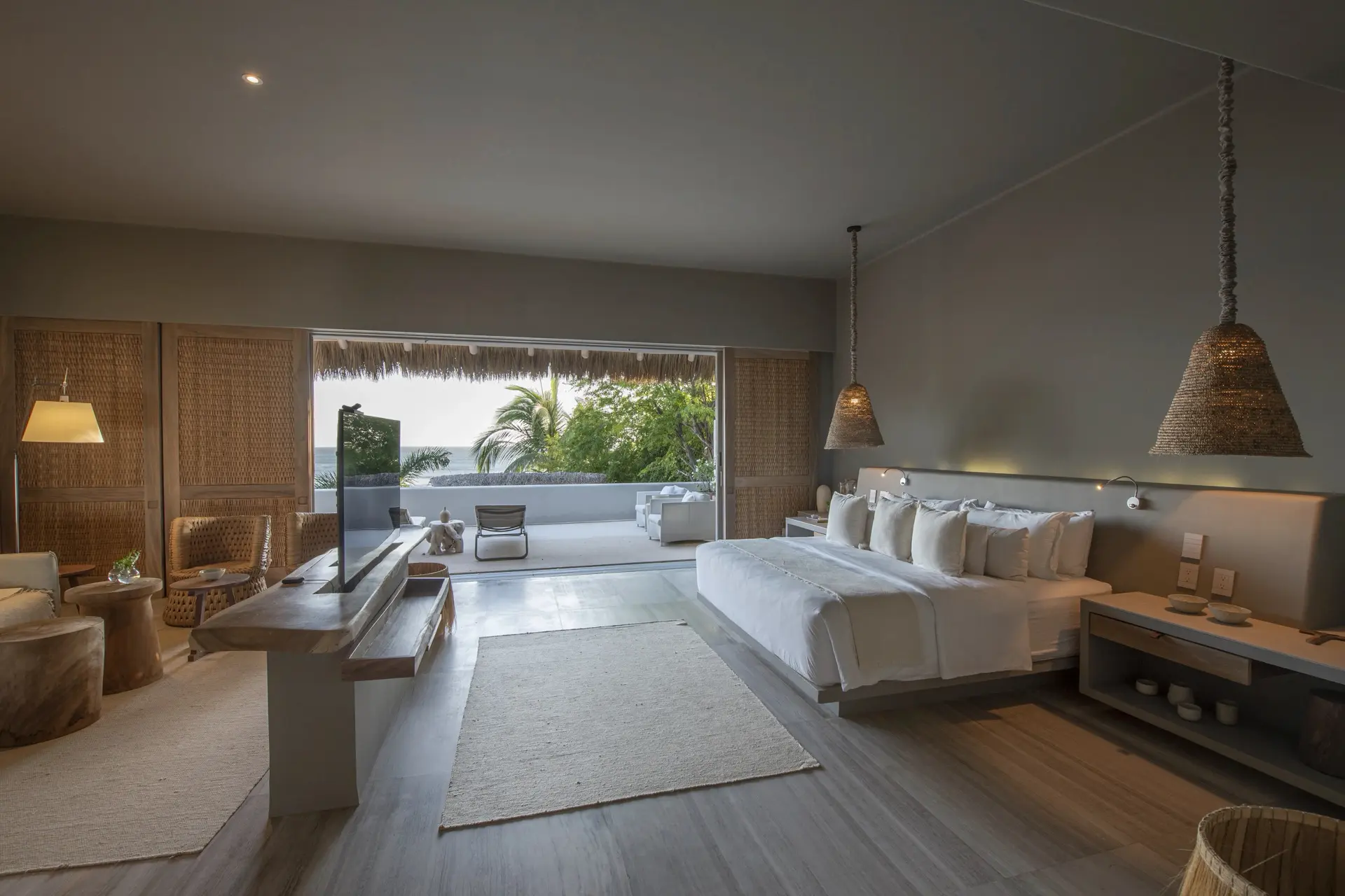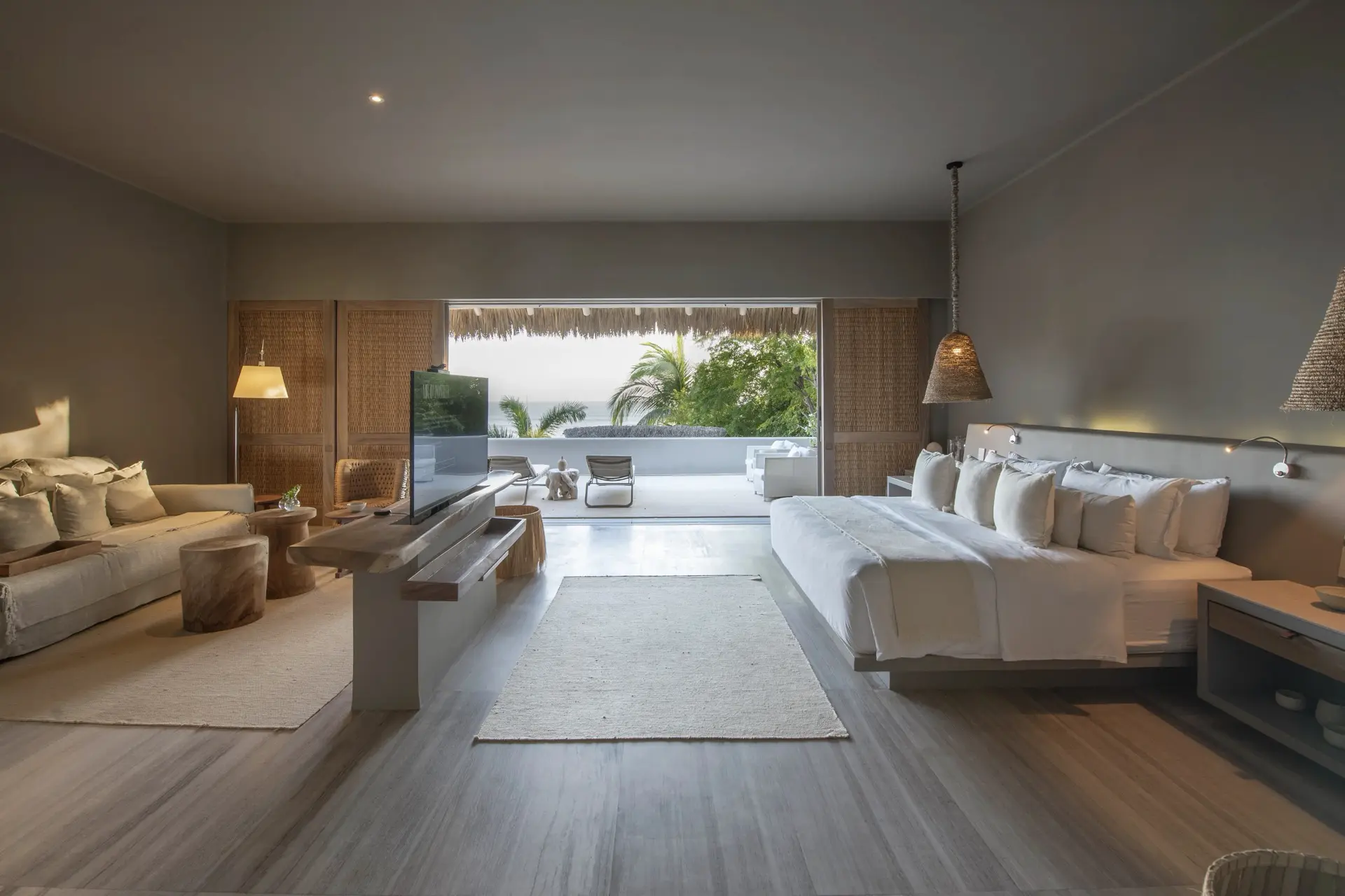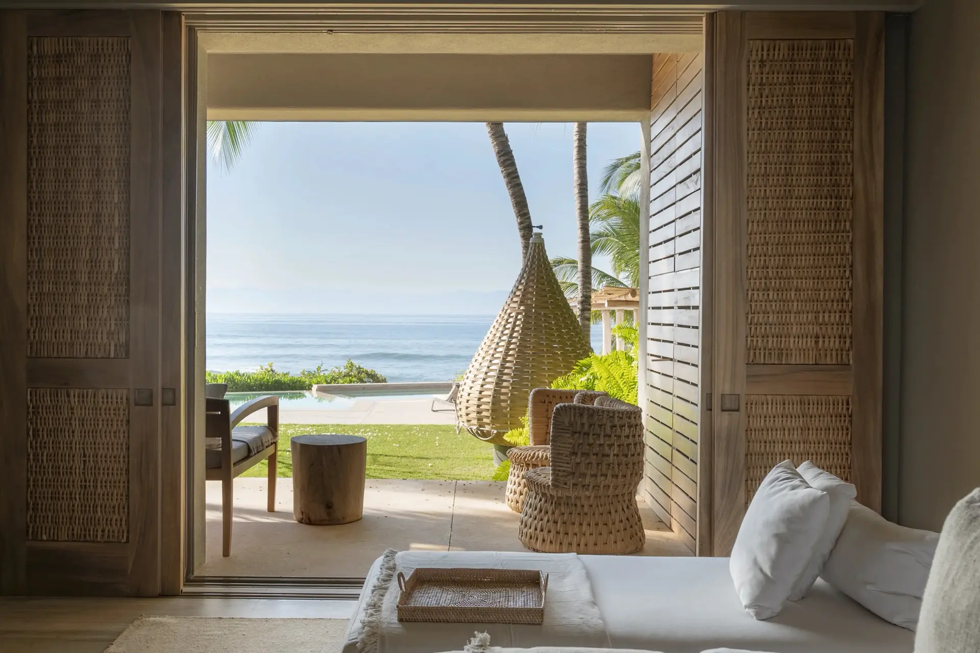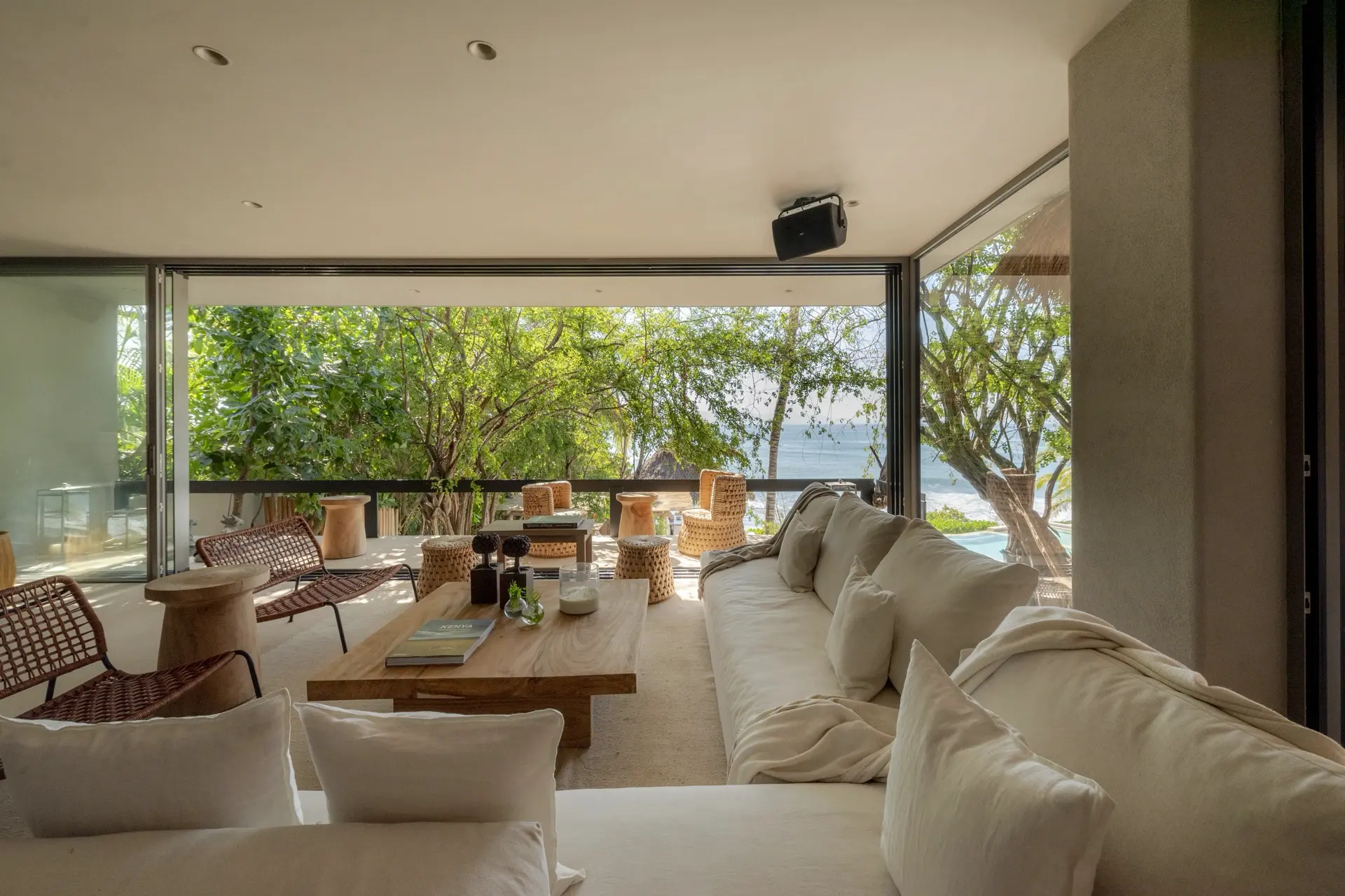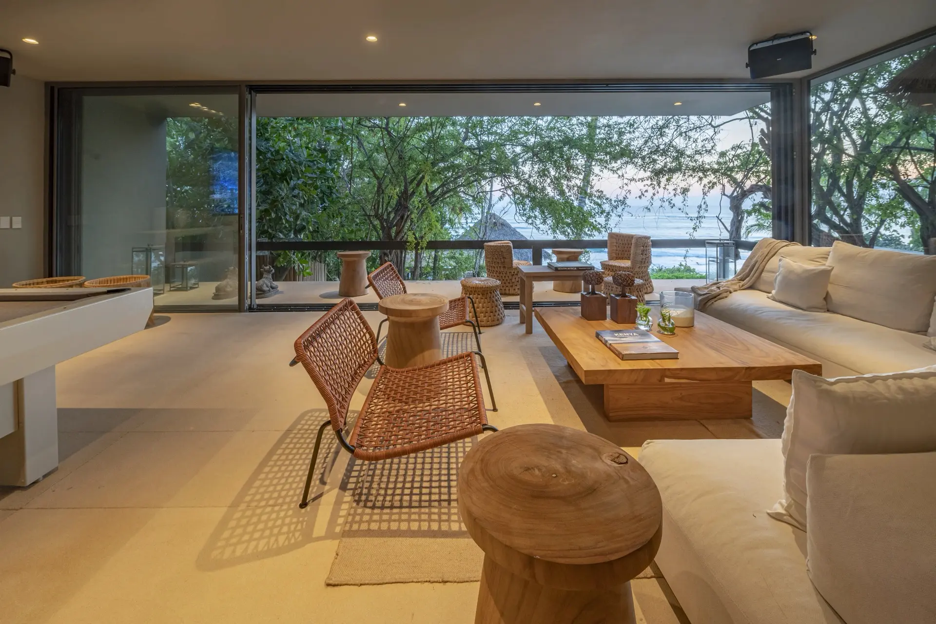 Inside, Casarena’s interiors are a study in contemporary coastal style. Expansive open-plan lounges are layered with oversized woven textures, whitewashed finishes, and deep, inviting sofas that invite lingering conversation or peaceful contemplation. The atmosphere is airy and uncluttered, with each space oriented toward the views and the gentle rhythm of the Pacific just beyond.
