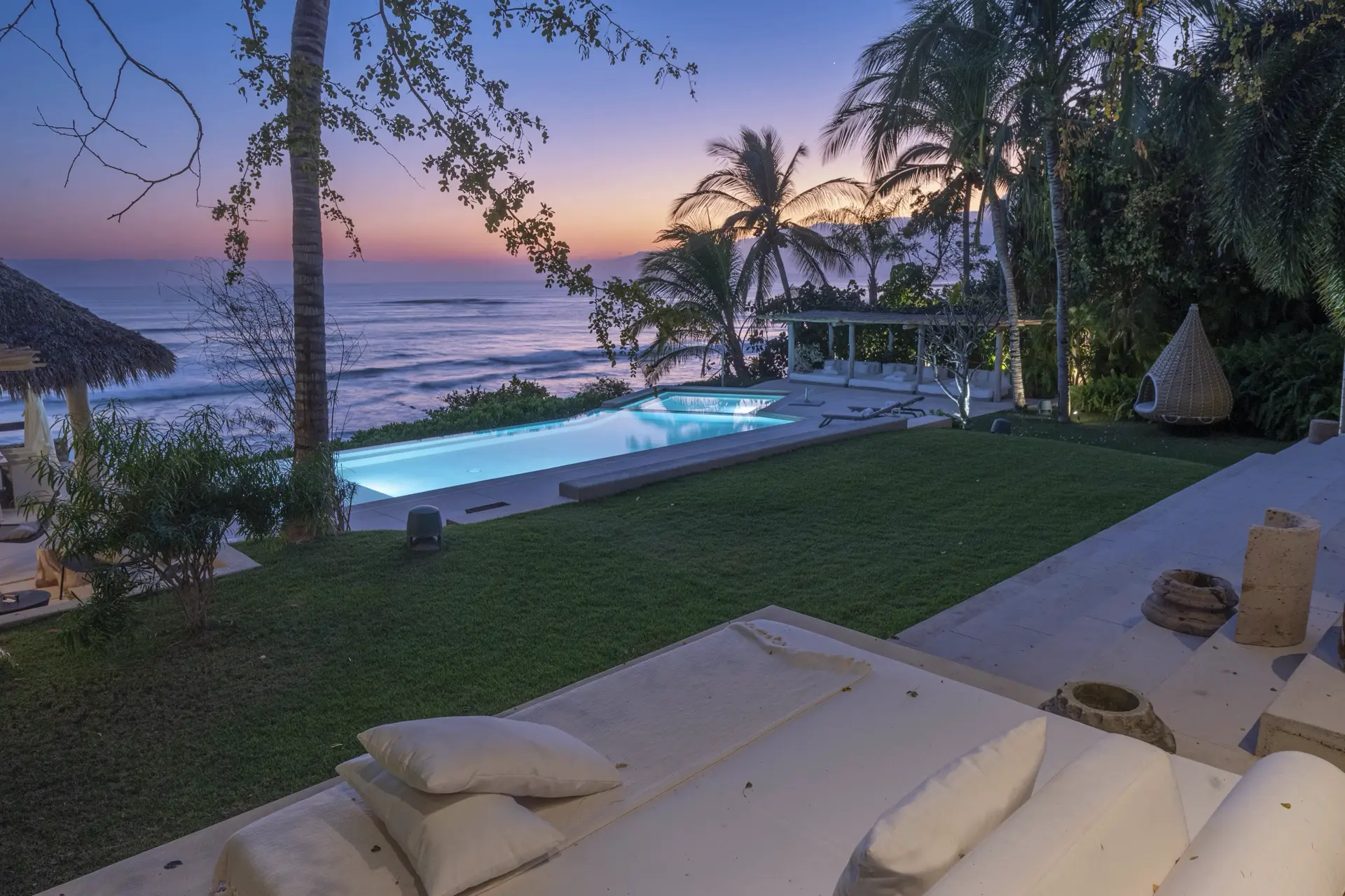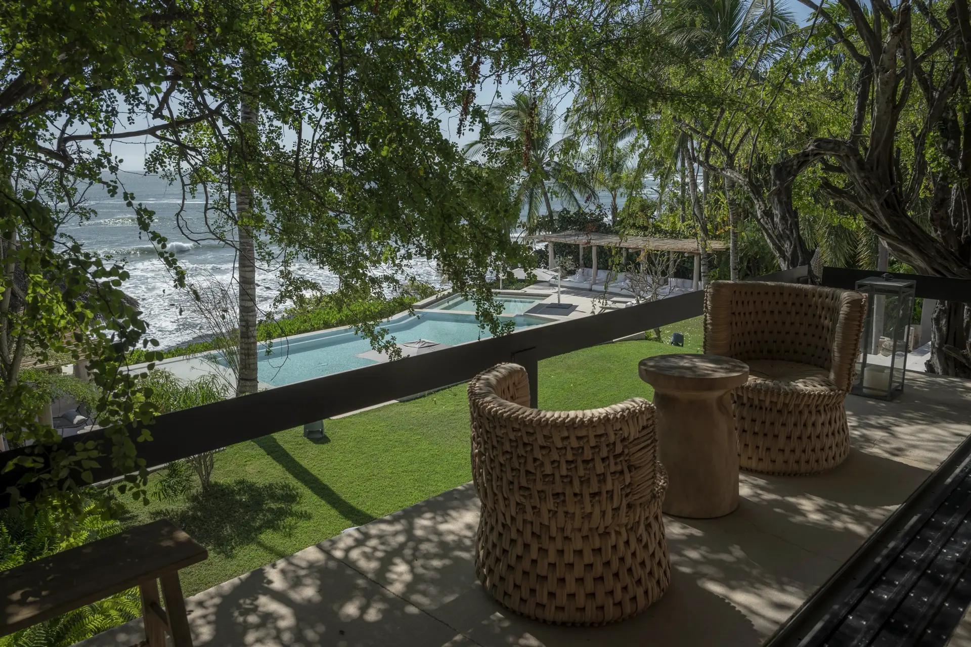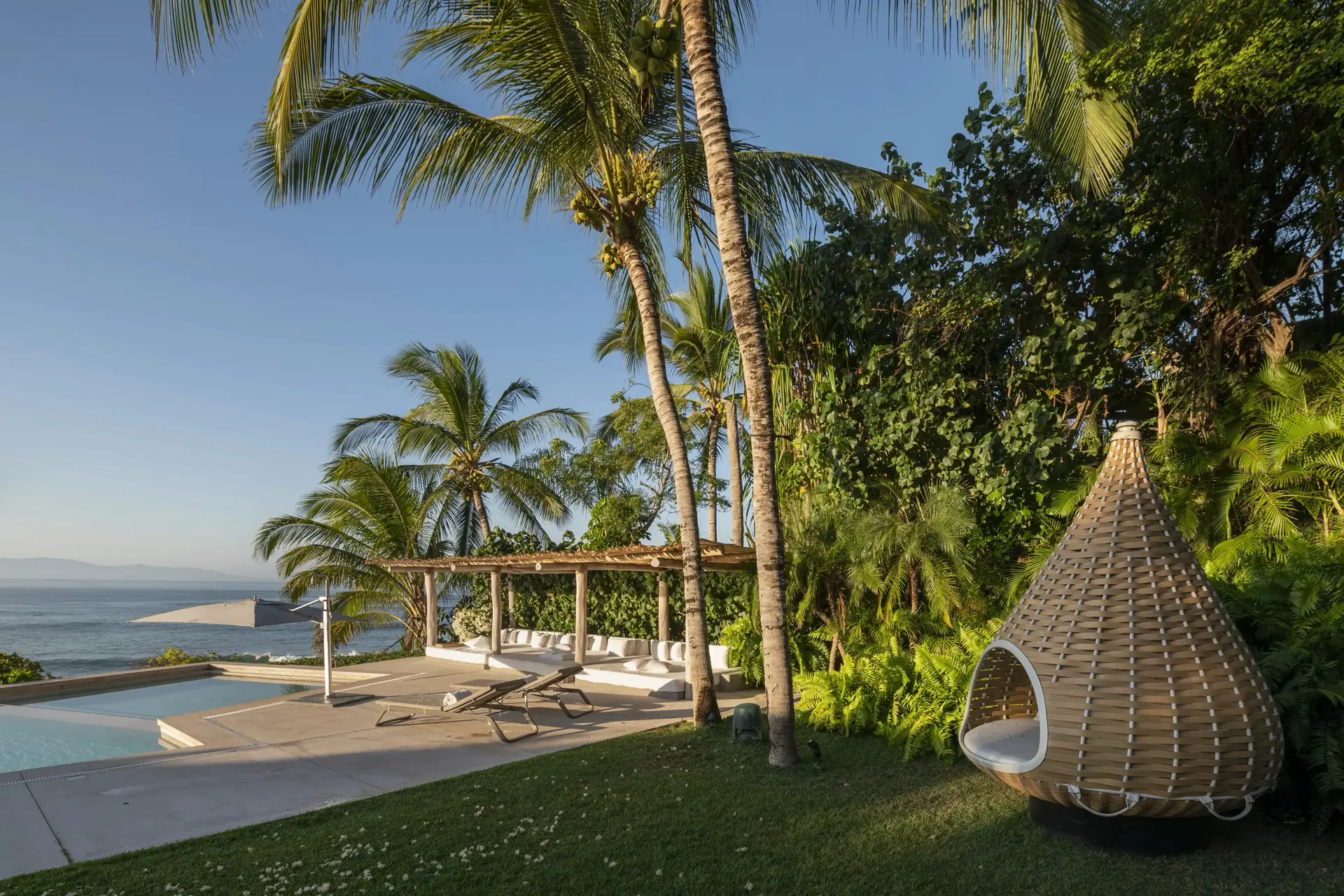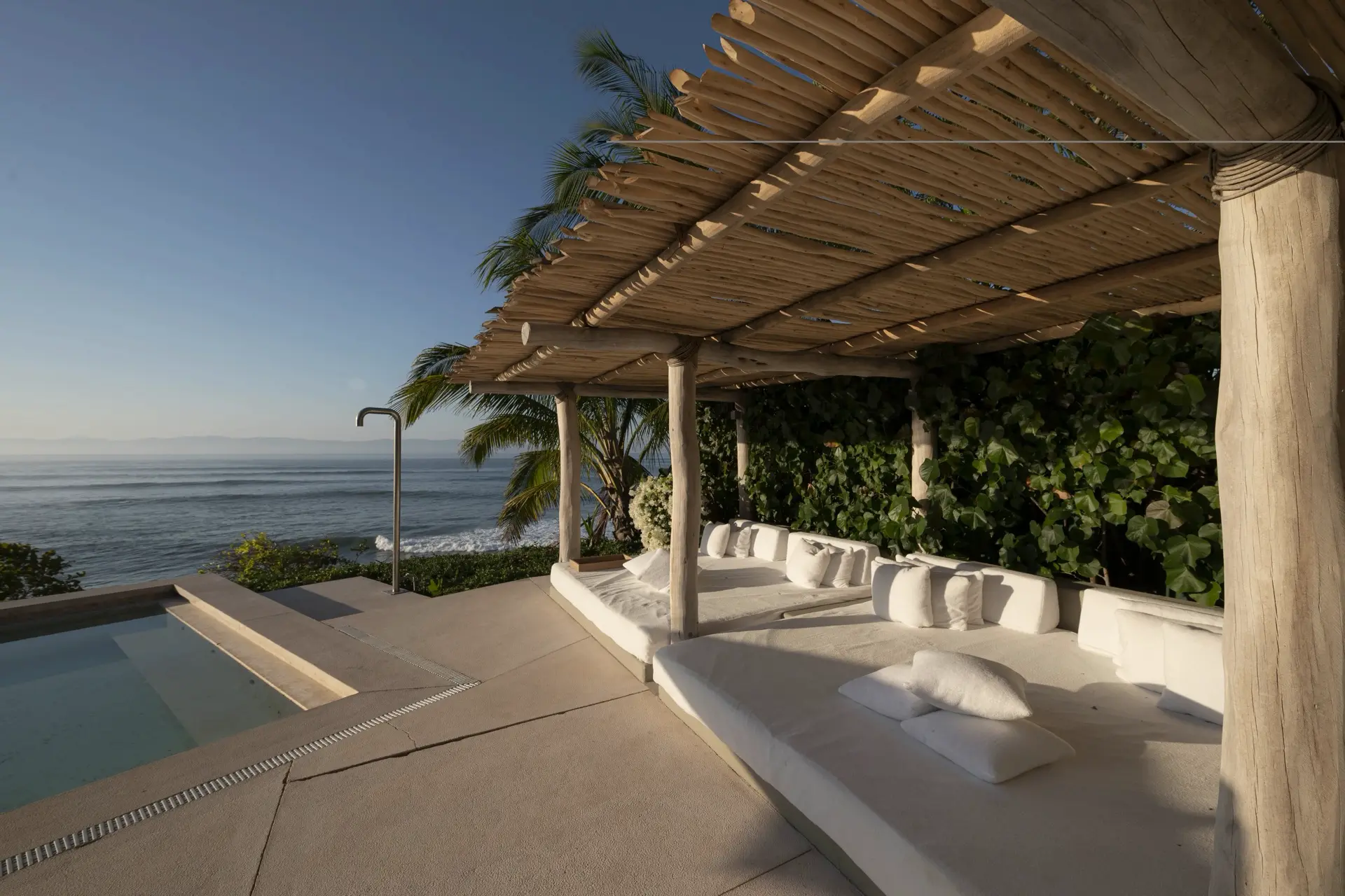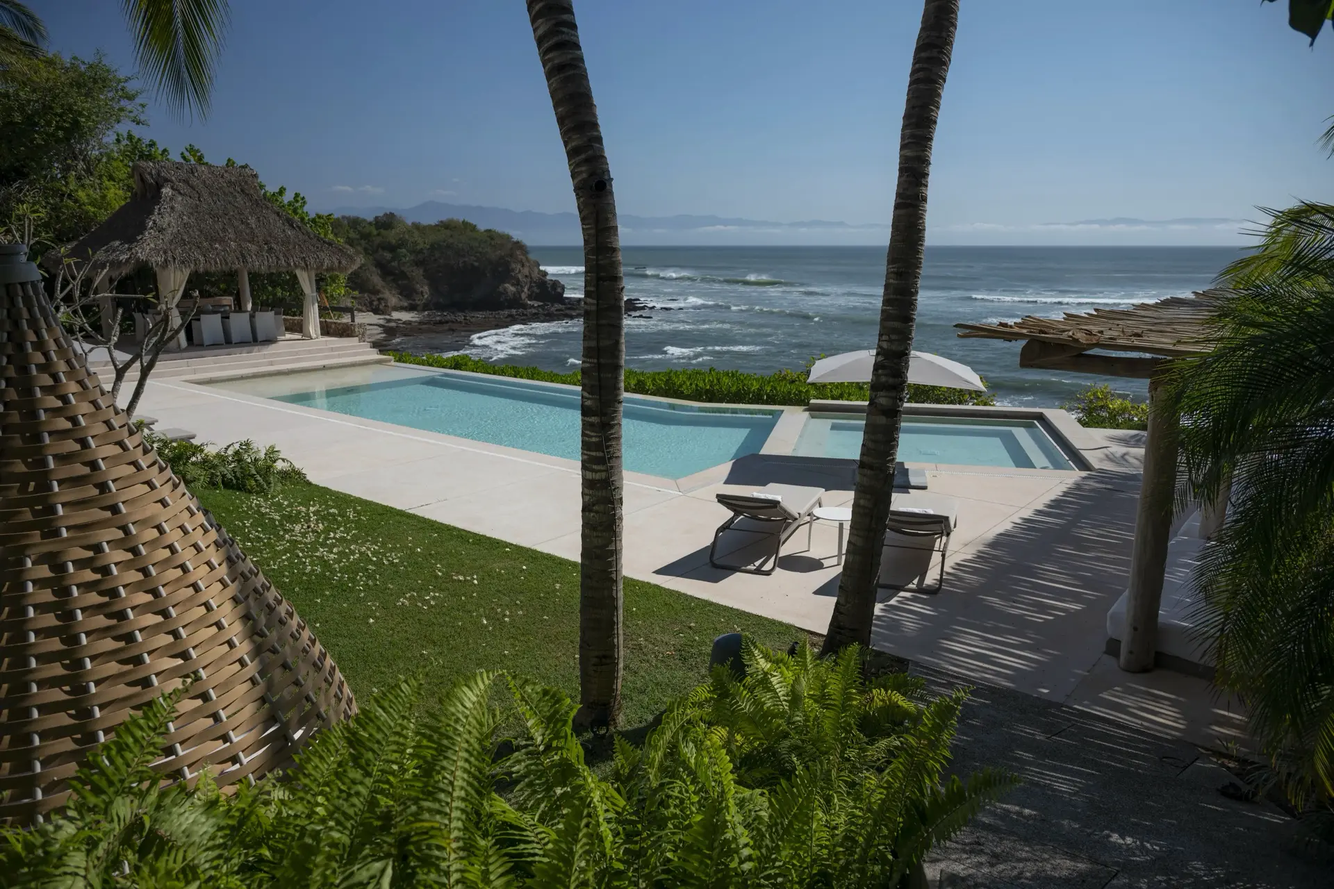 Inside, Casarena’s interiors are a study in contemporary coastal style. Expansive open-plan lounges are layered with oversized woven textures, whitewashed finishes, and deep, inviting sofas that invite lingering conversation or peaceful contemplation. The atmosphere is airy and uncluttered, with each space oriented toward the views and the gentle rhythm of the Pacific just beyond.