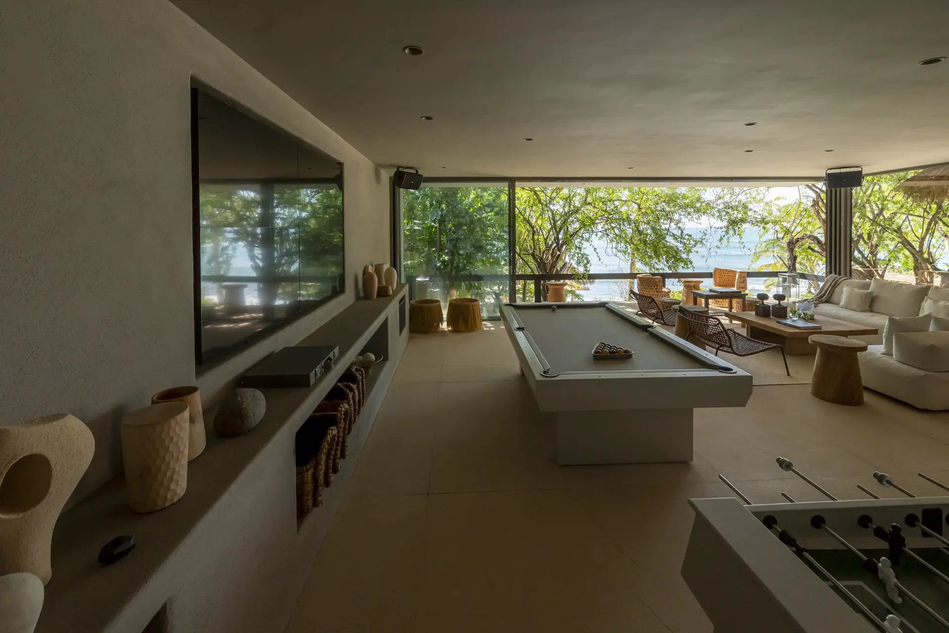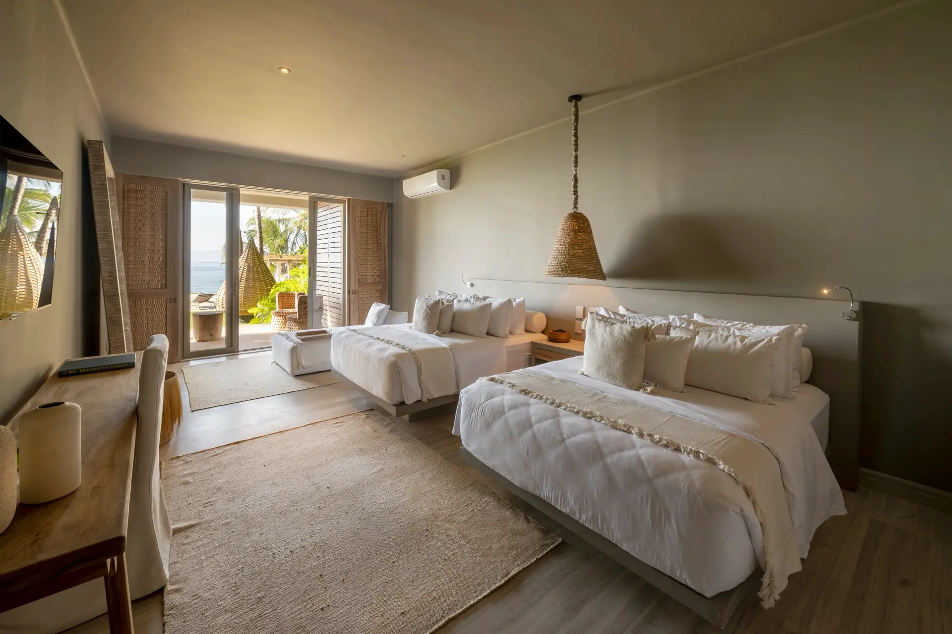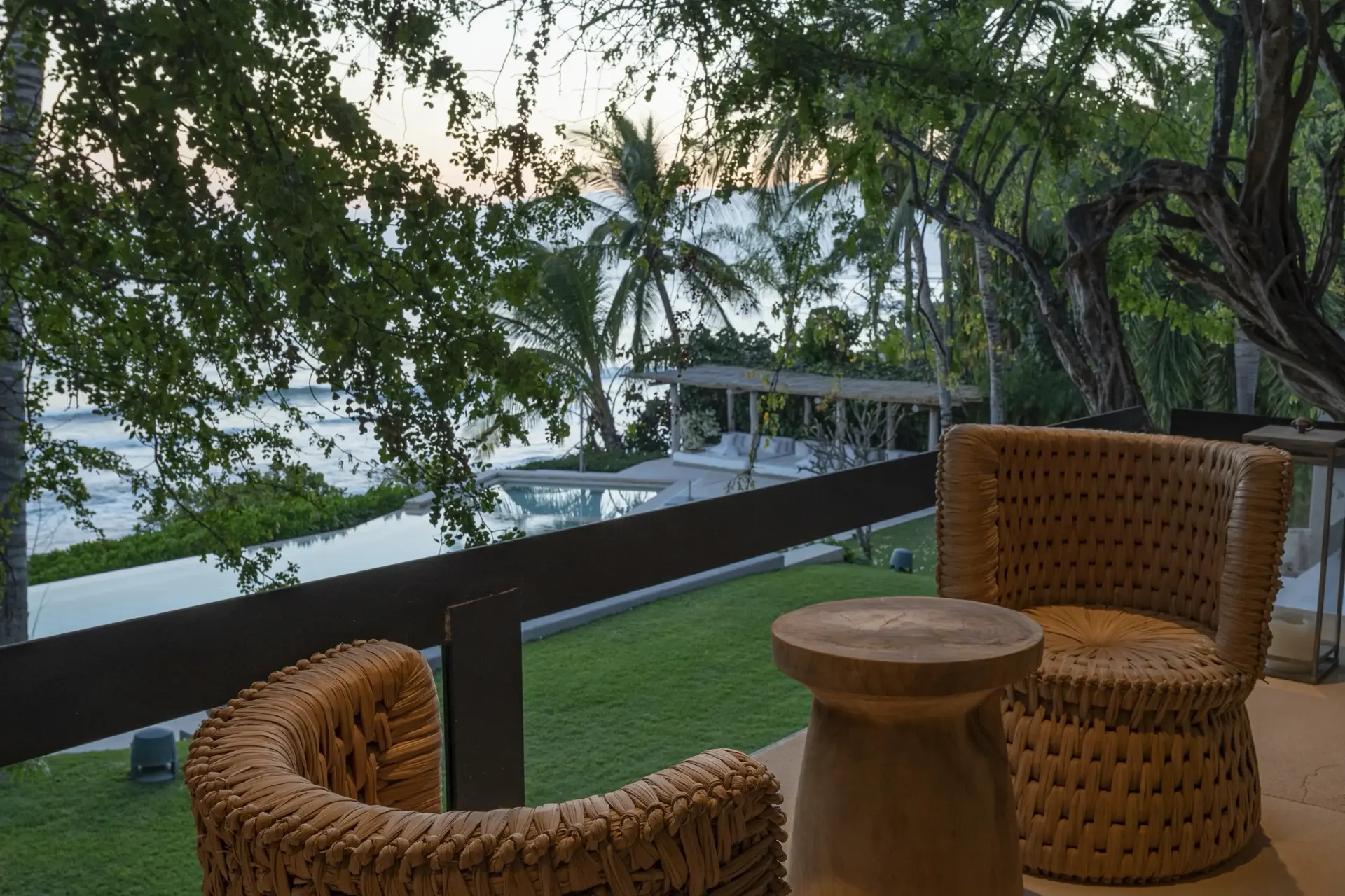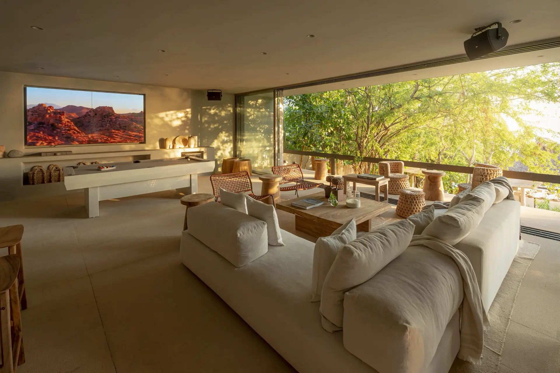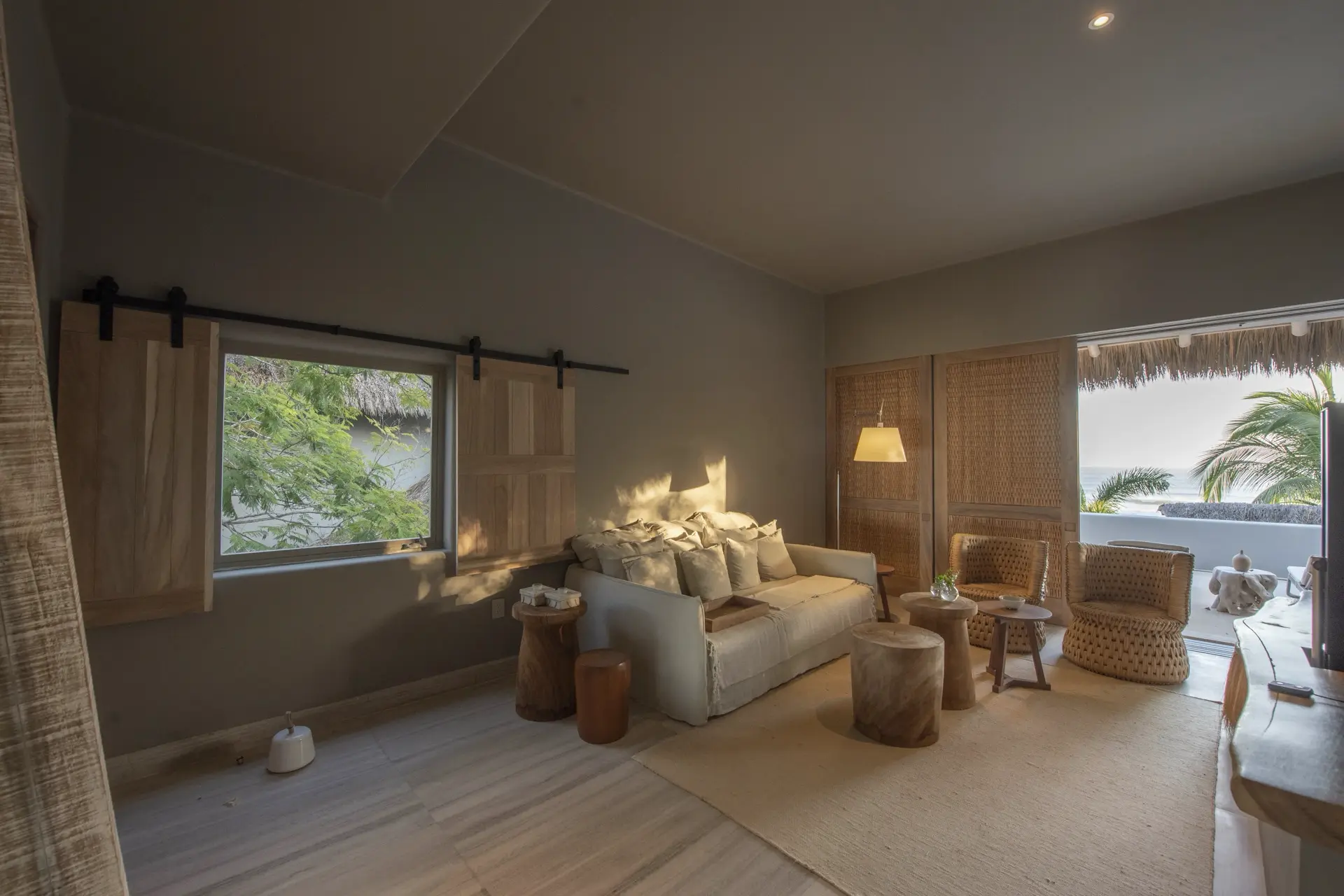 Inside, Casarena’s interiors are a study in contemporary coastal style. Expansive open-plan lounges are layered with oversized woven textures, whitewashed finishes, and deep, inviting sofas that invite lingering conversation or peaceful contemplation. The atmosphere is airy and uncluttered, with each space oriented toward the views and the gentle rhythm of the Pacific just beyond.
