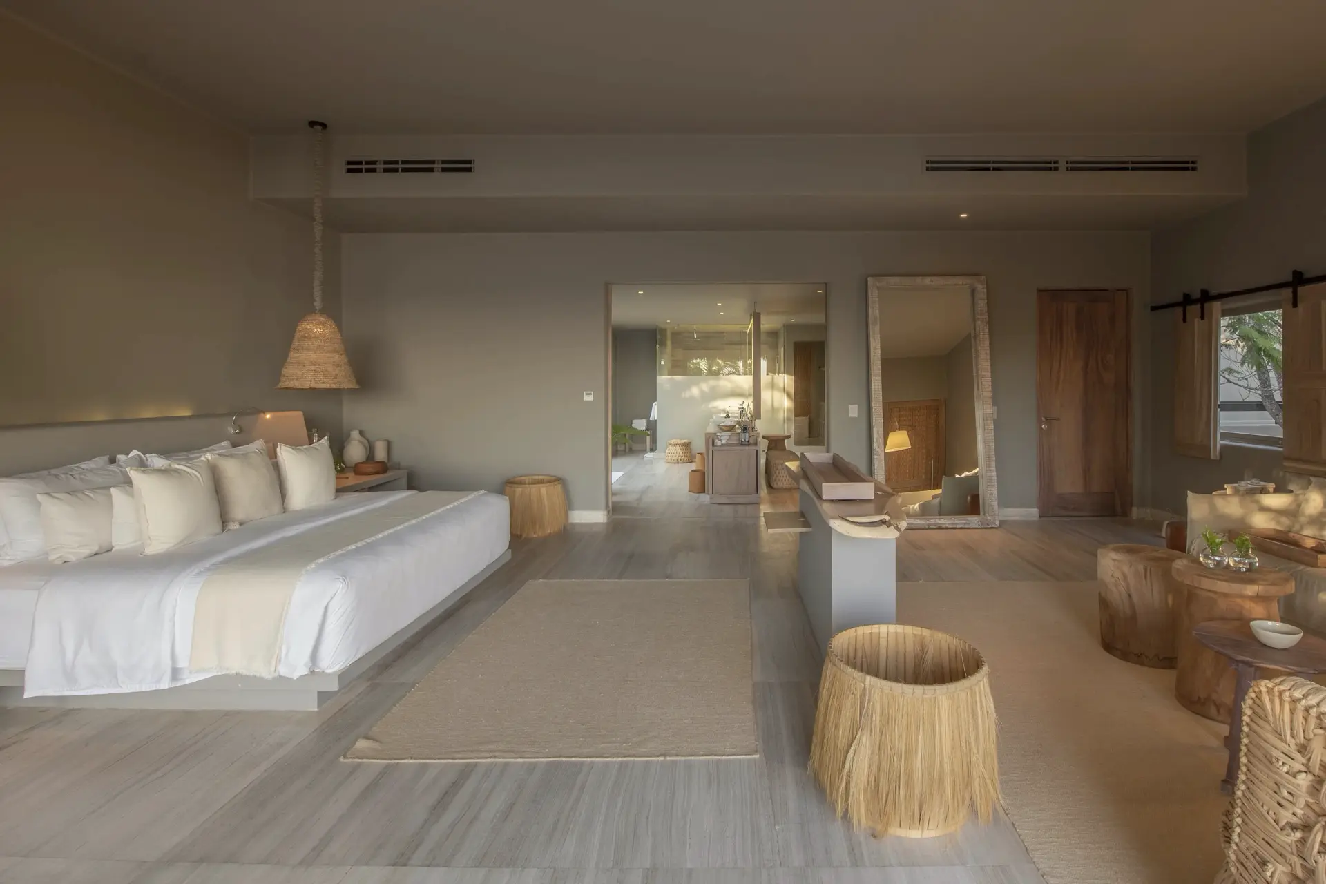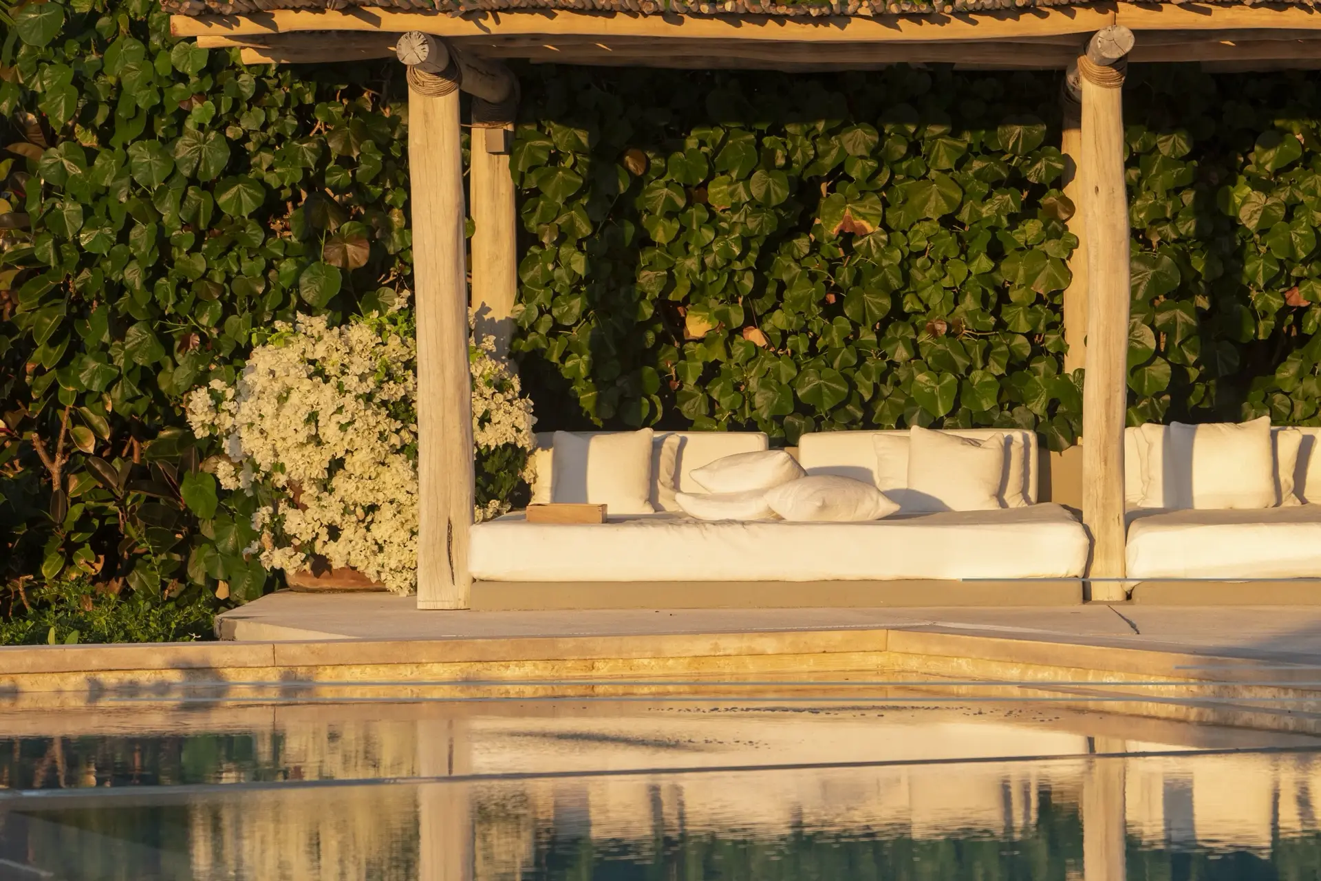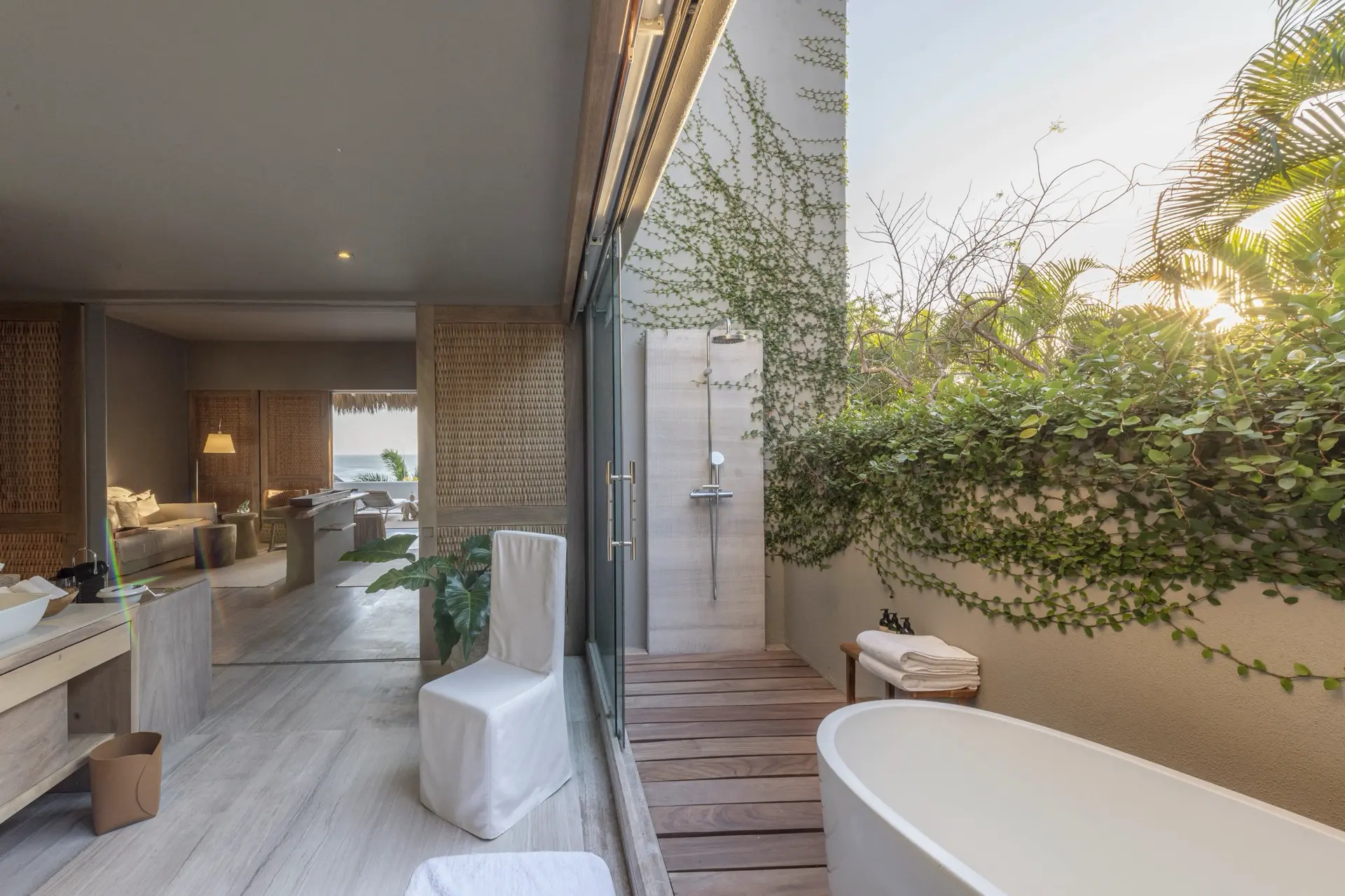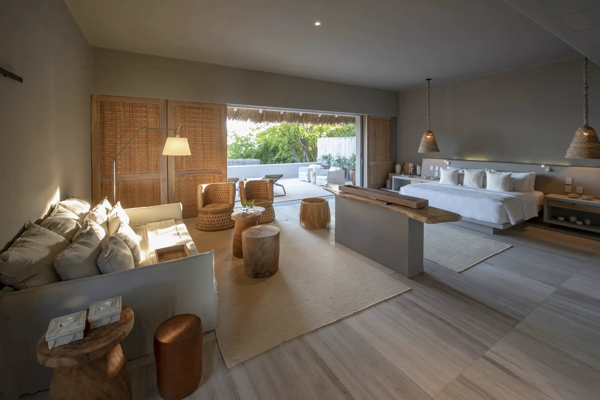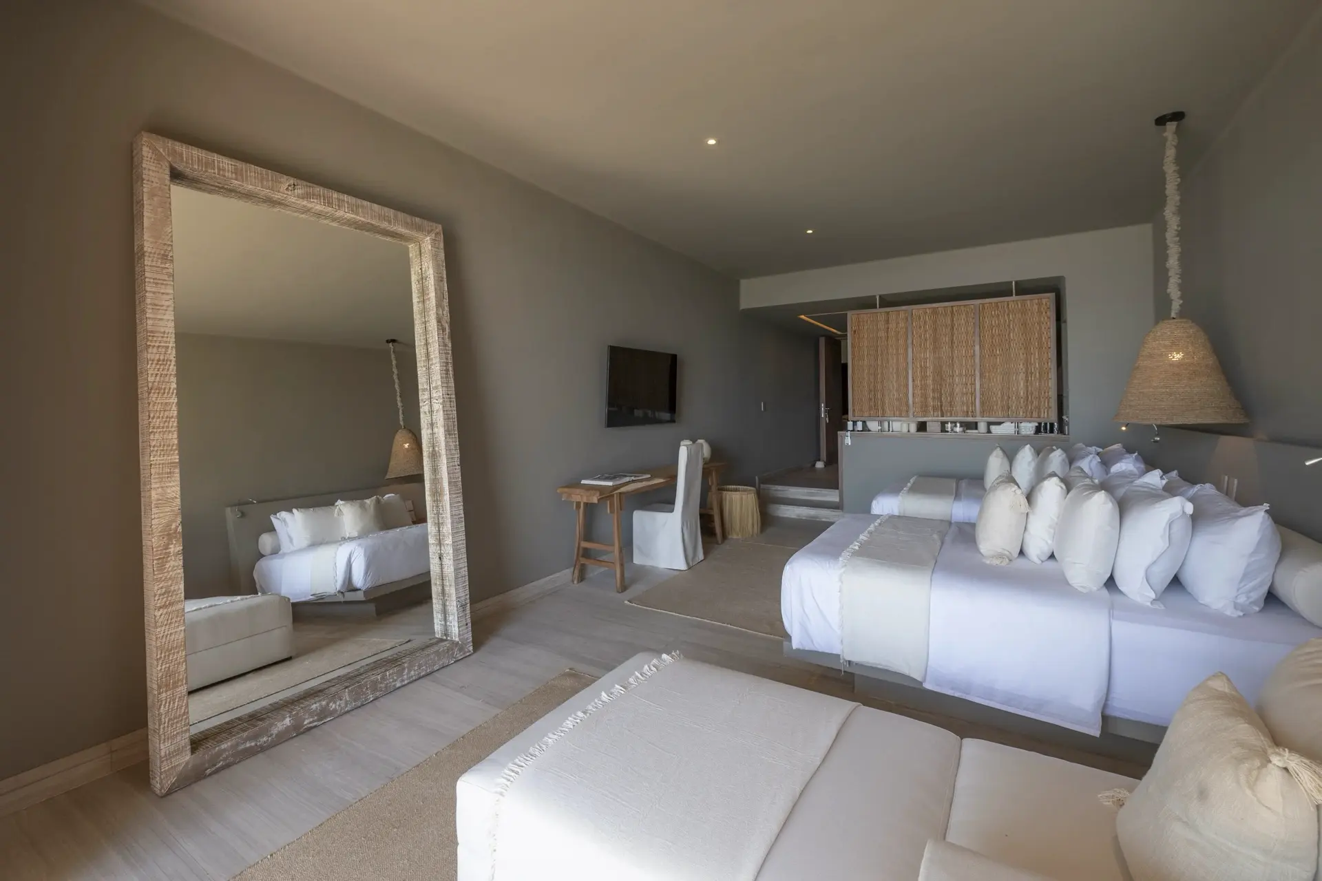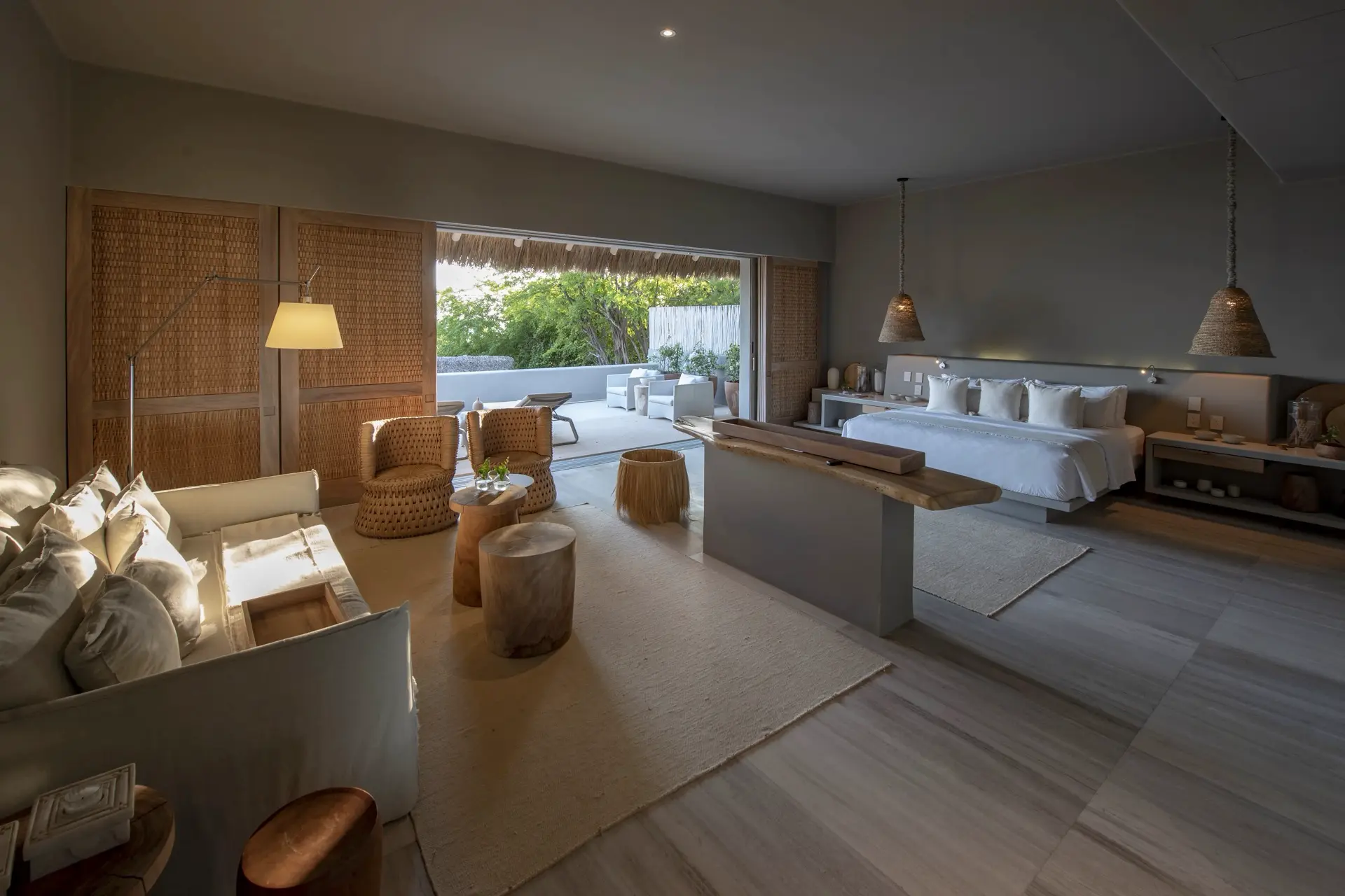 Inside, Casarena’s interiors are a study in contemporary coastal style. Expansive open-plan lounges are layered with oversized woven textures, whitewashed finishes, and deep, inviting sofas that invite lingering conversation or peaceful contemplation. The atmosphere is airy and uncluttered, with each space oriented toward the views and the gentle rhythm of the Pacific just beyond.
