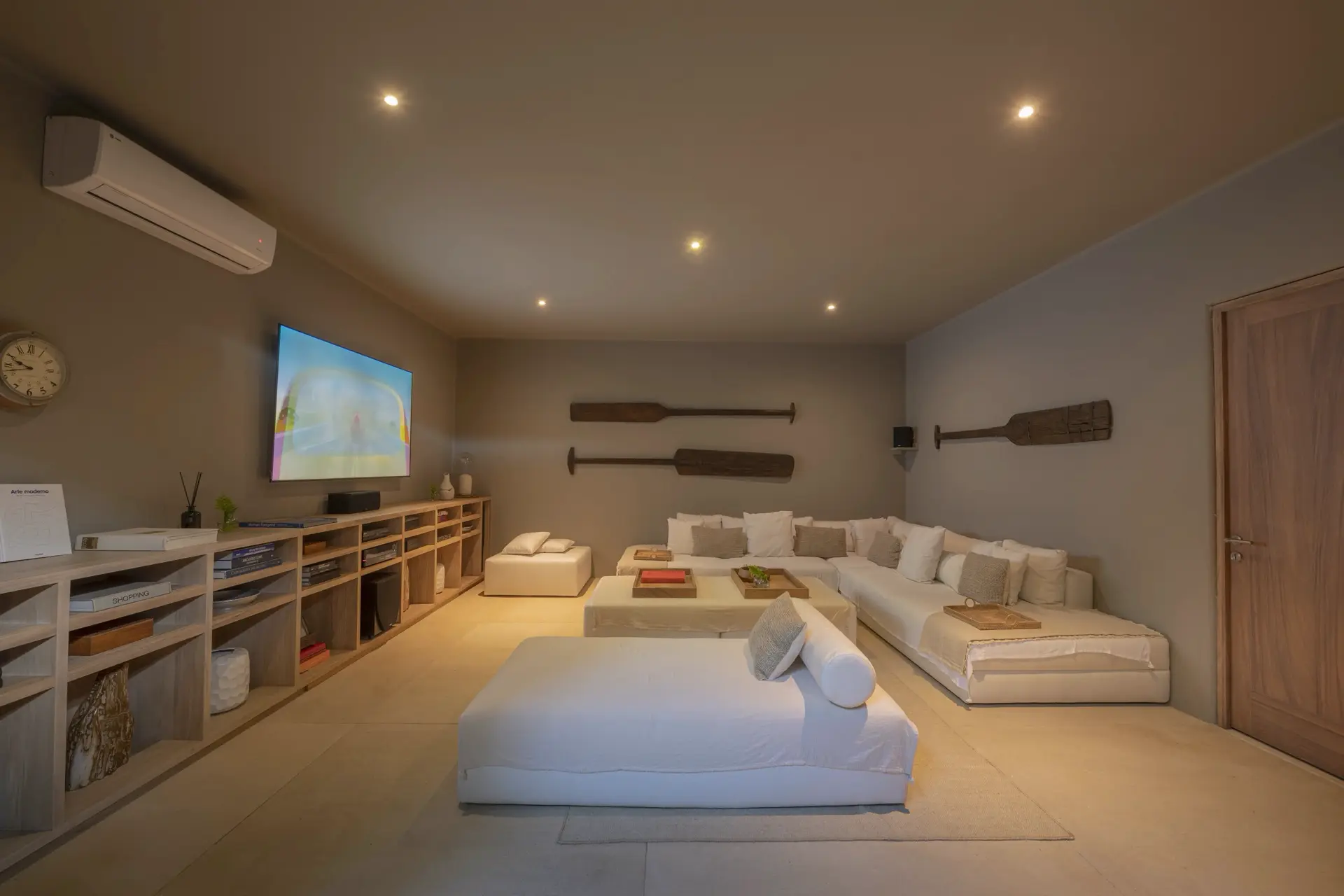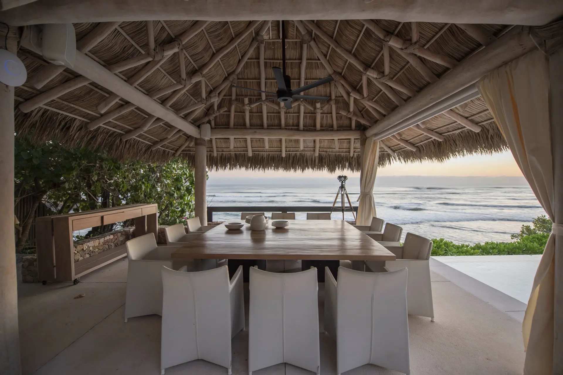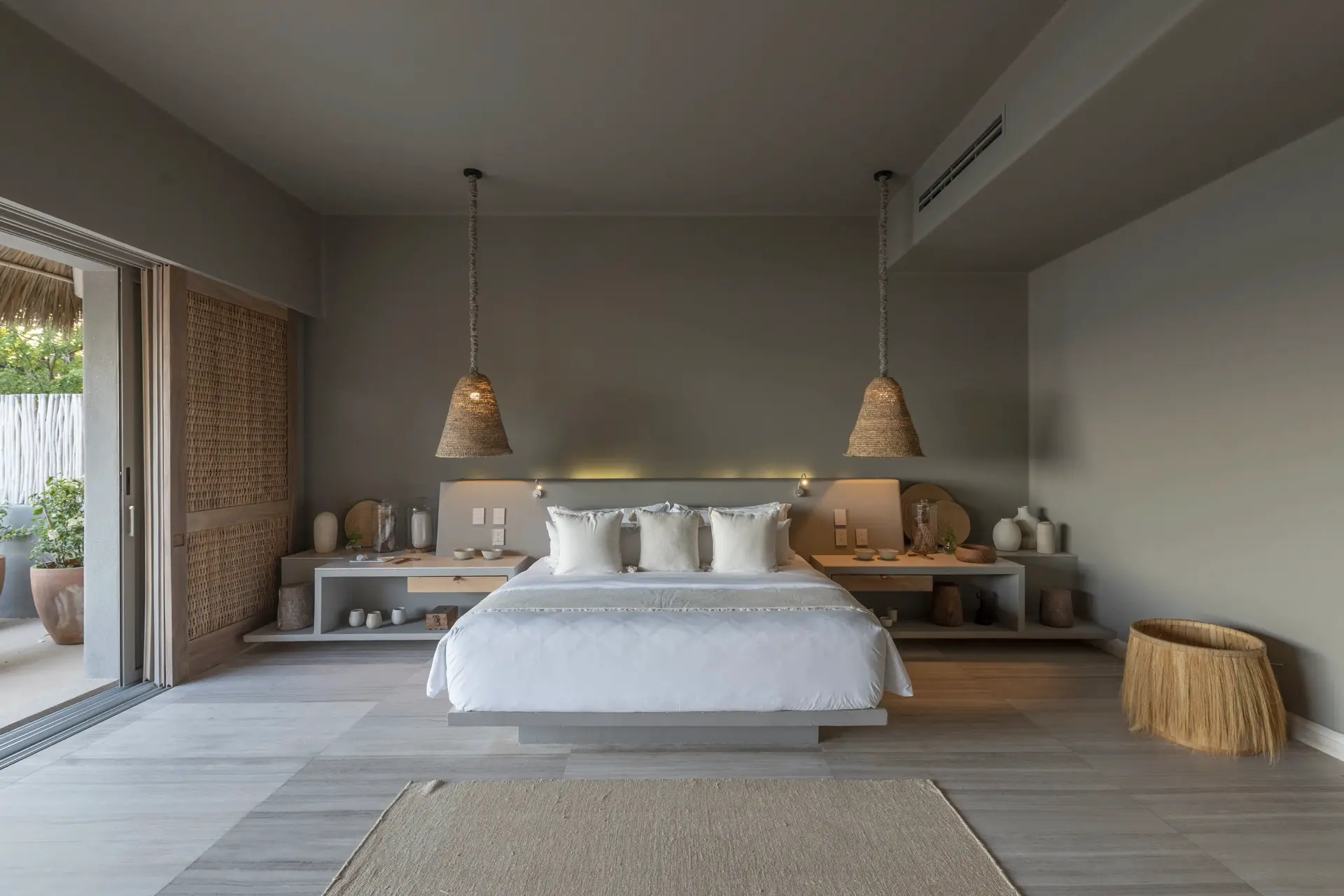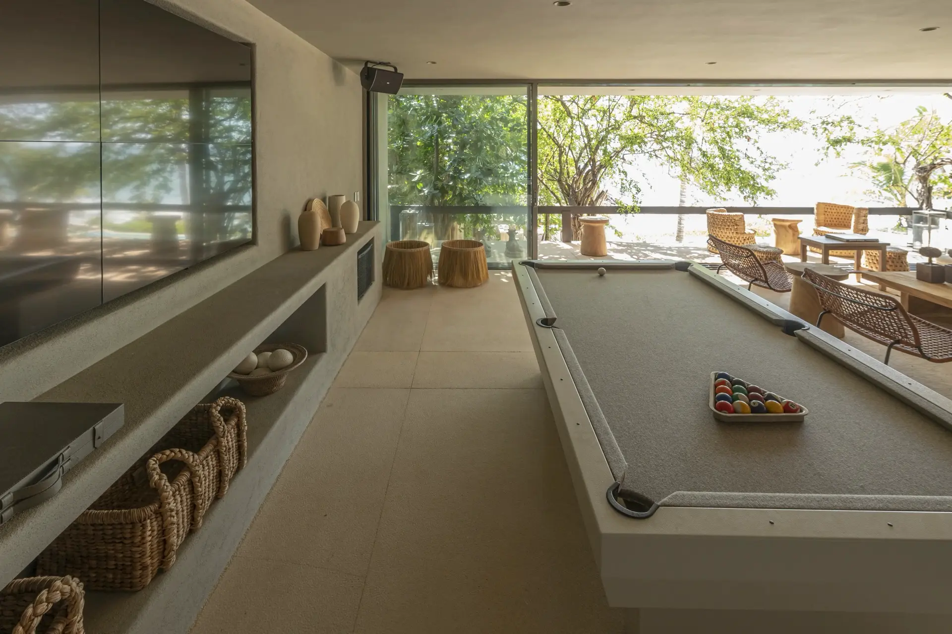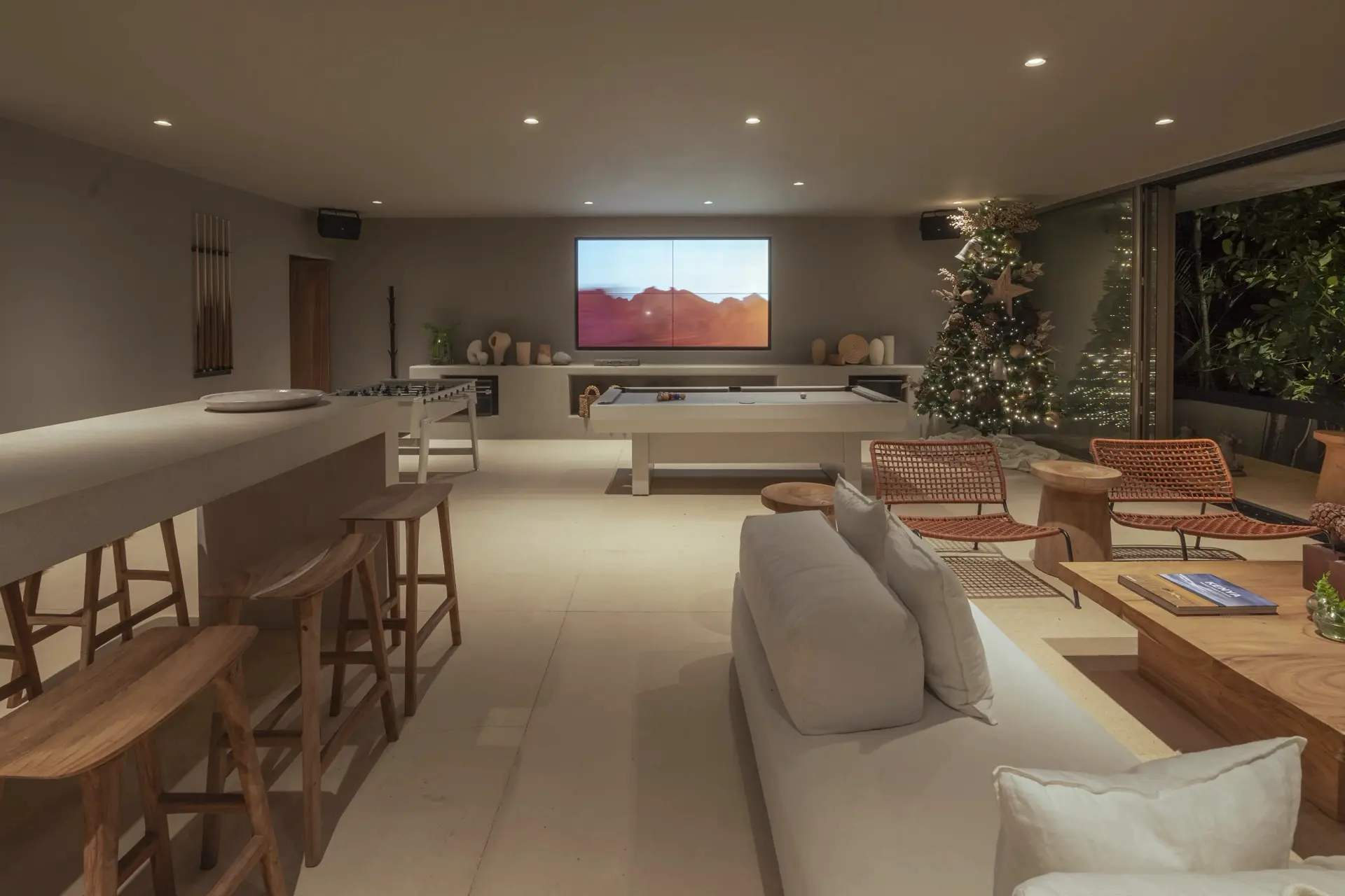 Inside, Casarena’s interiors are a study in contemporary coastal style. Expansive open-plan lounges are layered with oversized woven textures, whitewashed finishes, and deep, inviting sofas that invite lingering conversation or peaceful contemplation. The atmosphere is airy and uncluttered, with each space oriented toward the views and the gentle rhythm of the Pacific just beyond.