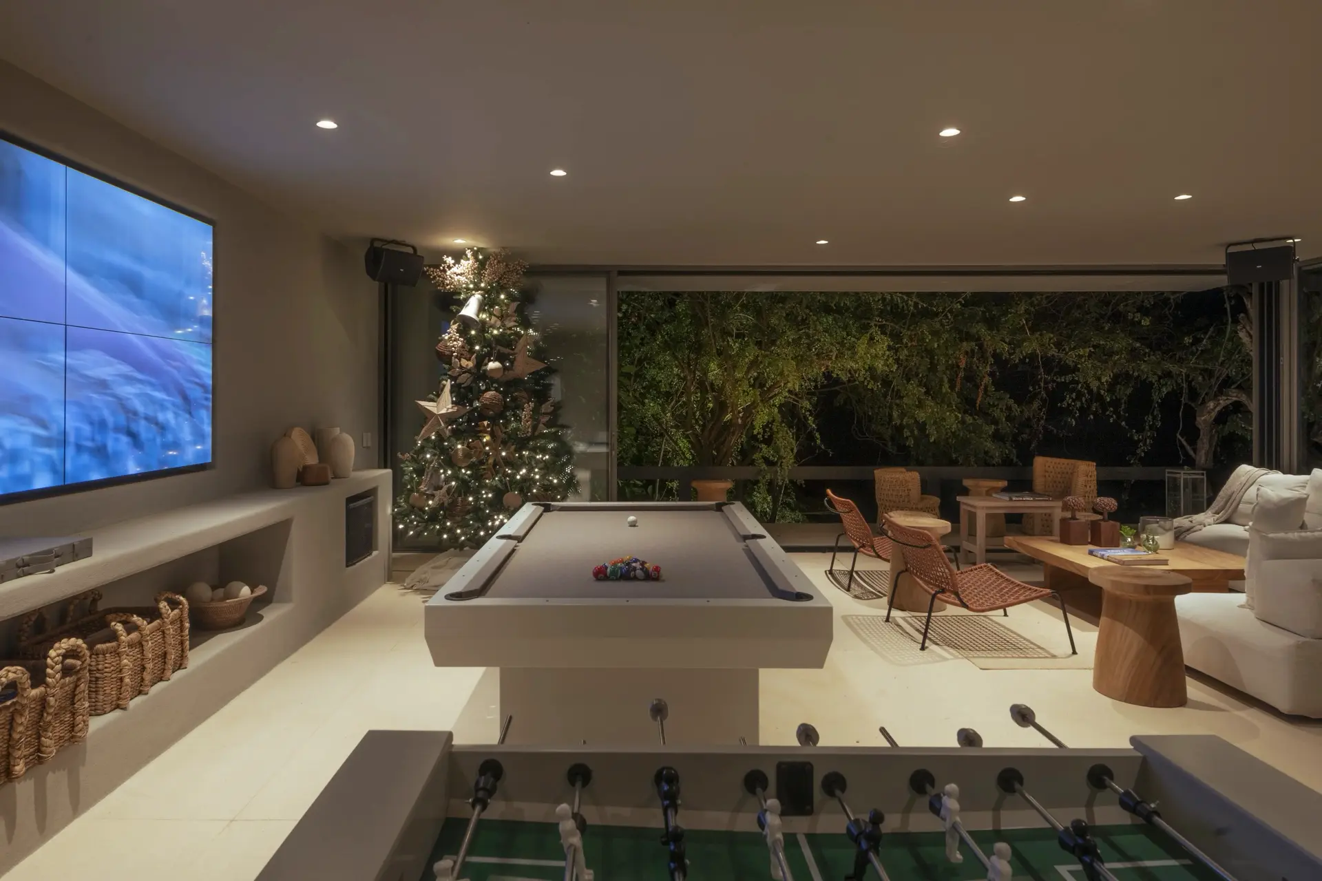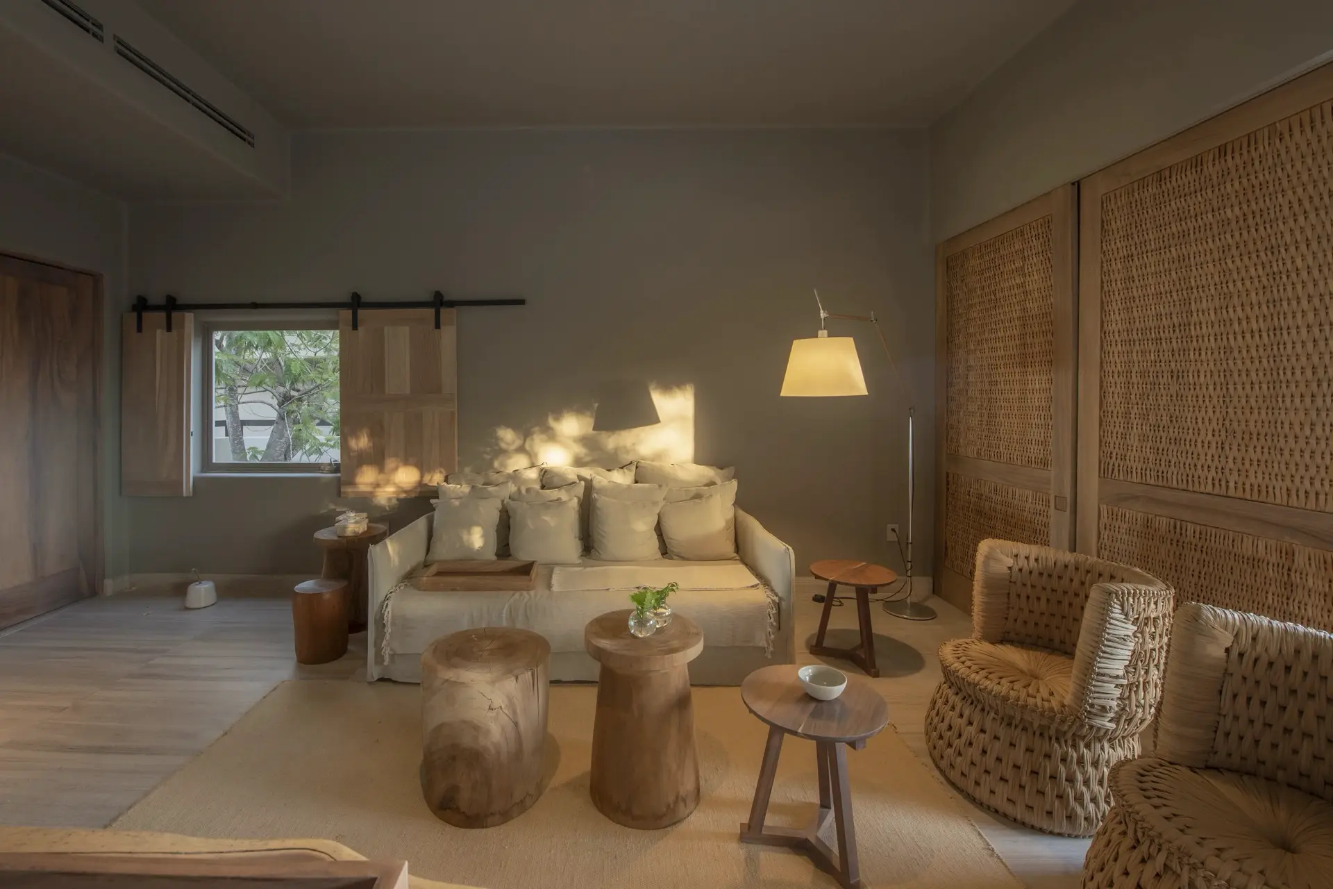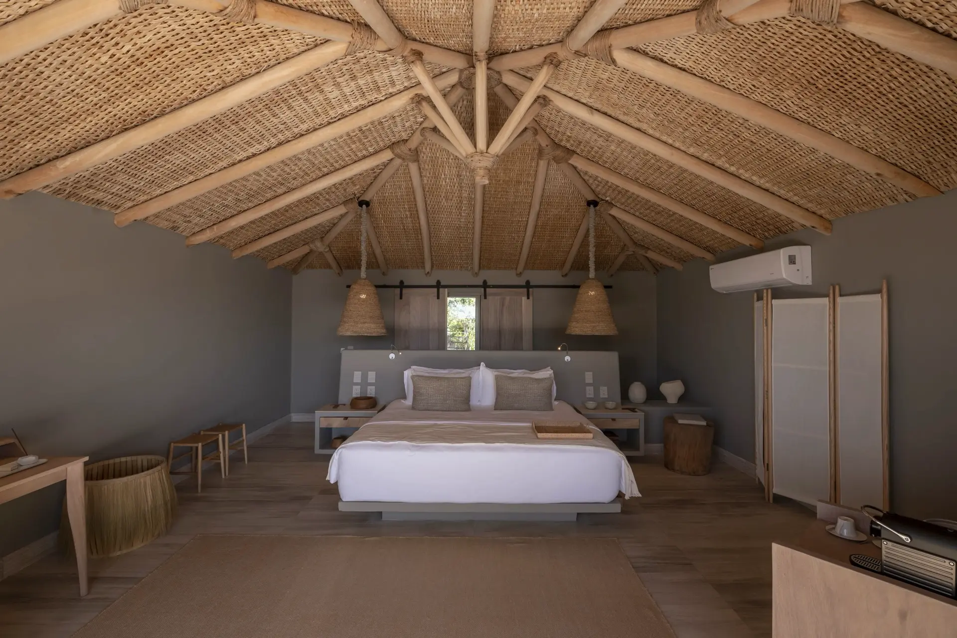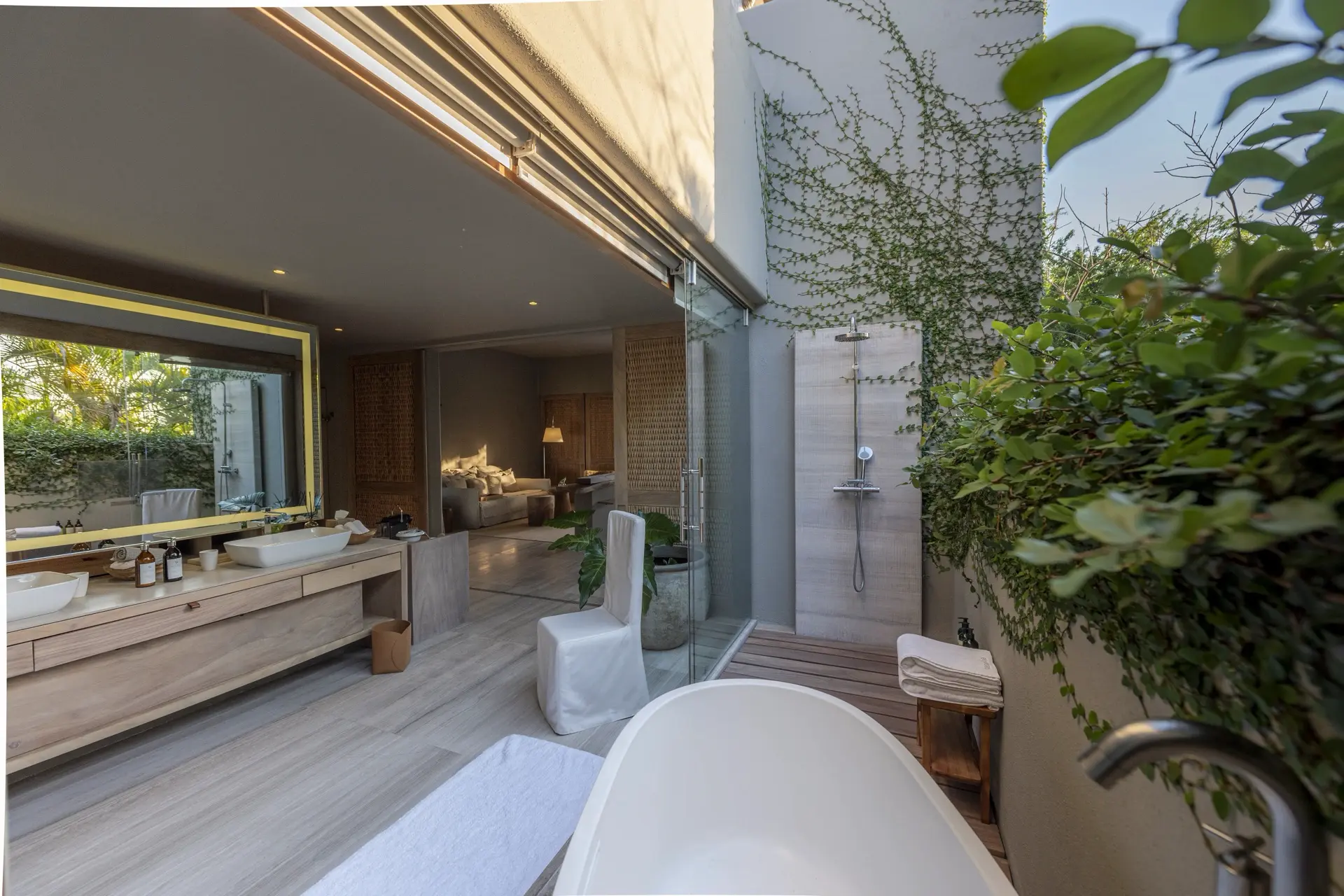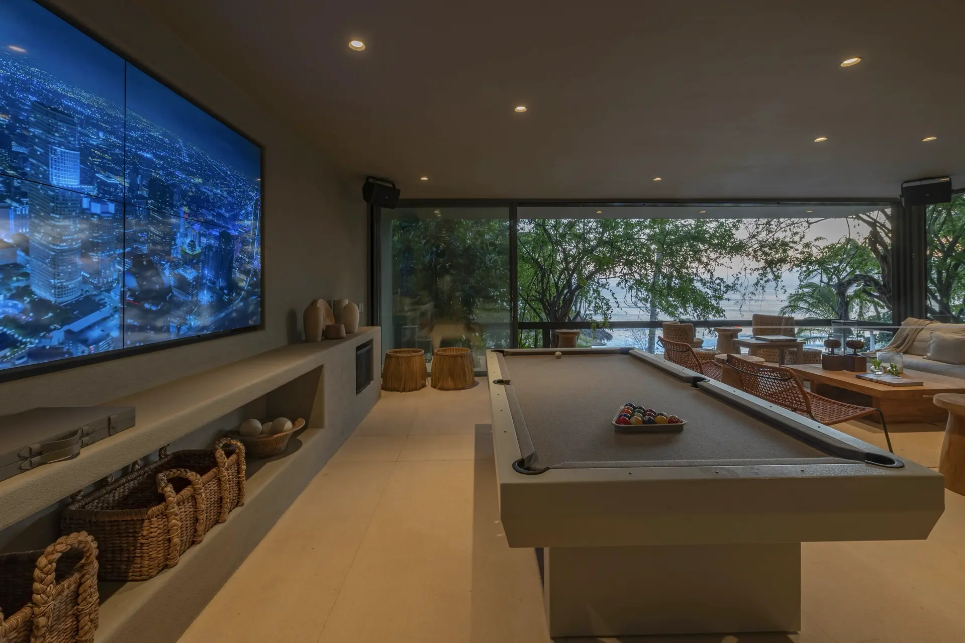 Inside, Casarena’s interiors are a study in contemporary coastal style. Expansive open-plan lounges are layered with oversized woven textures, whitewashed finishes, and deep, inviting sofas that invite lingering conversation or peaceful contemplation. The atmosphere is airy and uncluttered, with each space oriented toward the views and the gentle rhythm of the Pacific just beyond.