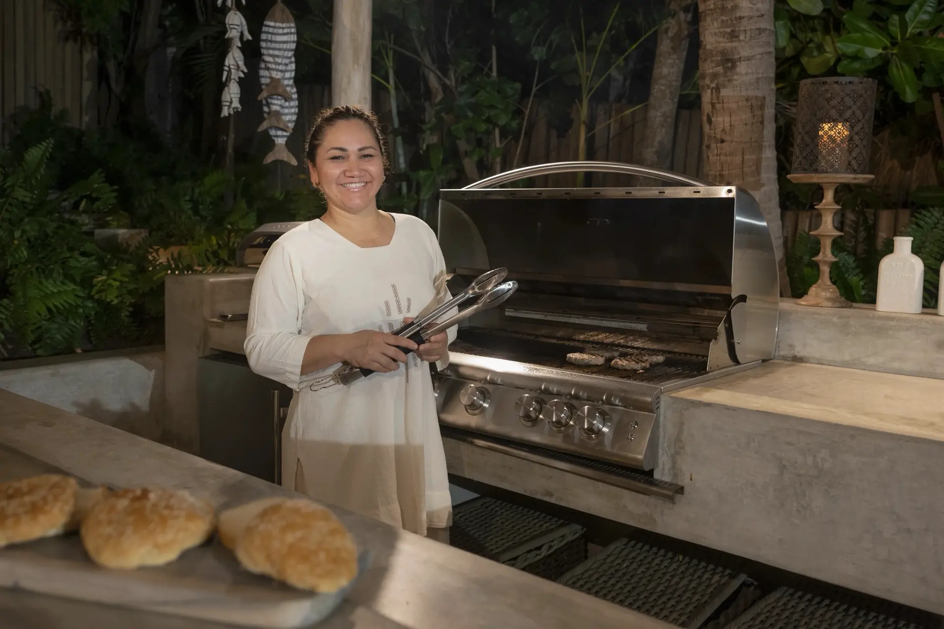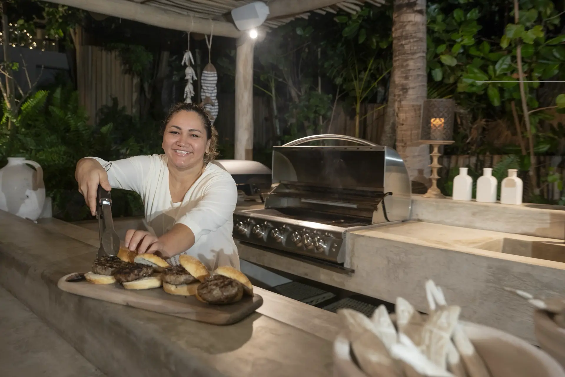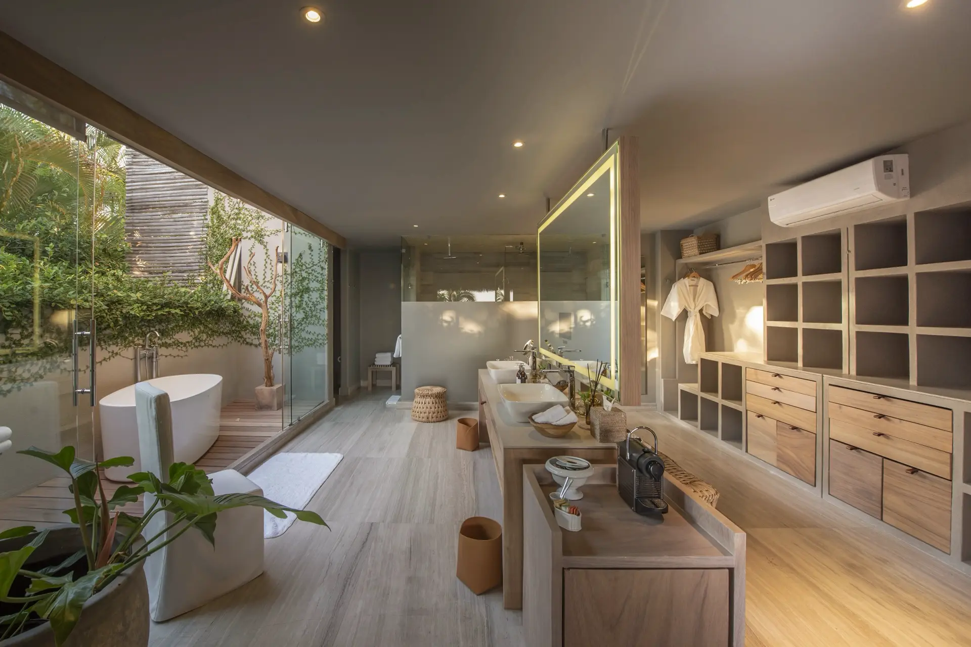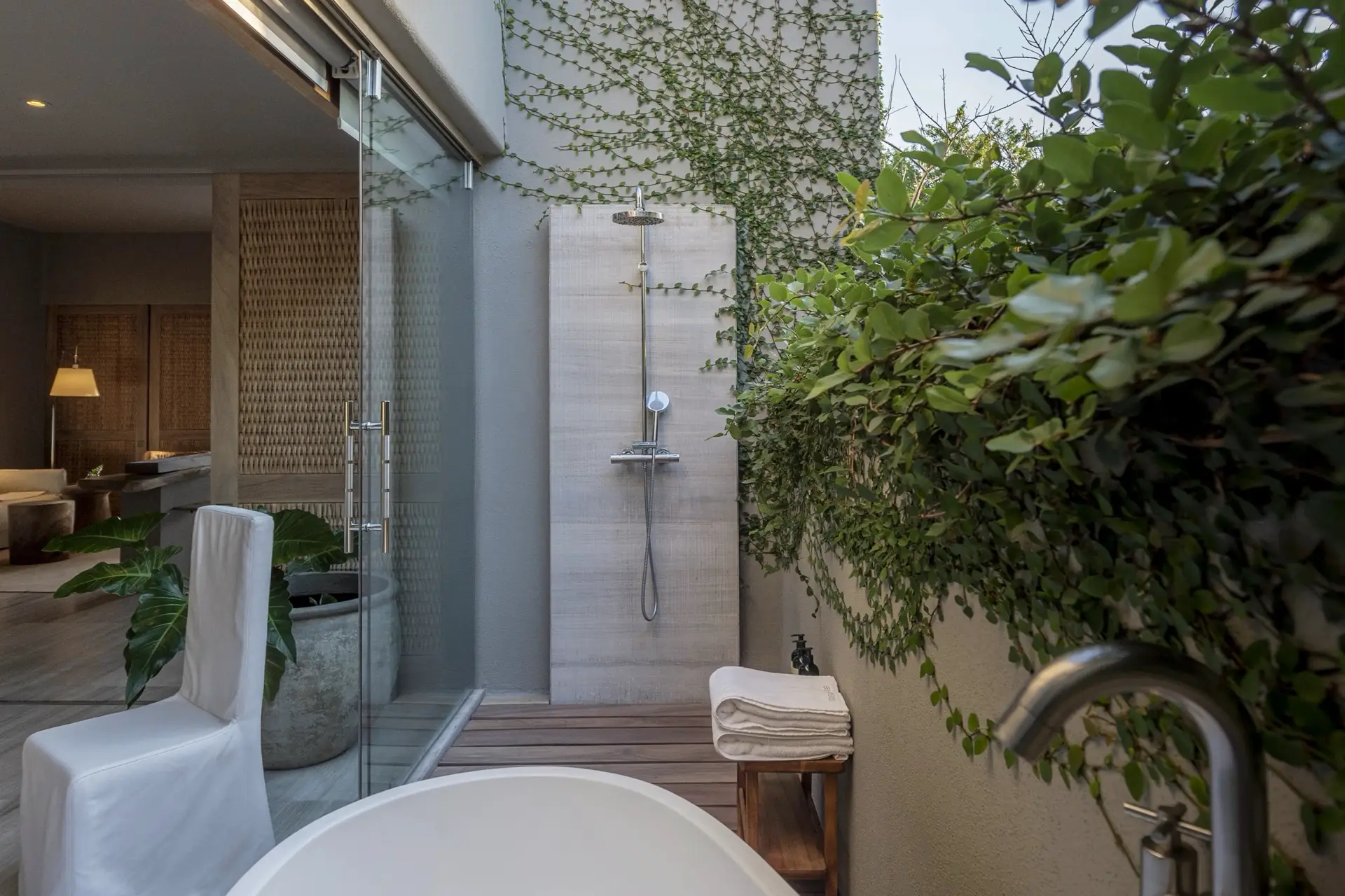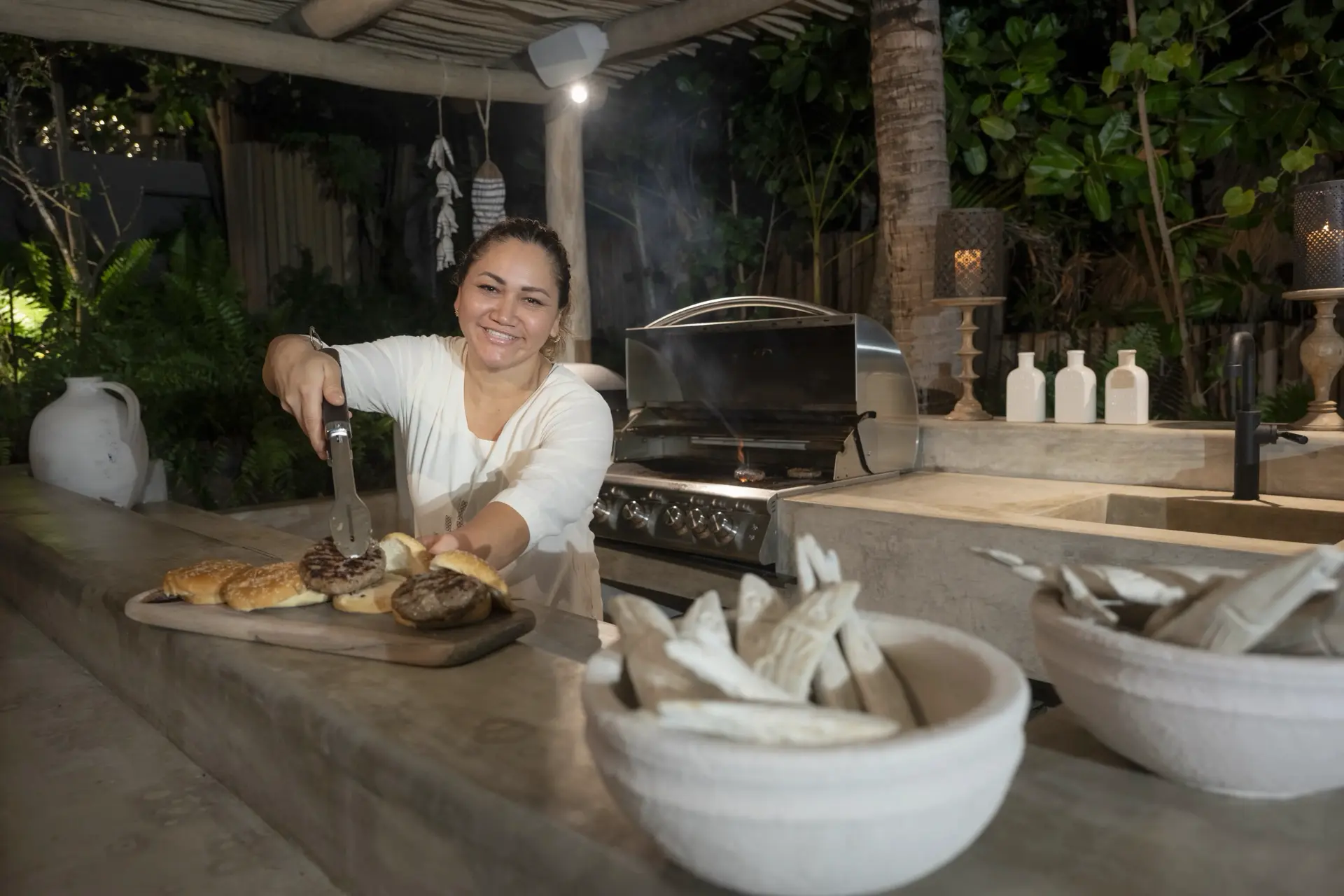 Inside, Casarena’s interiors are a study in contemporary coastal style. Expansive open-plan lounges are layered with oversized woven textures, whitewashed finishes, and deep, inviting sofas that invite lingering conversation or peaceful contemplation. The atmosphere is airy and uncluttered, with each space oriented toward the views and the gentle rhythm of the Pacific just beyond.