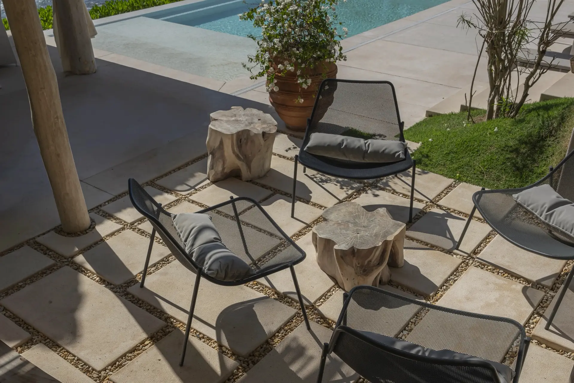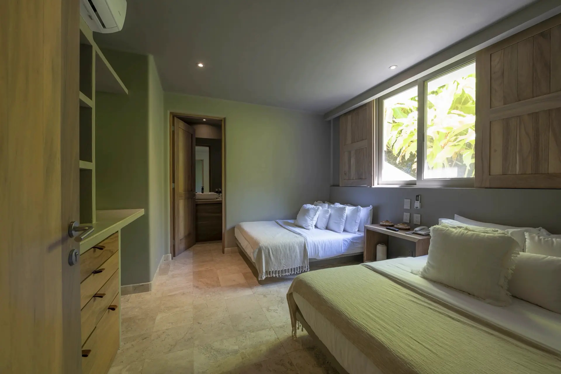 Casarena accommodates 12 to 14 guests across six spacious bedrooms, making it ideal for multi-generational families, couples traveling together, or a group of close friends. Three main suites feature king-size beds, private terraces, and sweeping ocean views that greet guests at sunrise. Two ground-floor bedrooms with double queen beds open directly onto lush gardens and the shimmering pool, creating an easy indoor-outdoor flow. A sixth standard queen room on the main floor offers serene comfort and flexibility within the overall layout. Thoughtfully designed common areas foster togetherness, while the bedroom configuration ensures everyone has their own private retreat.