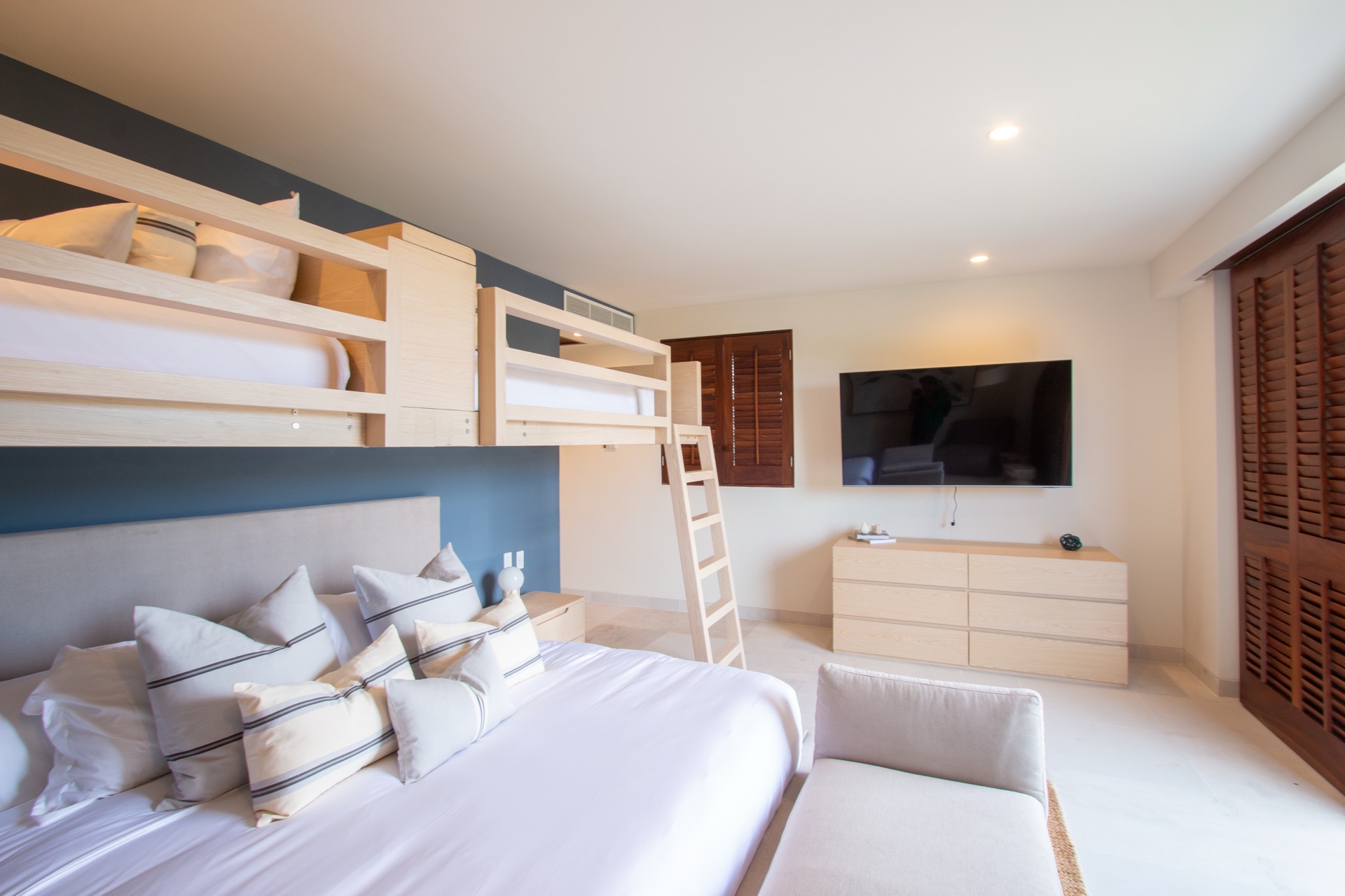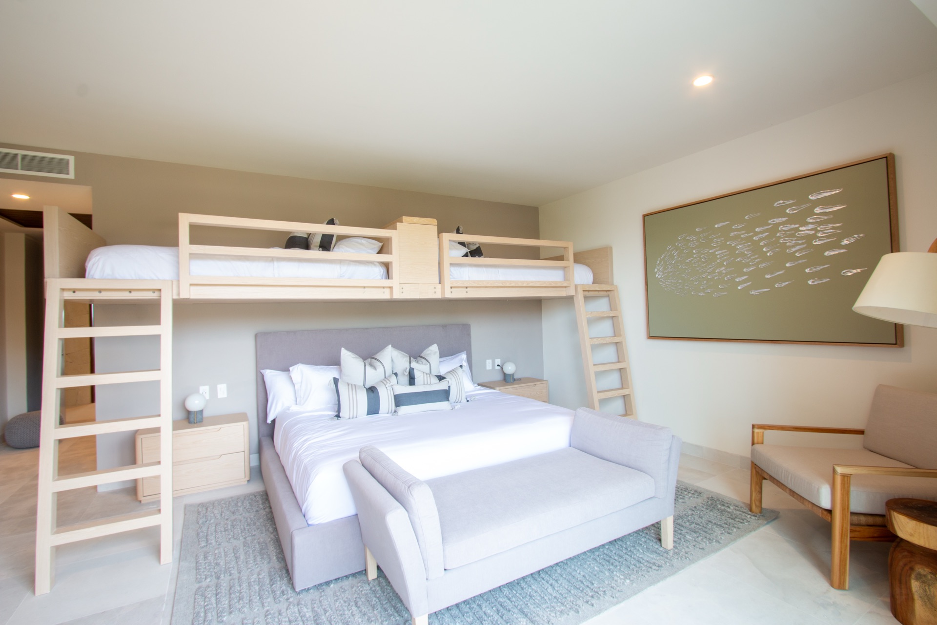 The residence accommodates up to twelve guests across four generously proportioned bedrooms, each with its own full ensuite bathroom. The master suite features a king-size bed, walk-in closet, private terrace, and ensuite bathroom with bathtub. The second bedroom offers two queen-size beds with walk-in closet, terrace, and bathtub ensuite. The third and fourth bedrooms each provide a king-size bed paired with a twin bunk bed, perfect for families traveling with children, and both open onto private terraces with views of the resort grounds. Every room is fitted with air conditioning, ceiling fans, room-darkening shades, and accessible-height beds for added comfort.