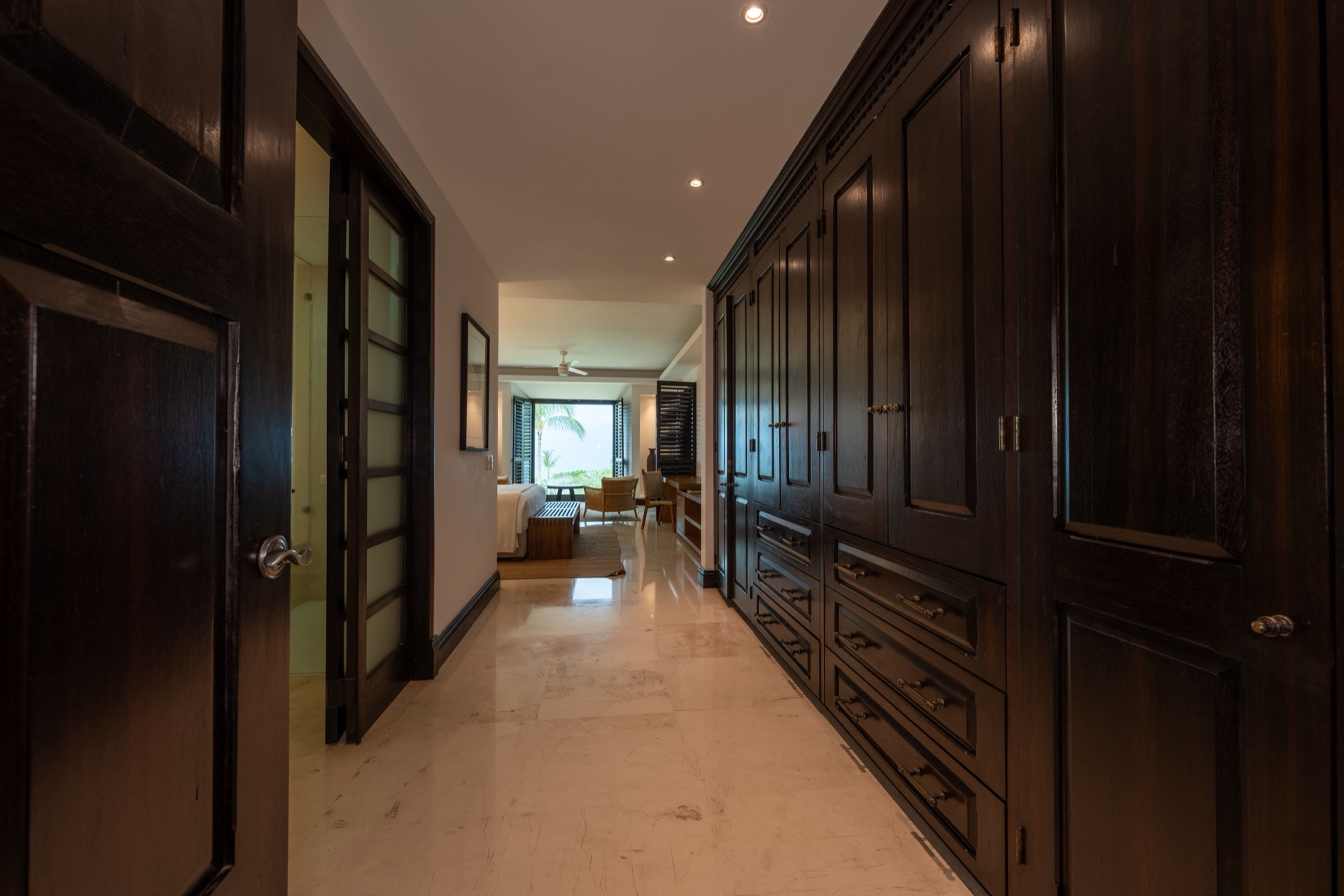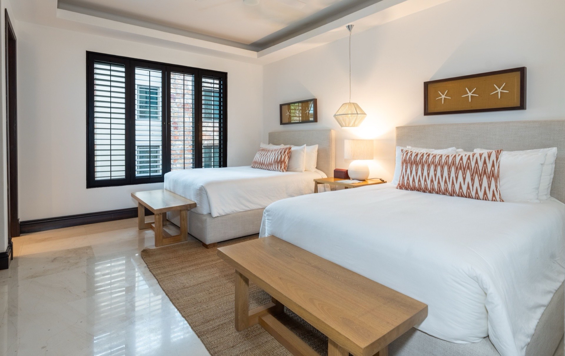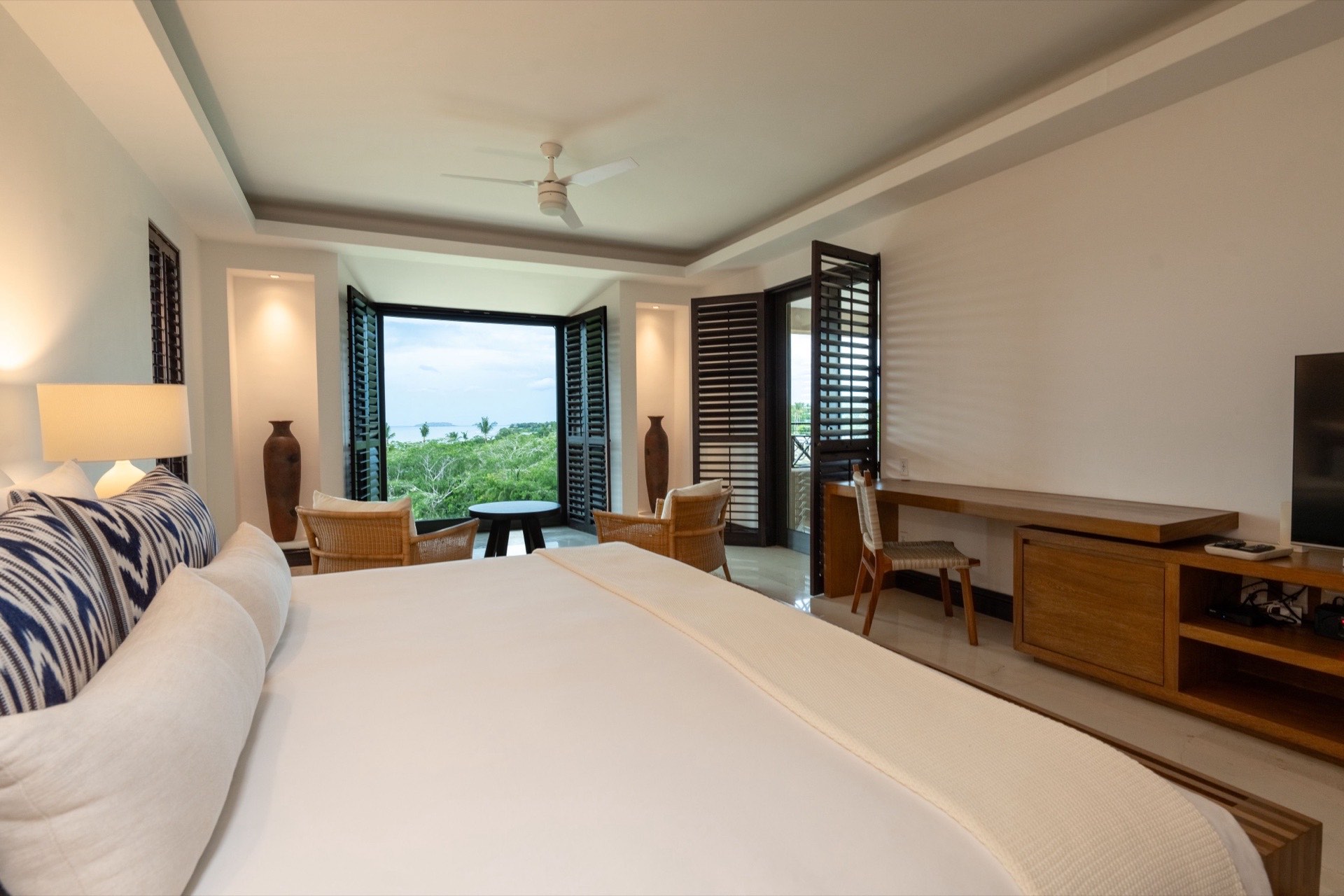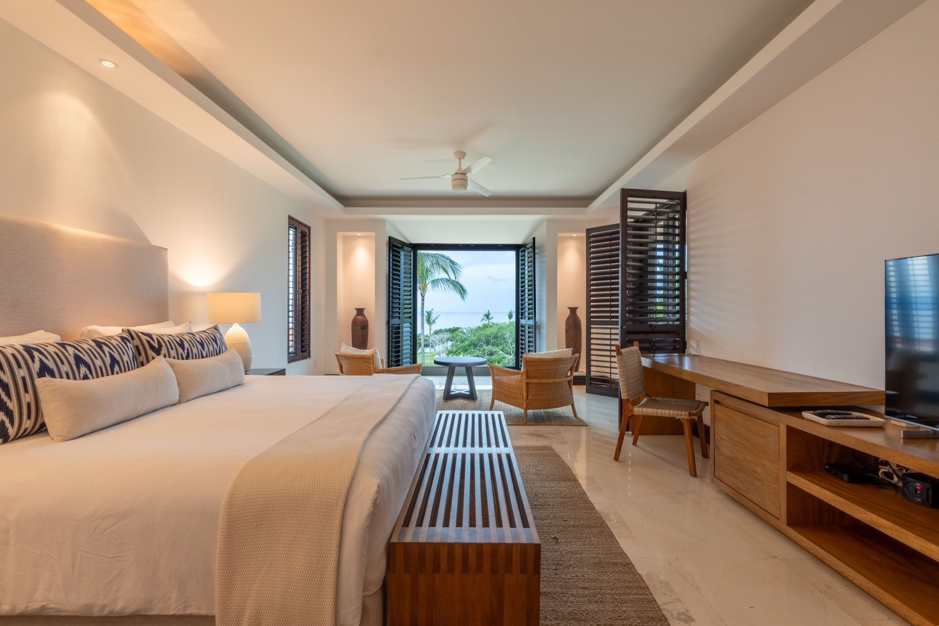 The master bedroom features a king-size bed with a private ensuite bathroom equipped with a Jacuzzi tub and bathtub, plus an in-room safe — a truly indulgent retreat. The second bedroom offers a king-size bed with its own private ensuite bathroom, while the third bedroom provides two queen-size beds with an ensuite bathroom. A service room with a single bunk bed is available and recommended for staff or a nanny, making this an especially practical choice for families. All rooms feature air conditioning, and the residence includes daily housekeeping, breakfast preparation with groceries at your own cost, a six-passenger golf cart, and dedicated concierge service.