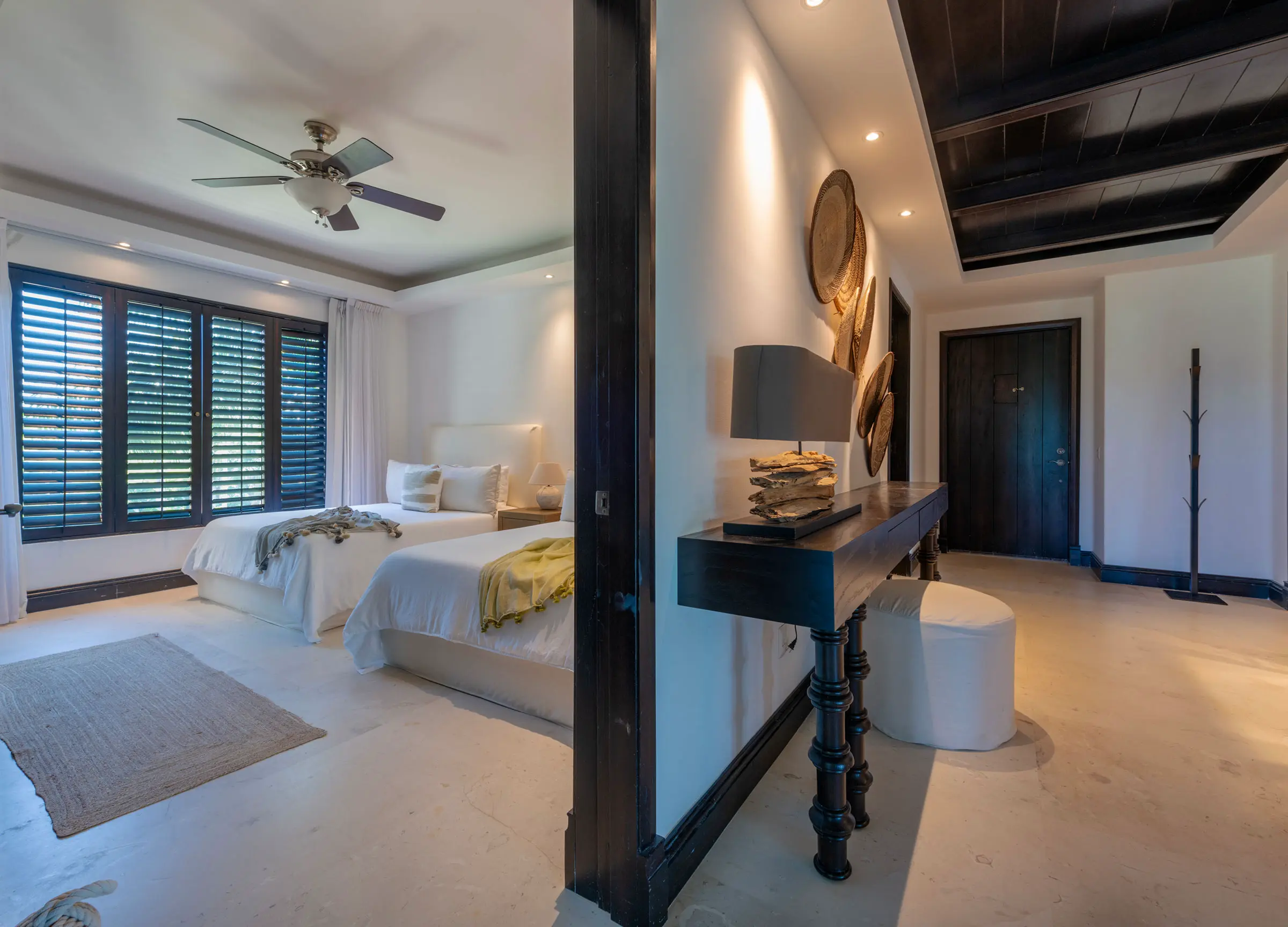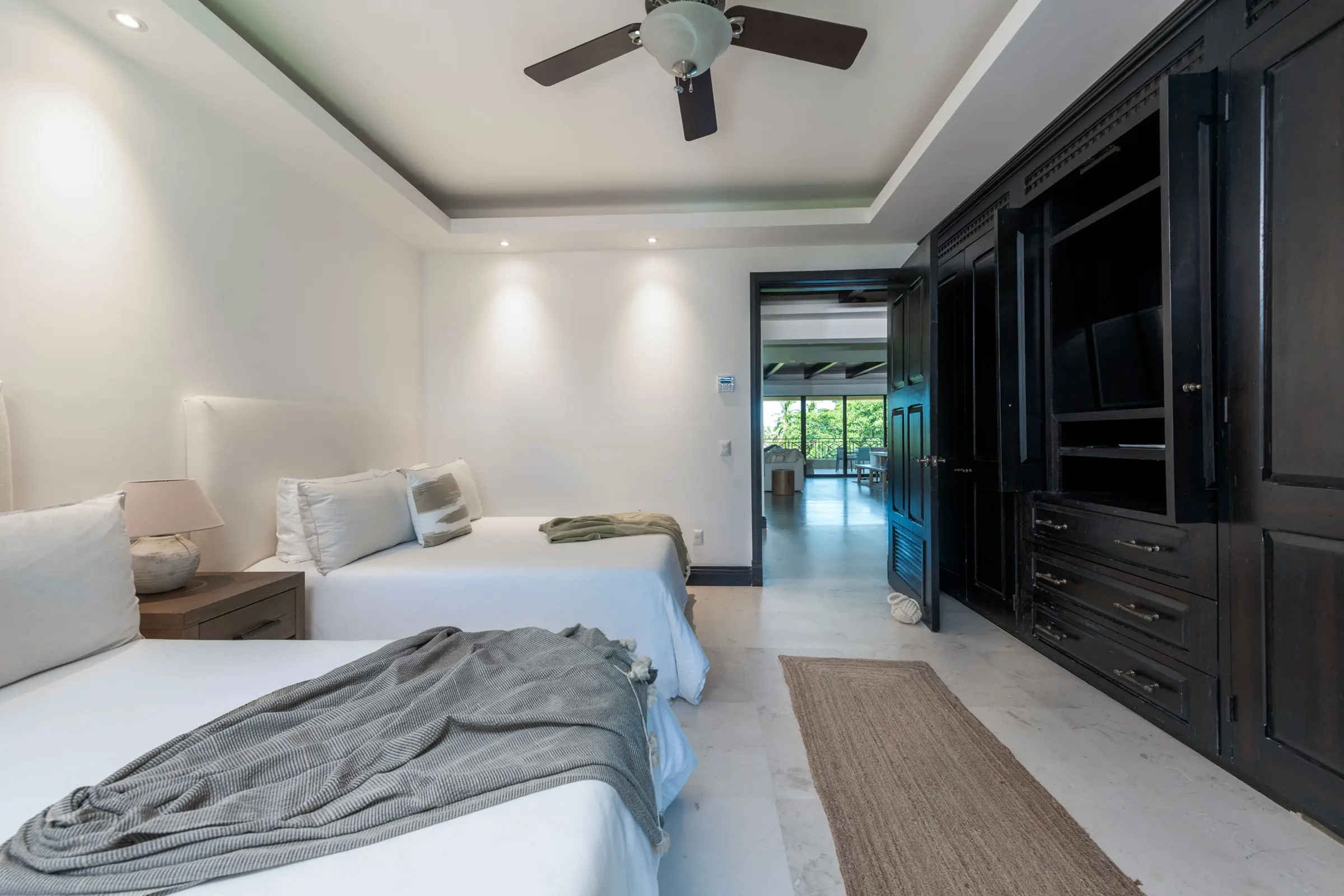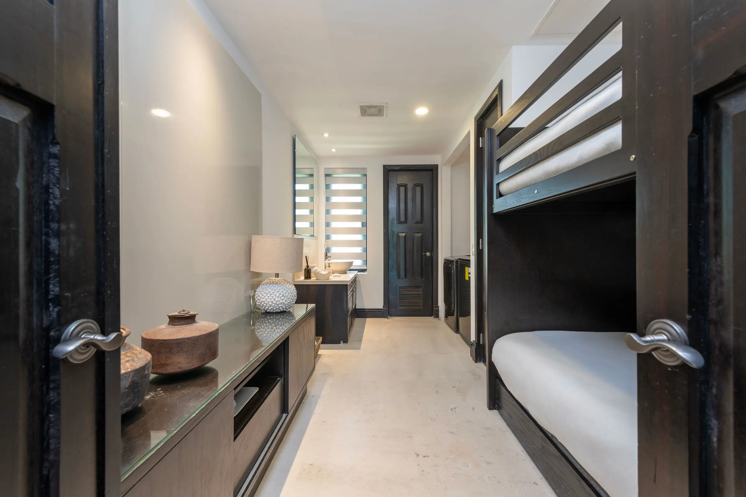 Each of HDM 903’s four bedrooms is thoughtfully designed for restful slumber and morning light. The two master suites feature plush king-size beds, spa-inspired en-suite bathrooms, and tranquil views of Punta Mita’s tropical landscape. A third bedroom with double queen beds ensures space and comfort for families or friends, while the bunk-bed room offers flexible options for younger guests or a nanny’s quarters.