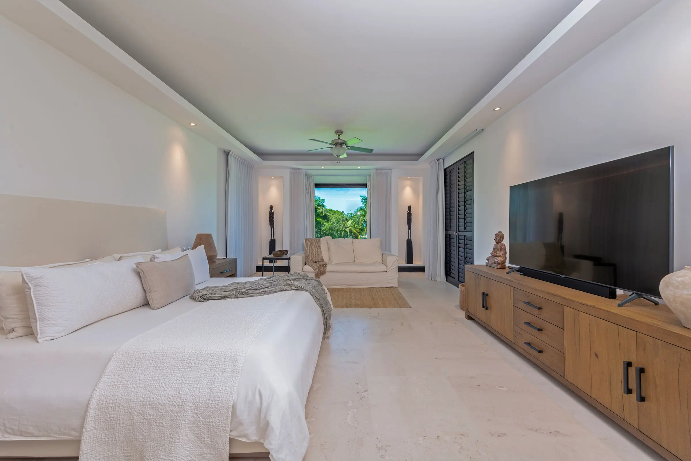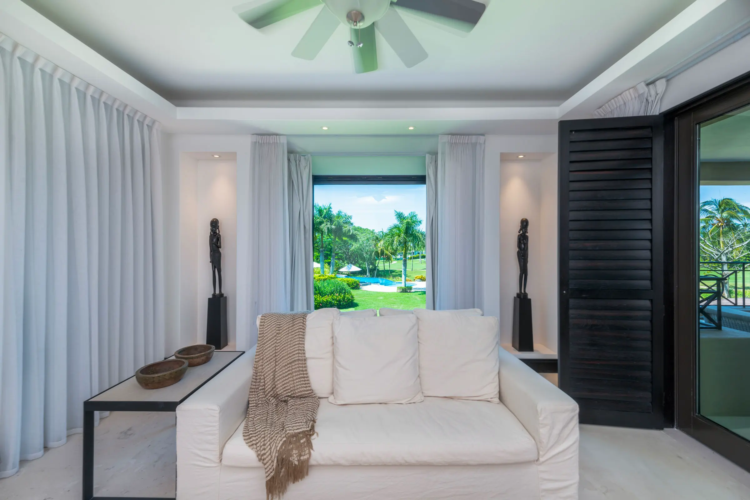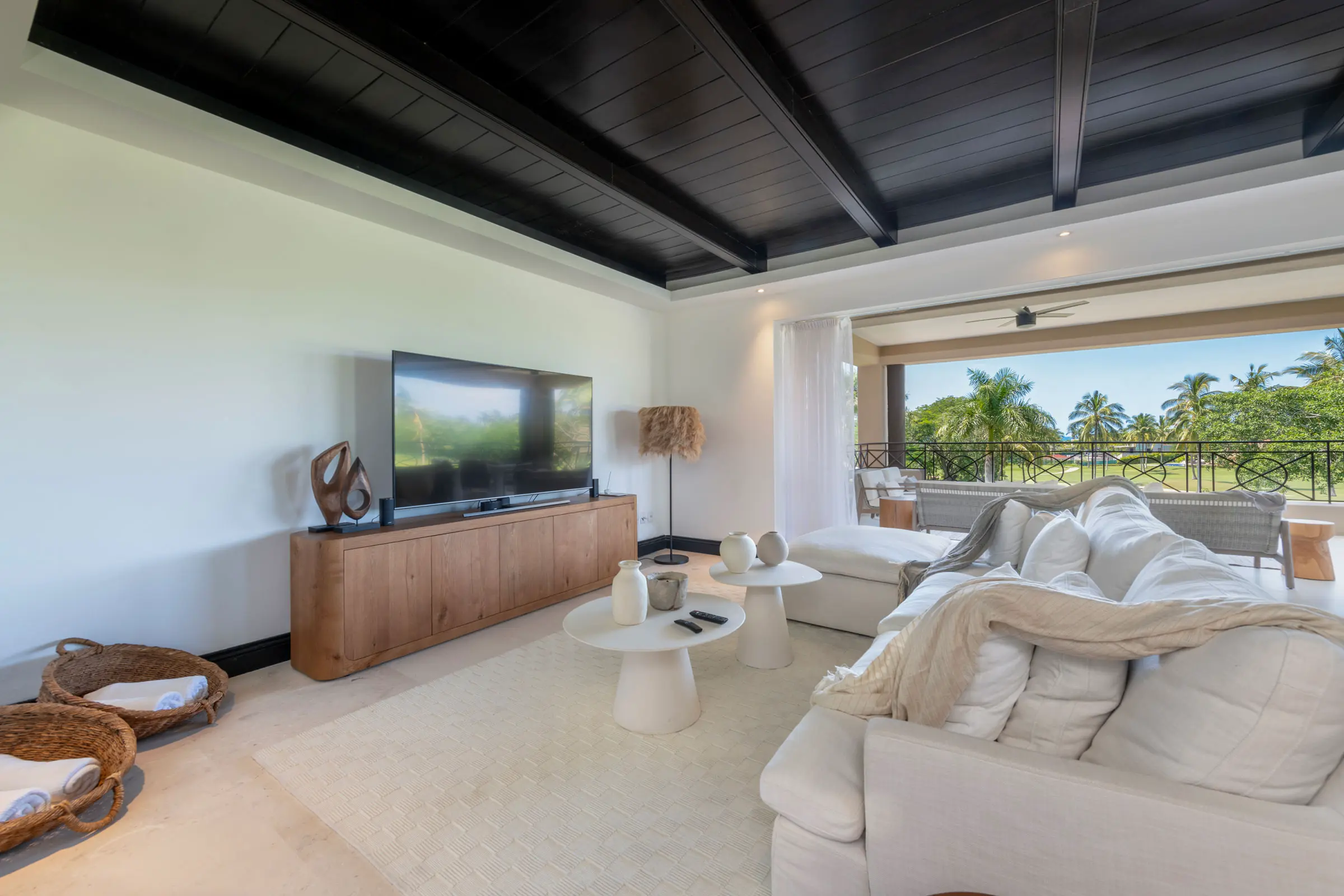 From the moment you step through the wide wooden doors into the open-plan living room, you’re enveloped in an atmosphere of calm elegance. Neutral tones meet rich, dark wood accents, while the expansive sliding doors dissolve the line between indoor sophistication and outdoor serenity. The private terrace—furnished for lounging and al fresco dining—overlooks lush gardens and the resort-style pool, inviting you to slow down, breathe in the ocean breeze, and embrace the rhythm of paradise.