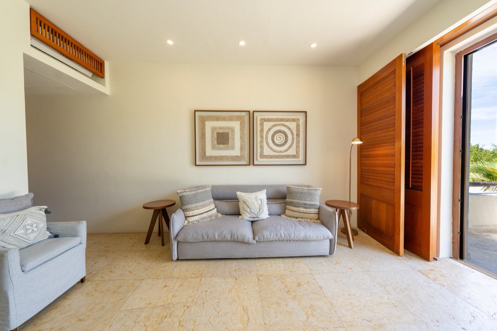 Condo Terrazas P23 is an elegant two-bedroom residence set on the second floor of the boutique Las Terrazas condominium complex within the exclusive gates of Punta Mita, blending treetop views of the golf course, lake, mountains, and ocean with the comfort of an outdoor-ready terrace. This single-level condo features two master suites and a bunk-bed room perfect for children or a nanny, making it an ideal setup for families or small groups of up to six guests seeking a refined and intimate Punta Mita retreat.