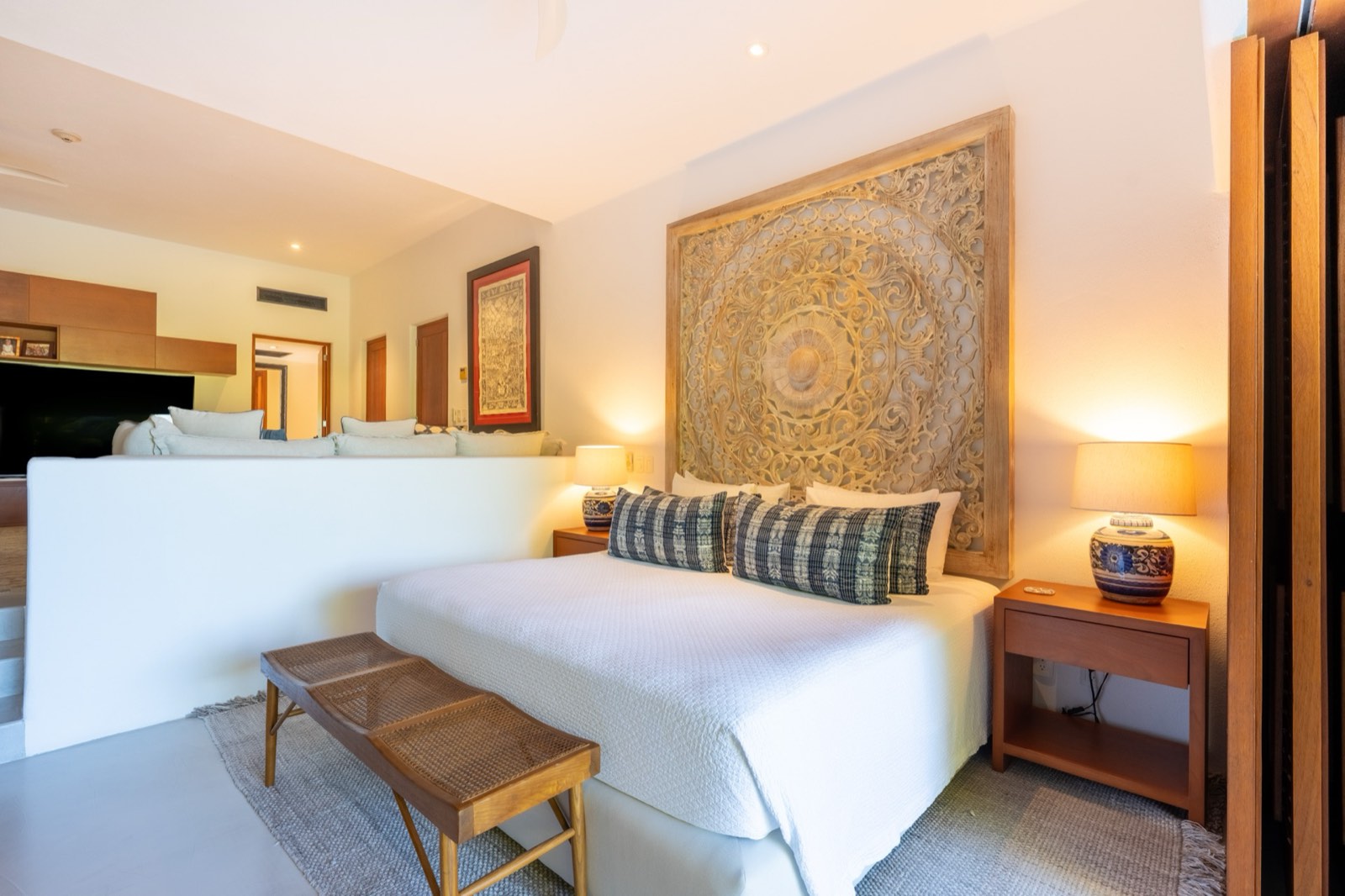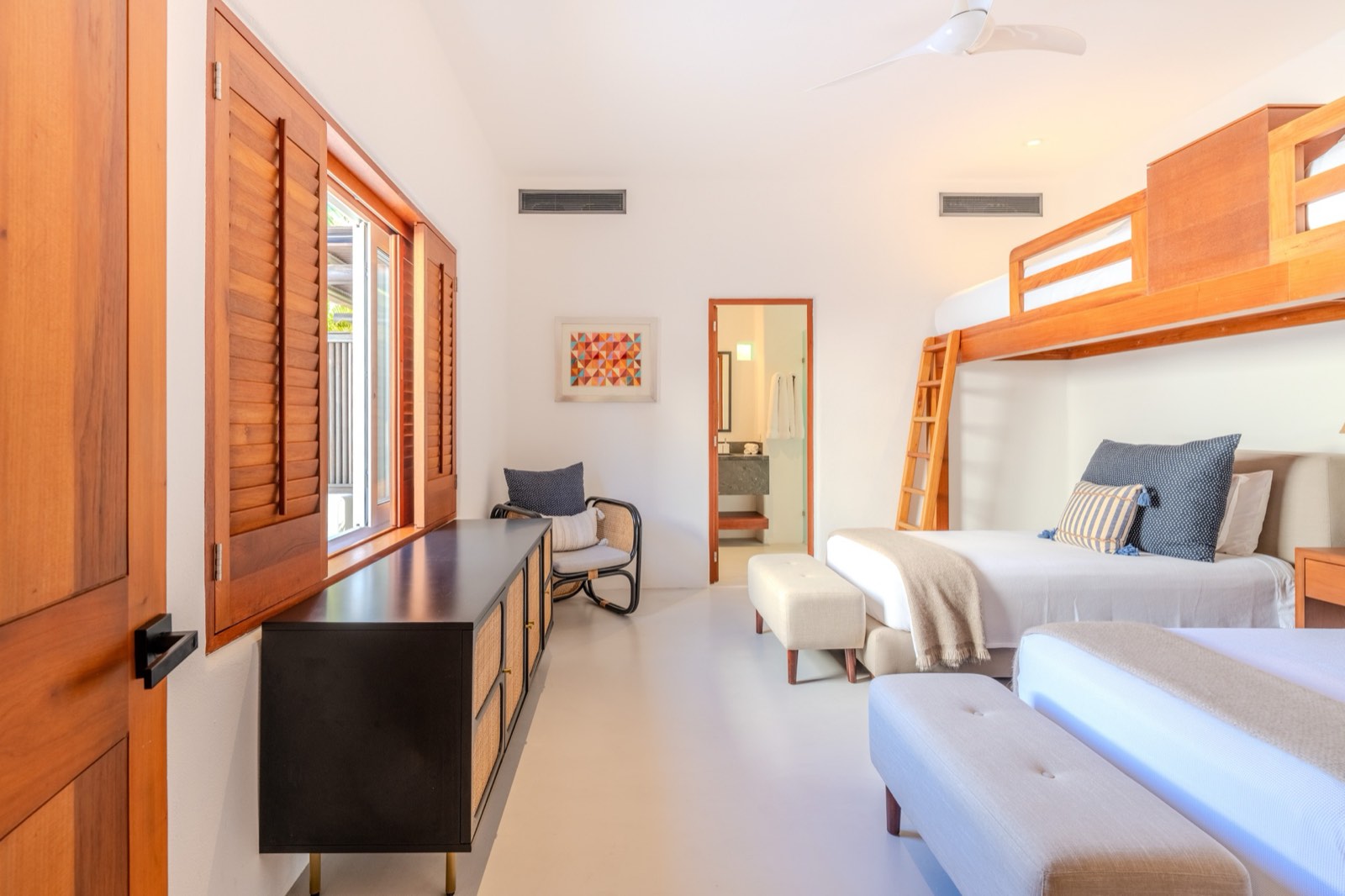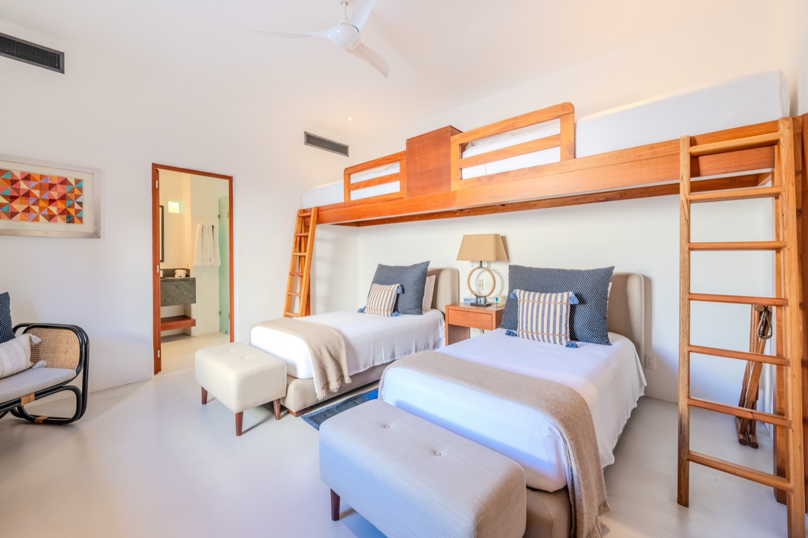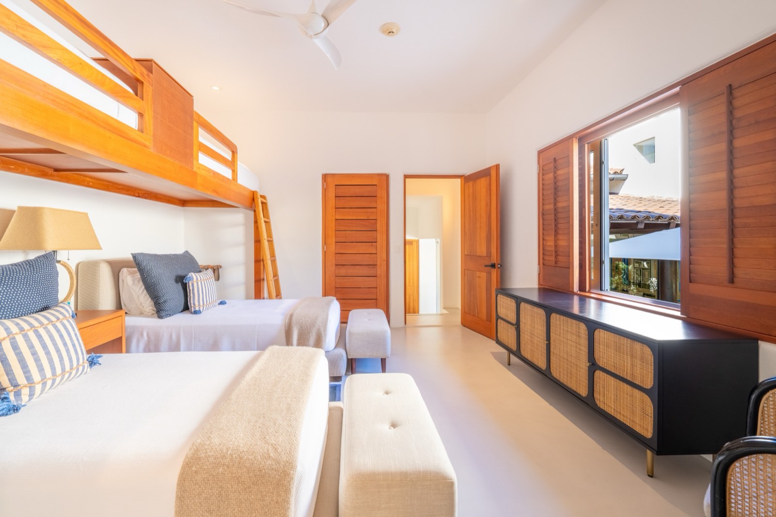 The master suite is a destination in itself, featuring a king-size bed, a private terrace with hammock, a secondary terrace with its own plunge pool, a desk and sofa, a large bathroom with double vanity and shower, and a spacious walk-in closet. The second bedroom on the upper level offers a king-size bed with ocean view, ensuite bathroom with shower and double vanity, walk-in closet, and a TV lounge area. The third bedroom provides a king-size bed with private terrace, hammock, bathroom with shower and double vanity, and walk-in closet. The fourth bedroom is a dedicated kids’ room on the upper level with four twin beds, closet, and bathroom with shower and single vanity — ideal for families traveling with children.