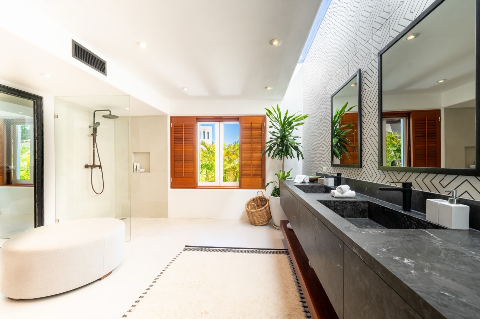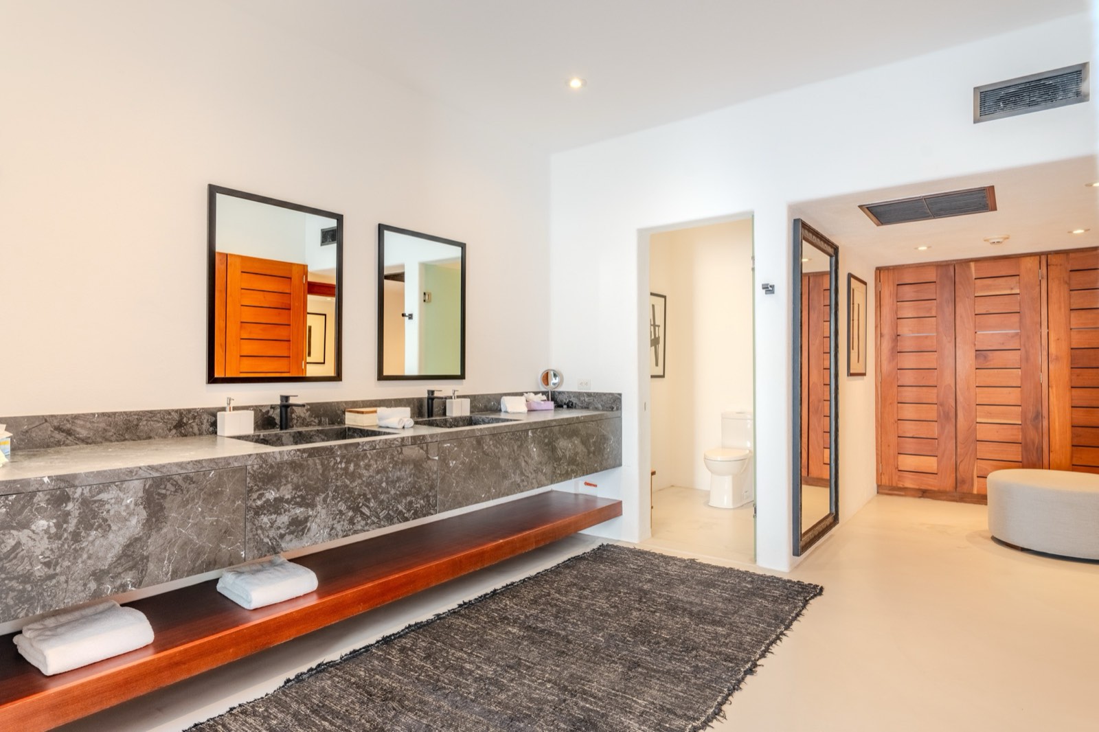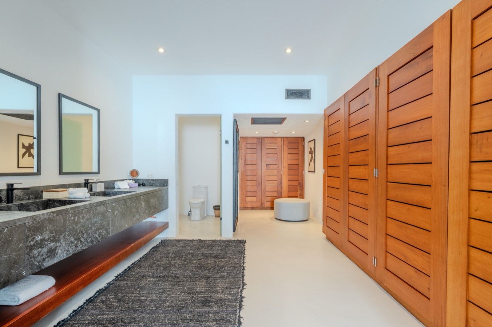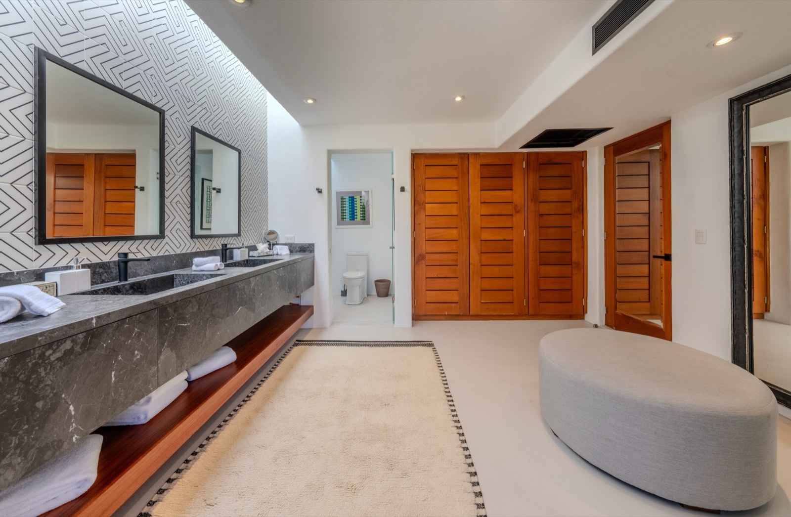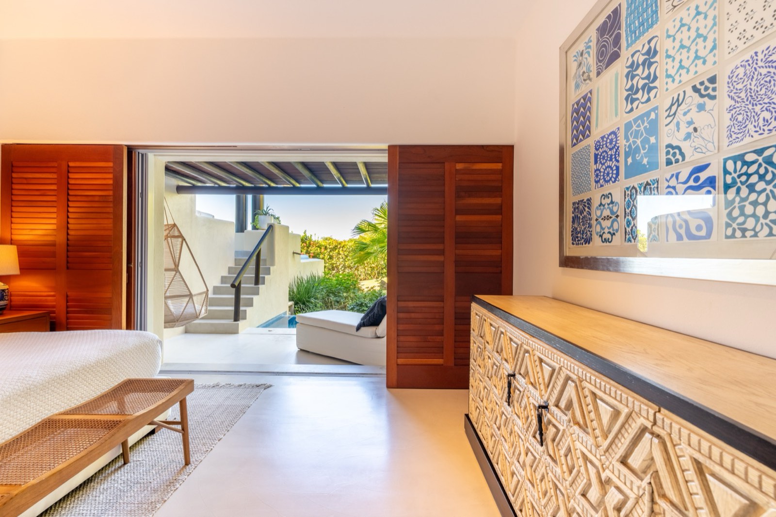 The master suite is a destination in itself, featuring a king-size bed, a private terrace with hammock, a secondary terrace with its own plunge pool, a desk and sofa, a large bathroom with double vanity and shower, and a spacious walk-in closet. The second bedroom on the upper level offers a king-size bed with ocean view, ensuite bathroom with shower and double vanity, walk-in closet, and a TV lounge area. The third bedroom provides a king-size bed with private terrace, hammock, bathroom with shower and double vanity, and walk-in closet. The fourth bedroom is a dedicated kids’ room on the upper level with four twin beds, closet, and bathroom with shower and single vanity — ideal for families traveling with children.