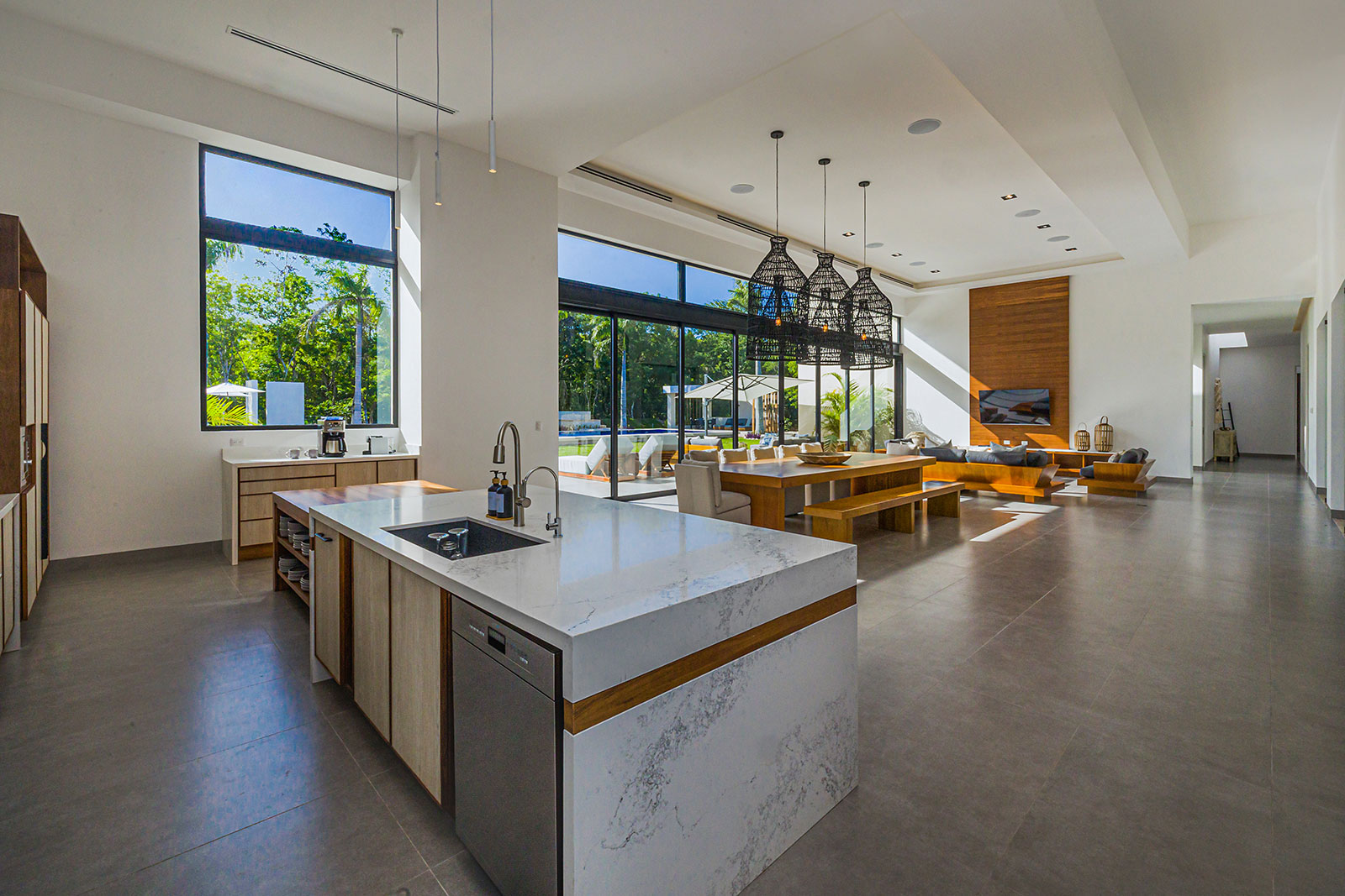 Inside, Land At Mariposa is composed as a series of generous volumes rather than just rooms, each one elevated by the height of the ceilings and the quality of the furnishings. Seven bedrooms and seven-and-a-half bathrooms allow the house to welcome larger groups comfortably, with enough space for everyone to find their own rhythm. The interiors function as a curated gallery of pieces sourced from around the world, balancing modern lines with more classic touches.