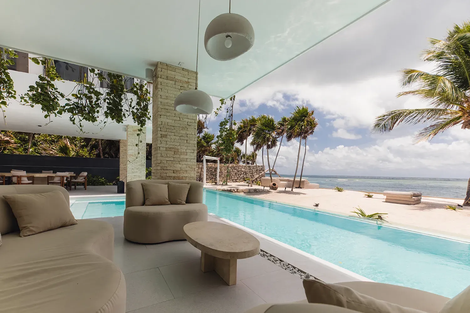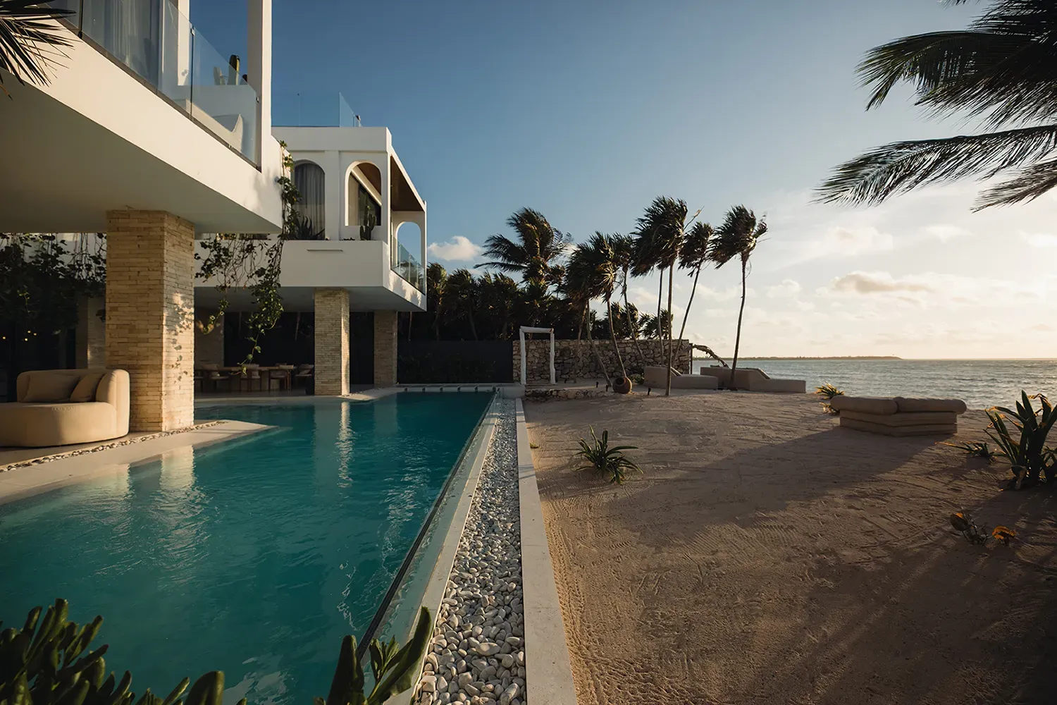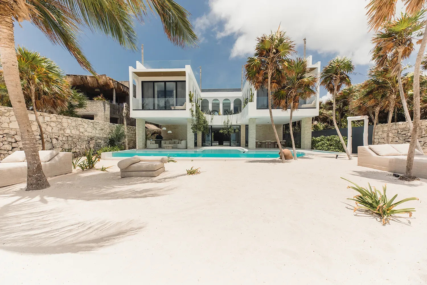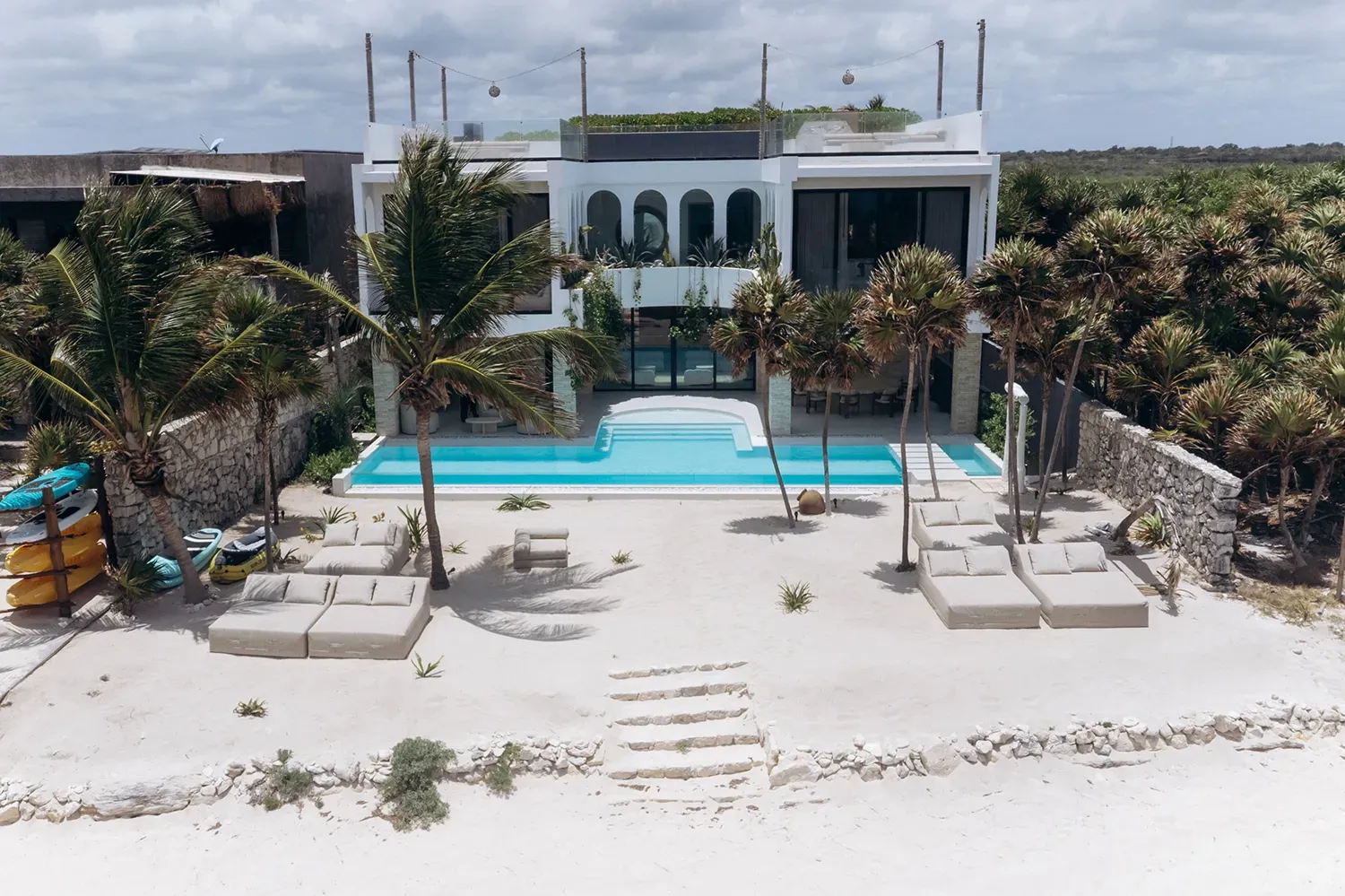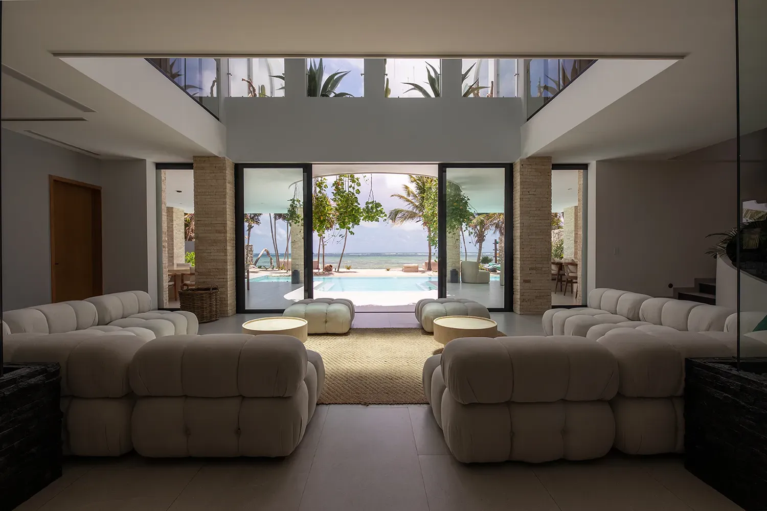 Studio 54 is a five-bedroom beachfront contemporary villa on Soliman Bay, Tulum, accommodating up to 10 guests across 800 square meters of architectural design that fuses clean modern lines with warm natural materials and a confident sense of showmanship. Named after the legendary New York nightclub, the villa is theatrical, comfortable, and unapologetically stylish — from the mirrored disco ball in the grand entryway to the floor-to-ceiling glass wine and champagne cellar built into the architecture beside the sculptural spiral staircase.